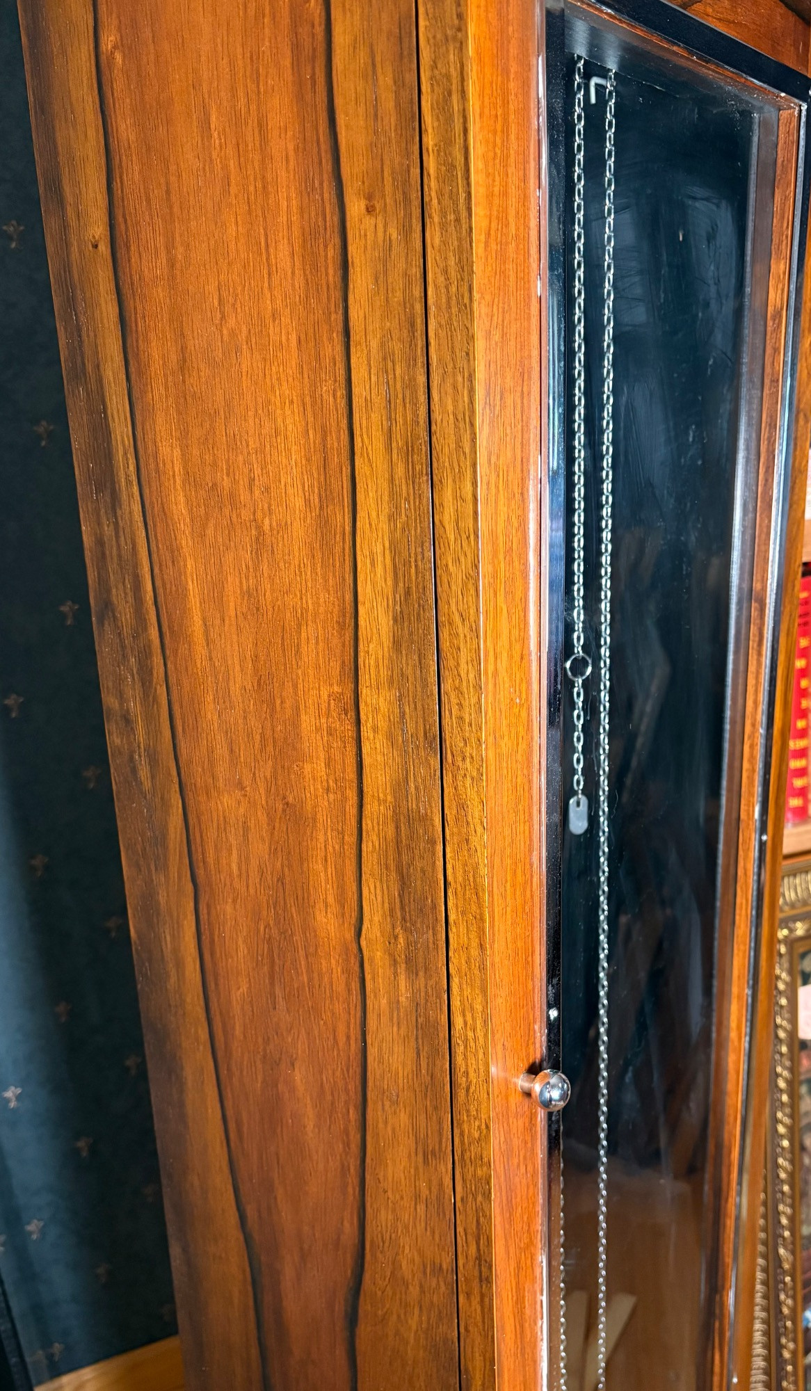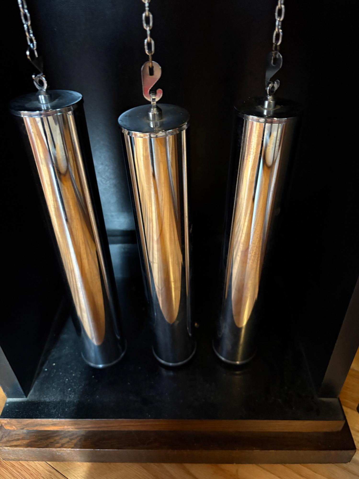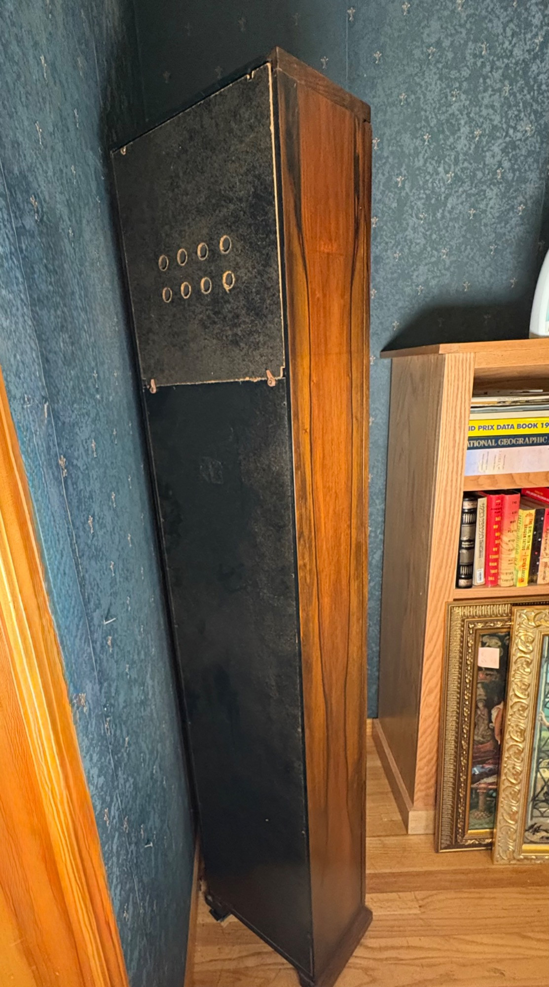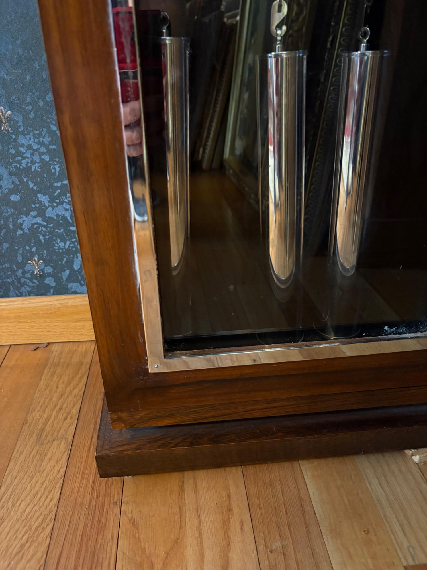 Very nice arts and craft style grandfather clock from Ridgeway . Has Westminster chimes,. pendulum and weights, and pretty woodgrain. It does not appear to be working but we think that because it is sitting on an uneven floor so the weights are not riding free to turn the pendulum. Comes with original paperwork.. Exterior is in great shape with the chrome needing a little bit of polish. White clock face measures approx. 9" square with gold Roman numerals. Front glass door opens easily for full access to interior. Really sleek piece for a turn of the century home or even a modern home. Local Pickup Only. Bidding on this lot is an agreement that you will bring a hand truck and/or any other tools needed to remove this item. If these steps are not followed your item will be forfeited and no refund given.