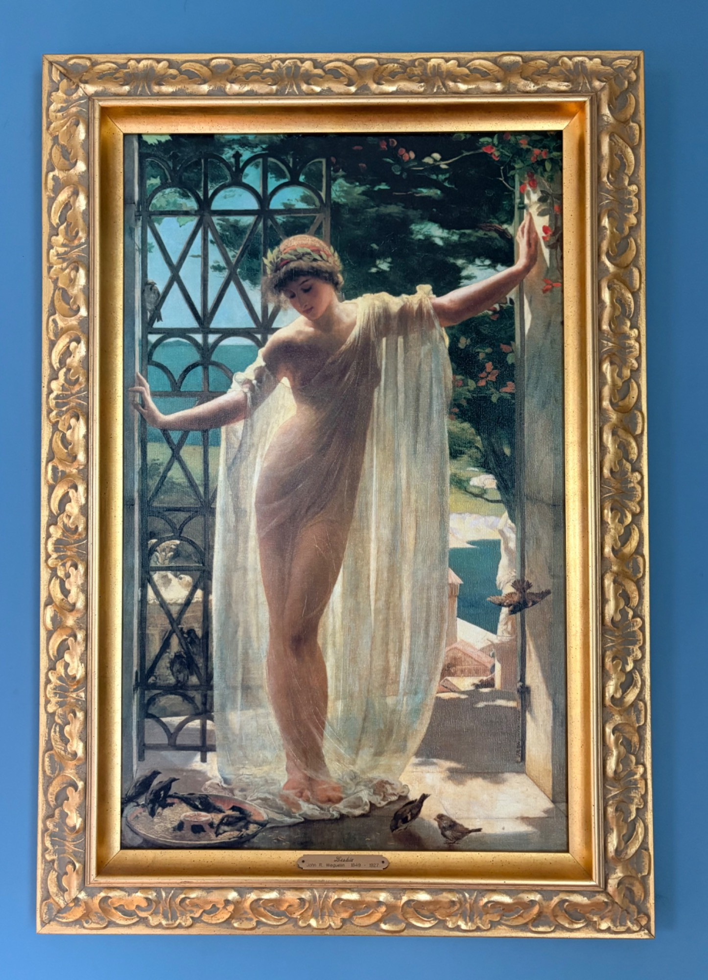 “Lesbia” John Reinhardt Weguelin (1849-1927). Reproduction painting on canvas is typical of this artist's oeuvre. Carved wooden frame has just the right amount of decoration not to detract from the image. Medium sized work at about 2.5' high framed. . We are usure of the origin of this reproduction - given the image/frame, we think it might have been from Around the Corner Art but are not certain. Can be shipped FedEx.