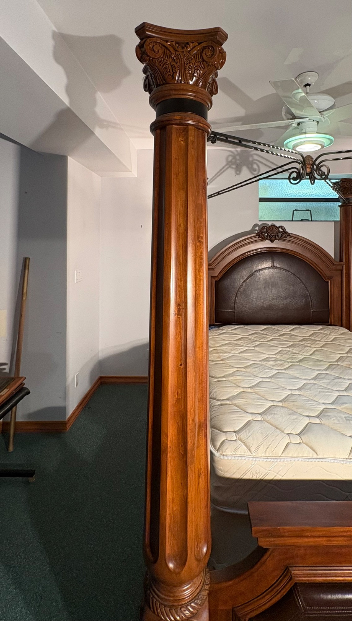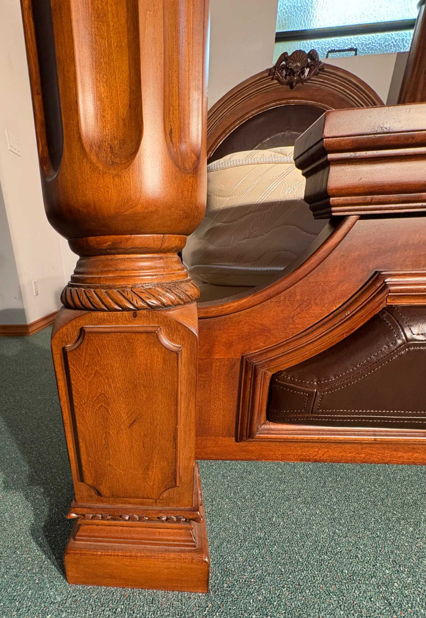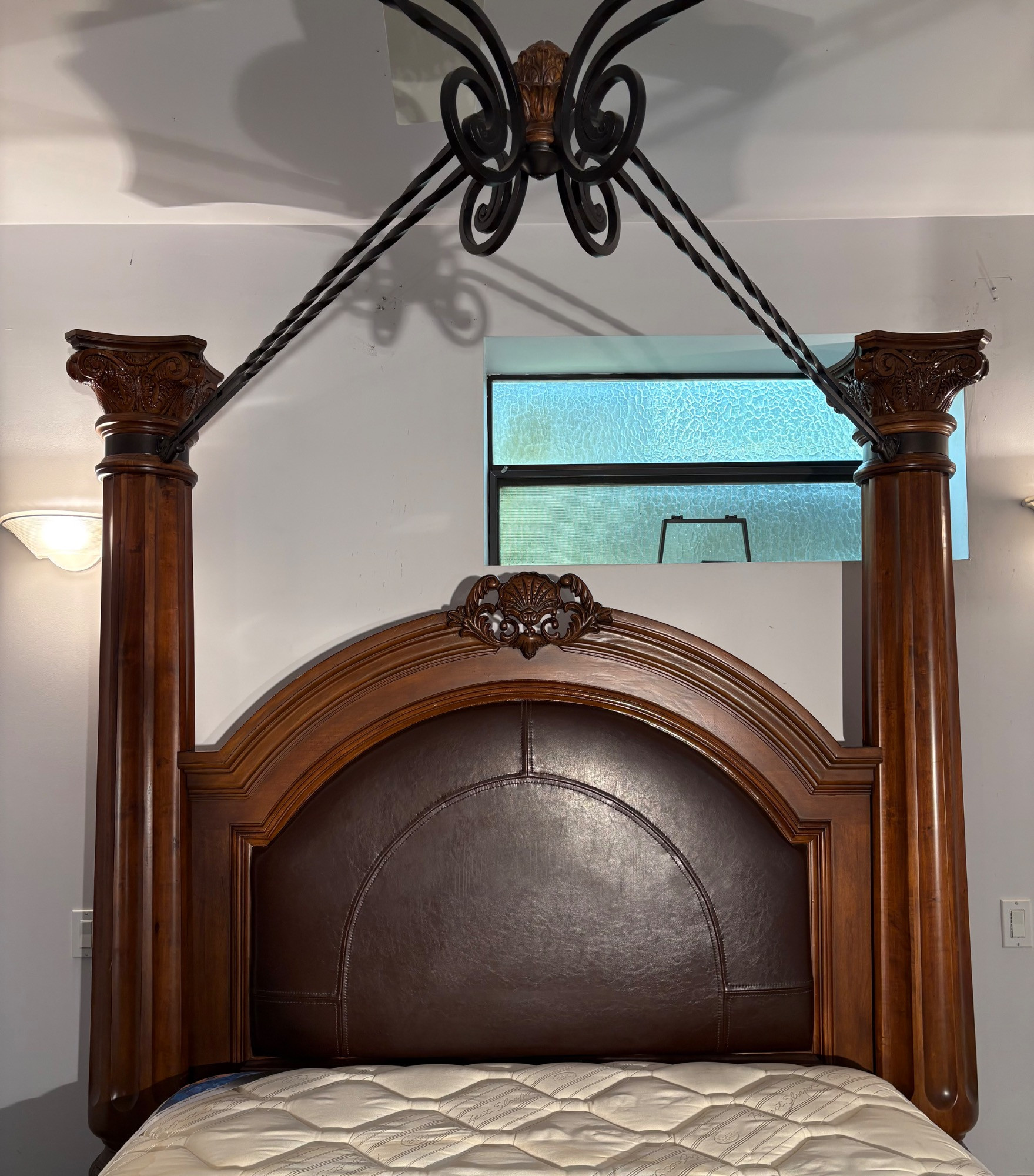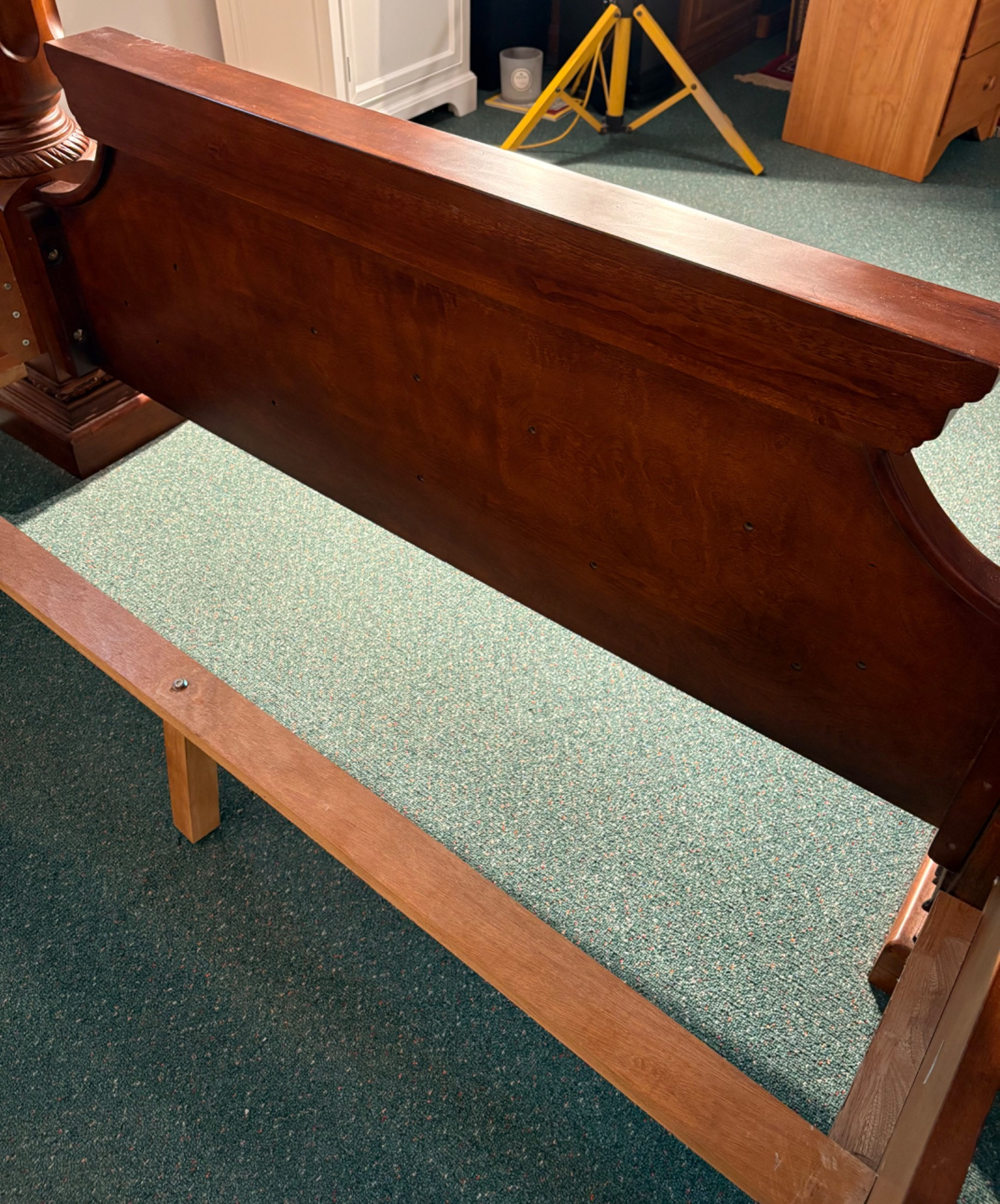 Queen 4-poster bed frame with lots of classic design elements. Solid wood in a warm brown color. Half-moon shaped headboard and footboard have plush brown upholstery below intricately carved channels with shell-motif wood decoration. Fluted columns anchor the design at the four corners and hold a queen mattress in place. Above the frame twisted double-wrought iron supports span from the columns into the center of the bed with a pinecone finial where they intersect. 5 boards with 2" x2" legs support the mattress (they need some new screws). Columns measure approx. 91" from top of Corinthian capital to base. Headboard measures approx. 72" from floor to highest point while footboard measures approx. 29" from floor to highest point. Frame length measures approx. 101" from outside of column base at head of frame to outside of column base at foot of frame. Total width from outside of column base to outside column base is just over 77". In very good used shape with only a few scratches/nicks here and there that could easily be covered with a furniture crayon (see last 3 photos for most egregious ones). Beautiful and very sturdy, this piece of furniture would be the centerpiece of any room. Mattress is included if purchaser wants it. Local Pickup Only. Bidding on this lot is an agreement that: (1.) You will have 2 capable, able-bodied persons to lift and load at a minimum. (2.) You will bring a hand truck and/or any other tools needed to remove this item. If these steps are not followed your item will be forfeited and no refund given.