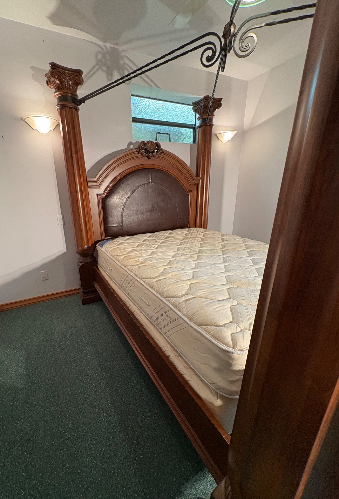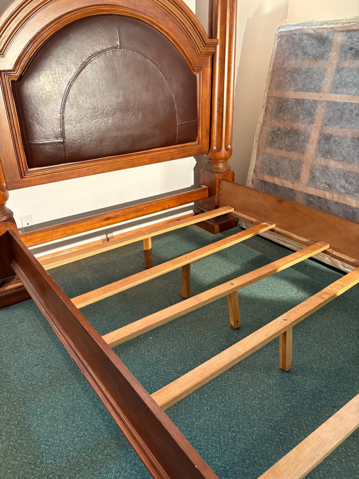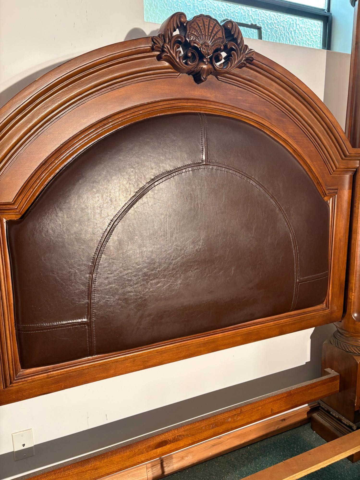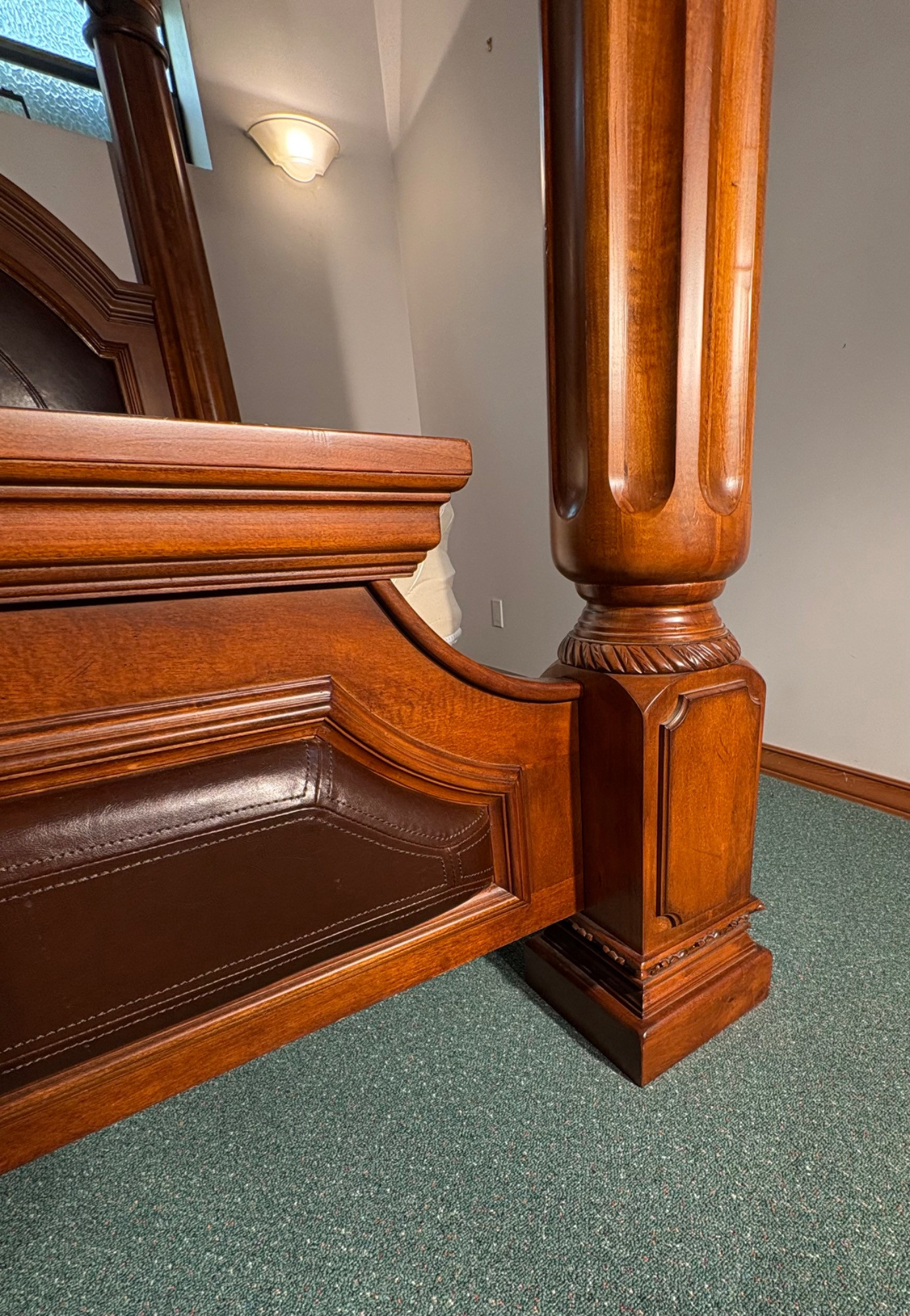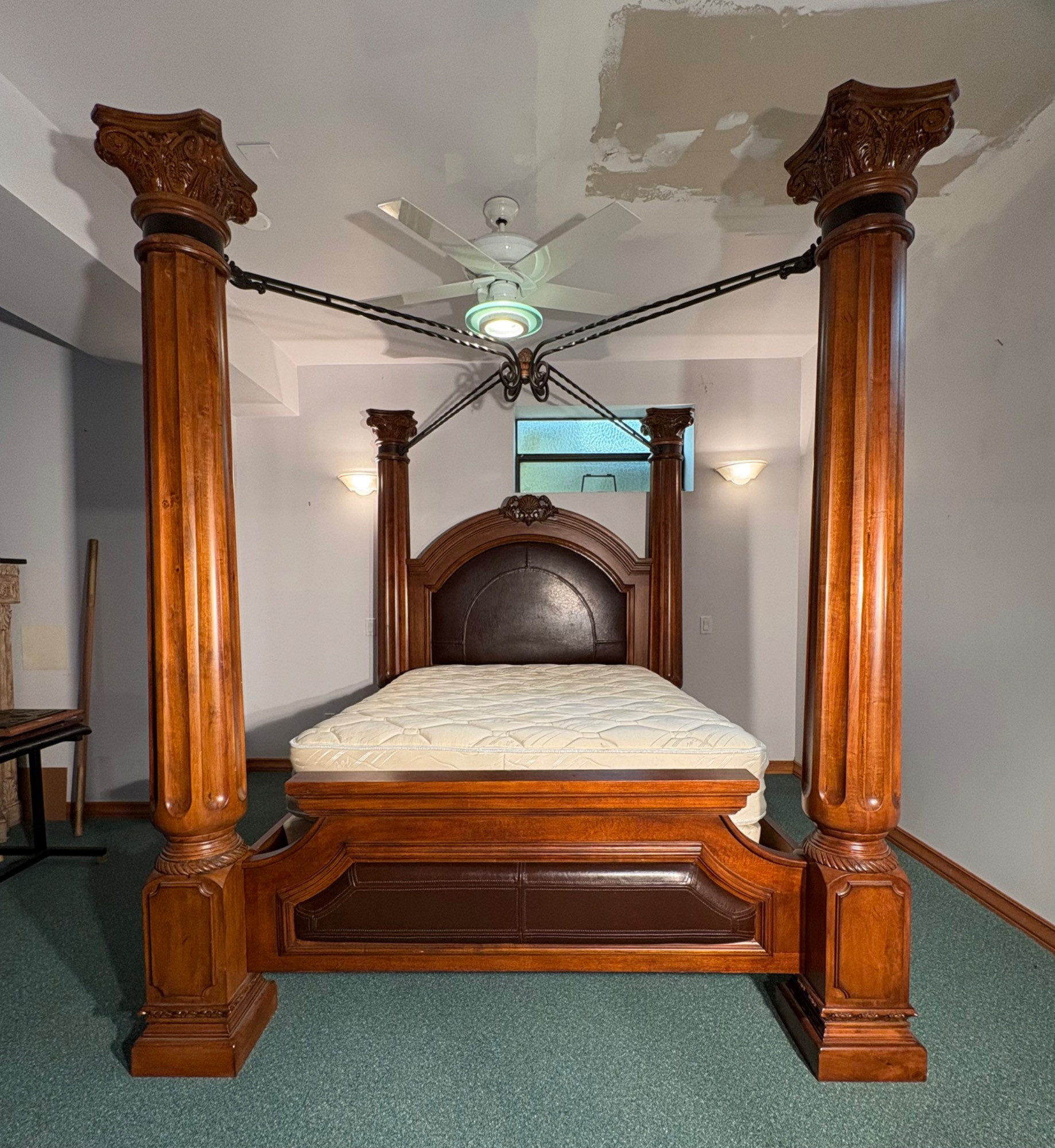 Queen 4-poster bed frame with lots of classic design elements. Solid wood in a warm brown color. Half-moon shaped headboard and footboard have plush brown upholstery below intricately carved channels with shell-motif wood decoration. Fluted columns anchor the design at the four corners and hold a queen mattress in place. Above the frame twisted double-wrought iron supports span from the columns into the center of the bed with a pinecone finial where they intersect. 5 boards with 2" x2" legs support the mattress (they need some new screws). Columns measure approx. 91" from top of Corinthian capital to base. Headboard measures approx. 72" from floor to highest point while footboard measures approx. 29" from floor to highest point. Frame length measures approx. 101" from outside of column base at head of frame to outside of column base at foot of frame. Total width from outside of column base to outside column base is just over 77". In very good used shape with only a few scratches/nicks here and there that could easily be covered with a furniture crayon (see last 3 photos for most egregious ones). Beautiful and very sturdy, this piece of furniture would be the centerpiece of any room. Mattress is included if purchaser wants it. Local Pickup Only. Bidding on this lot is an agreement that: (1.) You will have 2 capable, able-bodied persons to lift and load at a minimum. (2.) You will bring a hand truck and/or any other tools needed to remove this item. If these steps are not followed your item will be forfeited and no refund given.