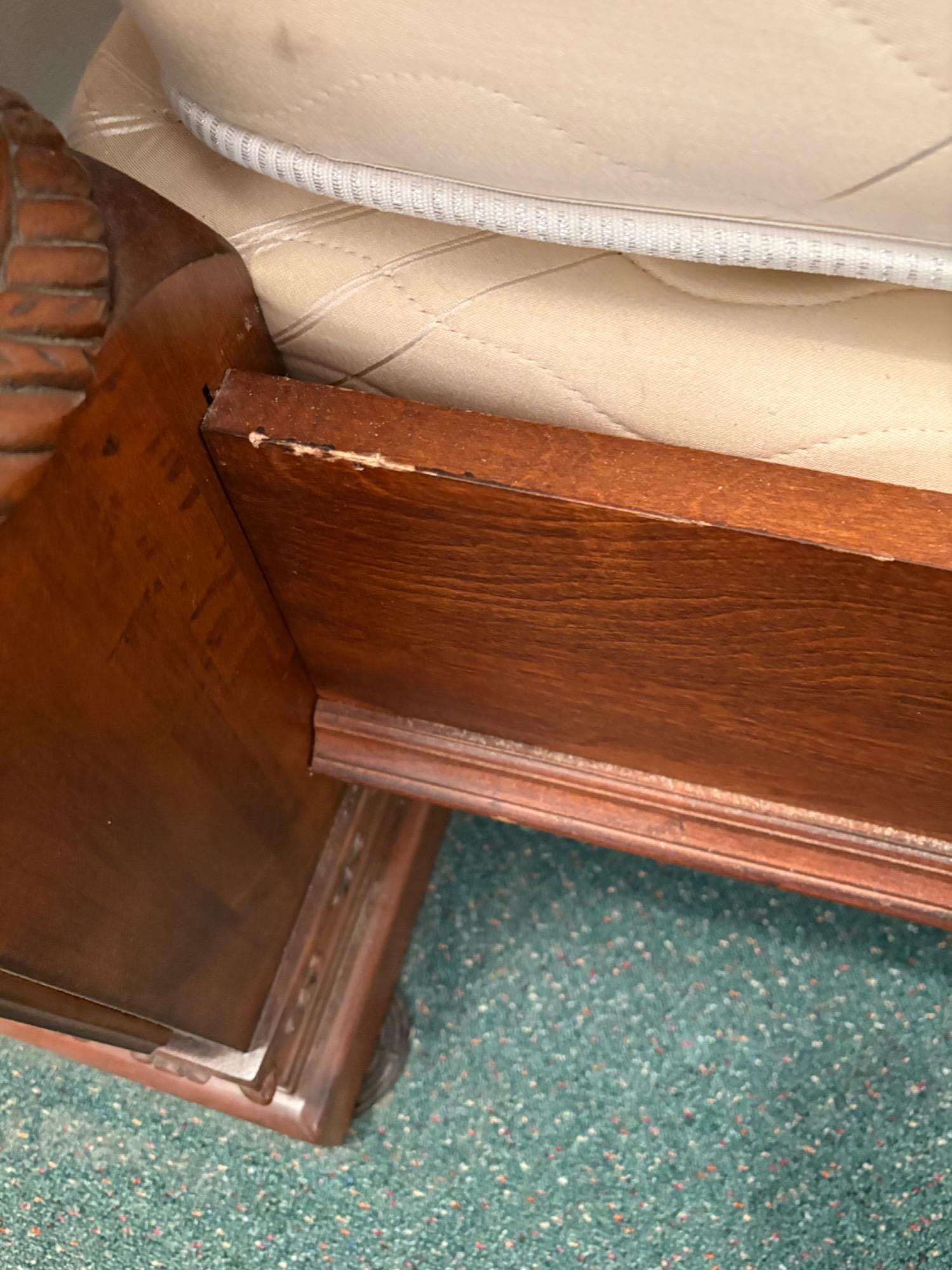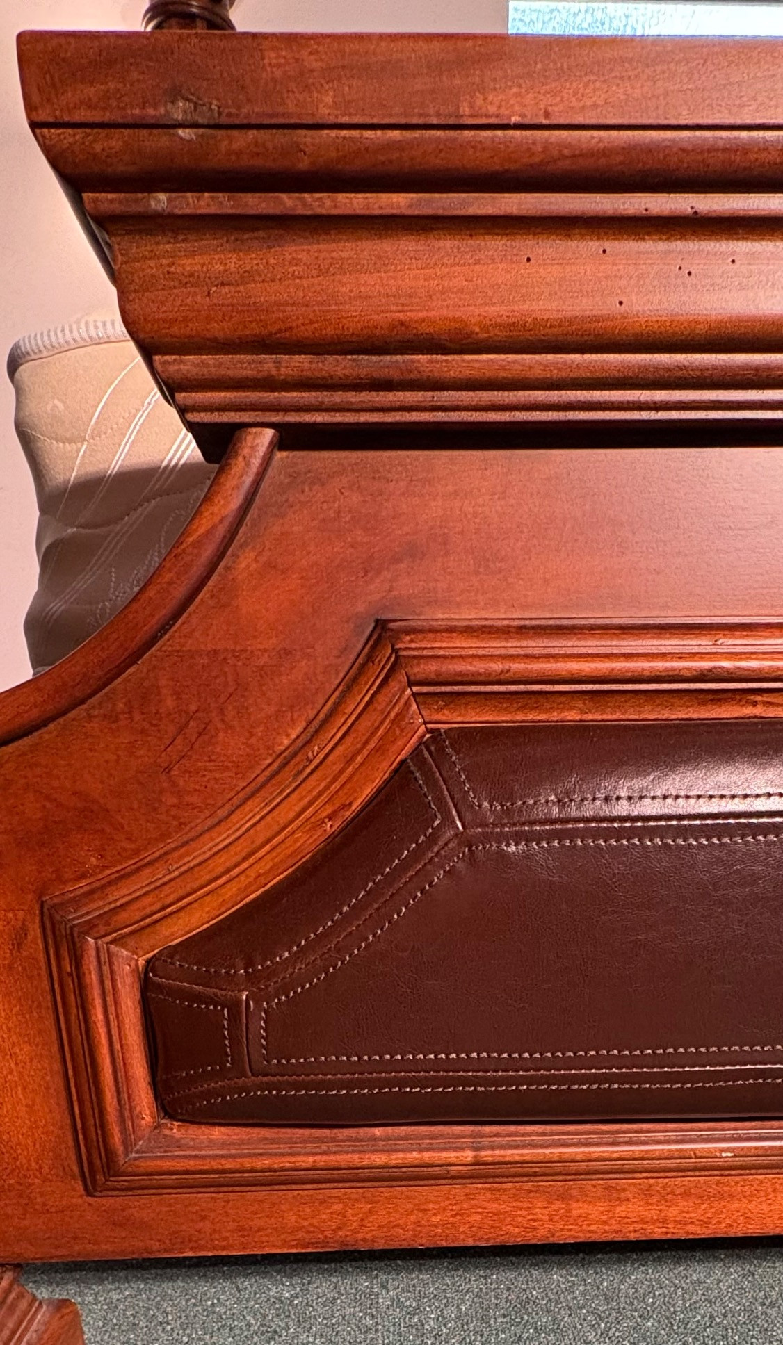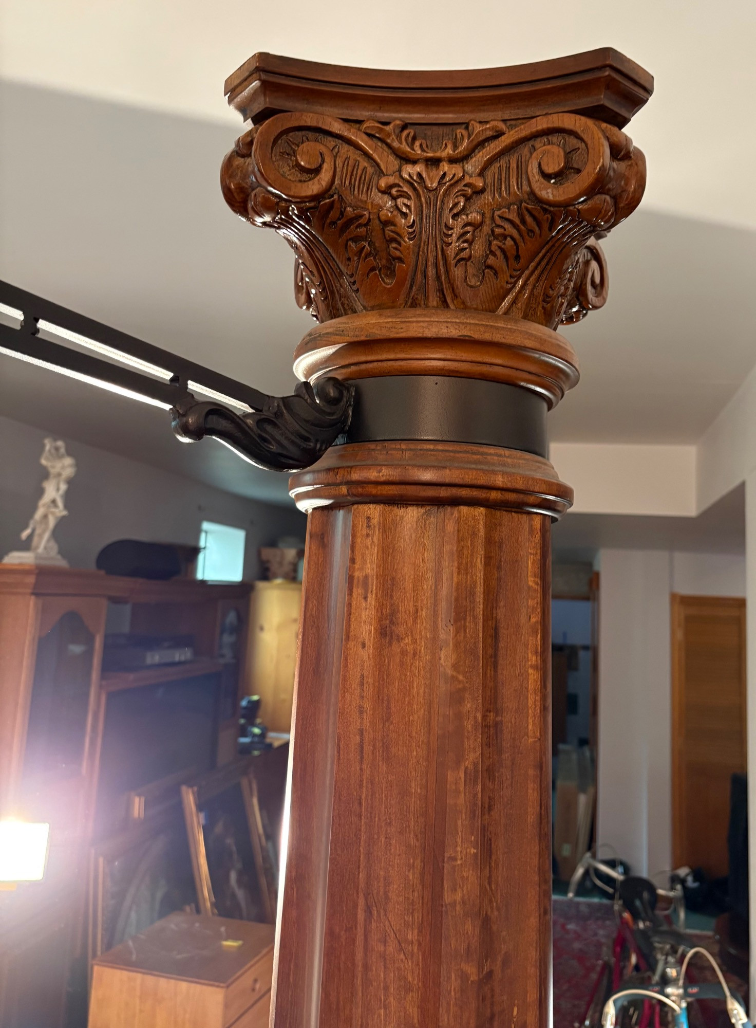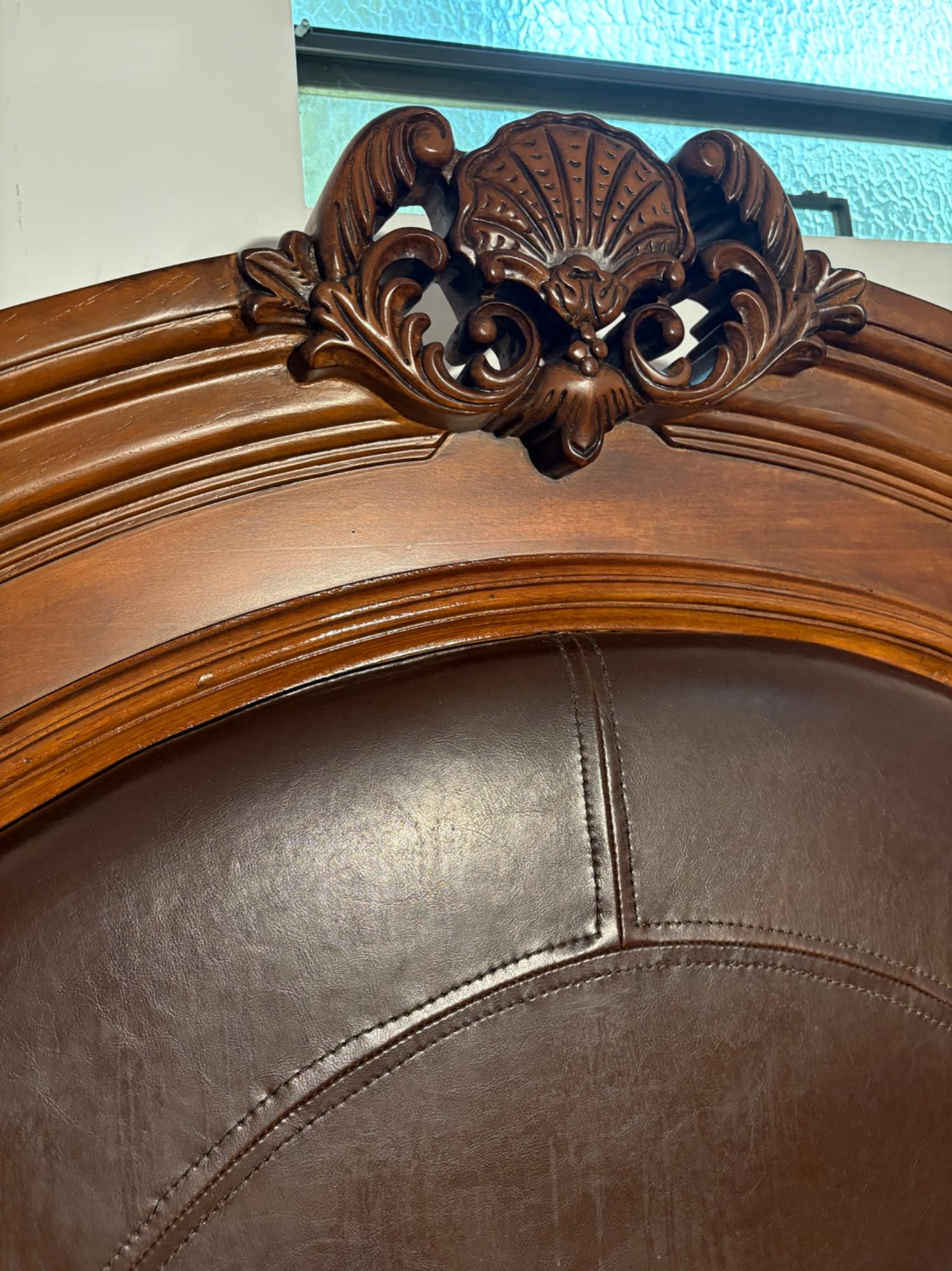 Queen 4-poster bed frame with lots of classic design elements. Solid wood in a warm brown color. Half-moon shaped headboard and footboard have plush brown upholstery below intricately carved channels with shell-motif wood decoration. Fluted columns anchor the design at the four corners and hold a queen mattress in place. Above the frame twisted double-wrought iron supports span from the columns into the center of the bed with a pinecone finial where they intersect. 5 boards with 2" x2" legs support the mattress (they need some new screws). Columns measure approx. 91" from top of Corinthian capital to base. Headboard measures approx. 72" from floor to highest point while footboard measures approx. 29" from floor to highest point. Frame length measures approx. 101" from outside of column base at head of frame to outside of column base at foot of frame. Total width from outside of column base to outside column base is just over 77". In very good used shape with only a few scratches/nicks here and there that could easily be covered with a furniture crayon (see last 3 photos for most egregious ones). Beautiful and very sturdy, this piece of furniture would be the centerpiece of any room. Mattress is included if purchaser wants it. Local Pickup Only. Bidding on this lot is an agreement that: (1.) You will have 2 capable, able-bodied persons to lift and load at a minimum. (2.) You will bring a hand truck and/or any other tools needed to remove this item. If these steps are not followed your item will be forfeited and no refund given.
