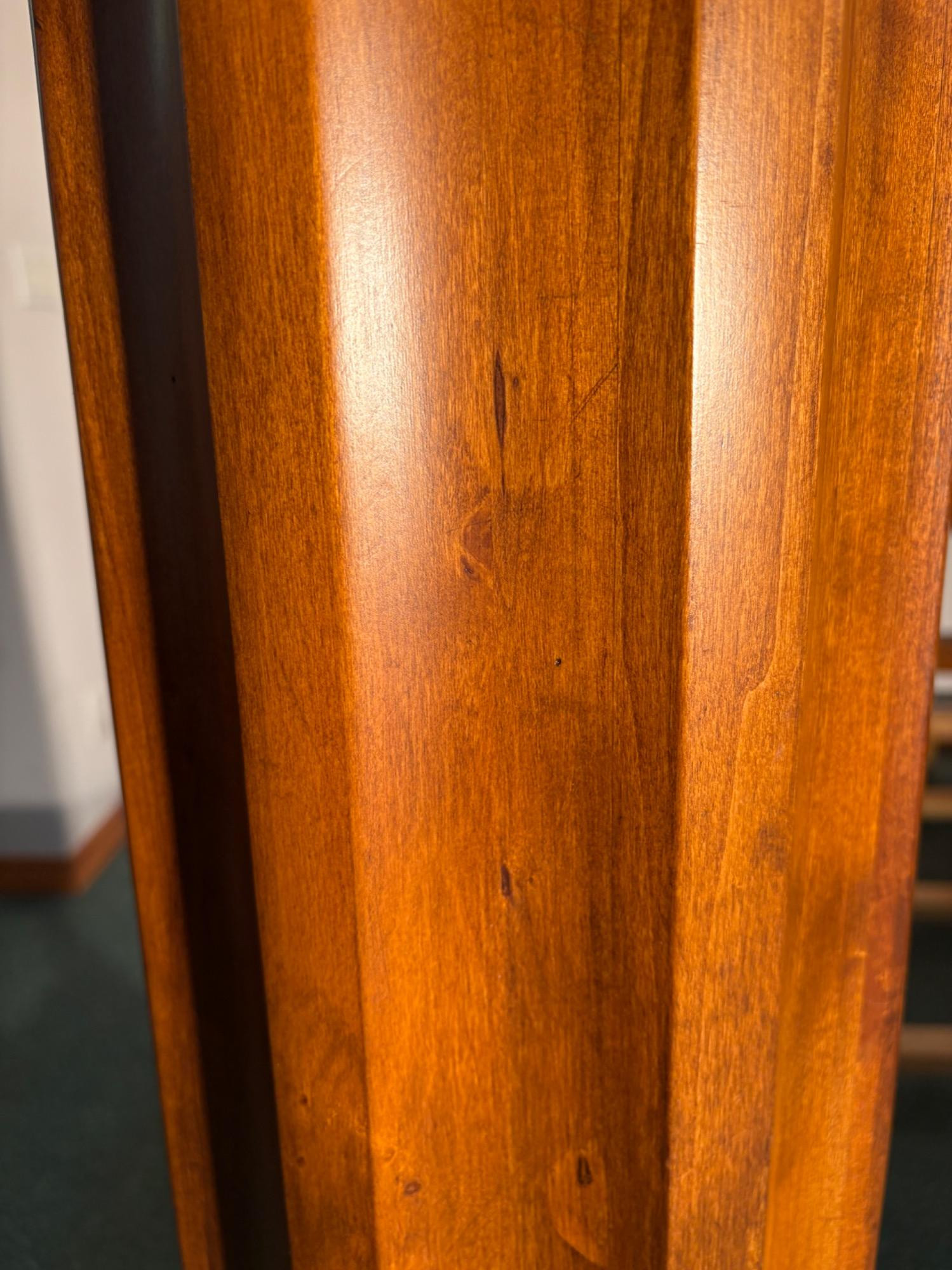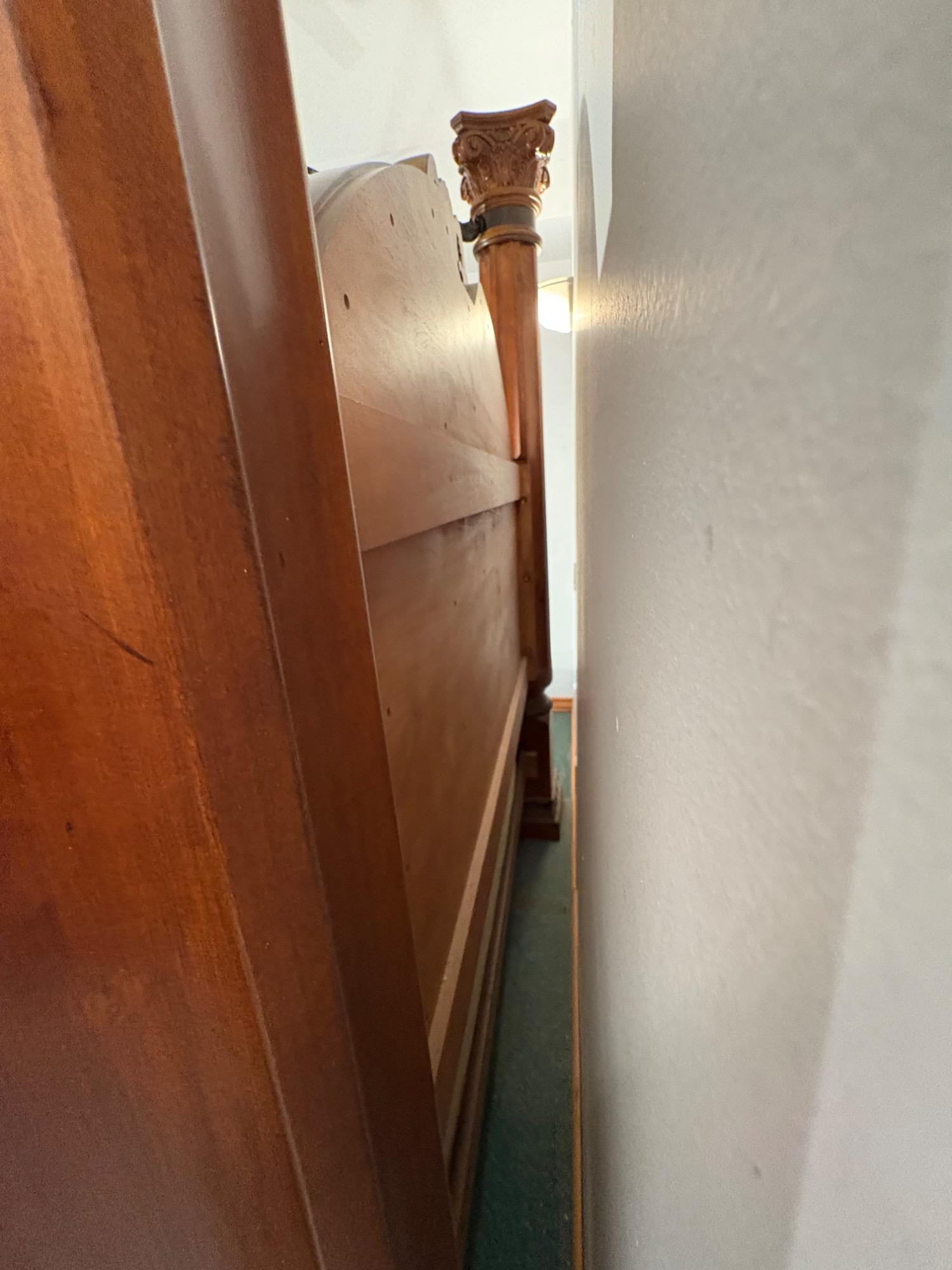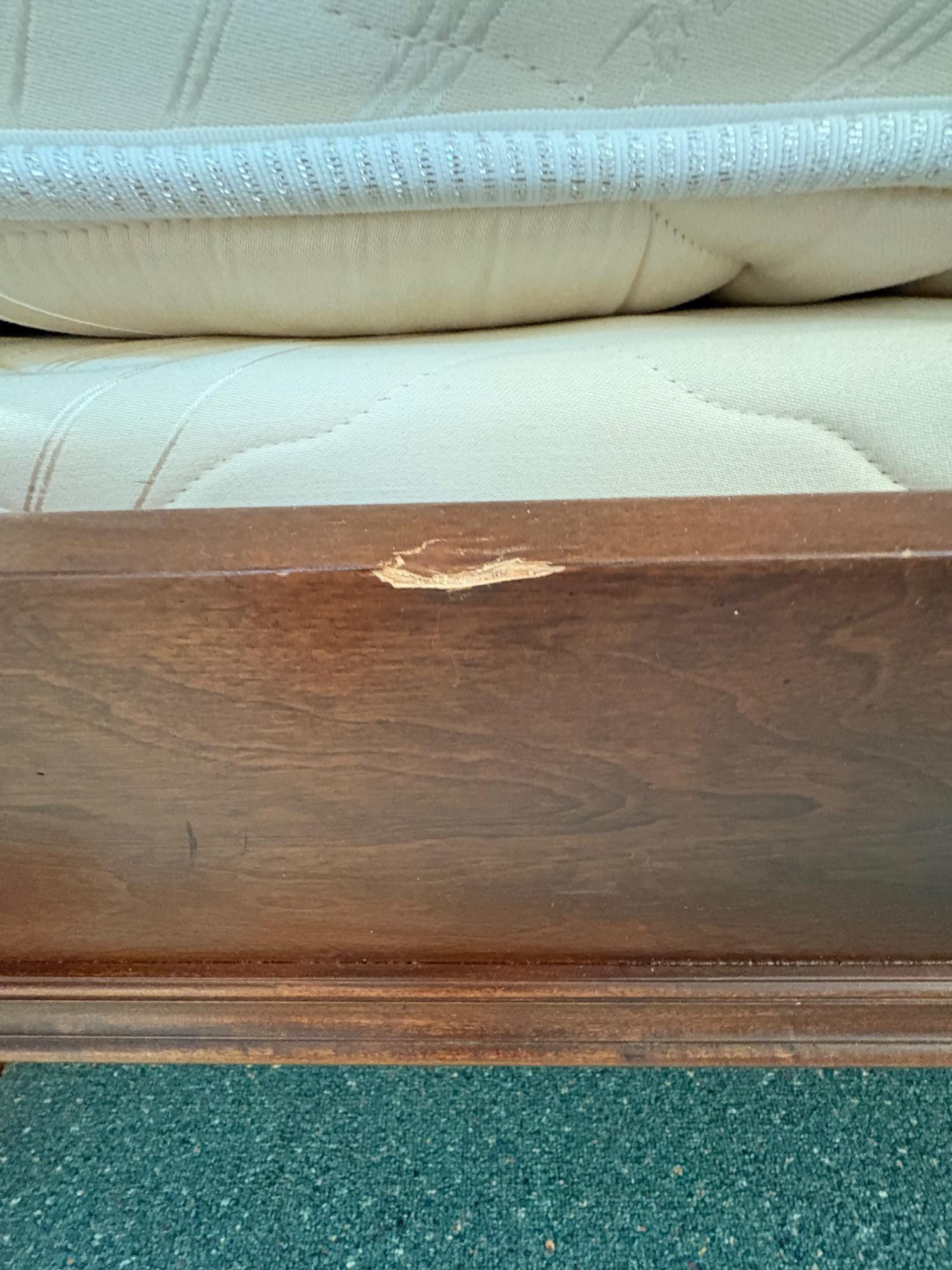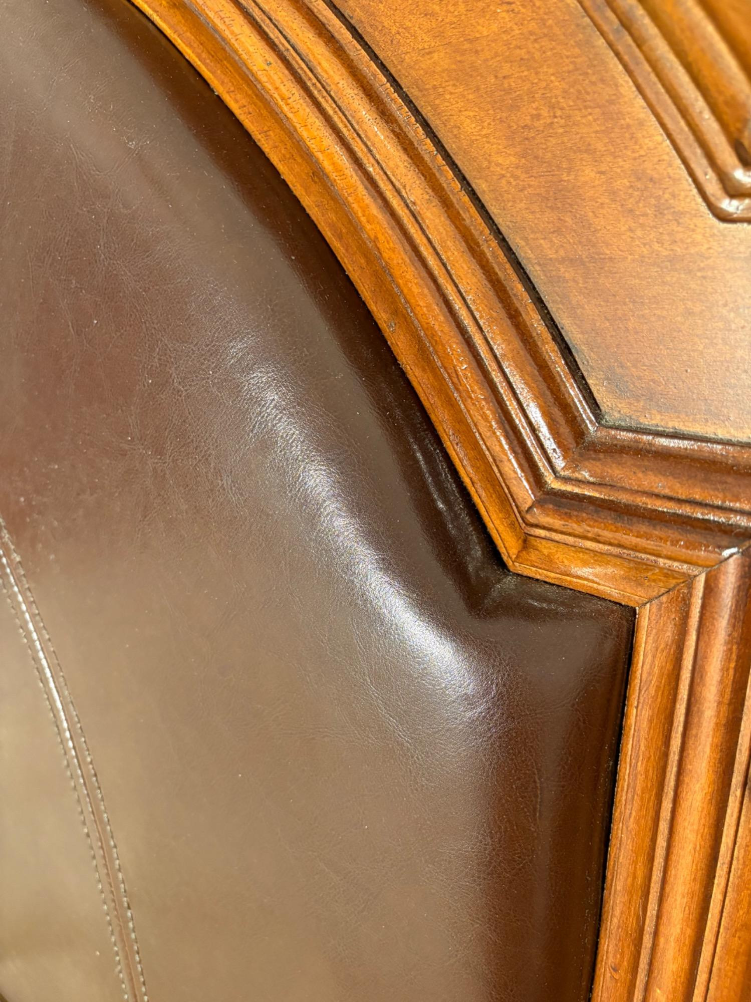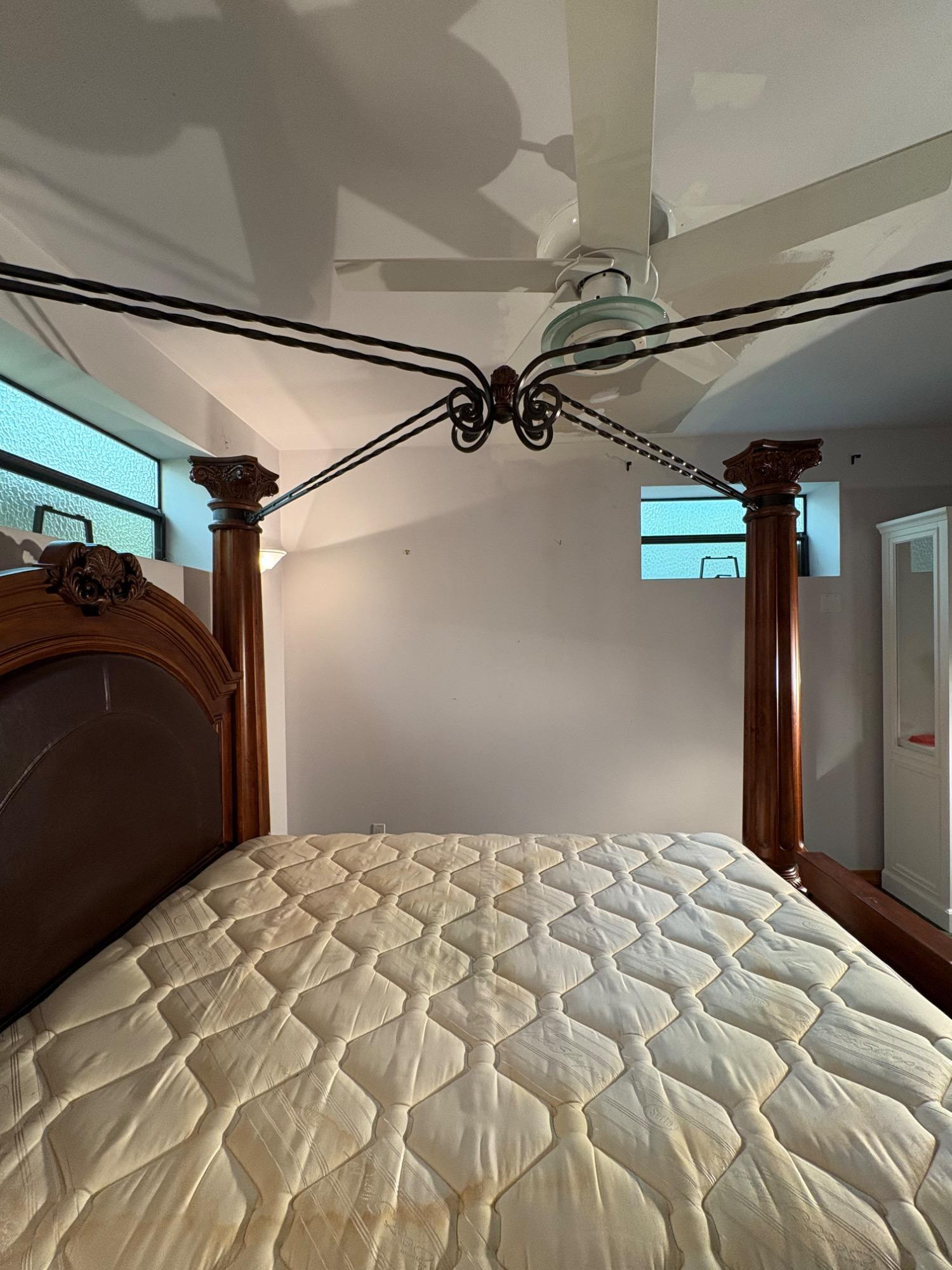 Queen 4-poster bed frame with lots of classic design elements. Solid wood in a warm brown color. Half-moon shaped headboard and footboard have plush brown upholstery below intricately carved channels with shell-motif wood decoration. Fluted columns anchor the design at the four corners and hold a queen mattress in place. Above the frame twisted double-wrought iron supports span from the columns into the center of the bed with a pinecone finial where they intersect. 5 boards with 2" x2" legs support the mattress (they need some new screws). Columns measure approx. 91" from top of Corinthian capital to base. Headboard measures approx. 72" from floor to highest point while footboard measures approx. 29" from floor to highest point. Frame length measures approx. 101" from outside of column base at head of frame to outside of column base at foot of frame. Total width from outside of column base to outside column base is just over 77". In very good used shape with only a few scratches/nicks here and there that could easily be covered with a furniture crayon (see last 3 photos for most egregious ones). Beautiful and very sturdy, this piece of furniture would be the centerpiece of any room. Mattress is included if purchaser wants it. Local Pickup Only. Bidding on this lot is an agreement that: (1.) You will have 2 capable, able-bodied persons to lift and load at a minimum. (2.) You will bring a hand truck and/or any other tools needed to remove this item. If these steps are not followed your item will be forfeited and no refund given.
