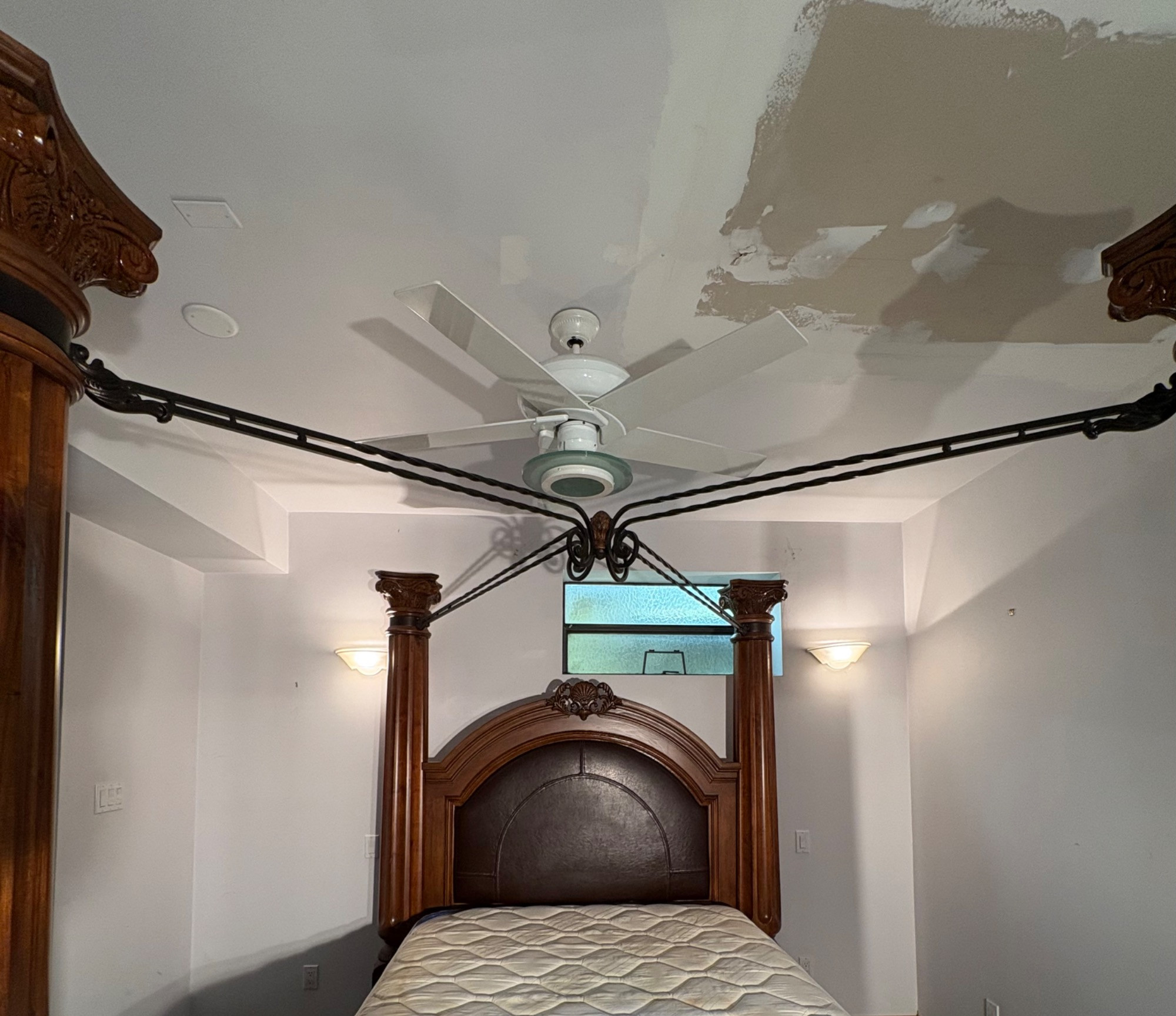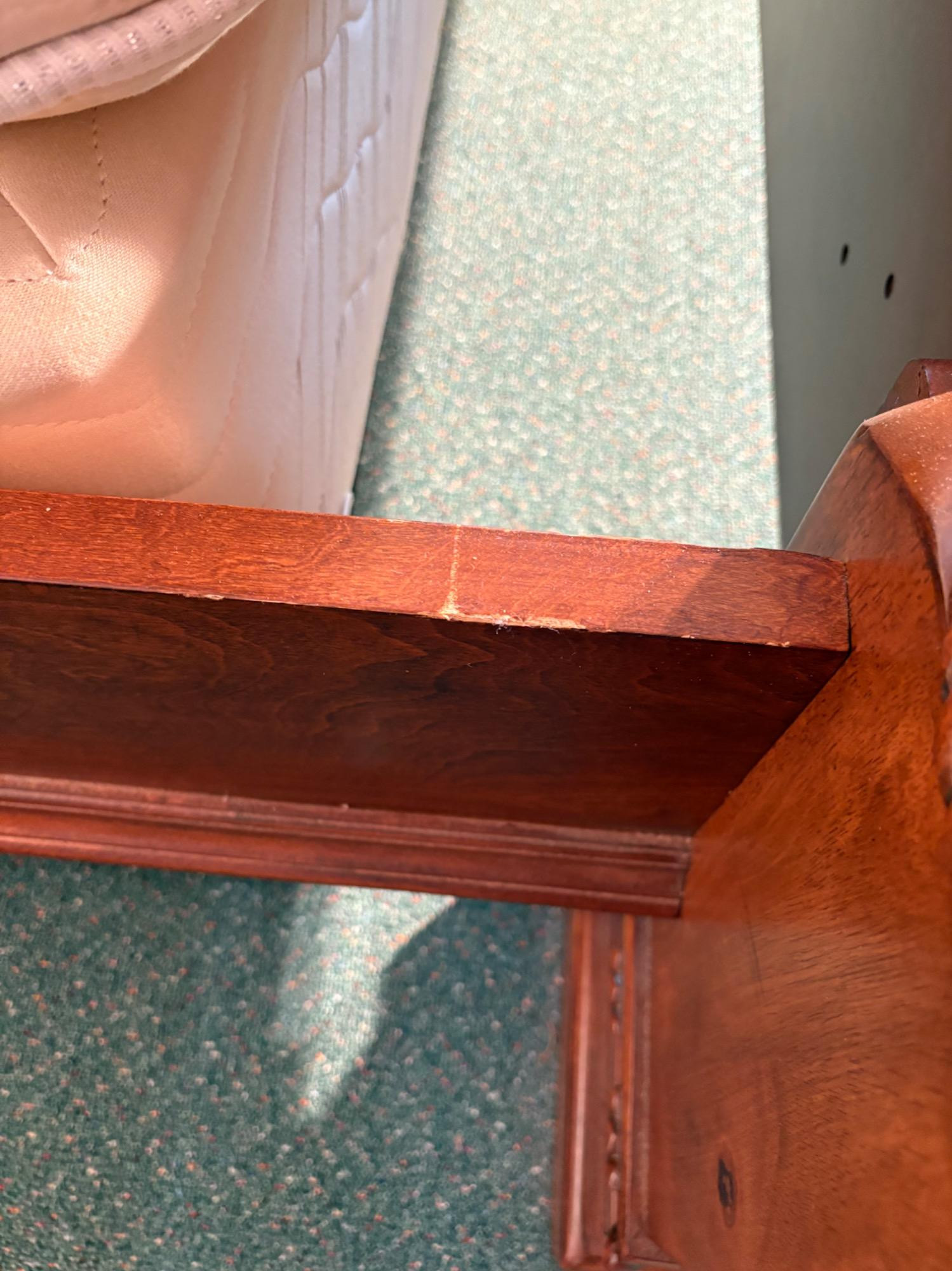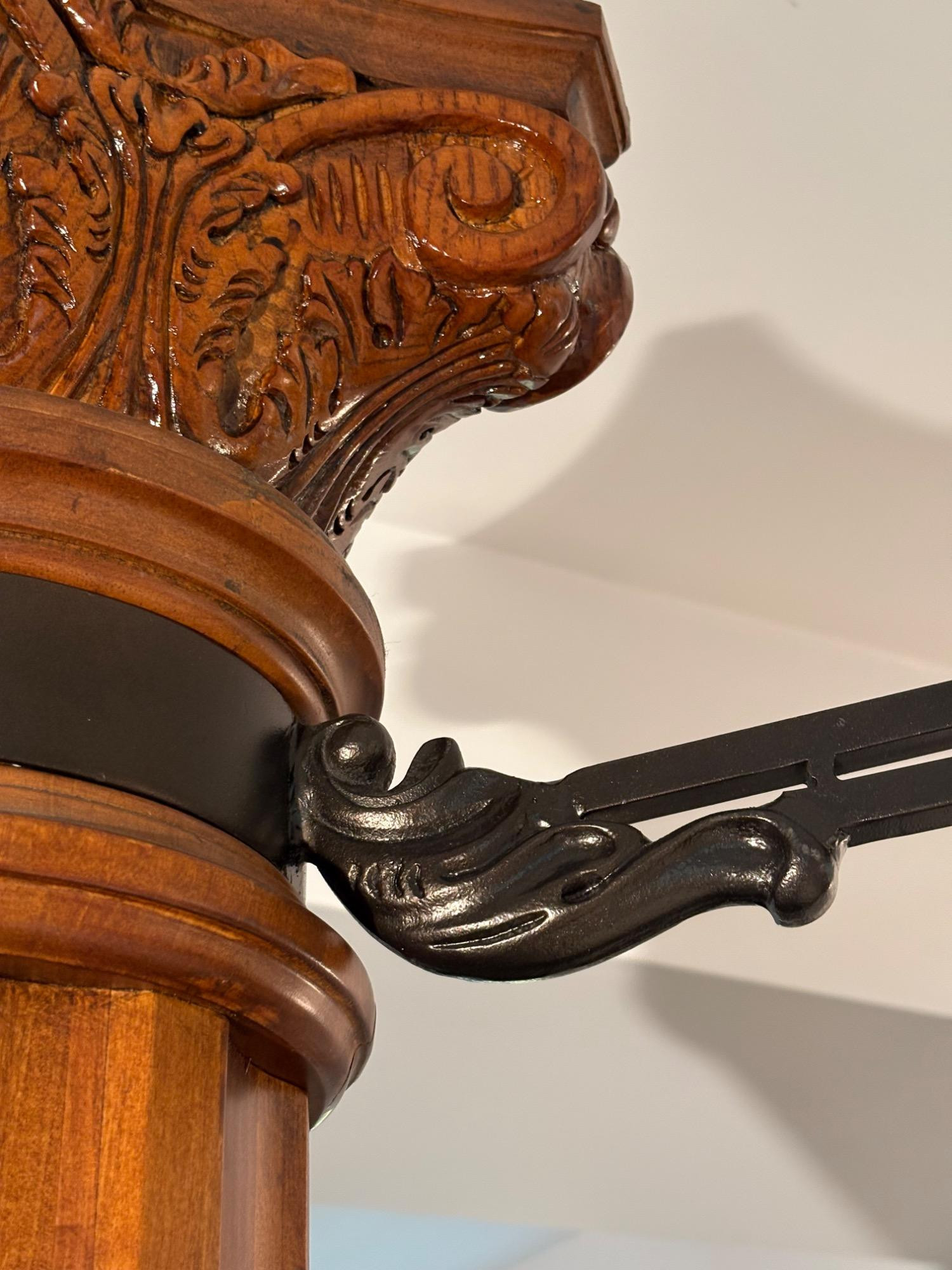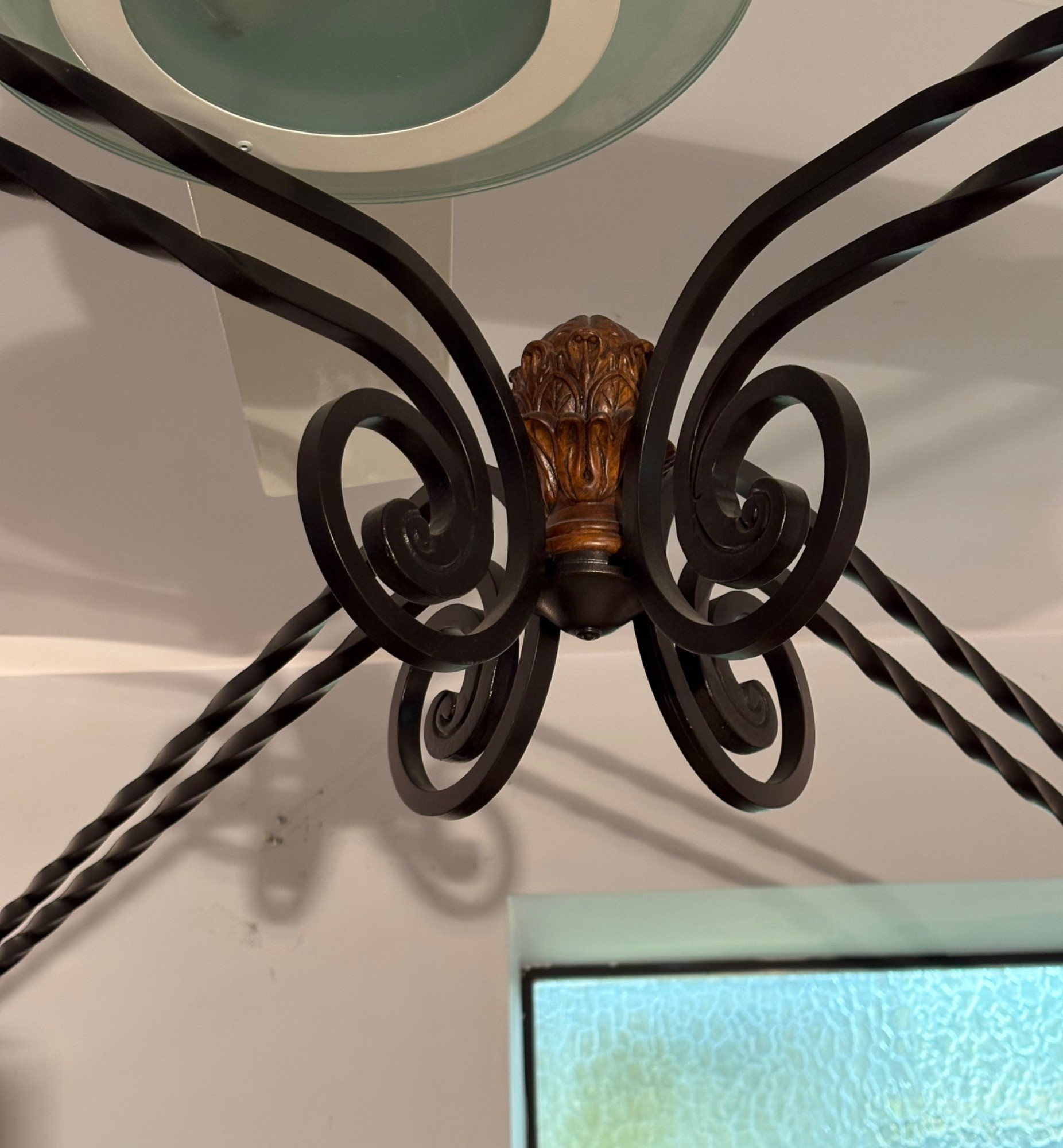Queen 4-poster bed frame with lots of classic design elements. Solid wood in a warm brown color. Half-moon shaped headboard and footboard have plush brown upholstery below intricately carved channels with shell-motif wood decoration. Fluted columns anchor the design at the four corners and hold a queen mattress in place. Above the frame twisted double-wrought iron supports span from the columns into the center of the bed with a pinecone finial where they intersect. 5 boards with 2" x2" legs support the mattress (they need some new screws). Columns measure approx. 91" from top of Corinthian capital to base. Headboard measures approx. 72" from floor to highest point while footboard measures approx. 29" from floor to highest point. Frame length measures approx. 101" from outside of column base at head of frame to outside of column base at foot of frame. Total width from outside of column base to outside column base is just over 77". In very good used shape with only a few scratches/nicks here and there that could easily be covered with a furniture crayon (see last 3 photos for most egregious ones). Beautiful and very sturdy, this piece of furniture would be the centerpiece of any room. Mattress is included if purchaser wants it. Local Pickup Only. Bidding on this lot is an agreement that: (1.) You will have 2 capable, able-bodied persons to lift and load at a minimum. (2.) You will bring a hand truck and/or any other tools needed to remove this item. If these steps are not followed your item will be forfeited and no refund given.