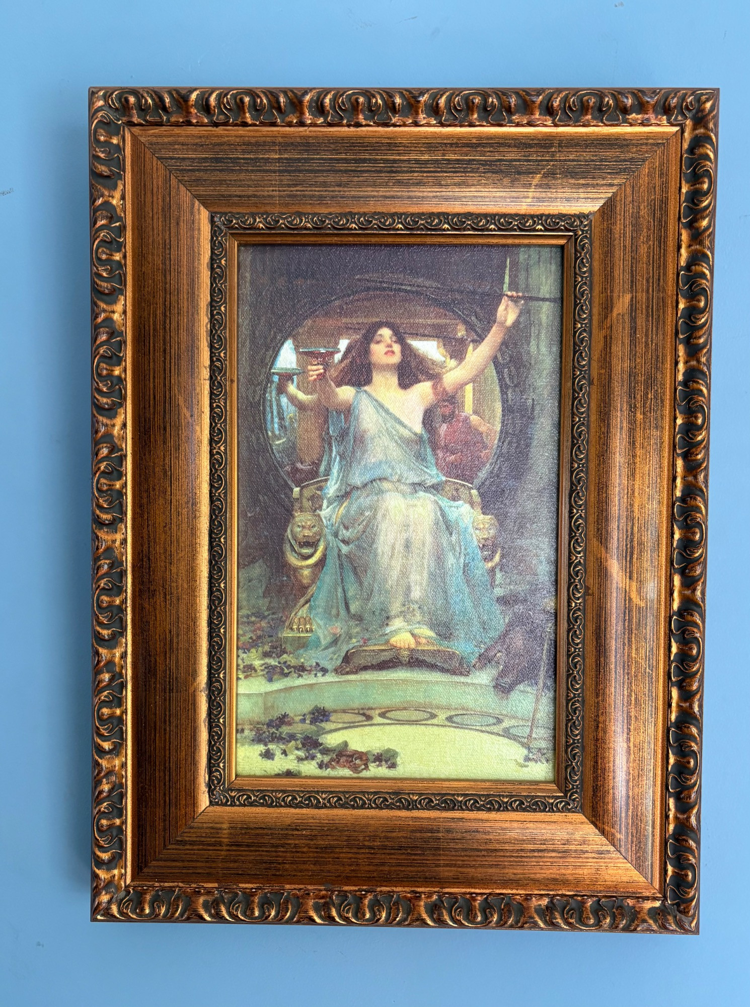 "Circe Offering the Cup to Ulysses" by John William Waterhouse (1849-1917). Reproduction painting on canvas with lovely gold wooden frame. From Around the Corner Fine Art of Virginia known for producing high quality reproductions & frames in the 1980s & 1990s (Sadly, they appear to have closed shop in the early 2000s). We found a catalogue offering many of the exact works our client owned that roughly aligns with our client's purchase dates (pre-internet when everything was phone ordered or mail ordered). For those curious about the original price range/production of the paintings, see catalogue info in photos below after the listing photos. Can be shipped FedEx.