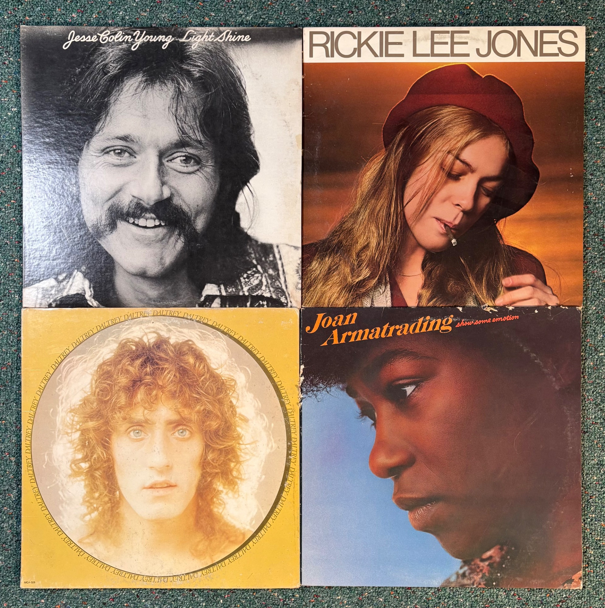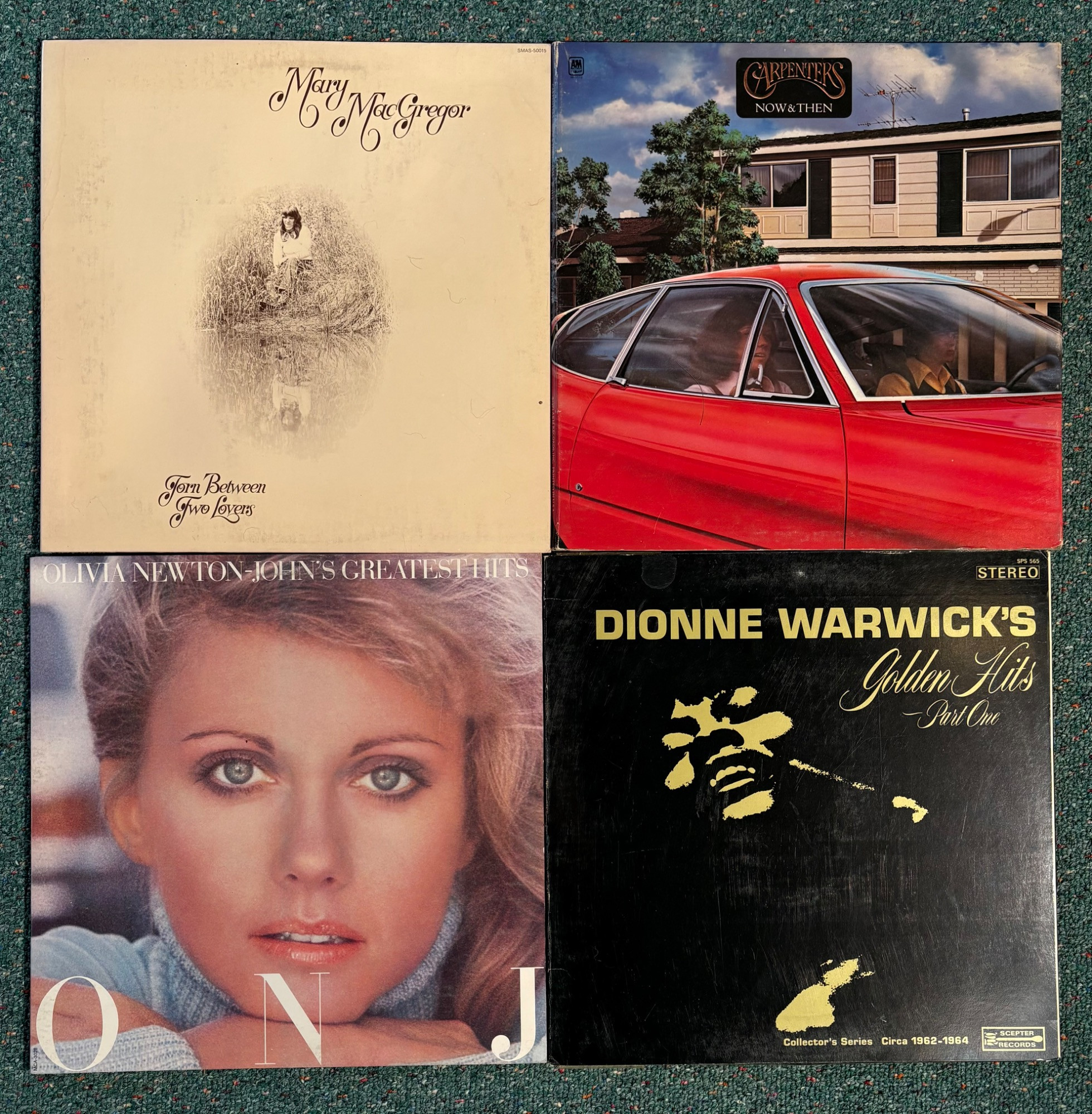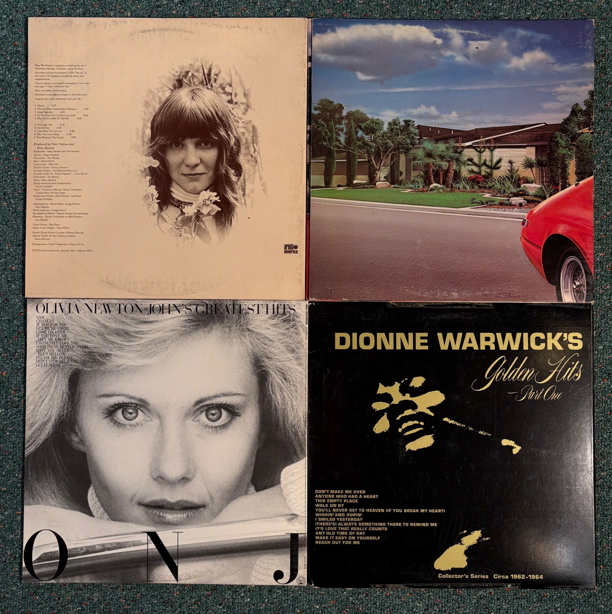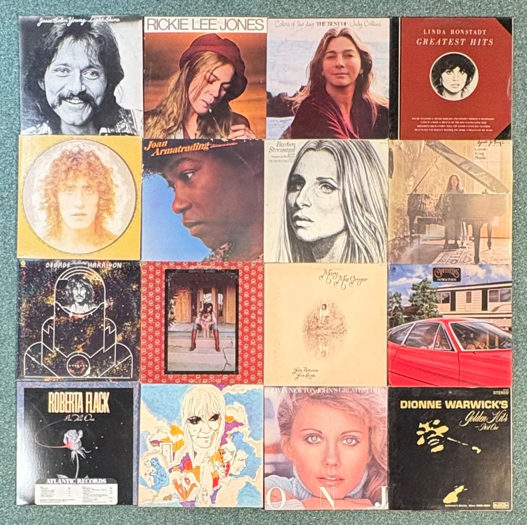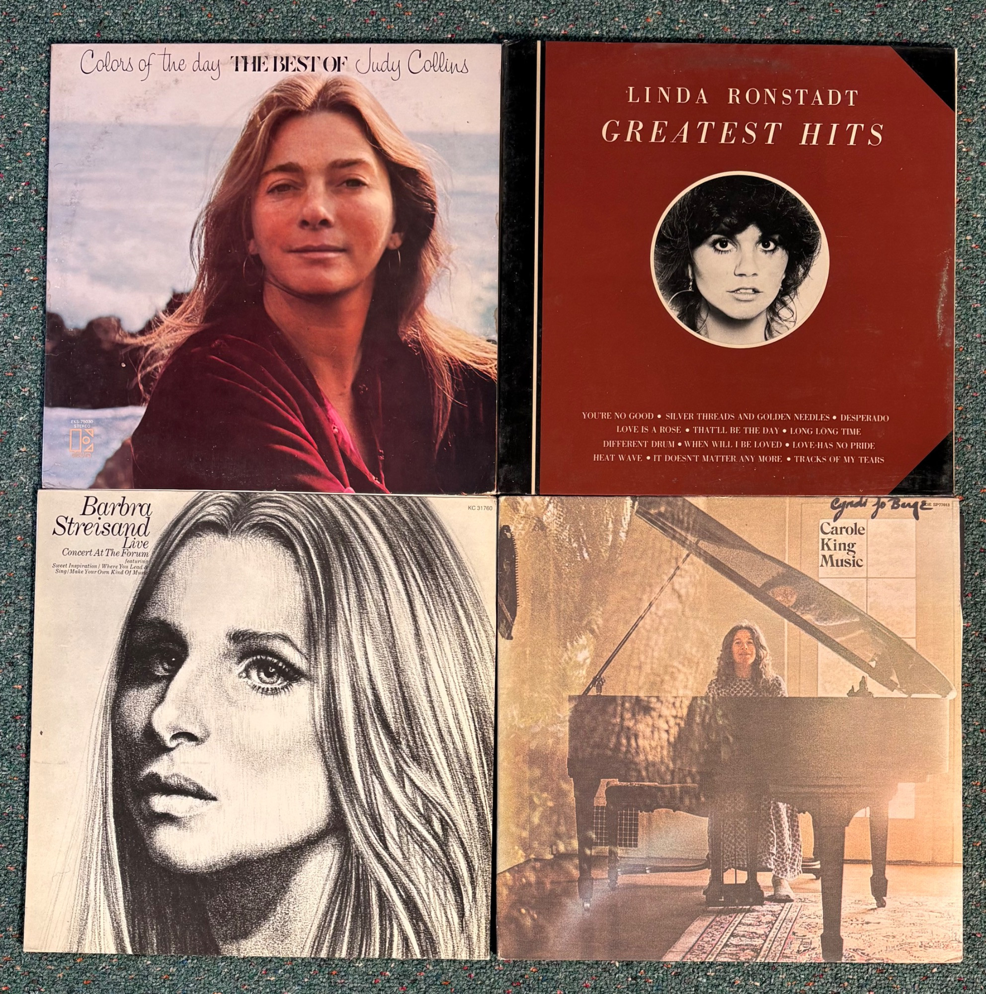 16 vintage vinyl LPs! Our client had eclectic taste and loved his albums - thus, most of these have been lovingly played over the years. We checked to make sure the correct album was in the correct cover and did a cursory glance for any egregious scratches. Some covers reflect heavy use and are worn/split in places/have names written on them. However, the majority are in good used shape. Artists/Bands in this lot include: Linda Ronstadt Judy Collins Carole King Barbra Streisand Joan Armatrading Ricky Lee Jones Roger Daltry Jesse Colin Young Dionne Warwick The Carpenters Olivia Newton-John Mary MacGregor Melanie Emmylou Harris Roberta Flack George Harrison
