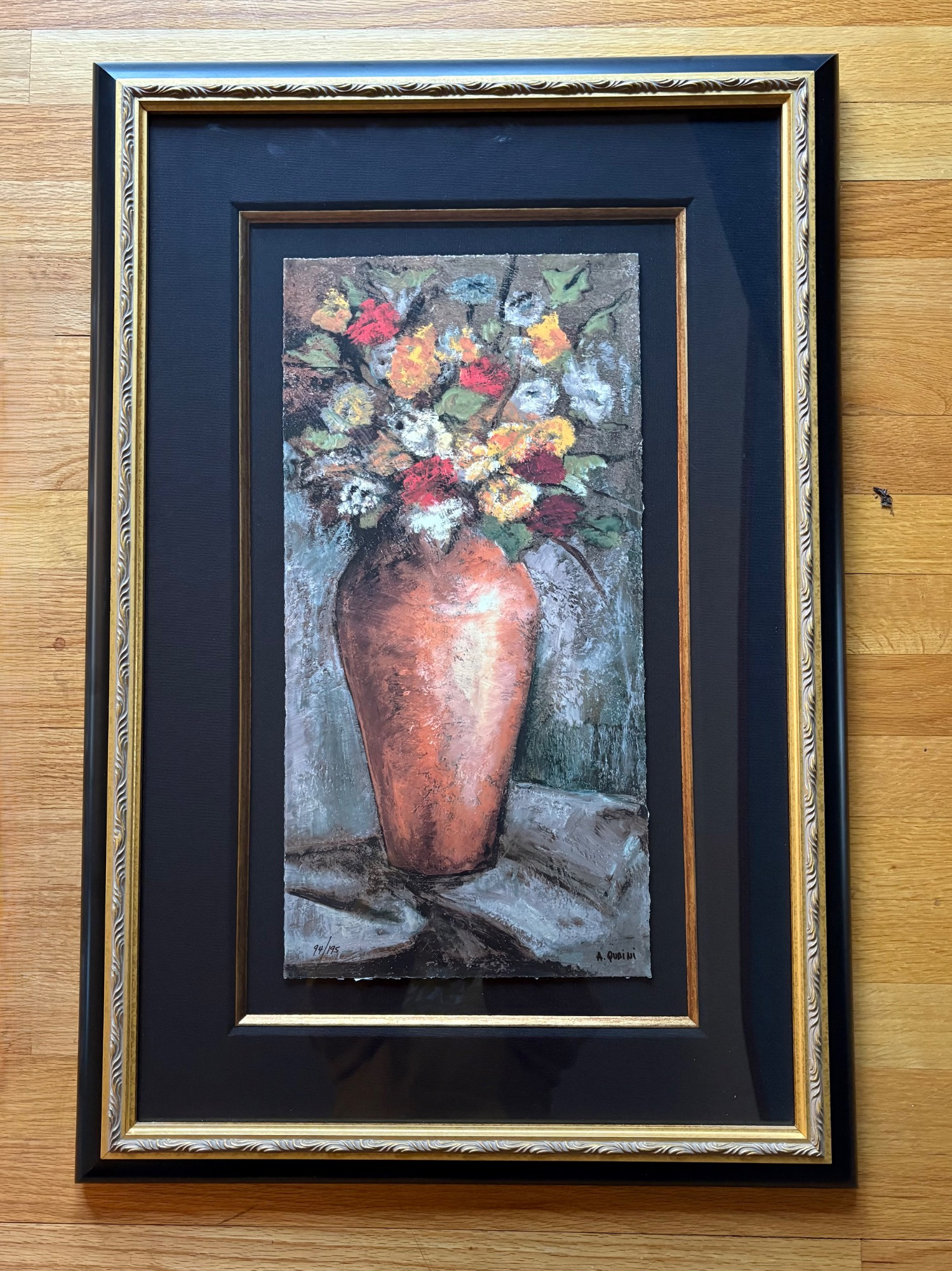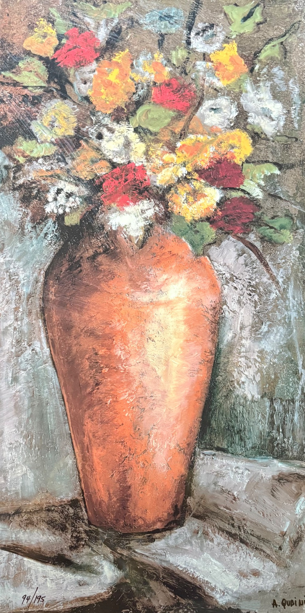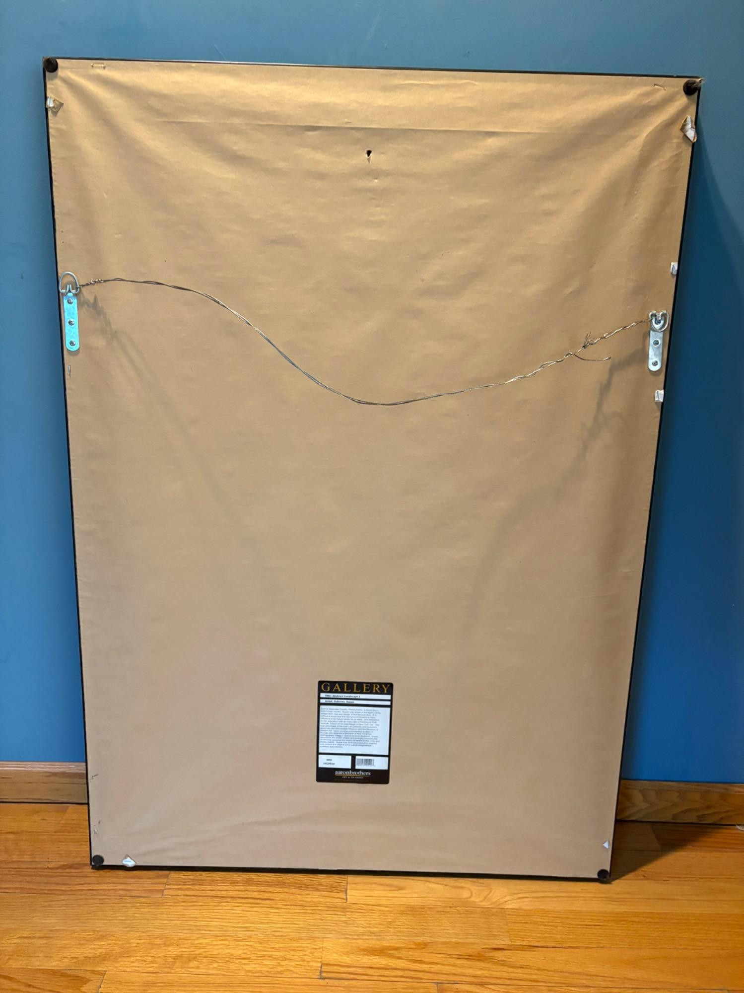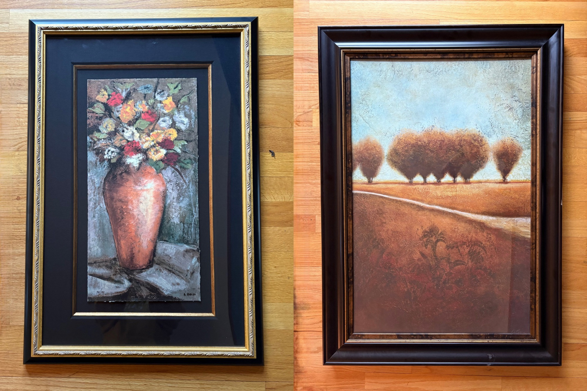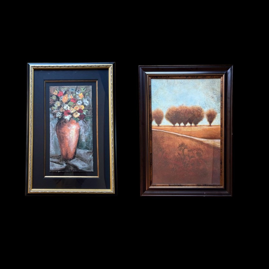Pair of contemporary reproduction paintings. Alice Qubini "Vase of Flowers". Reproduction painting of a vase of flowers. Editioned 94/195. Measures 31" H x 21" W x 1.5" D. Susan Osbourne’s "Abstract Landscape II". Photo reproduction of original painting. Measures 41.25" H x 29.5" W x 1.75" D. Damage to lower right side of frame - see last photo.