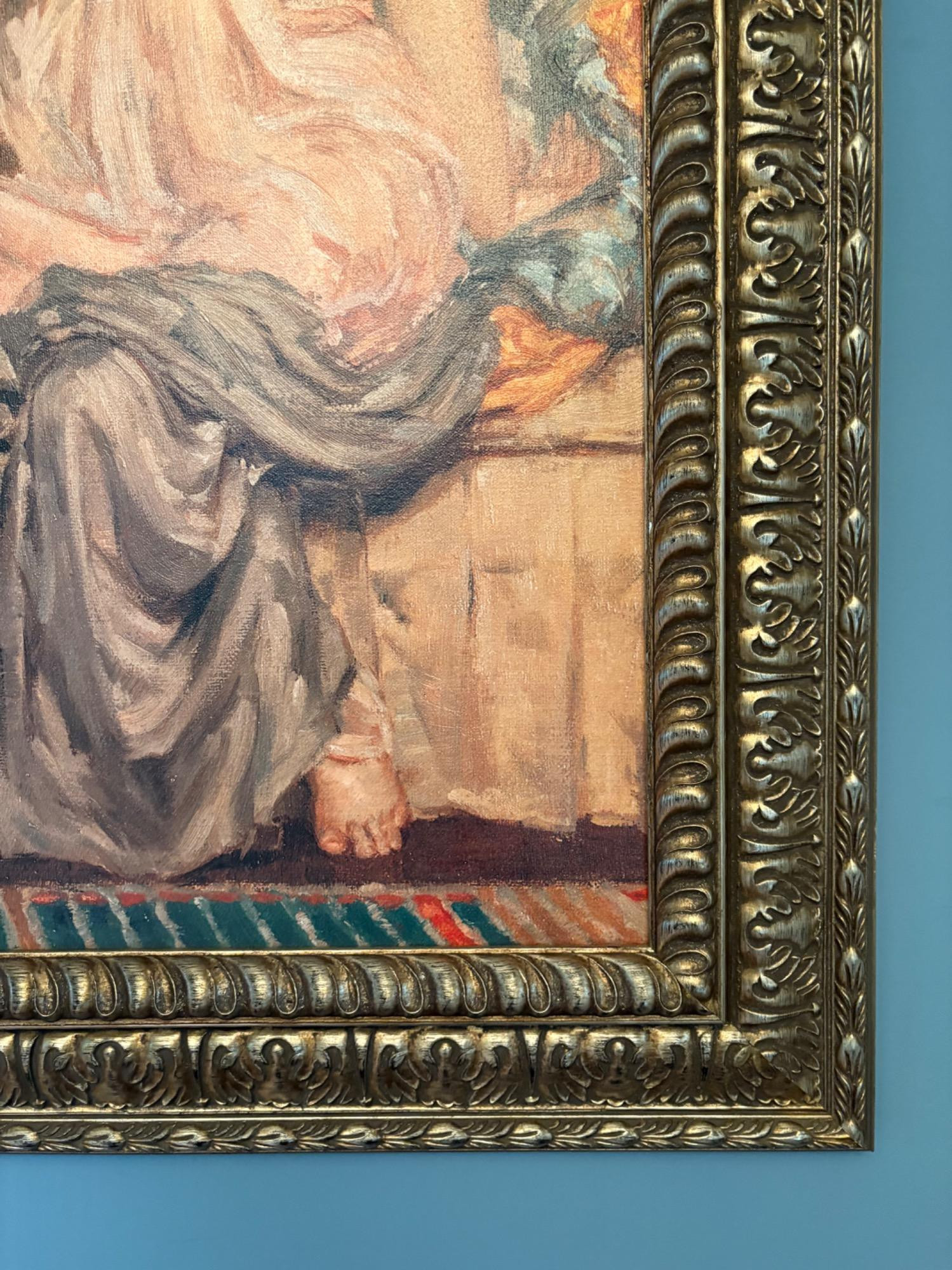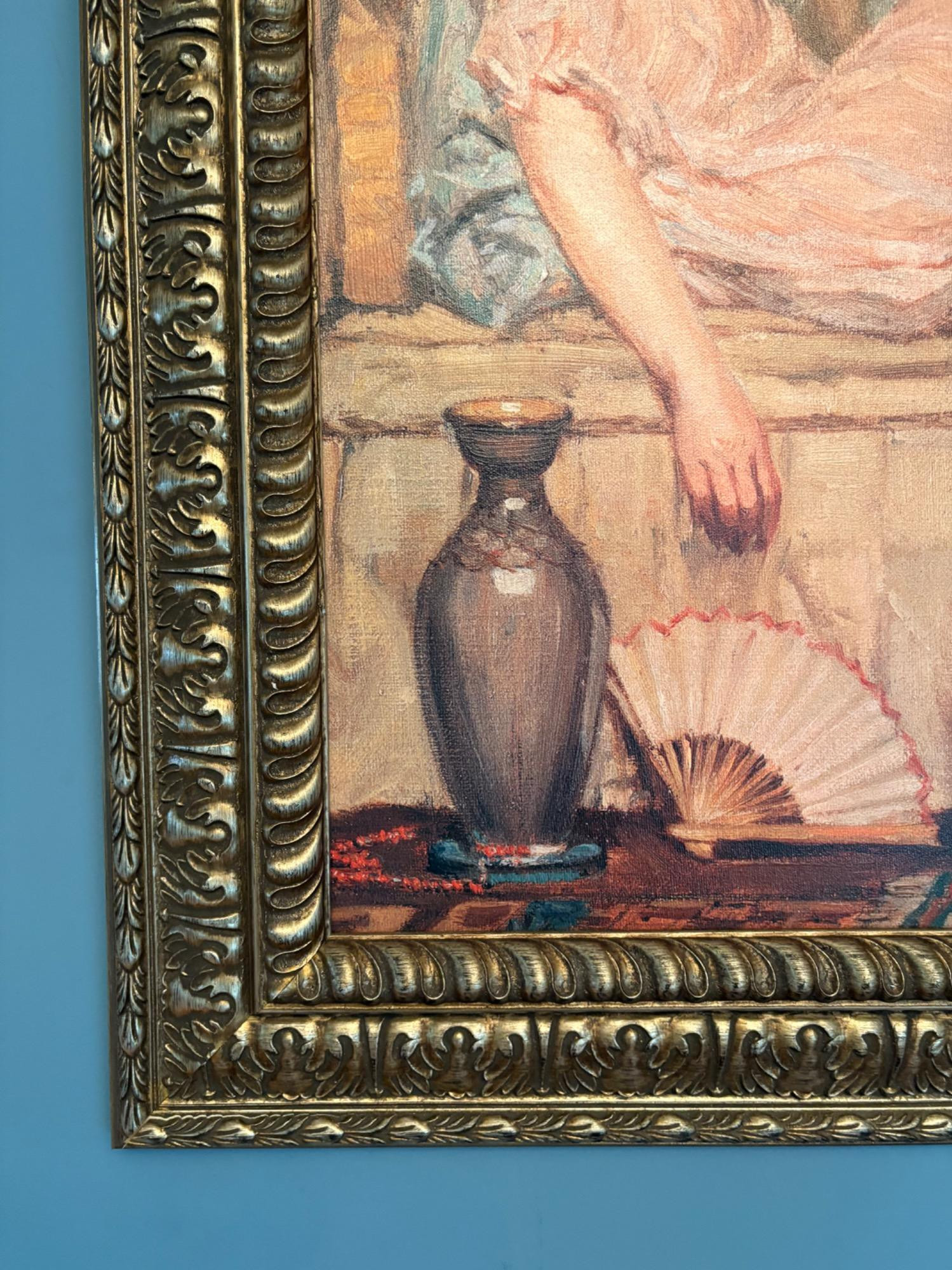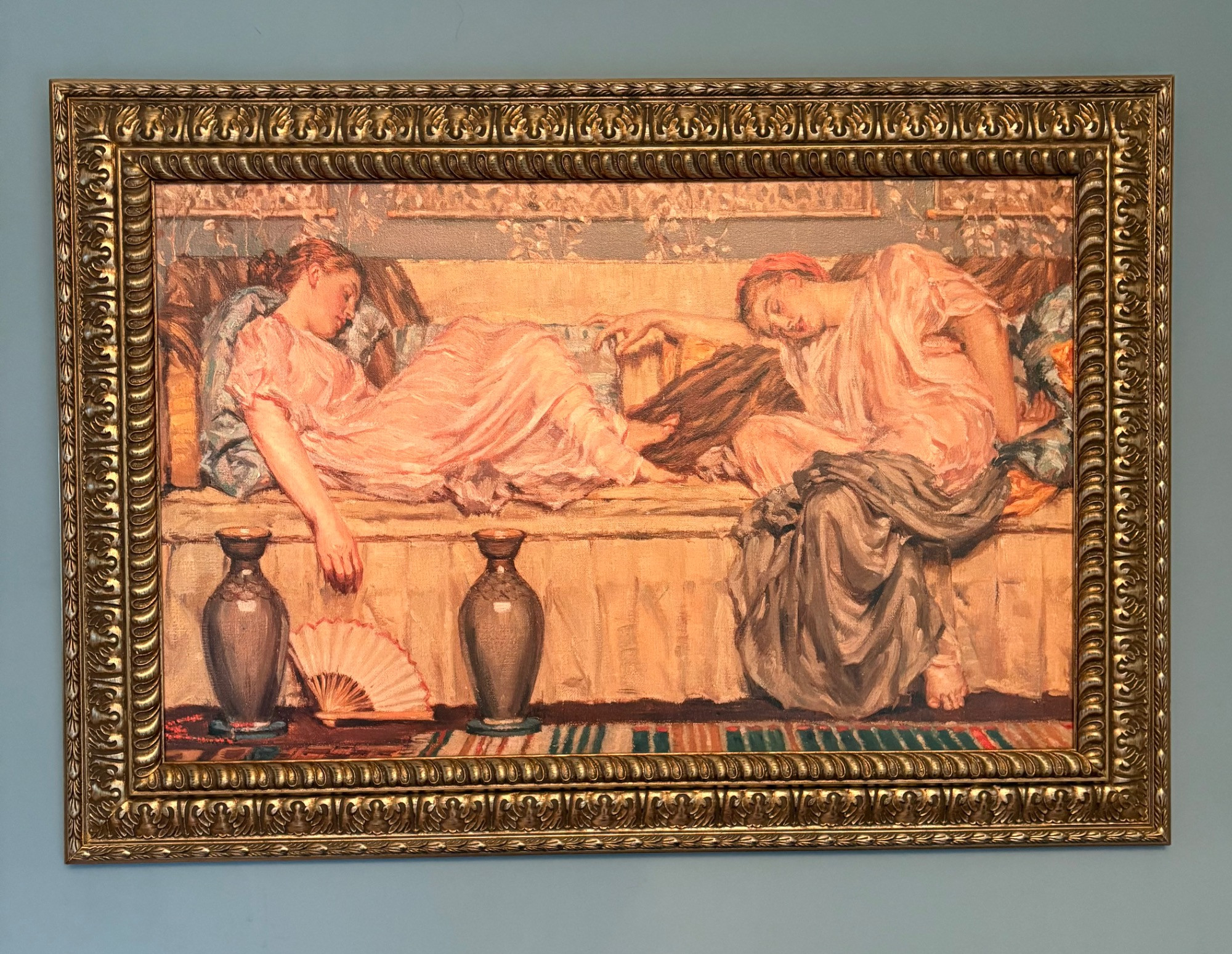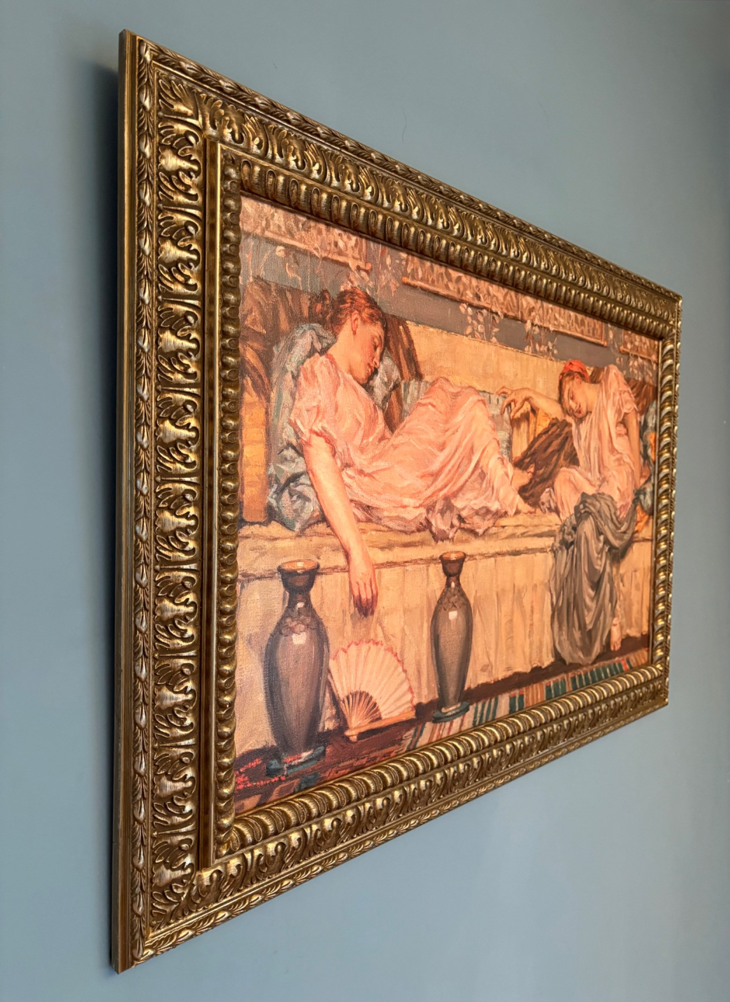 “Two Women on a Sofa” by James Albert Moore (1841 - 1893). Reproduction painting on canvas with pale translucent color. Framed in antiqued silver leaf wood frame. Fairly large at about 2.5' high x over 3' wide framed. We are usure of the origin of this reproduction - given the image/frame, we think it might have been from Around the Corner Art but are not certain. Can be shipped FedEx.