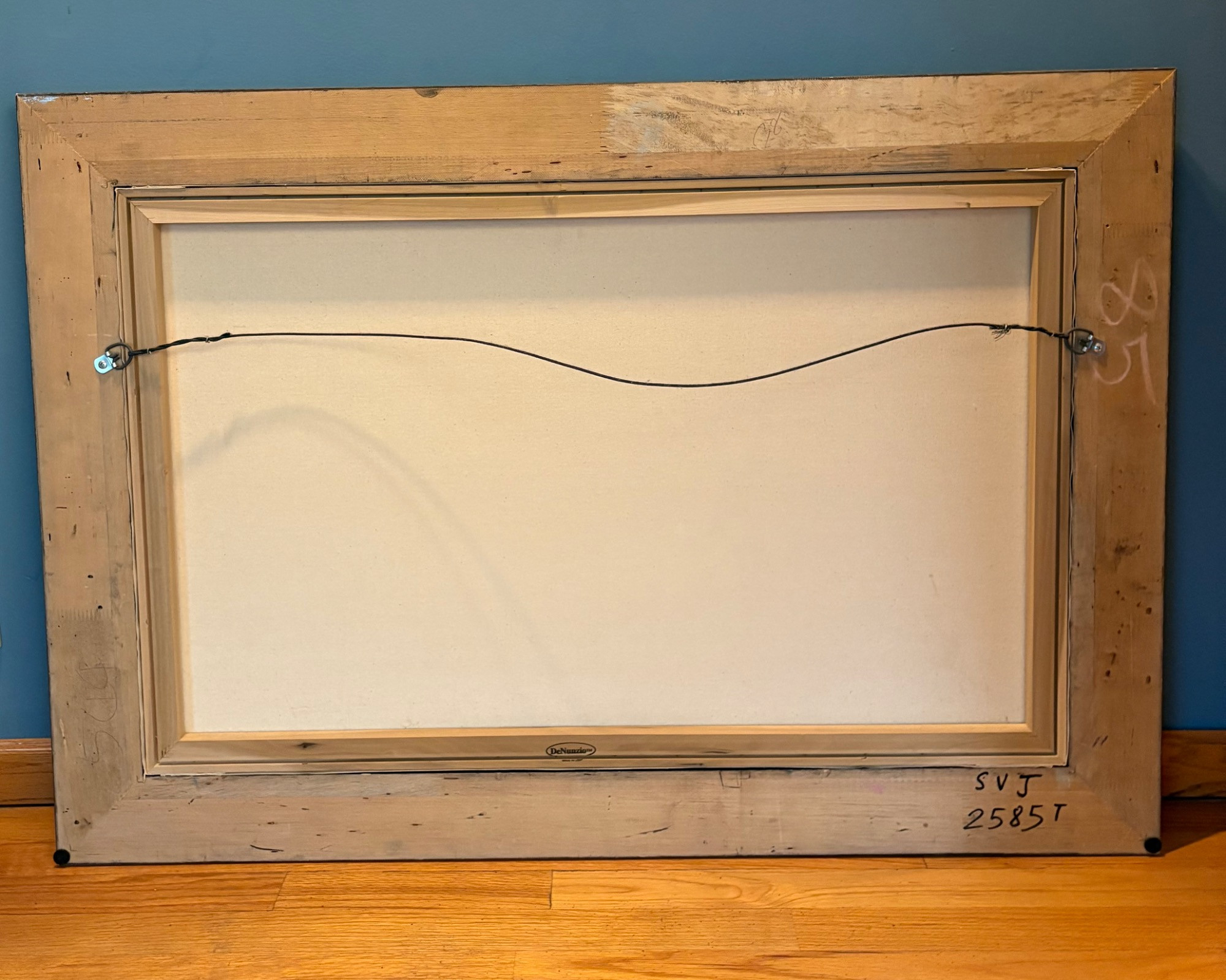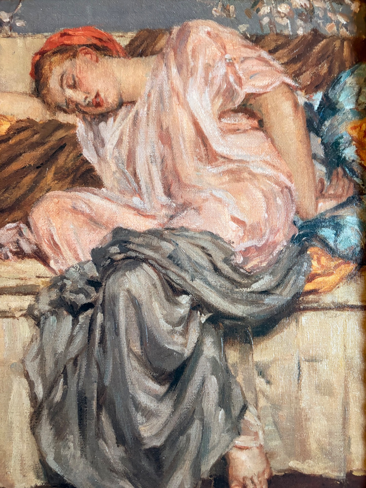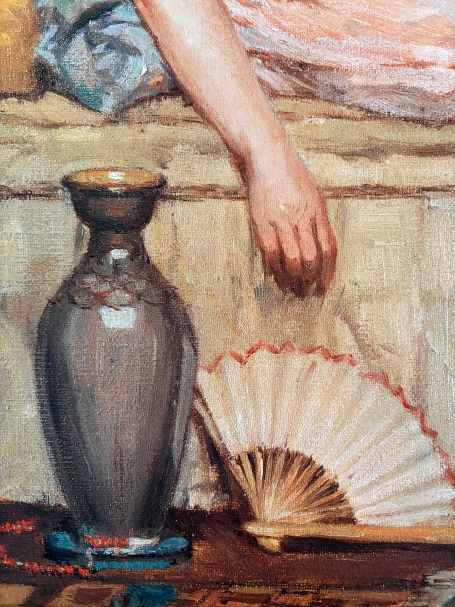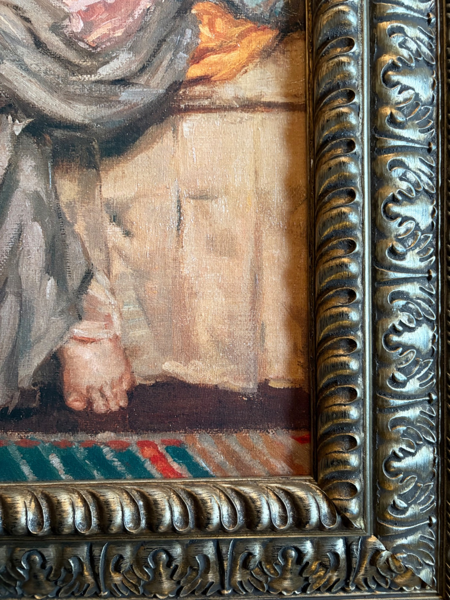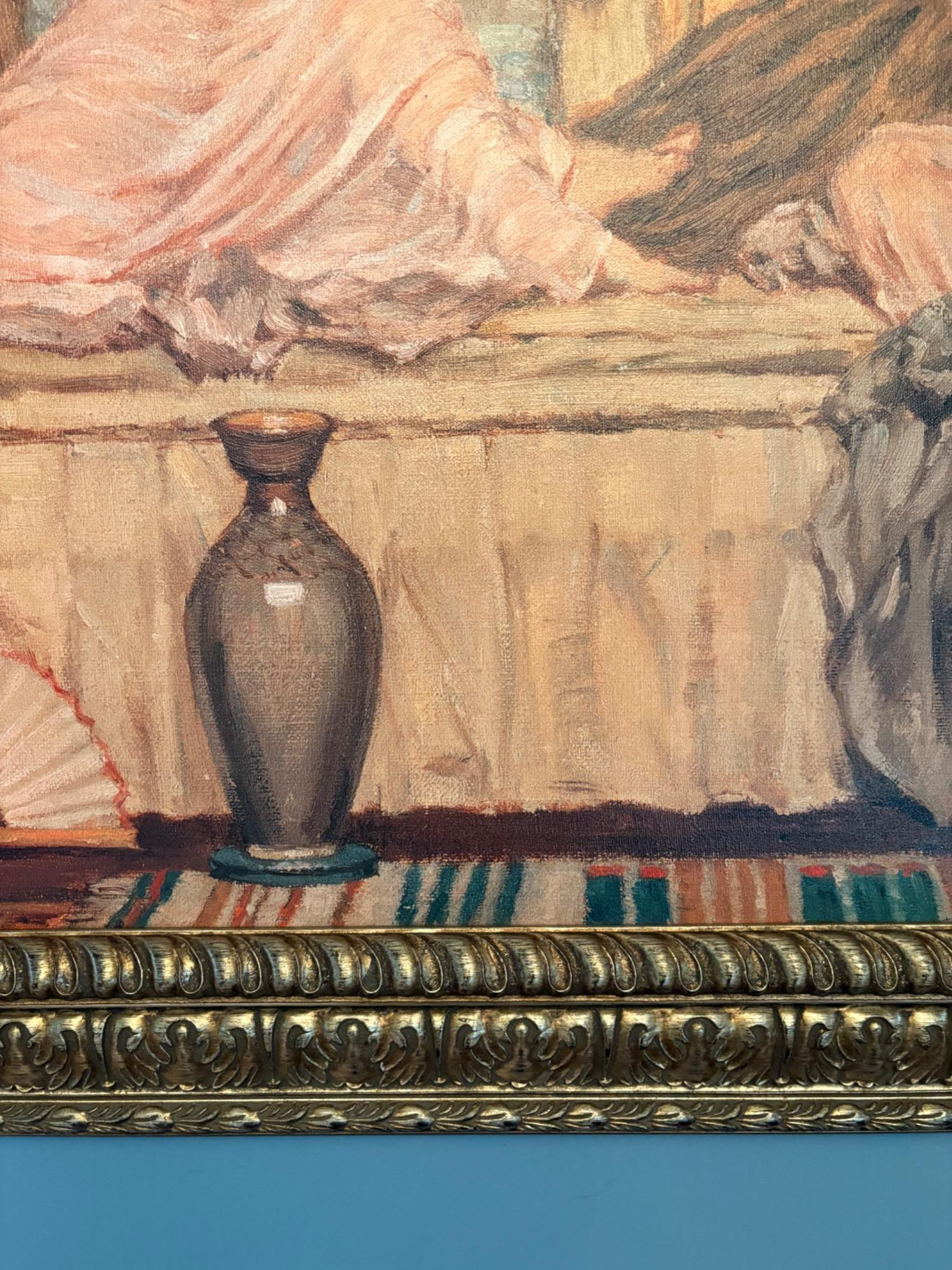 “Two Women on a Sofa” by James Albert Moore (1841 - 1893). Reproduction painting on canvas with pale translucent color. Framed in antiqued silver leaf wood frame. Fairly large at about 2.5' high x over 3' wide framed. We are usure of the origin of this reproduction - given the image/frame, we think it might have been from Around the Corner Art but are not certain. Can be shipped FedEx.