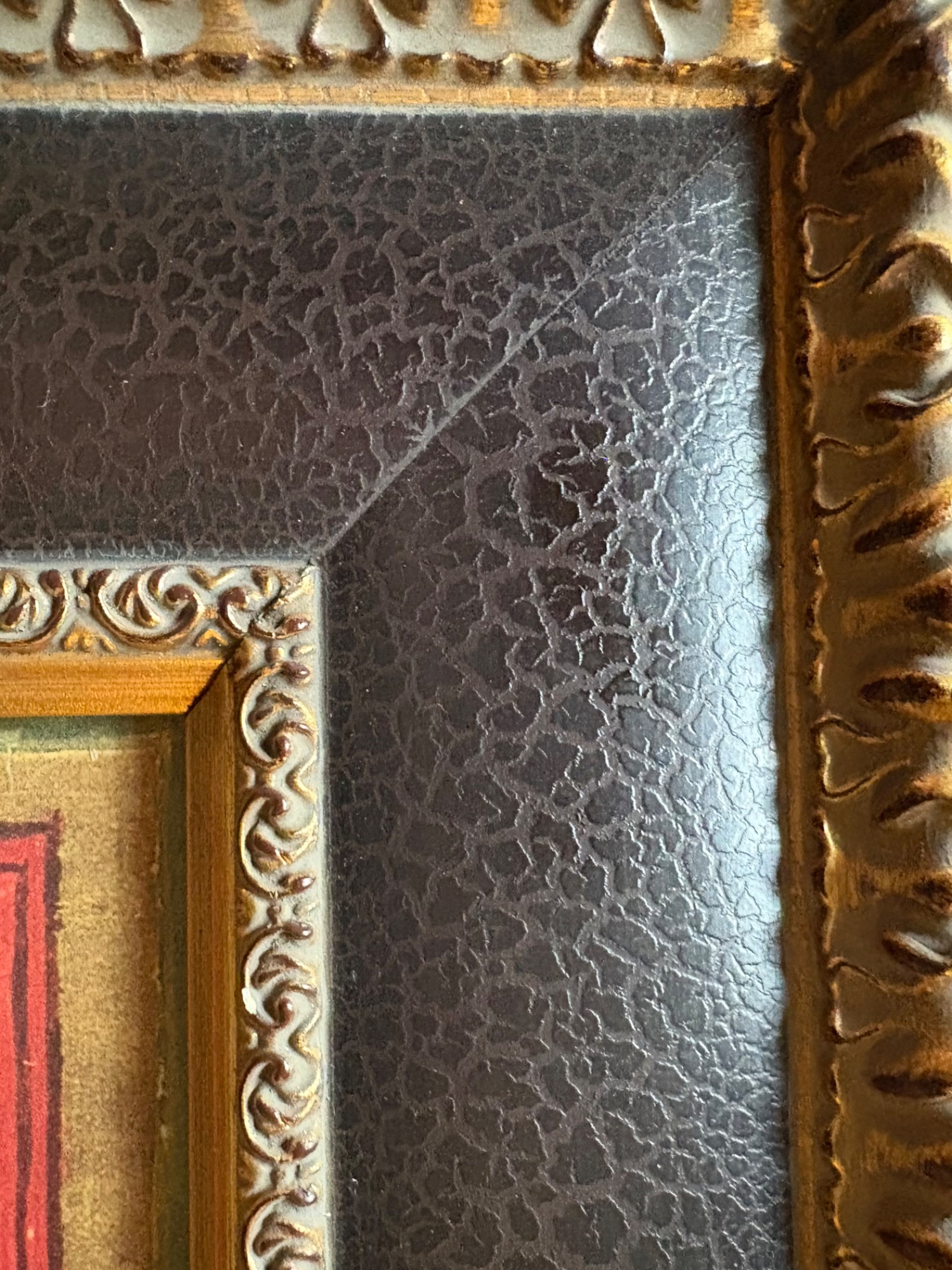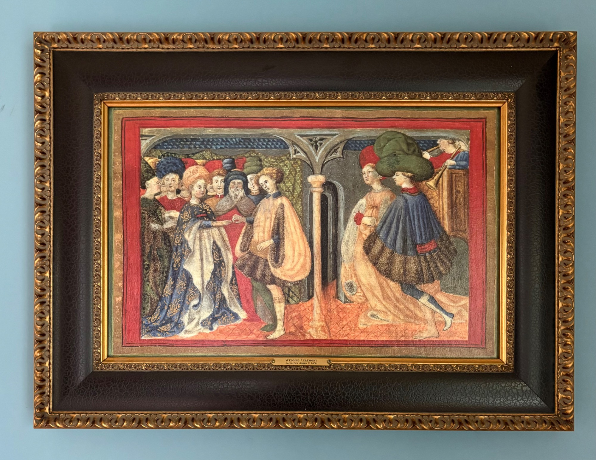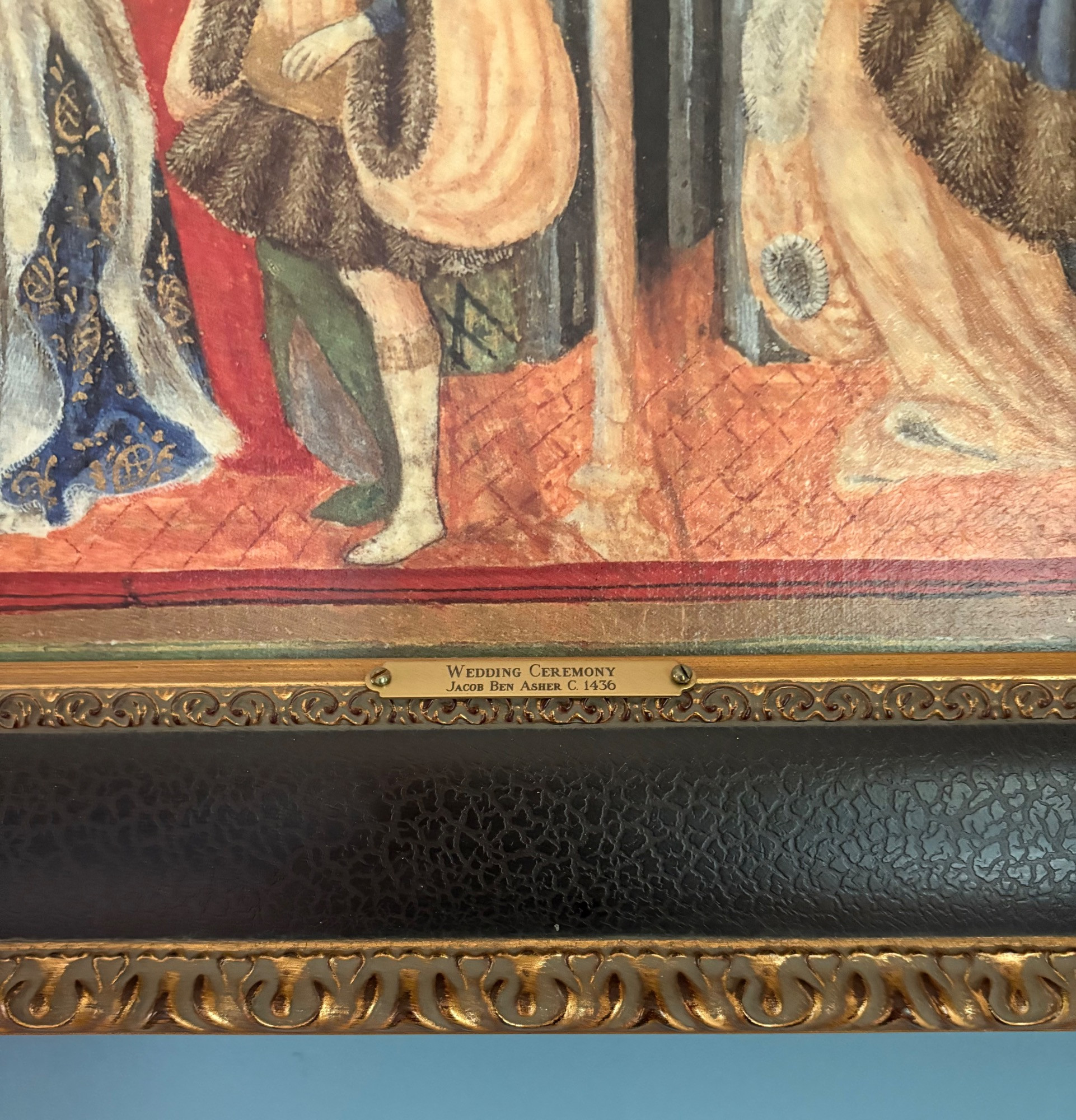 Reproduction illuminated manuscript on canvas of "Wedding Ceremony" by Jacob Ben Asher from 1436. Leather-look frame with inner and outer gold frame. Compact piece at about 1.5' high x 2' wide framed. From Around the Corner Fine Art of Virginia known for producing high quality reproductions & frames in the 1980s & 1990s (Sadly, they appear to have closed shop in the early 2000s). We found a catalogue offering many of the exact works our client owned that roughly aligns with our client's purchase dates (pre-internet when everything was phone ordered or mail ordered). For those curious about the original price range/production of the paintings, see catalogue info in photos below after the listing photos. Can be shipped FedEx.