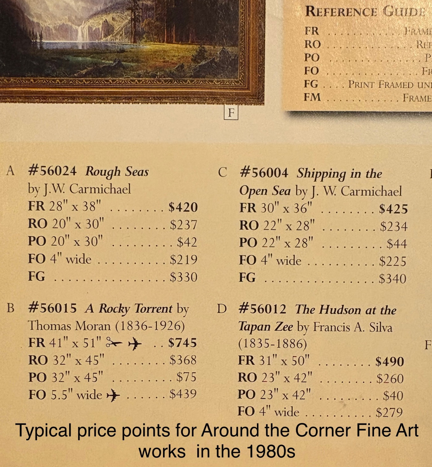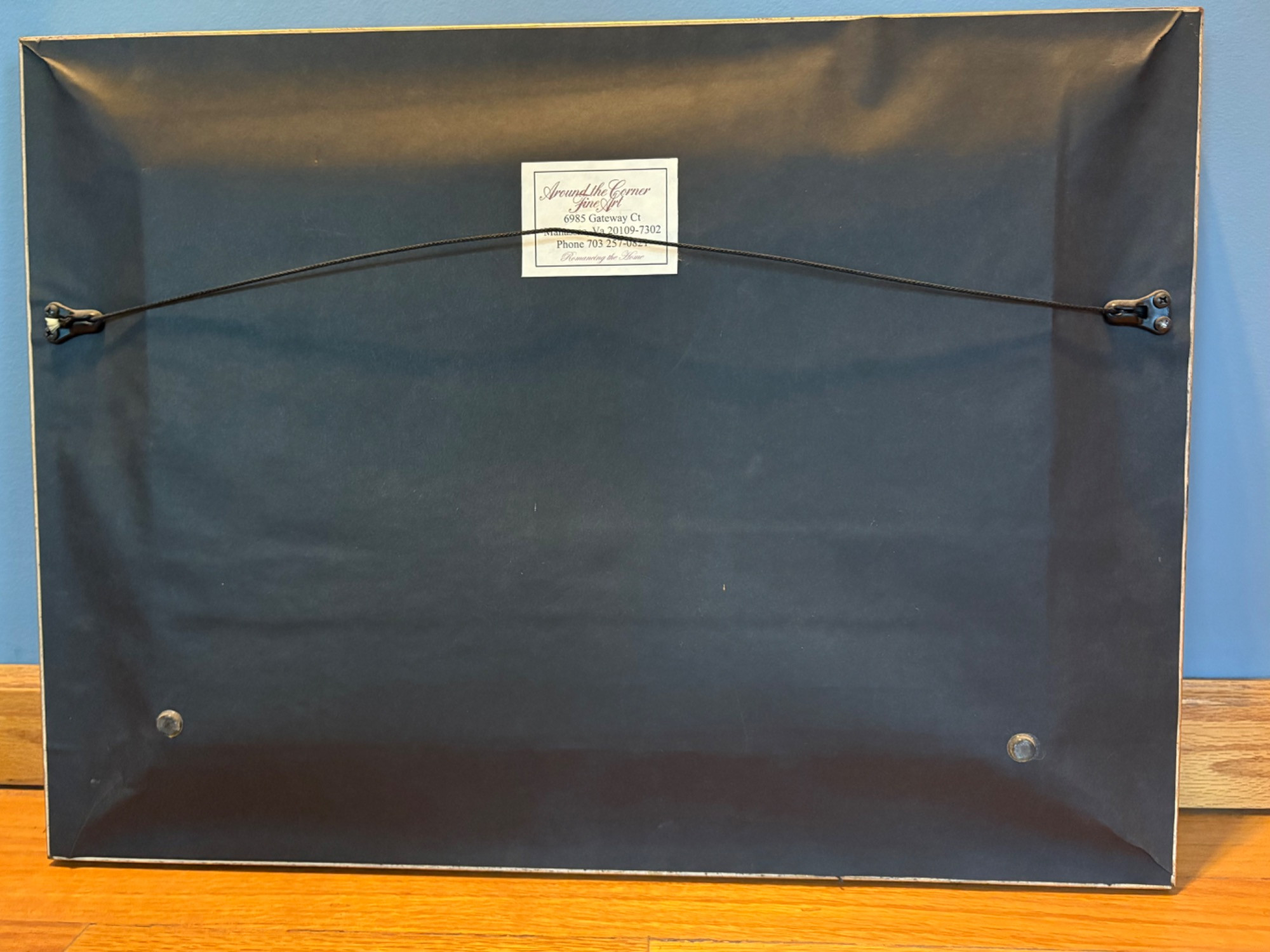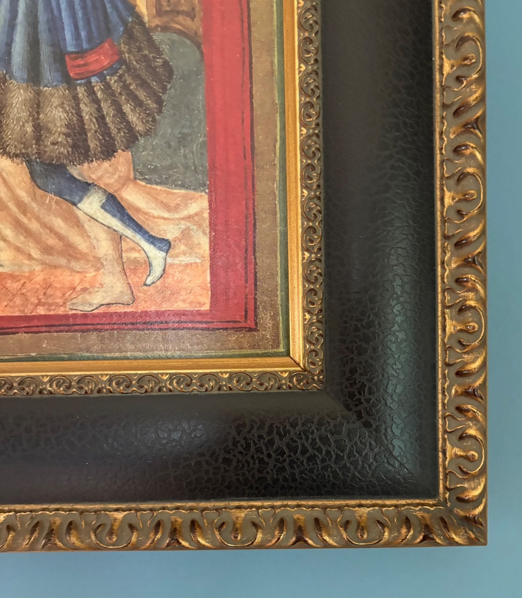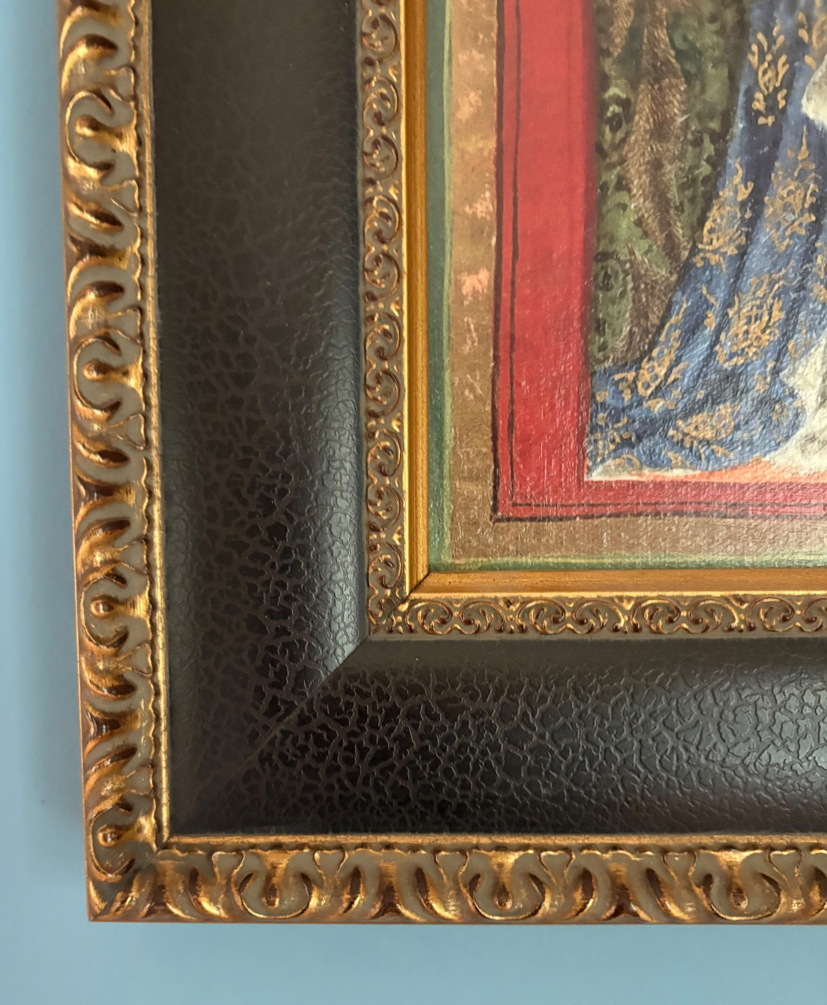 Reproduction illuminated manuscript on canvas of "Wedding Ceremony" by Jacob Ben Asher from 1436. Leather-look frame with inner and outer gold frame. Compact piece at about 1.5' high x 2' wide framed. From Around the Corner Fine Art of Virginia known for producing high quality reproductions & frames in the 1980s & 1990s (Sadly, they appear to have closed shop in the early 2000s). We found a catalogue offering many of the exact works our client owned that roughly aligns with our client's purchase dates (pre-internet when everything was phone ordered or mail ordered). For those curious about the original price range/production of the paintings, see catalogue info in photos below after the listing photos. Can be shipped FedEx.