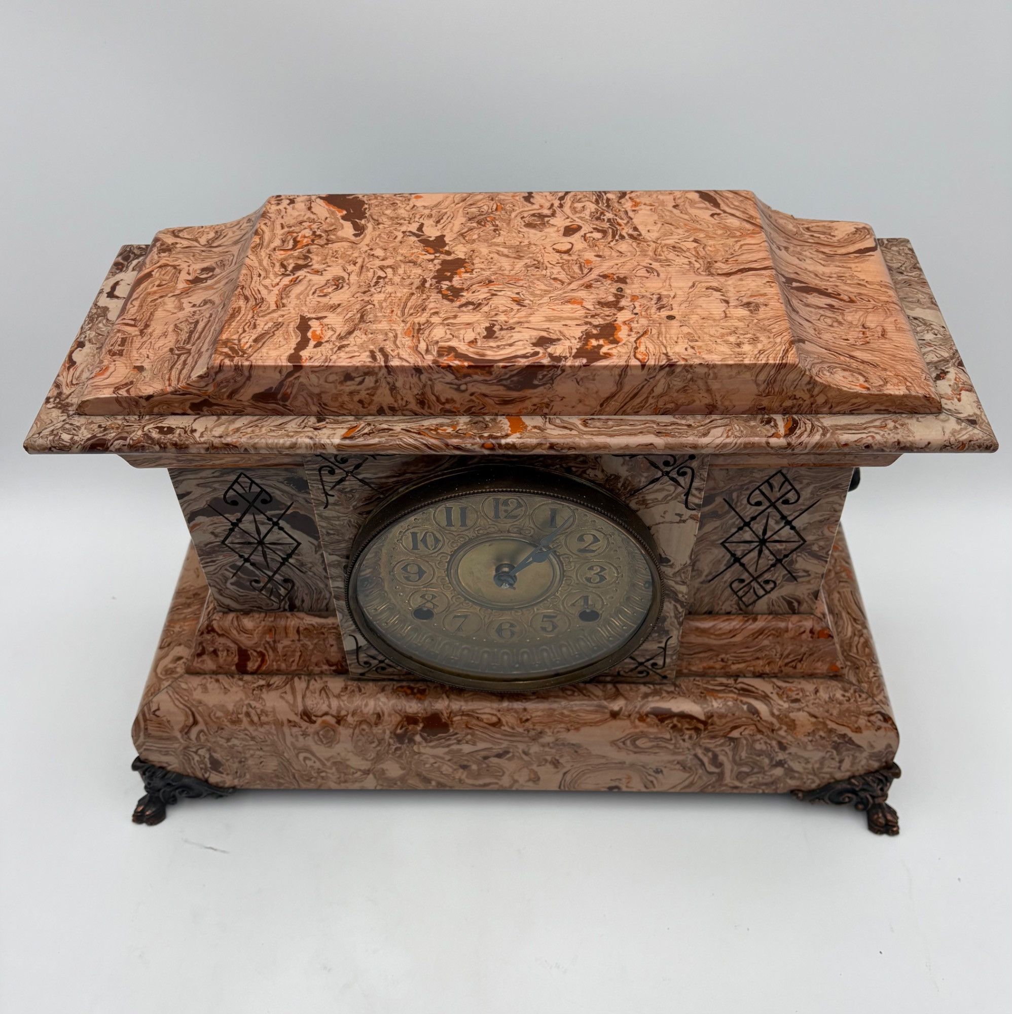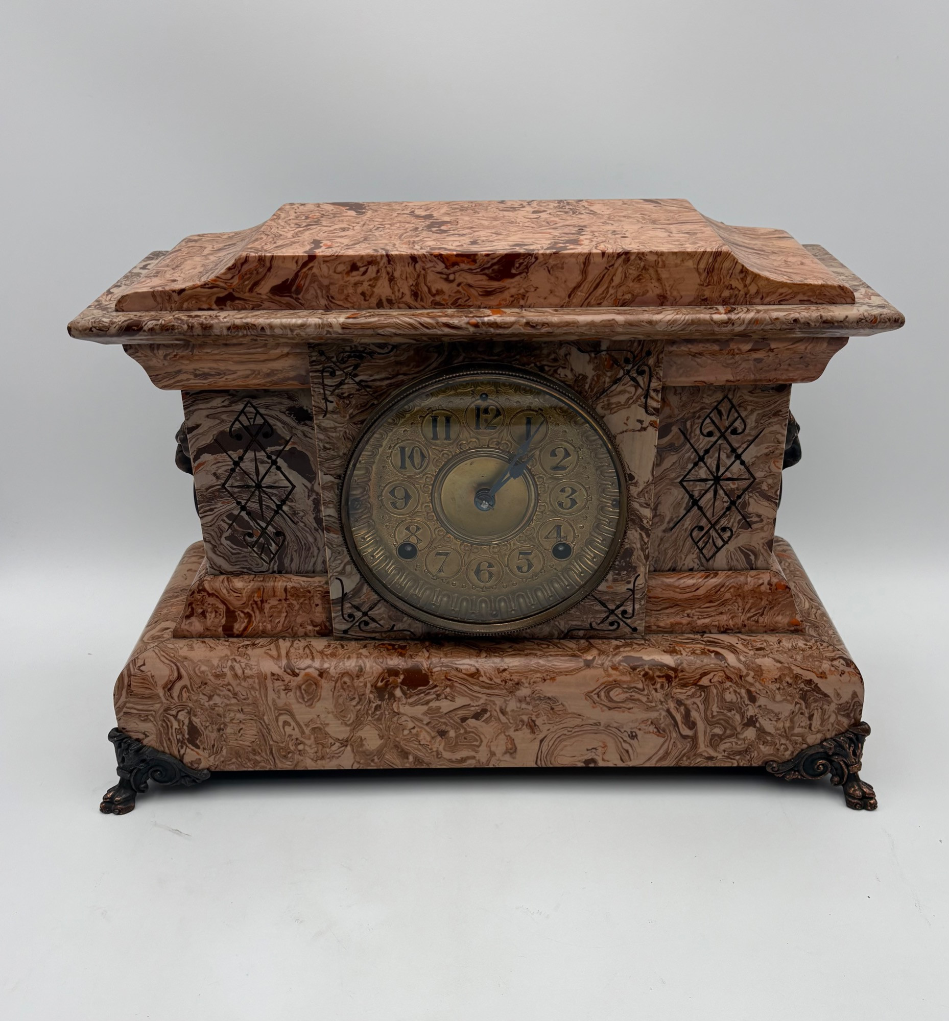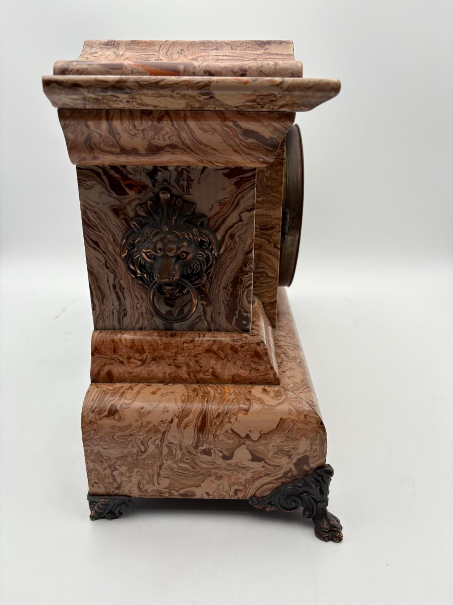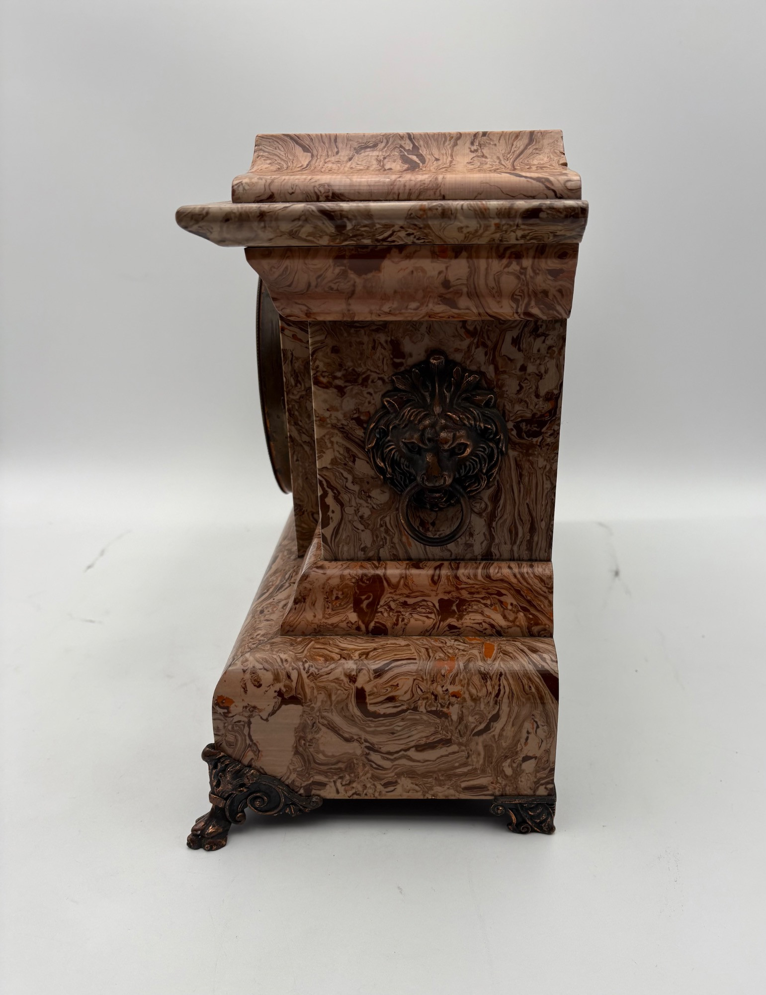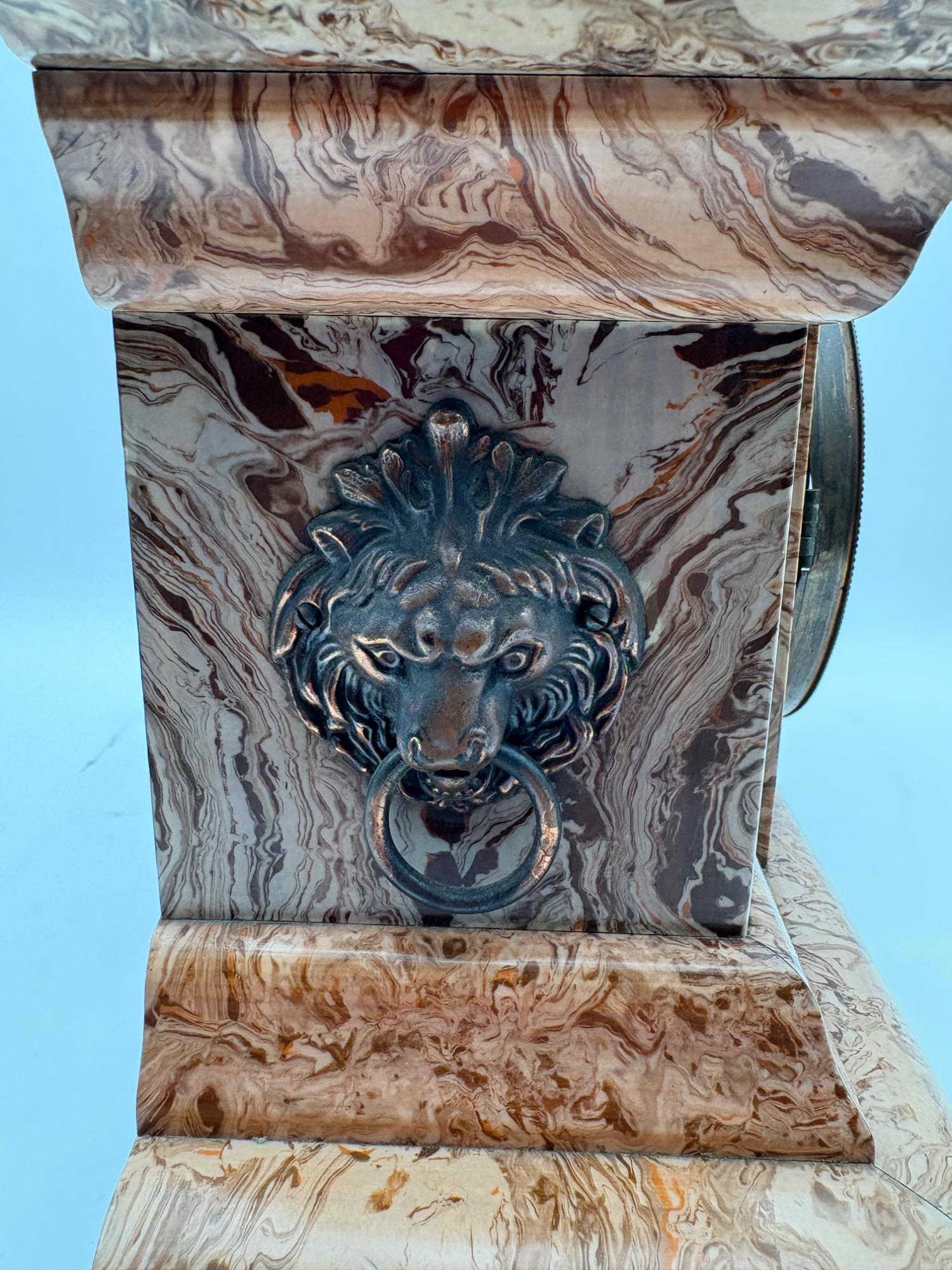 Beige marble-effect clock. This clock gives the appearance of marble, but appears to have a veneer of some kind and is actually quite lightweight for its size. If it is plastic, they've done an incredibly good job of imitating marble! Clockface measures approx. 5.75" across with Roman numerals and an opening glass cover. Back panel slides open to exposure inner workings. There are engraved designs along the body of the clock and it is supported by 4 clawed feet. Lion's head handles on sides. Currently working, but we do not know how accurately it keeps time. Comes with winding key.