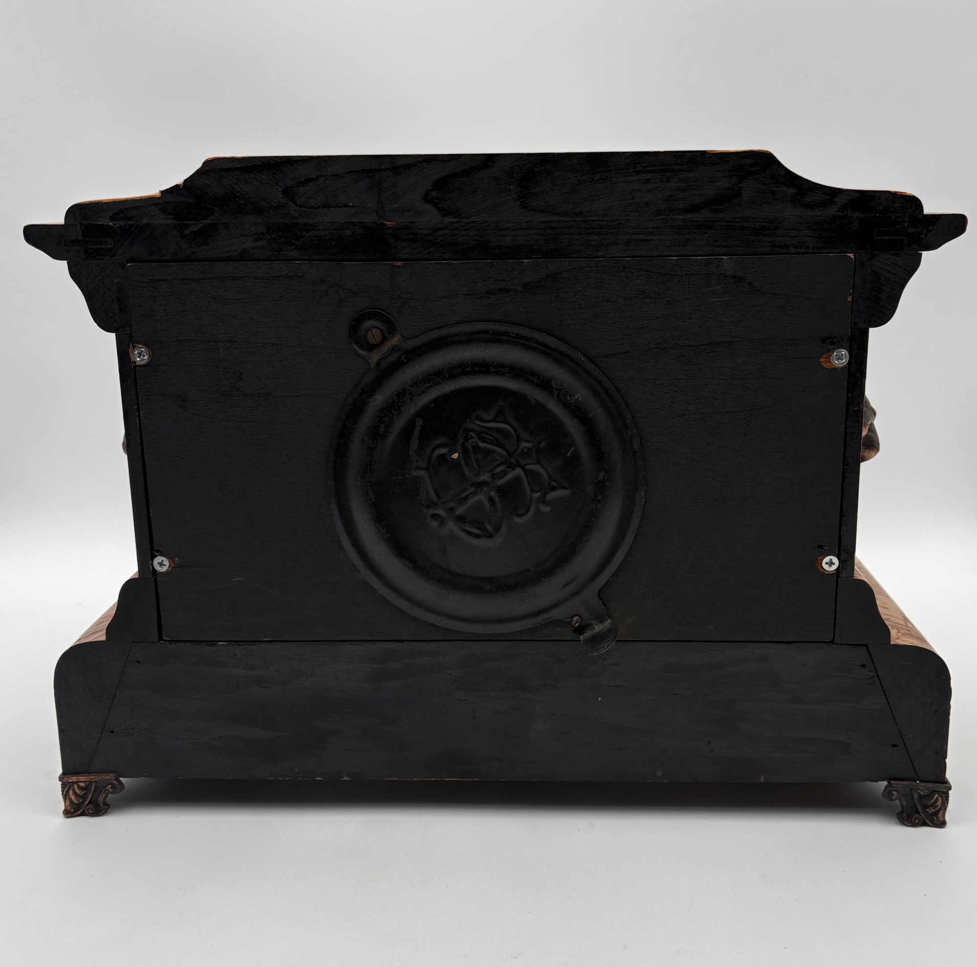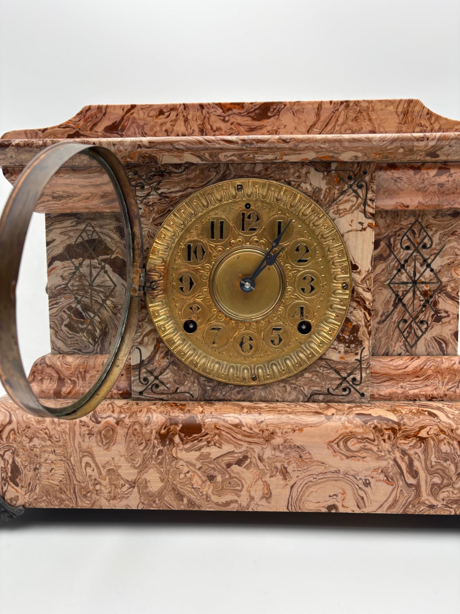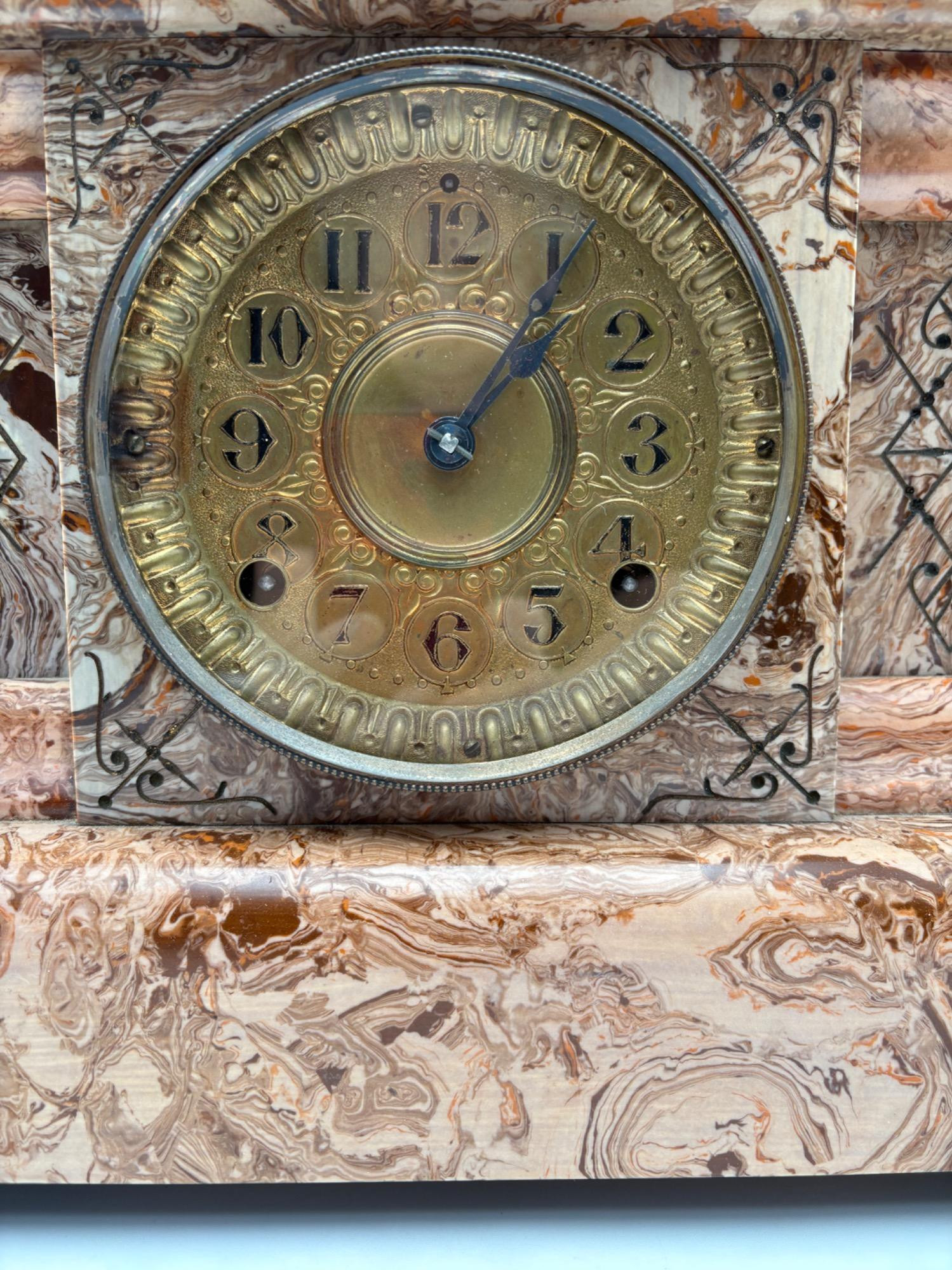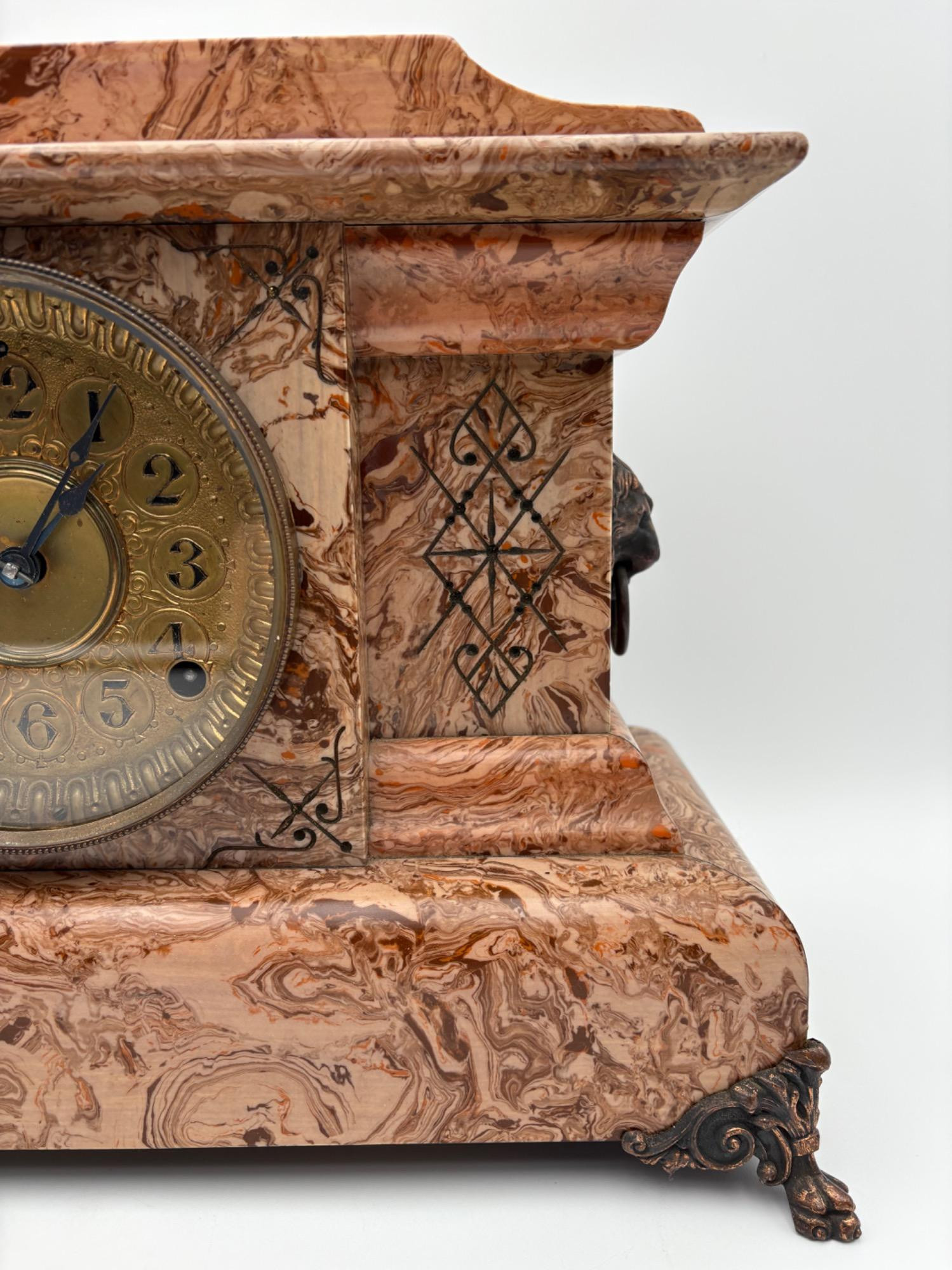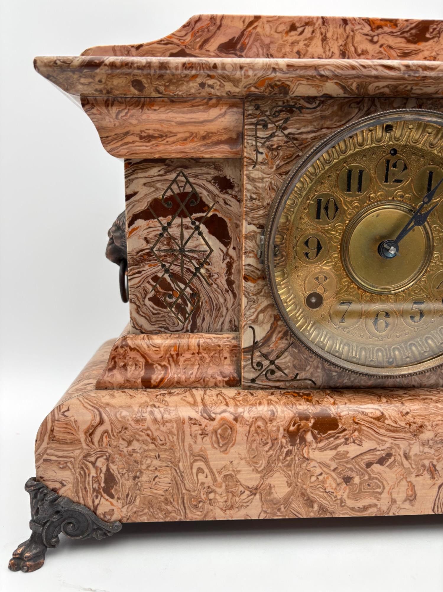 Beige marble-effect clock. This clock gives the appearance of marble, but appears to have a veneer of some kind and is actually quite lightweight for its size. If it is plastic, they've done an incredibly good job of imitating marble! Clockface measures approx. 5.75" across with Roman numerals and an opening glass cover. Back panel slides open to exposure inner workings. There are engraved designs along the body of the clock and it is supported by 4 clawed feet. Lion's head handles on sides. Currently working, but we do not know how accurately it keeps time. Comes with winding key.
