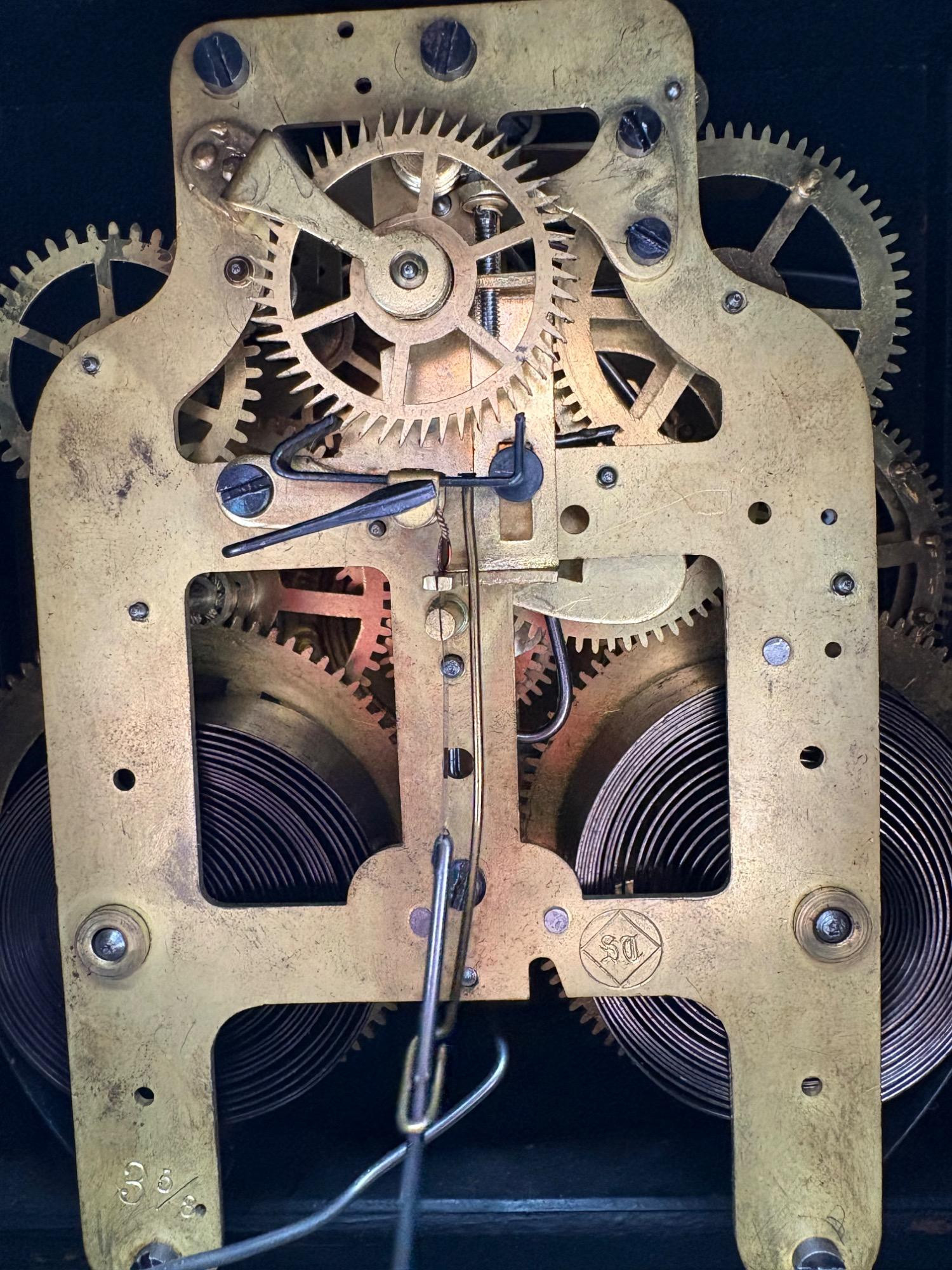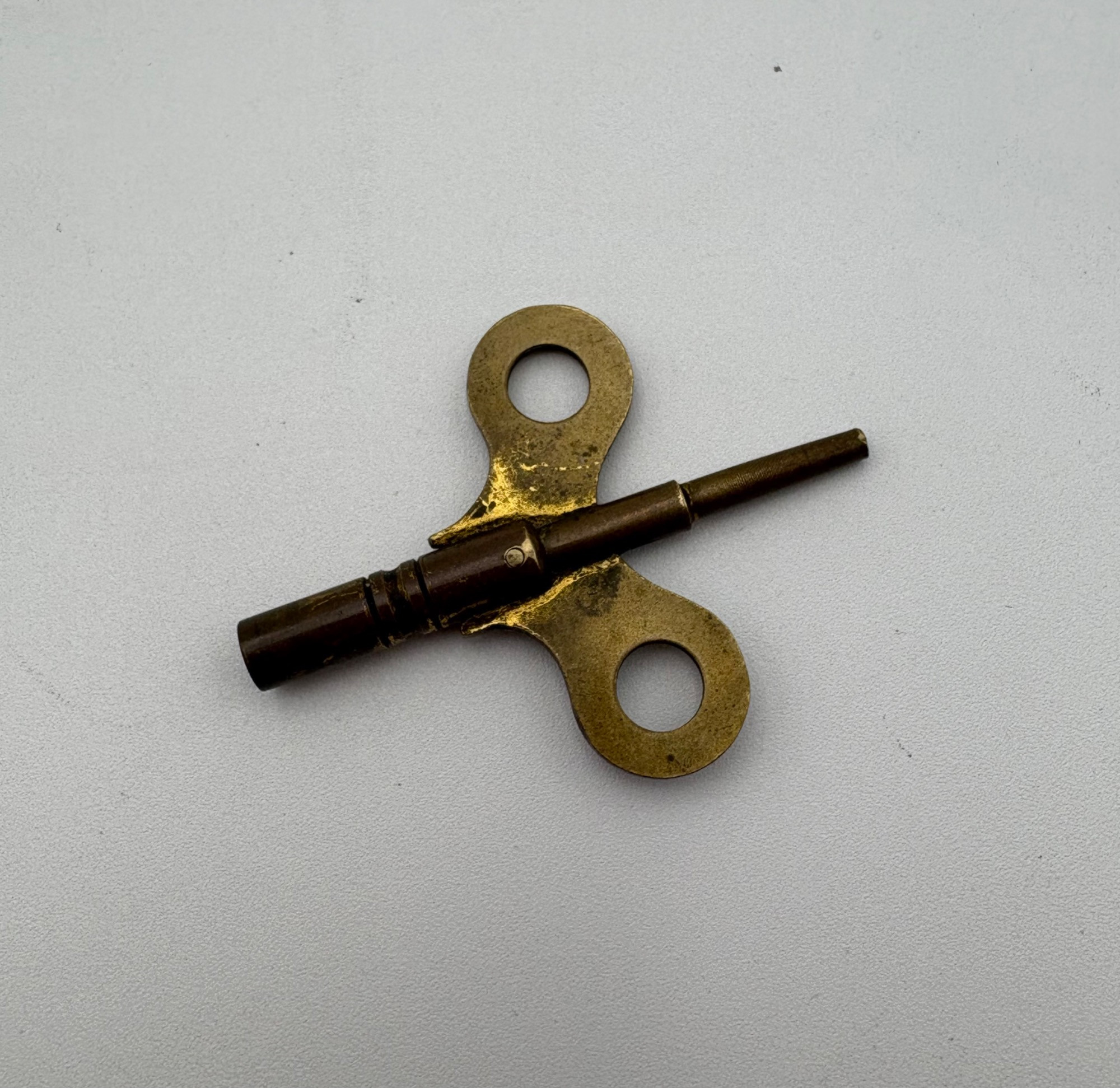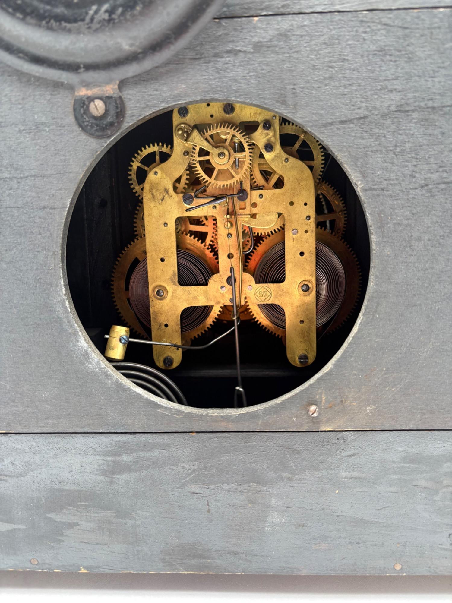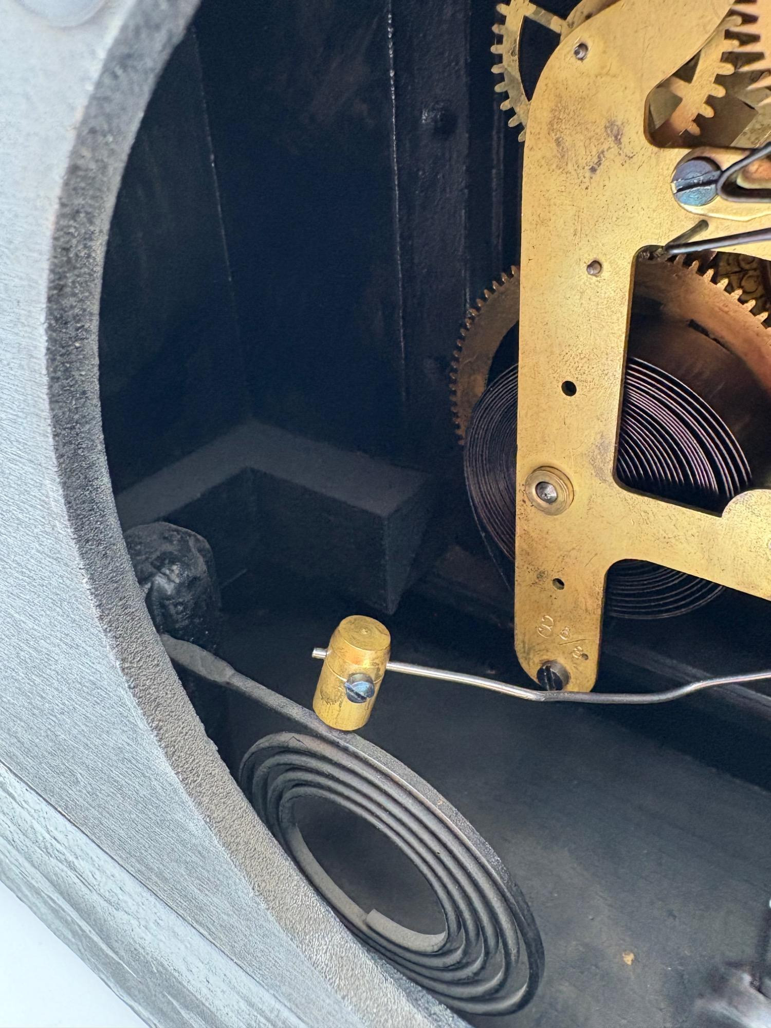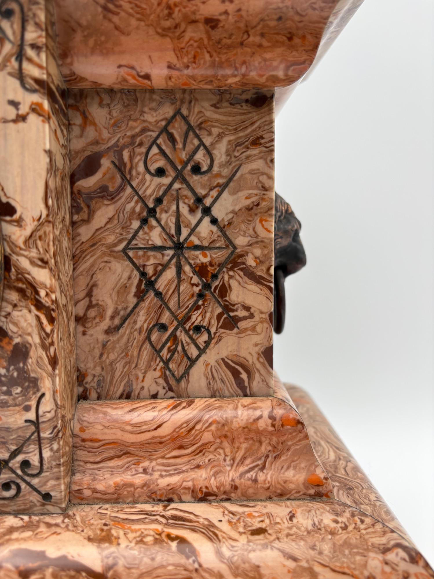 Beige marble-effect clock. This clock gives the appearance of marble, but appears to have a veneer of some kind and is actually quite lightweight for its size. If it is plastic, they've done an incredibly good job of imitating marble! Clockface measures approx. 5.75" across with Roman numerals and an opening glass cover. Back panel slides open to exposure inner workings. There are engraved designs along the body of the clock and it is supported by 4 clawed feet. Lion's head handles on sides. Currently working, but we do not know how accurately it keeps time. Comes with winding key.