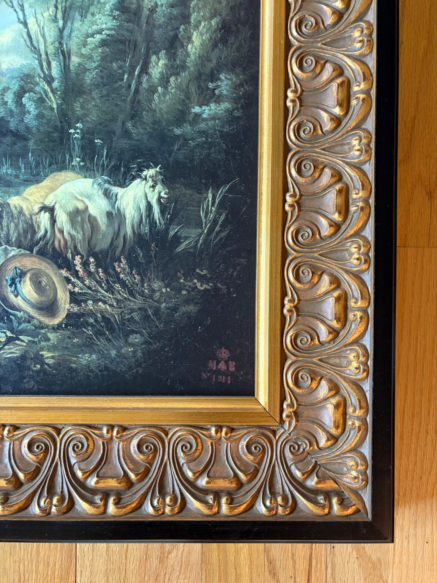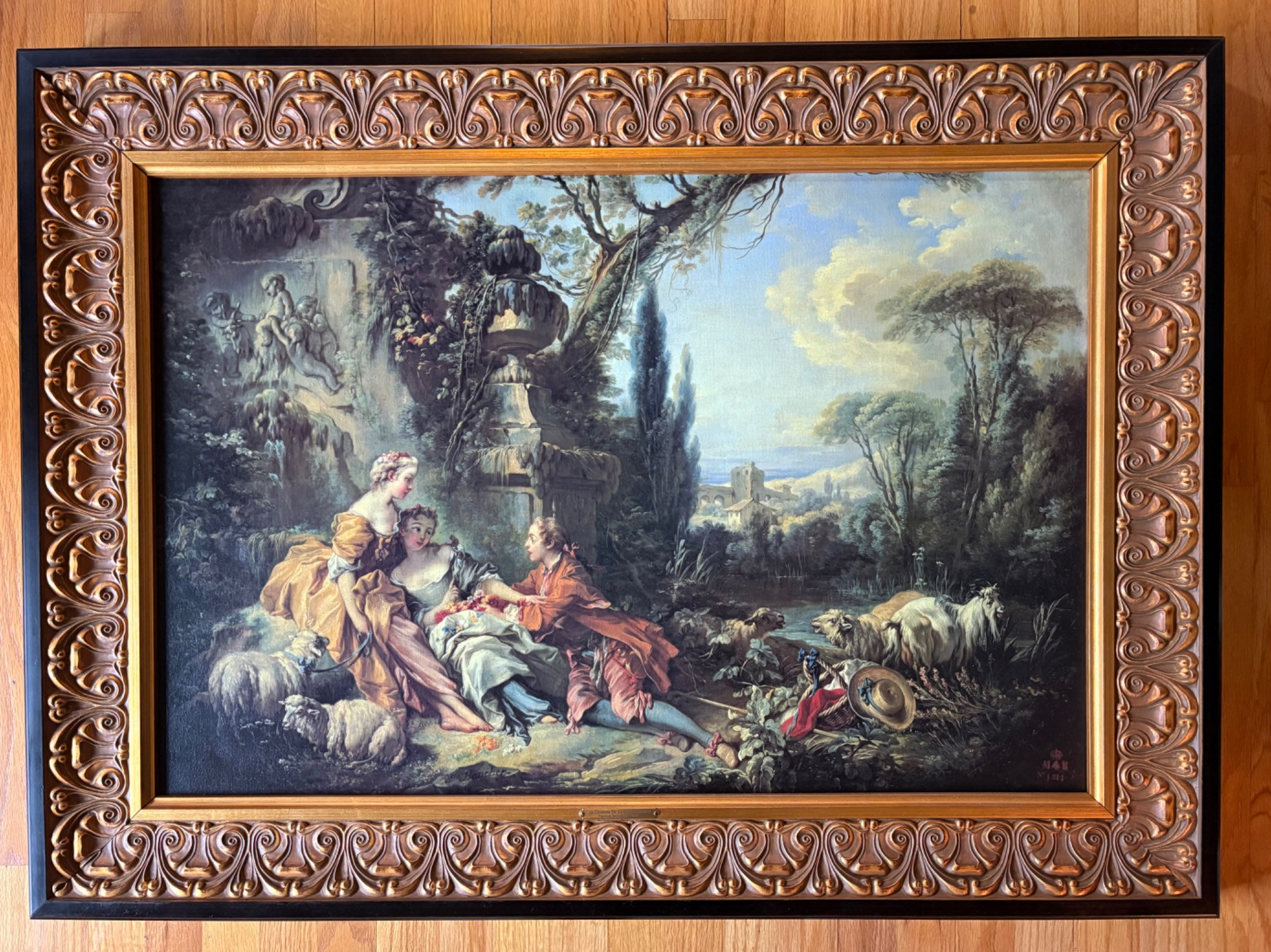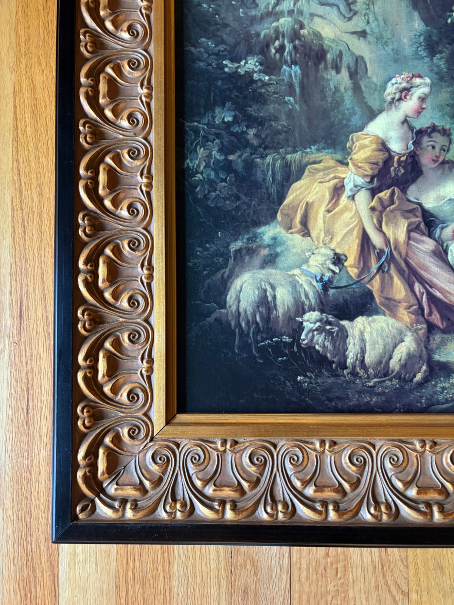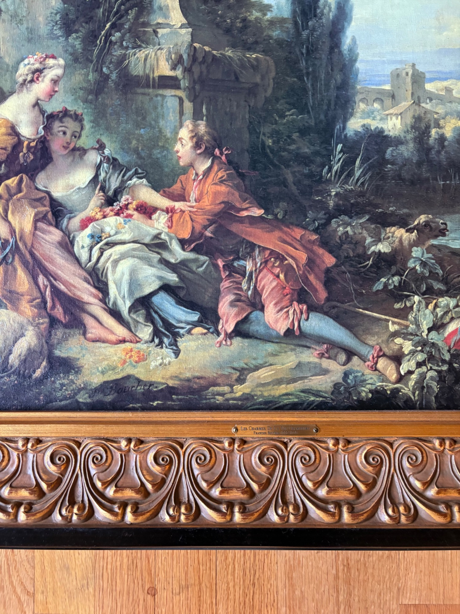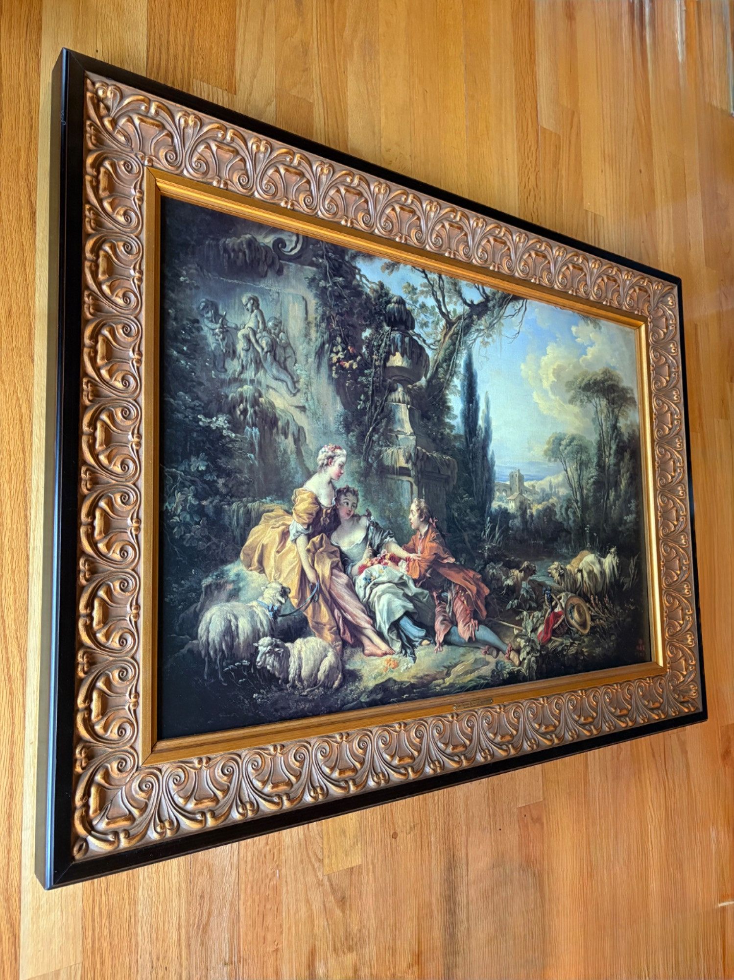 “Les Charmes De La Vie Champetre” by Francois Boucher (1703-1770). Reproduction painting on canvas with typical Boucher subject matter in ornate black and gold wood frame. Fairly large at about 2.5' high x 4' wide framed. From Around the Corner Fine Art of Virginia known for producing high quality reproductions & frames in the 1980s & 1990s (Sadly, they appear to have closed shop in the early 2000s). We found a catalogue offering many of the exact works our client owned that roughly aligns with our client's purchase dates (pre-internet when everything was phone ordered or mail ordered). For those curious about the original price range/production of the paintings, see catalogue info in photos below after the listing photos. Can be shipped FedEx.