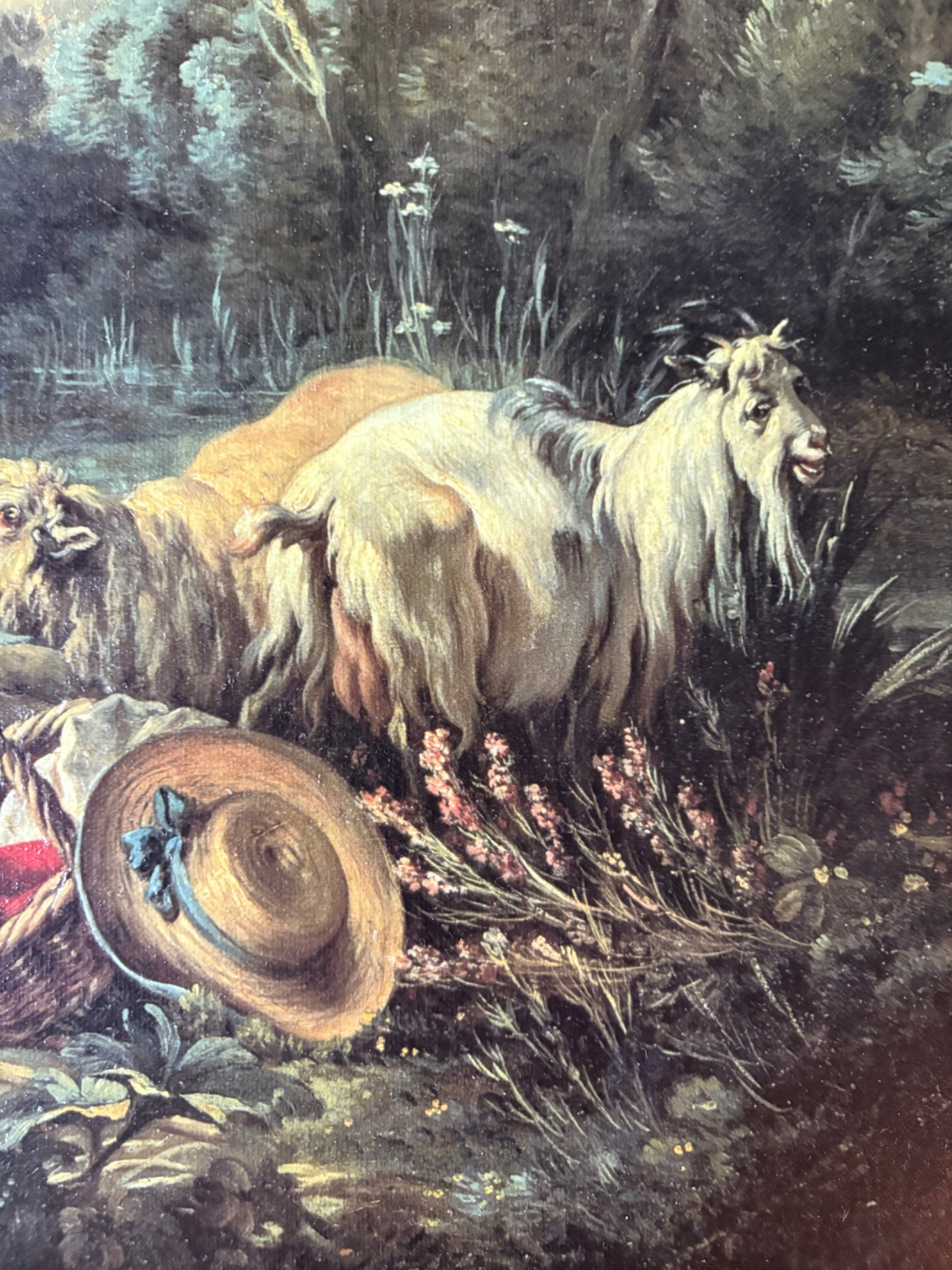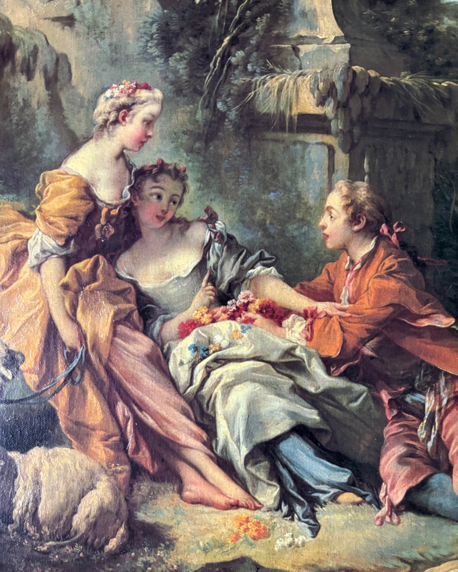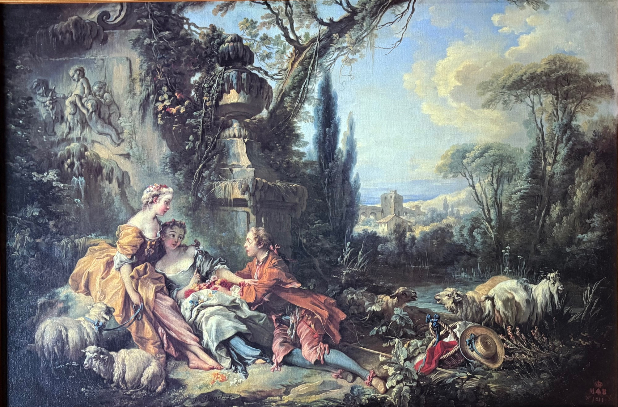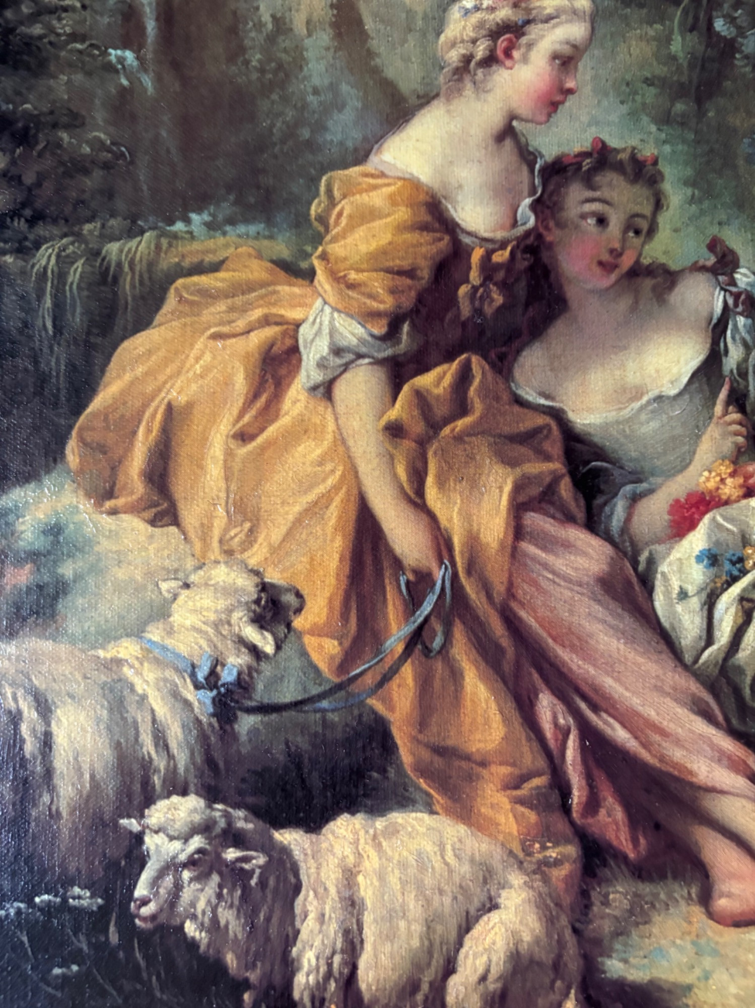 “Les Charmes De La Vie Champetre” by Francois Boucher (1703-1770). Reproduction painting on canvas with typical Boucher subject matter in ornate black and gold wood frame. Fairly large at about 2.5' high x 4' wide framed. From Around the Corner Fine Art of Virginia known for producing high quality reproductions & frames in the 1980s & 1990s (Sadly, they appear to have closed shop in the early 2000s). We found a catalogue offering many of the exact works our client owned that roughly aligns with our client's purchase dates (pre-internet when everything was phone ordered or mail ordered). For those curious about the original price range/production of the paintings, see catalogue info in photos below after the listing photos. Can be shipped FedEx.