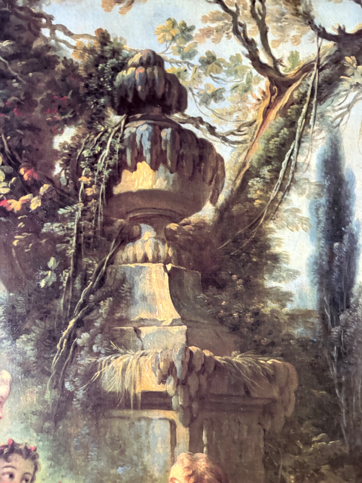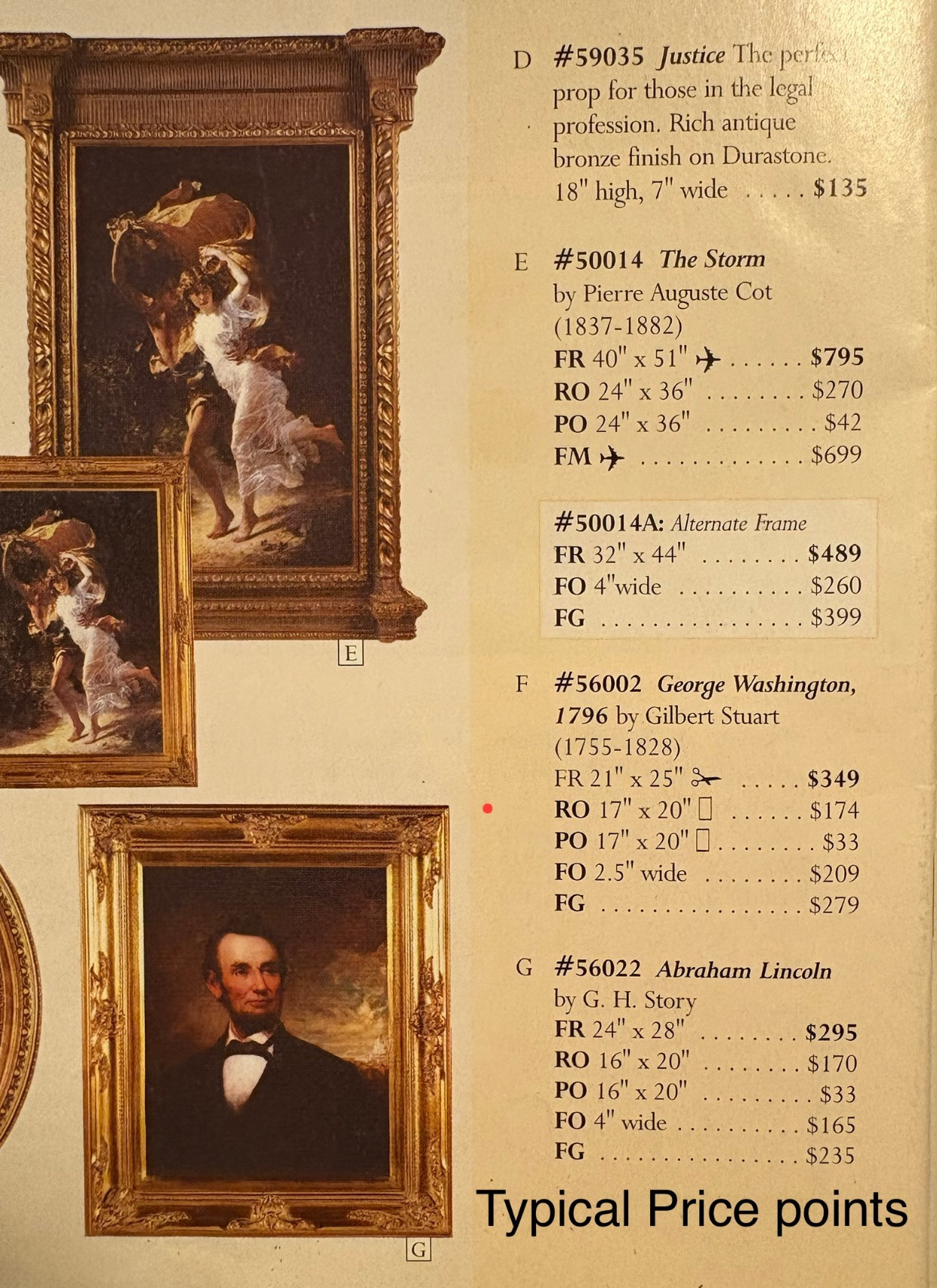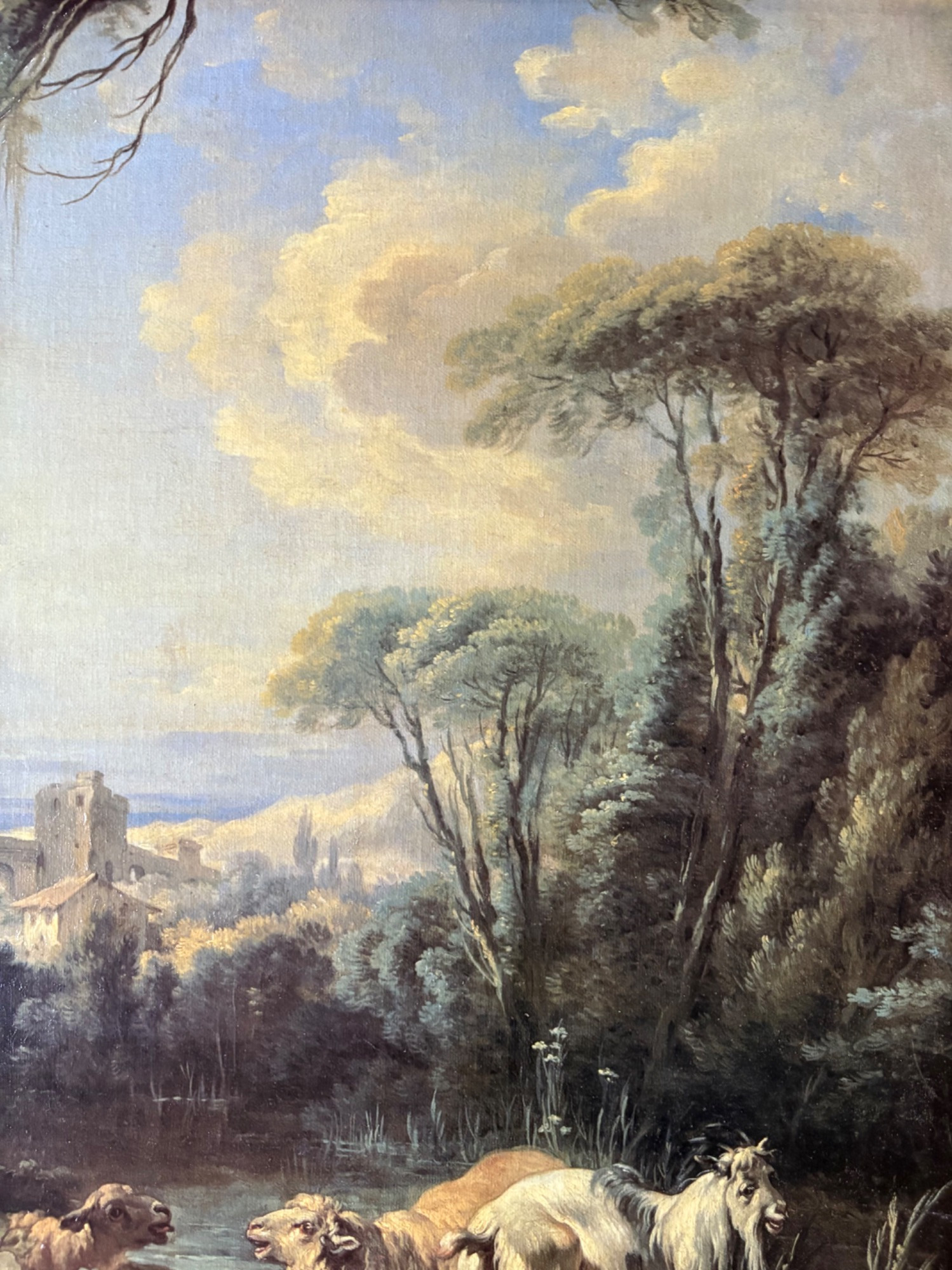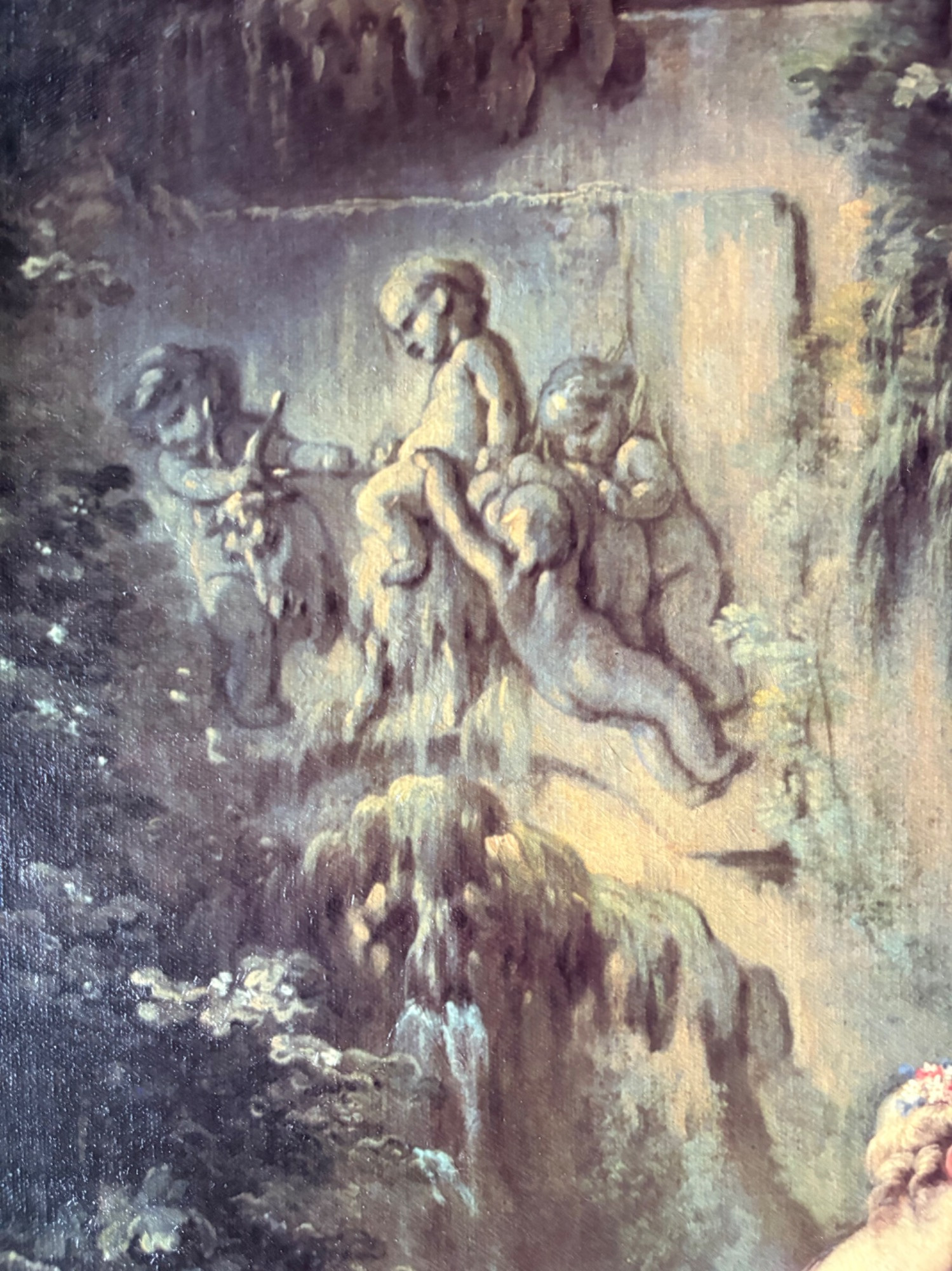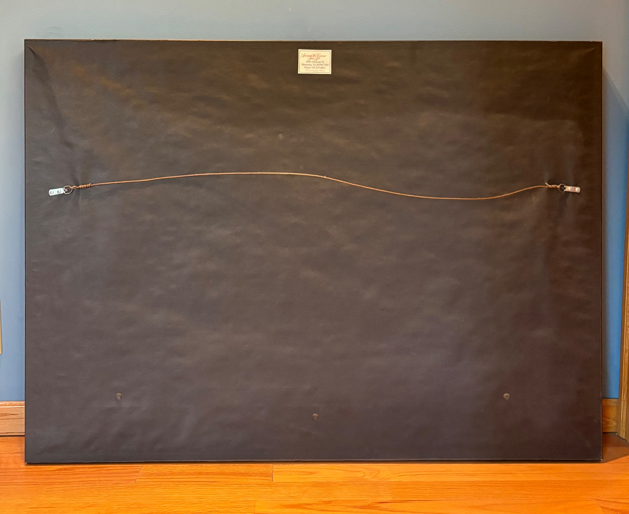 “Les Charmes De La Vie Champetre” by Francois Boucher (1703-1770). Reproduction painting on canvas with typical Boucher subject matter in ornate black and gold wood frame. Fairly large at about 2.5' high x 4' wide framed. From Around the Corner Fine Art of Virginia known for producing high quality reproductions & frames in the 1980s & 1990s (Sadly, they appear to have closed shop in the early 2000s). We found a catalogue offering many of the exact works our client owned that roughly aligns with our client's purchase dates (pre-internet when everything was phone ordered or mail ordered). For those curious about the original price range/production of the paintings, see catalogue info in photos below after the listing photos. Can be shipped FedEx.
