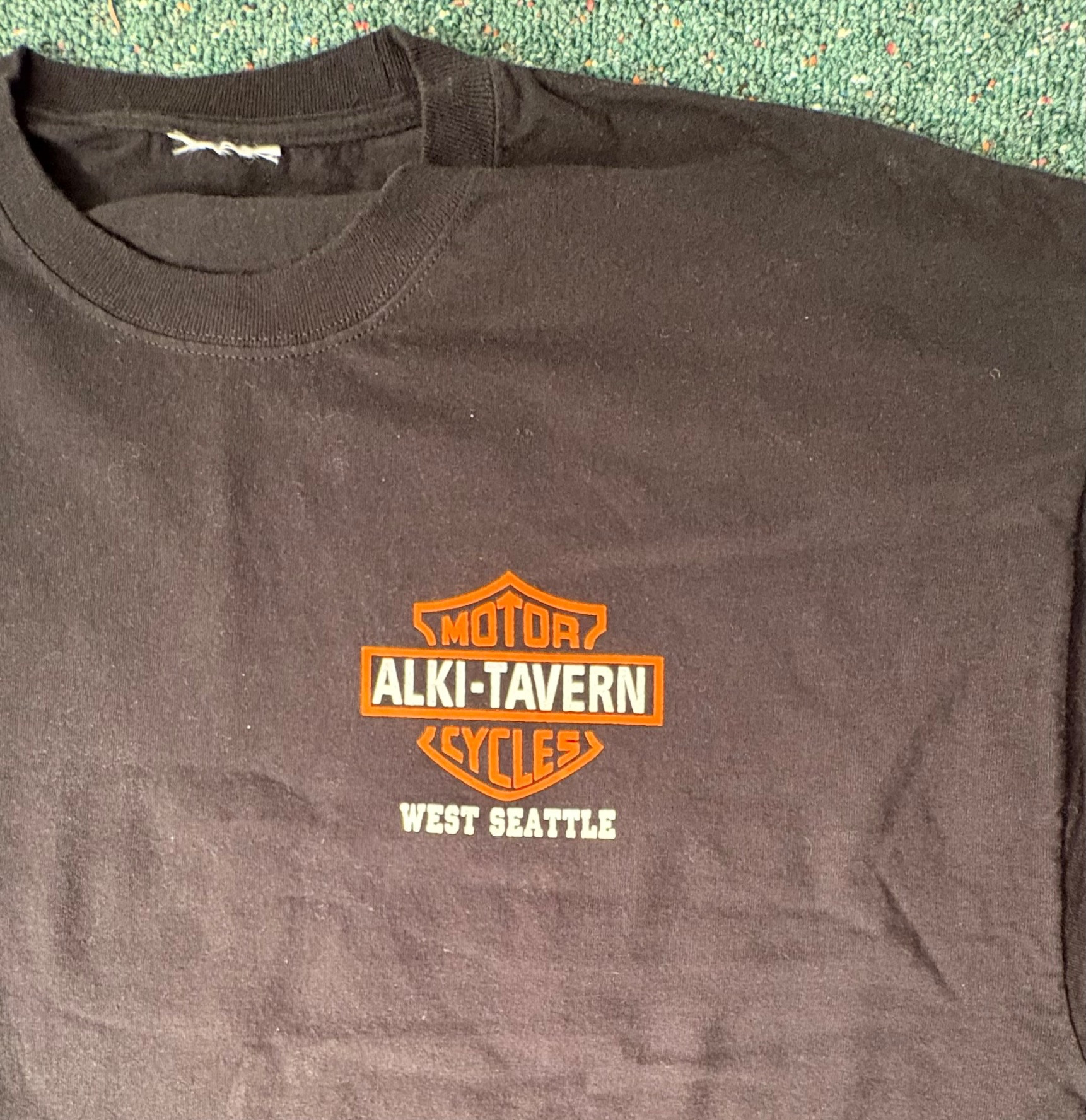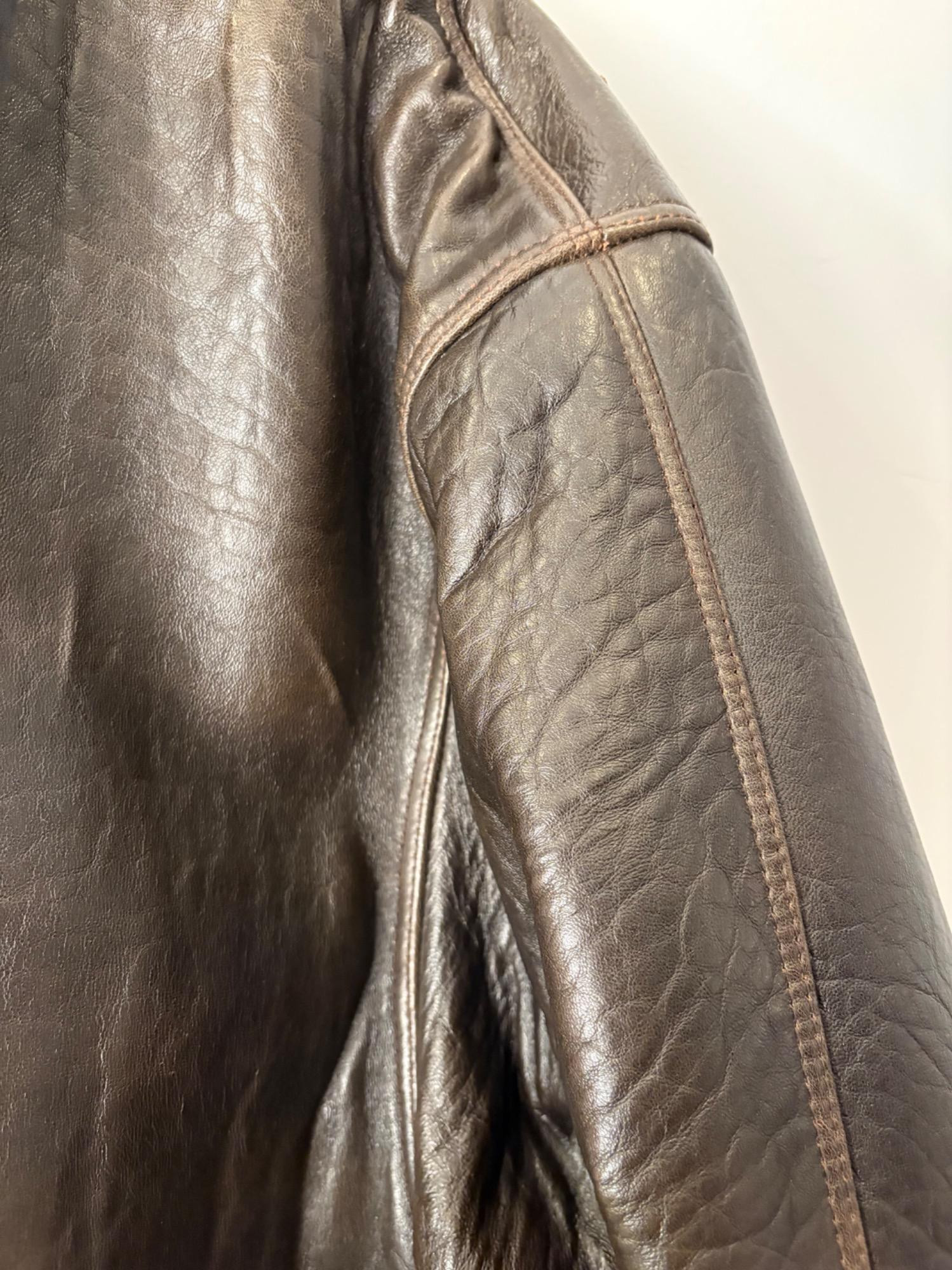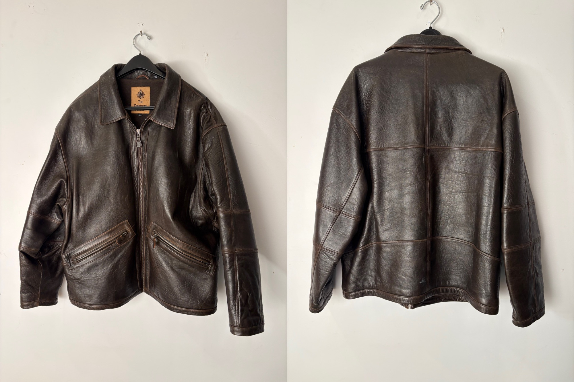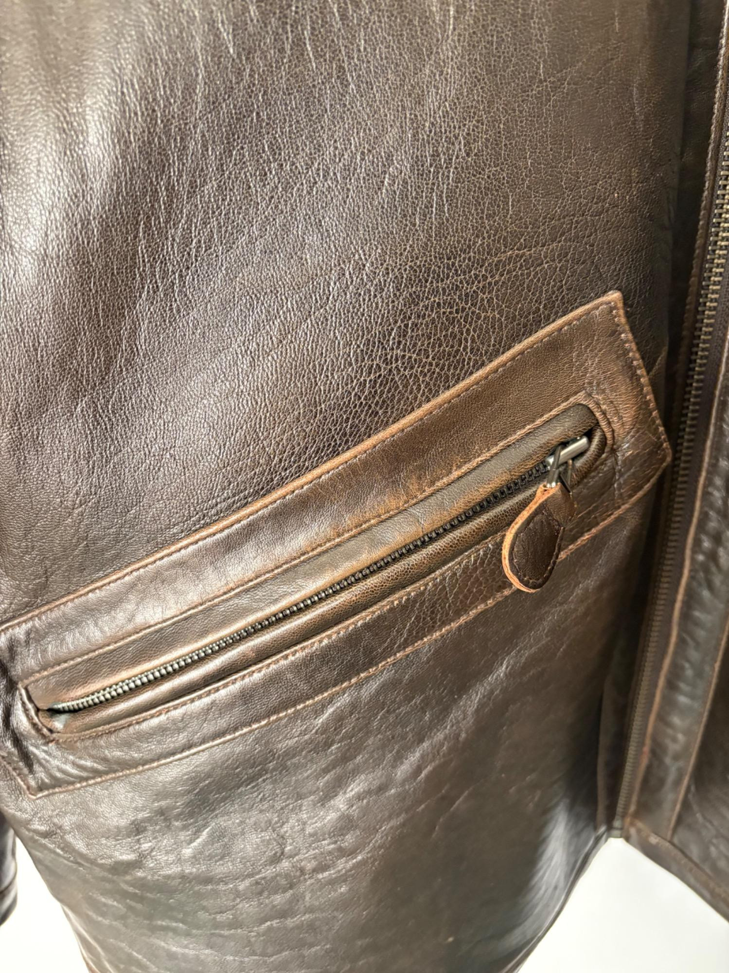 Wonderful buttery soft heavy leather car coat from The Territory Ahead. Jacket is perfectly broken in with just the right amount of wear - not enough to make it look terribly worn, but not so little that it looks too new. Centered zip front, set-in slanted zip pockets with slip-in pockets behind. Inside breast pocket and quilted lining inside. Size is XL; it measures 26" pit to pit. In terrific condition with the only minor flaw that there may have been a lapel pin at one time on the collar as there is a small pin hole. BONUS: Alki Tavern t-shirt. Appears to be brand new & unworn, but is dusty from storage. Measures just under 25" pit to pit. .