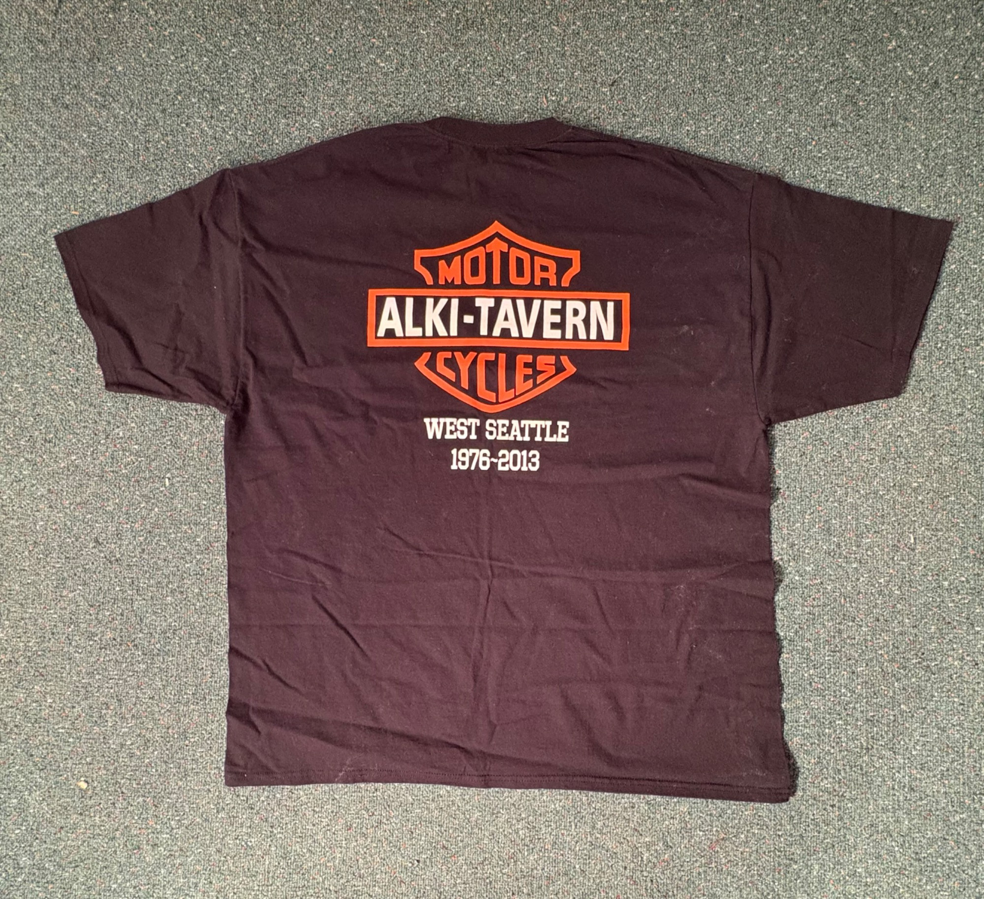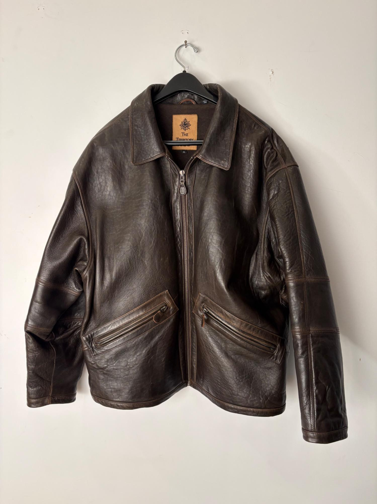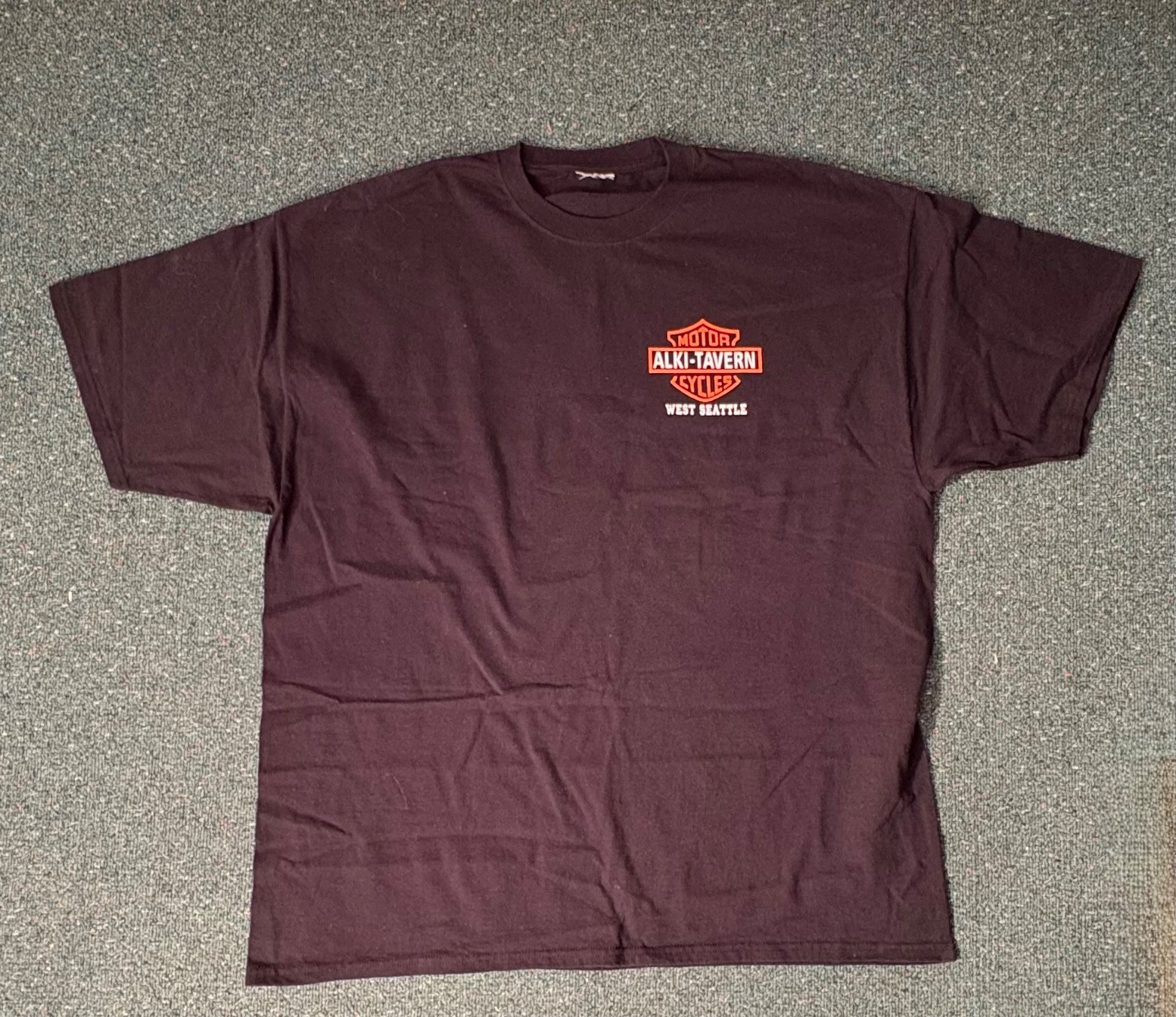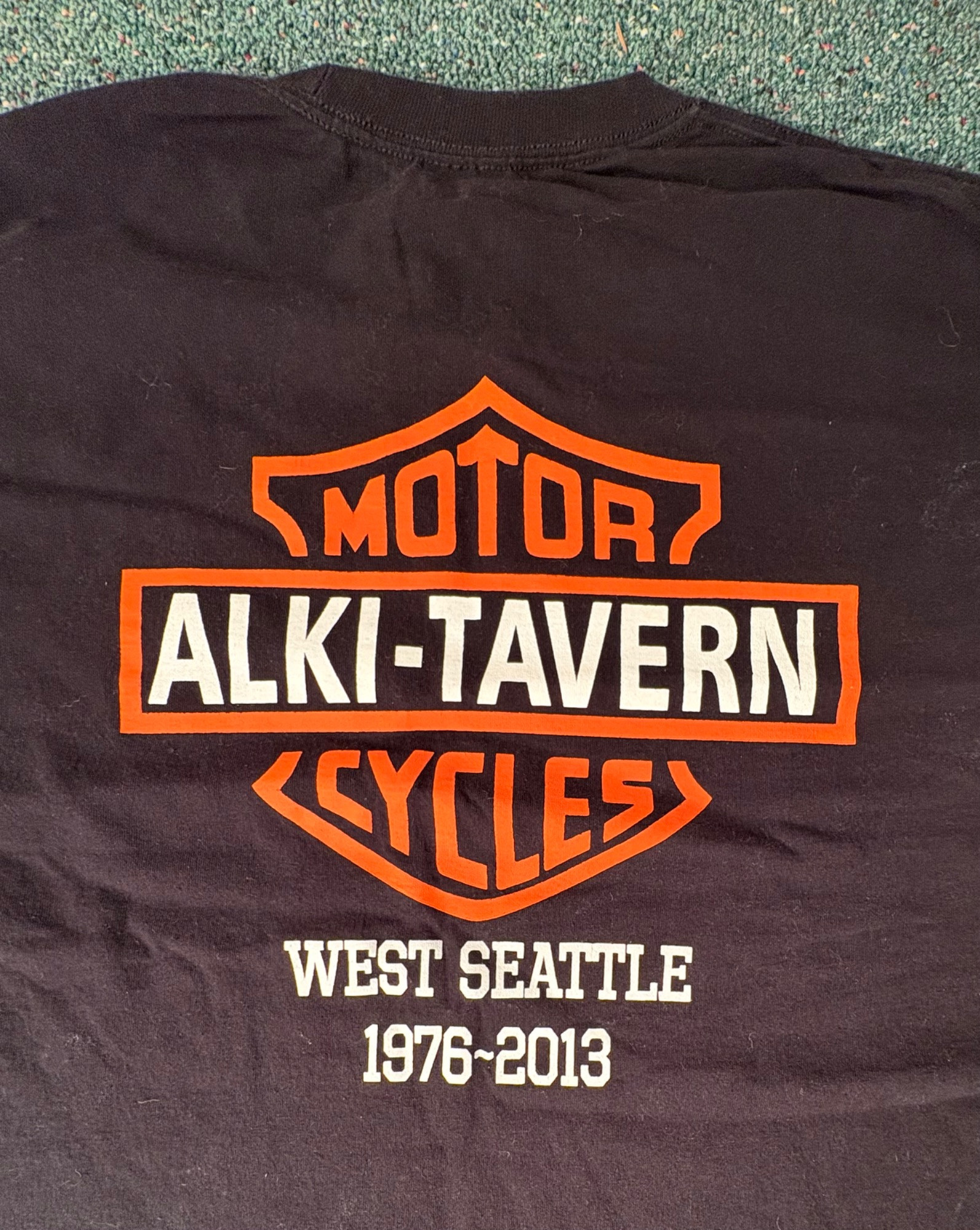 Wonderful buttery soft heavy leather car coat from The Territory Ahead. Jacket is perfectly broken in with just the right amount of wear - not enough to make it look terribly worn, but not so little that it looks too new. Centered zip front, set-in slanted zip pockets with slip-in pockets behind. Inside breast pocket and quilted lining inside. Size is XL; it measures 26" pit to pit. In terrific condition with the only minor flaw that there may have been a lapel pin at one time on the collar as there is a small pin hole. BONUS: Alki Tavern t-shirt. Appears to be brand new & unworn, but is dusty from storage. Measures just under 25" pit to pit. .