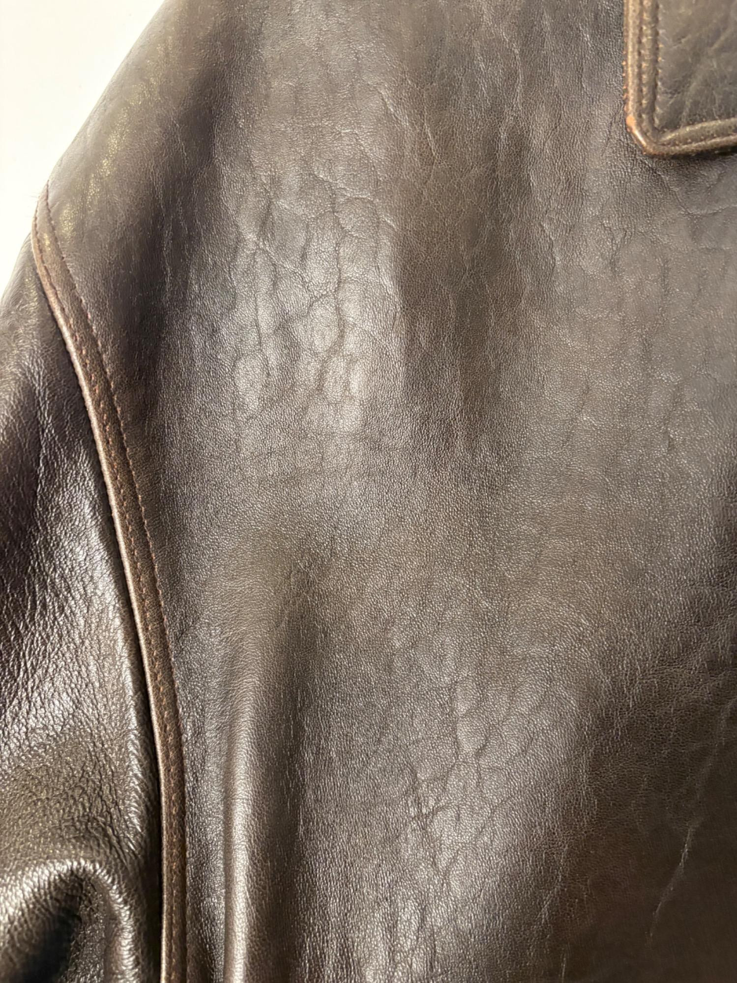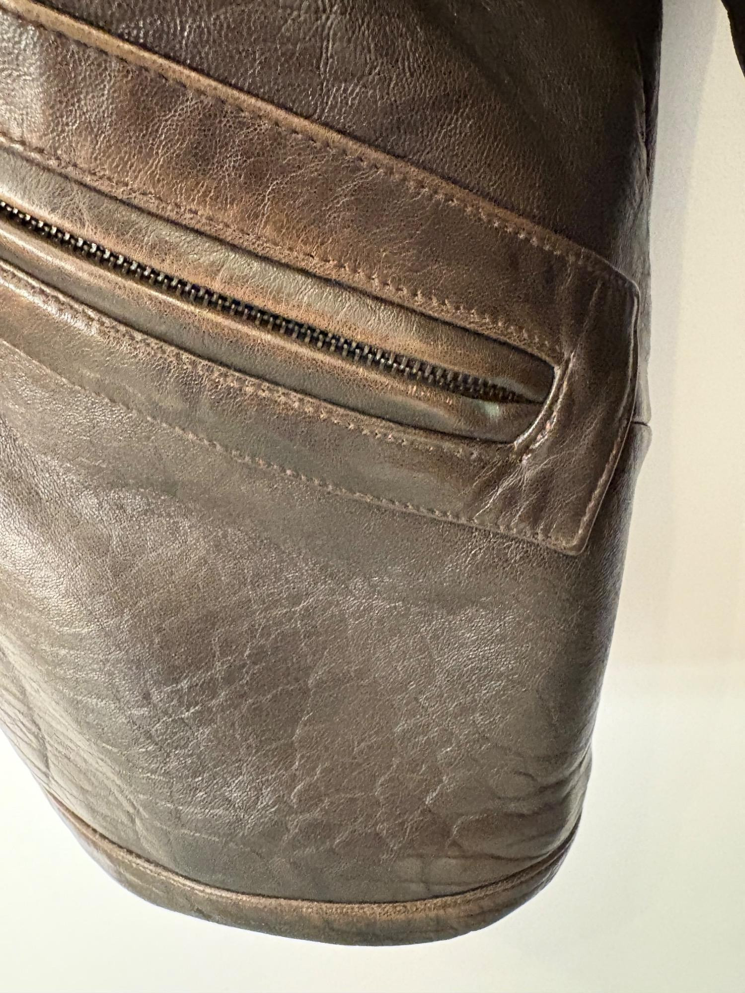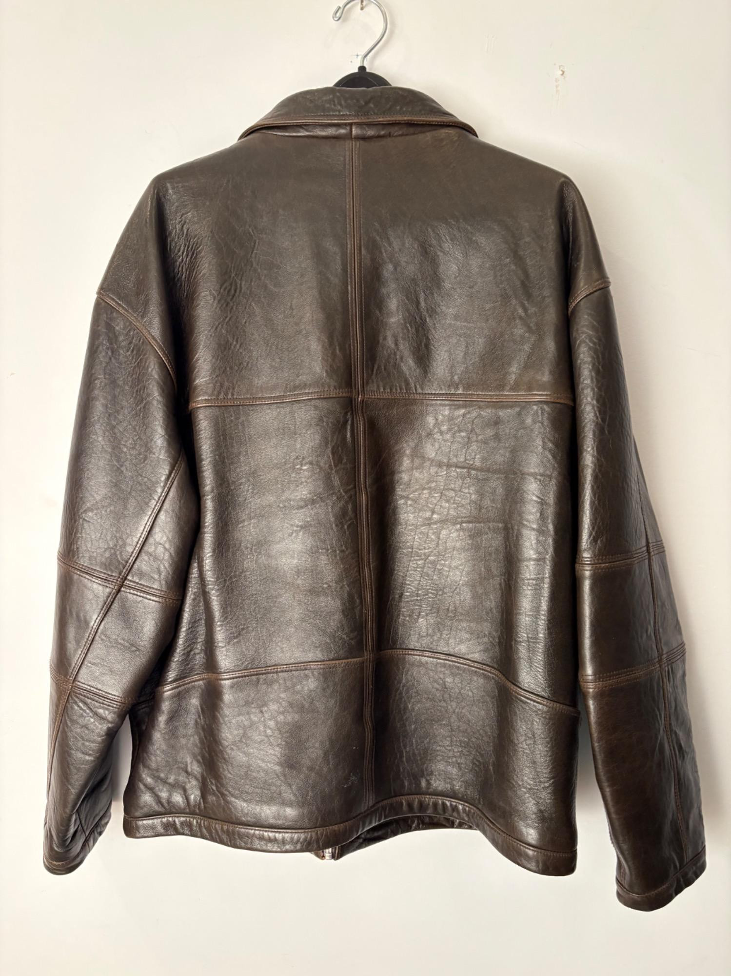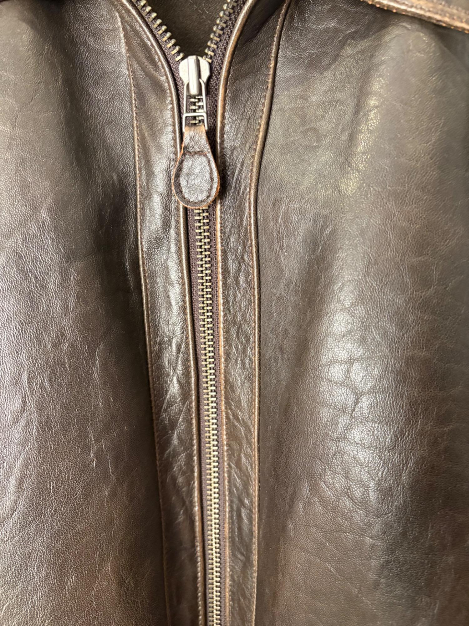 Wonderful buttery soft heavy leather car coat from The Territory Ahead. Jacket is perfectly broken in with just the right amount of wear - not enough to make it look terribly worn, but not so little that it looks too new. Centered zip front, set-in slanted zip pockets with slip-in pockets behind. Inside breast pocket and quilted lining inside. Size is XL; it measures 26" pit to pit. In terrific condition with the only minor flaw that there may have been a lapel pin at one time on the collar as there is a small pin hole. BONUS: Alki Tavern t-shirt. Appears to be brand new & unworn, but is dusty from storage. Measures just under 25" pit to pit. .