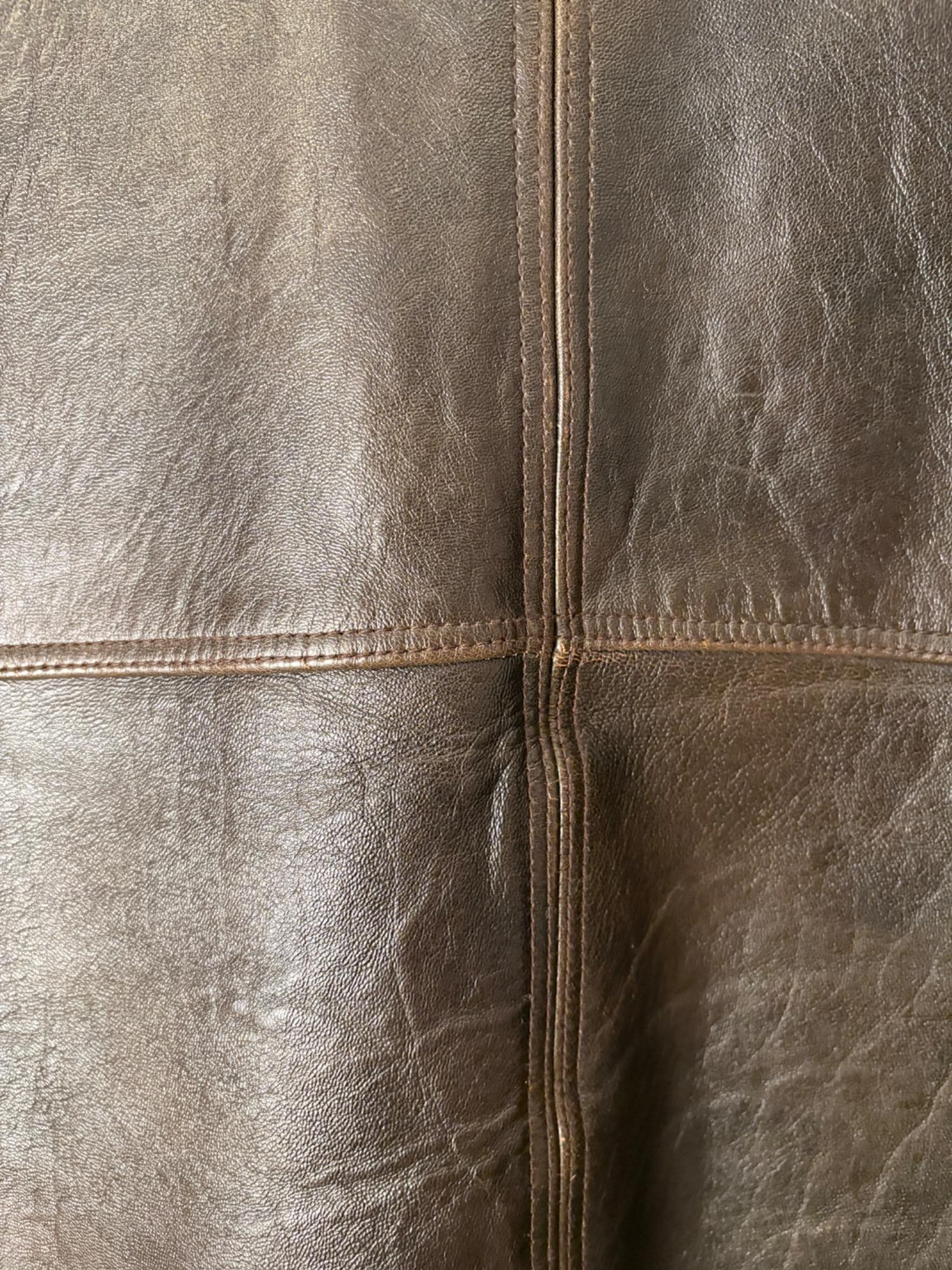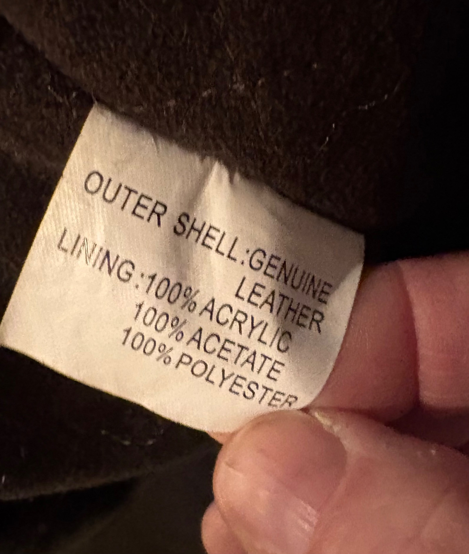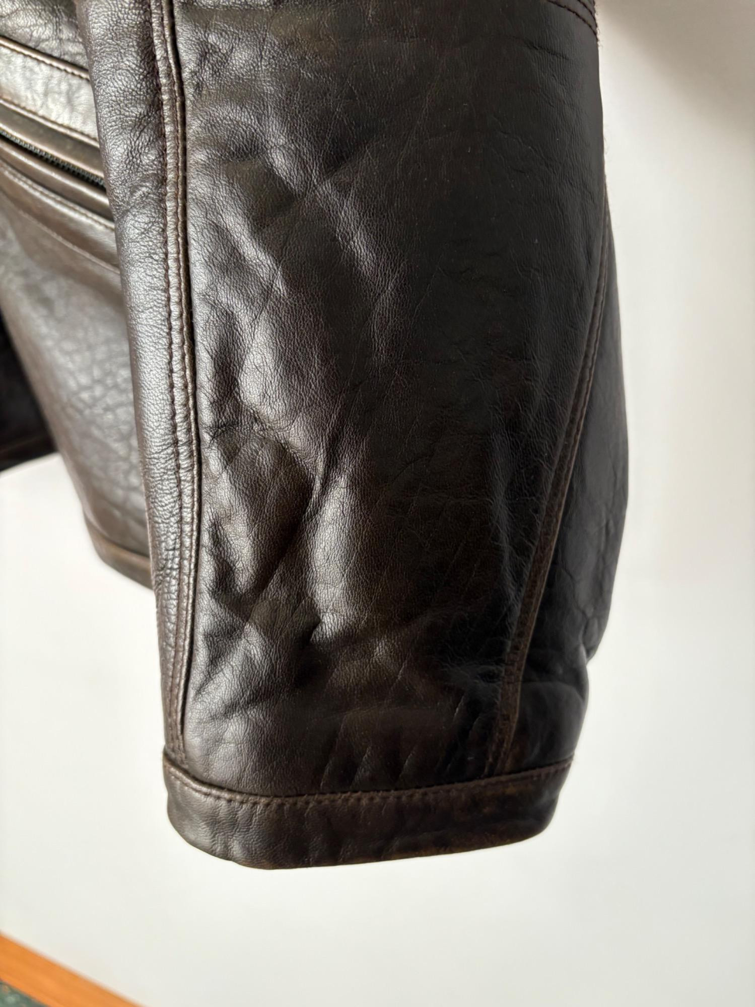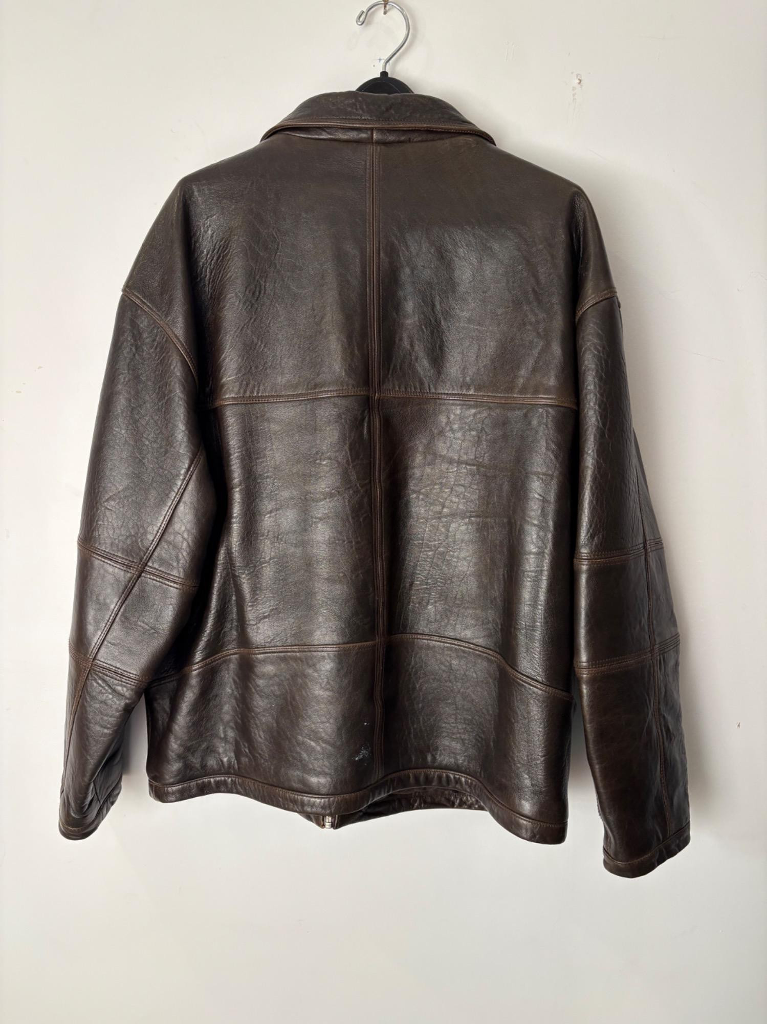 Wonderful buttery soft heavy leather car coat from The Territory Ahead. Jacket is perfectly broken in with just the right amount of wear - not enough to make it look terribly worn, but not so little that it looks too new. Centered zip front, set-in slanted zip pockets with slip-in pockets behind. Inside breast pocket and quilted lining inside. Size is XL; it measures 26" pit to pit. In terrific condition with the only minor flaw that there may have been a lapel pin at one time on the collar as there is a small pin hole. BONUS: Alki Tavern t-shirt. Appears to be brand new & unworn, but is dusty from storage. Measures just under 25" pit to pit. .