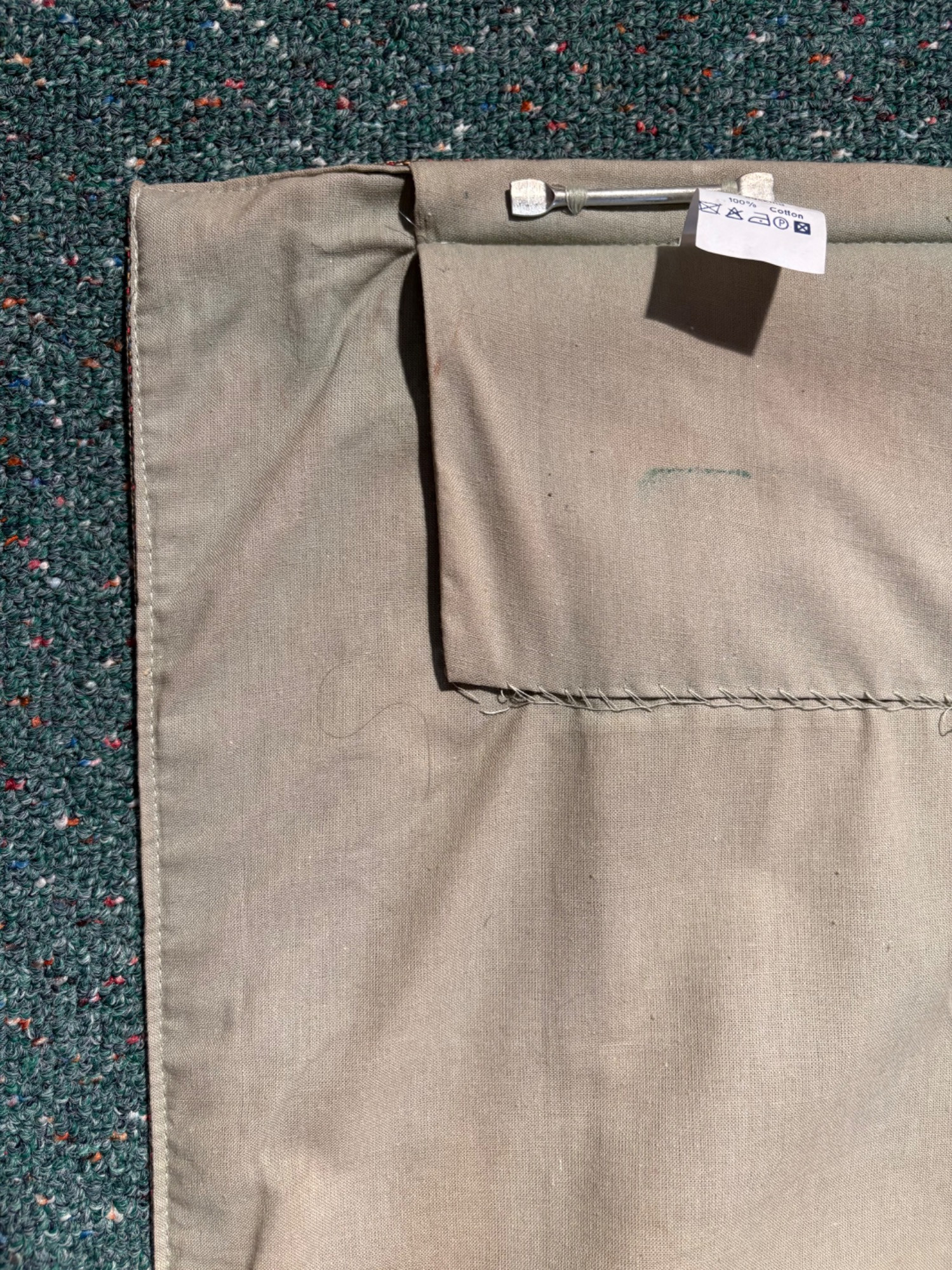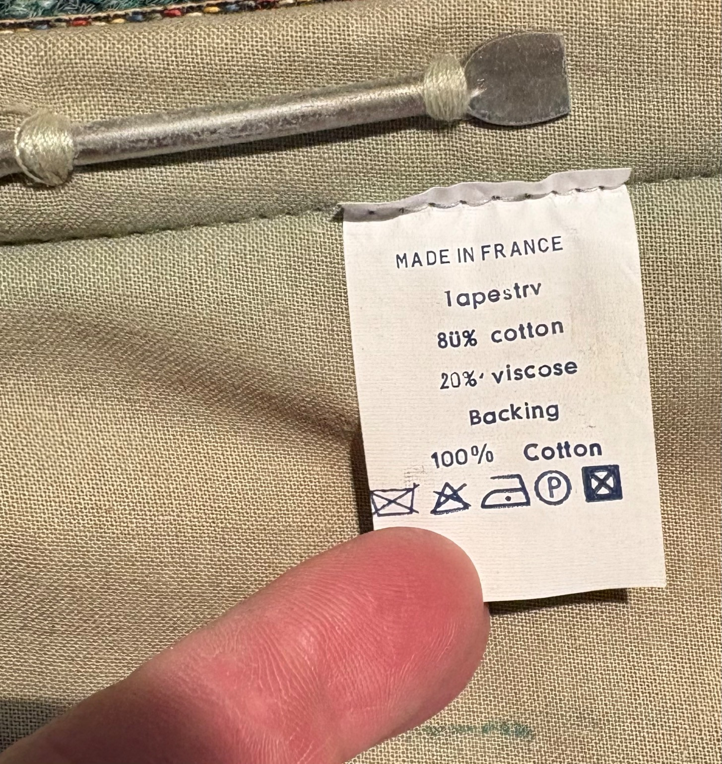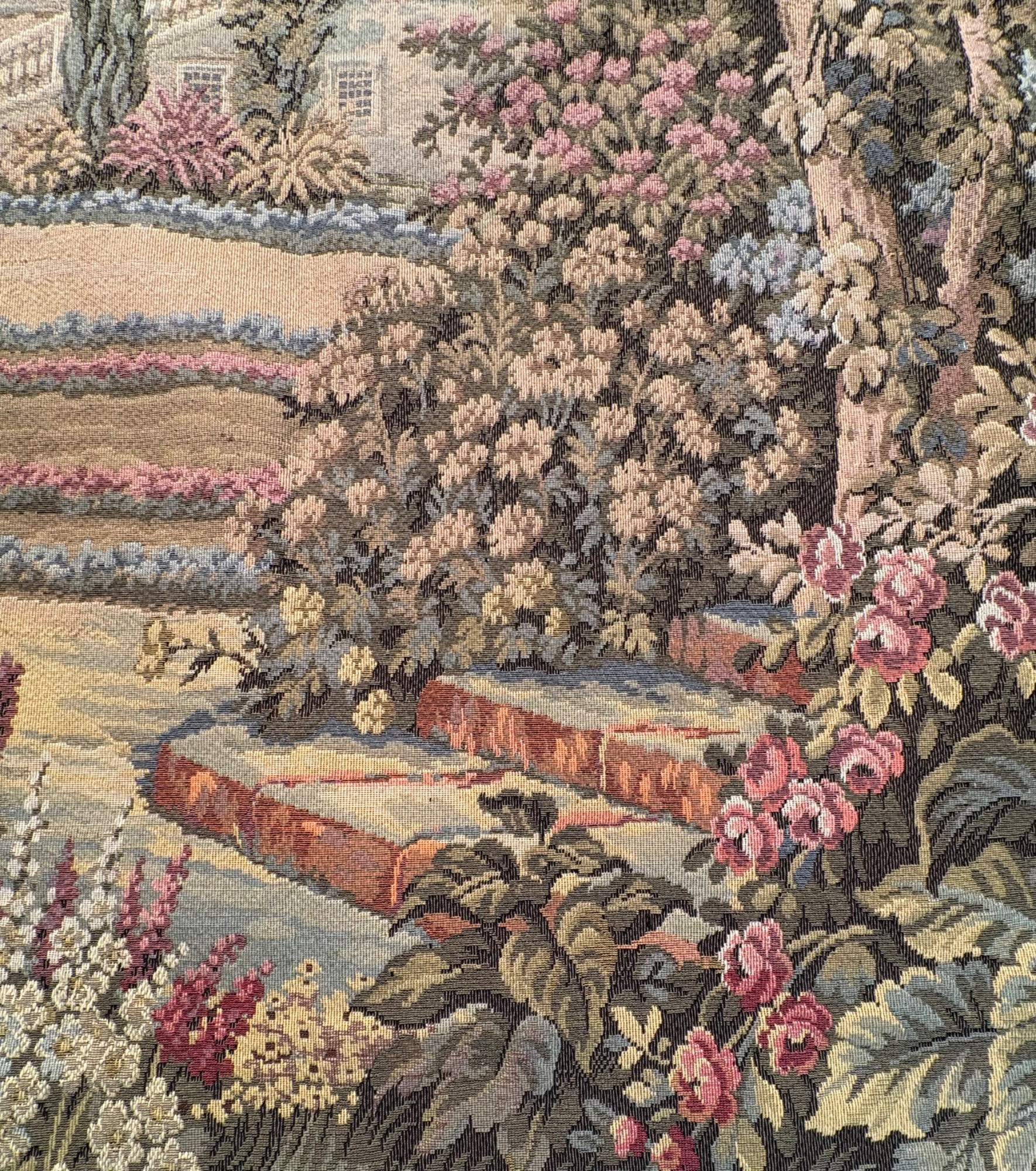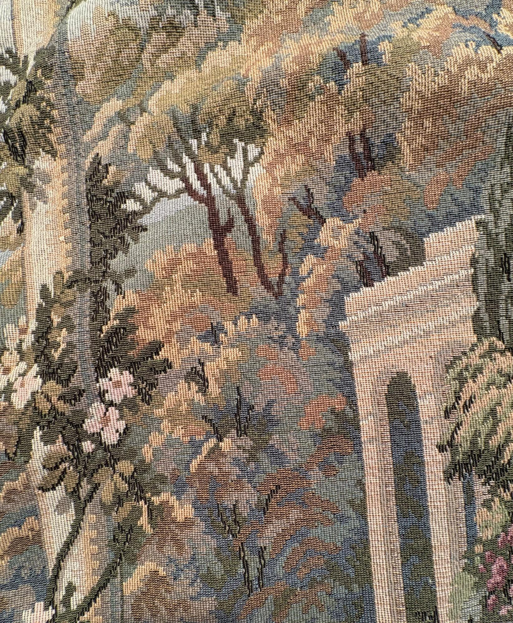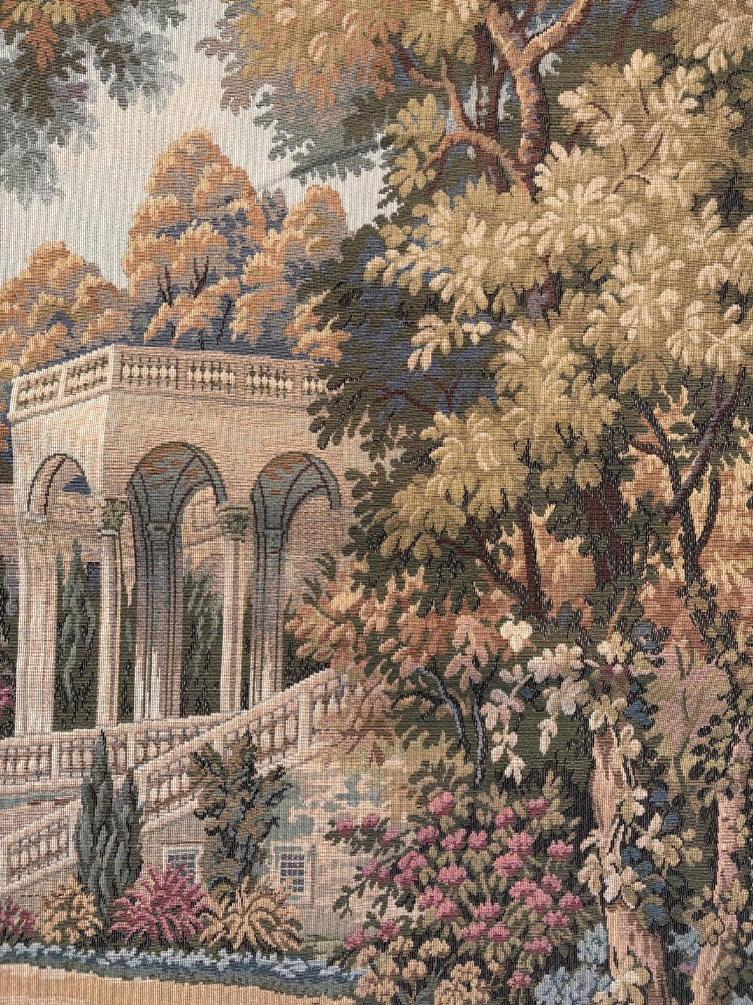 Classic Italian garden temple scene. It is quite large - about 5' high by 4' wide. Nice tight weave & fully lined. Made in France. Rod pockets need a quick whipstitch at the very ends. Note: All tapestries listed in this auction are in good condition, but all would benefit from a good wash.