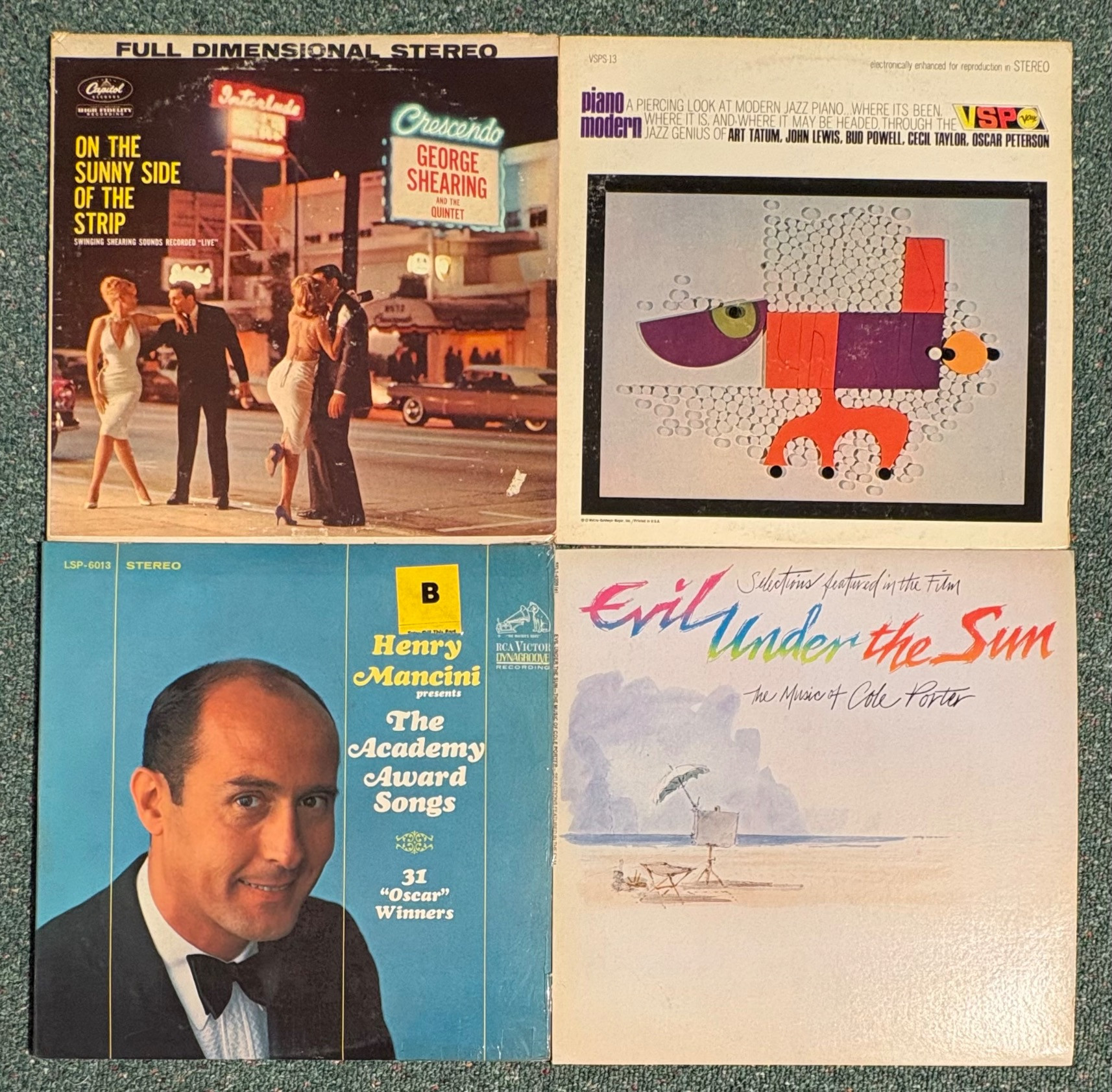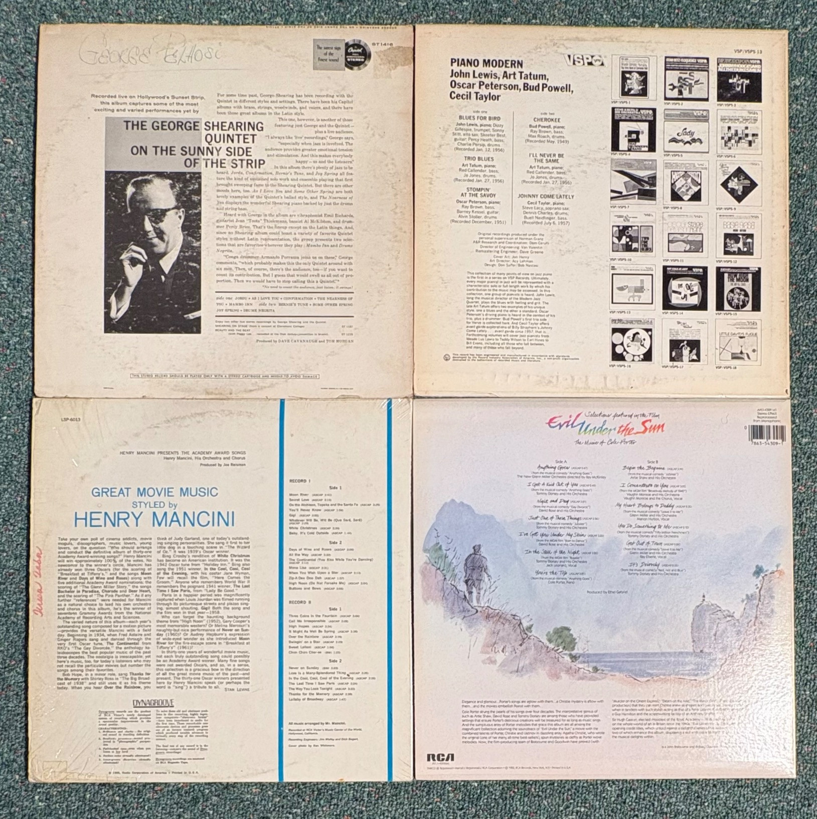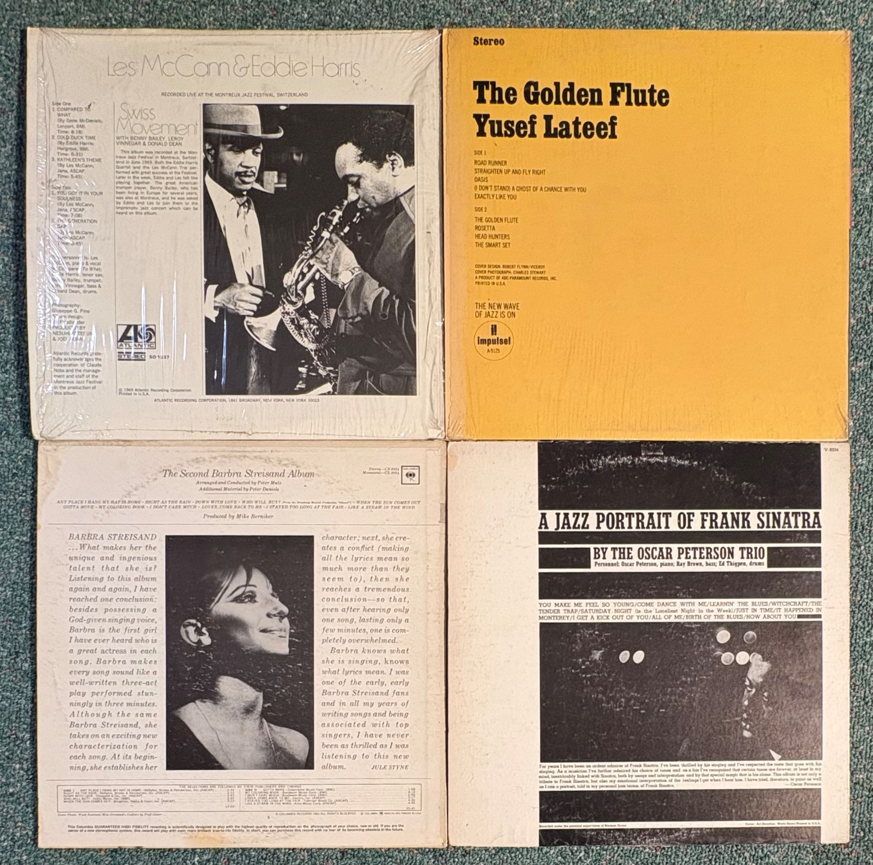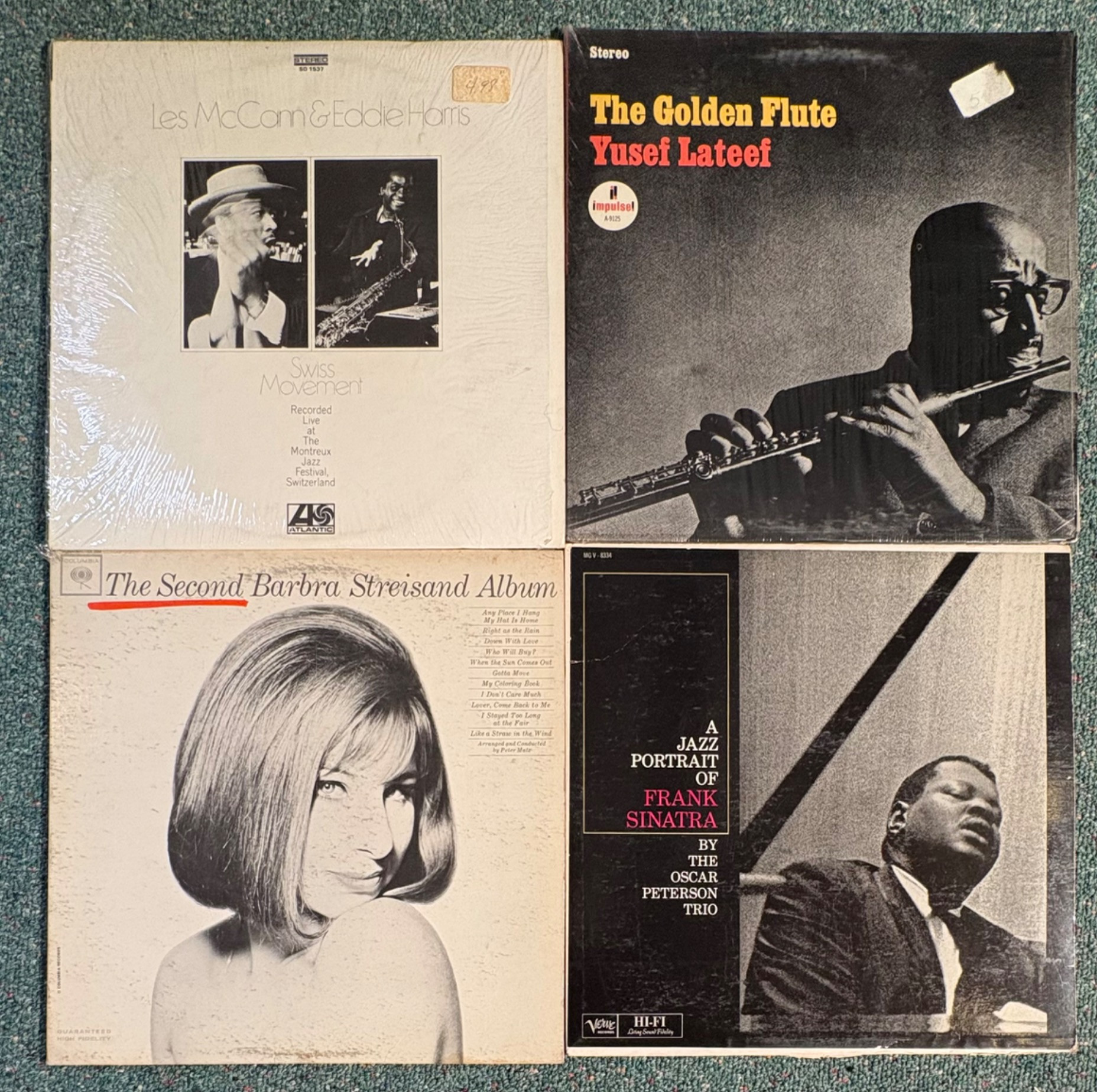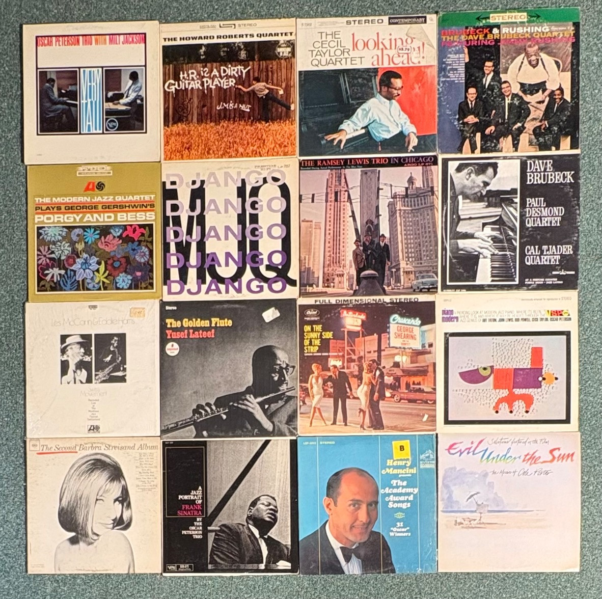 16 vintage vinyl LPs! Our client had eclectic taste and loved his albums - thus, most of these have been lovingly played over the years. We checked to make sure the correct album was in the correct cover and did a cursory glance for any egregious scratches. Some covers reflect heavy use and are worn/split in places/have names written on them. However, the majority are in good used shape. Artists/Bands in this lot include: Les McCann & Eddie Harris George Shearing Henry Mancini Barbra Streisand Yosef Lateef Group of great jazz pianists Miscellaneous artists playing Cole Porter Oscar Peterson Trio Oscar Peterson & Milt Jackson The Modern Jazz Quartet (2 albums) Howard Roberts Quartet Cecil Taylor Quartet Ramsey Lewis Trio Dave Brubeck & Guests (2 albums)