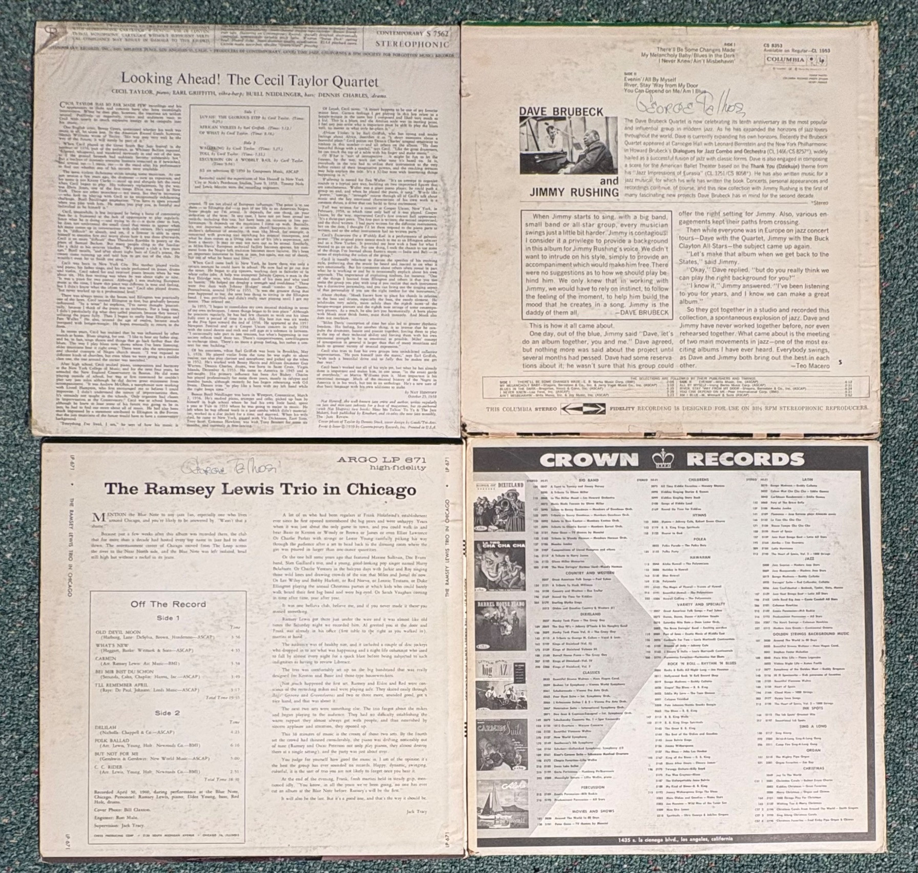 Note: Ramsey Lewis Trio, Dave Brubeck albums, Cecil Taylor Quartet, Howard Roberts Quartet, an Oscar Peterson Trio with Milt Jackson missing inner sleeves