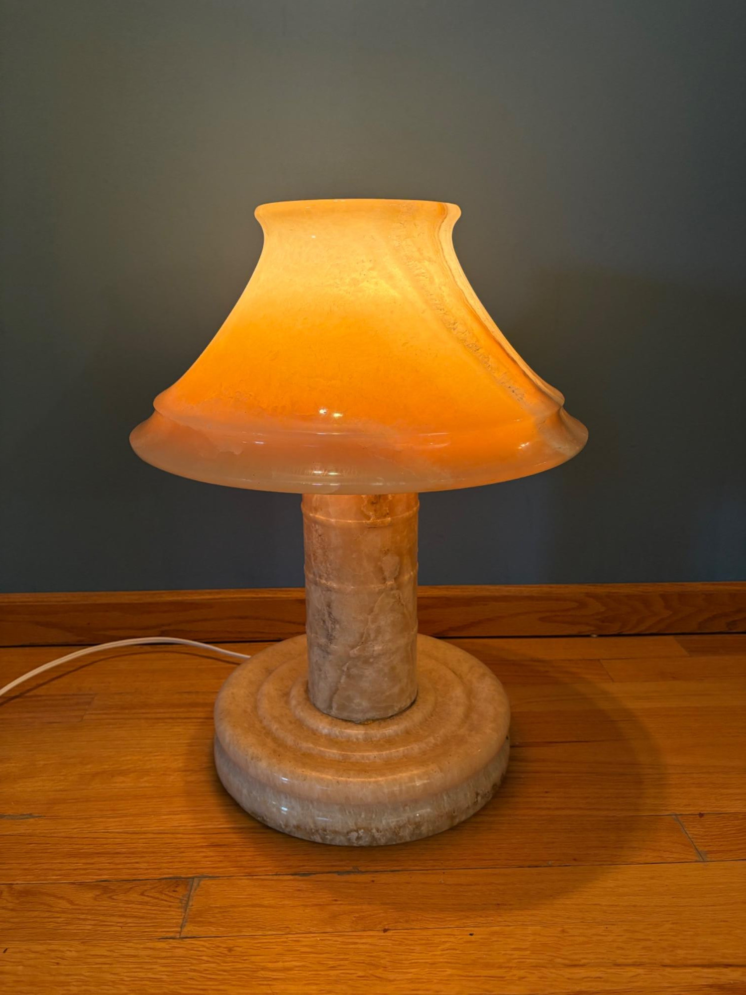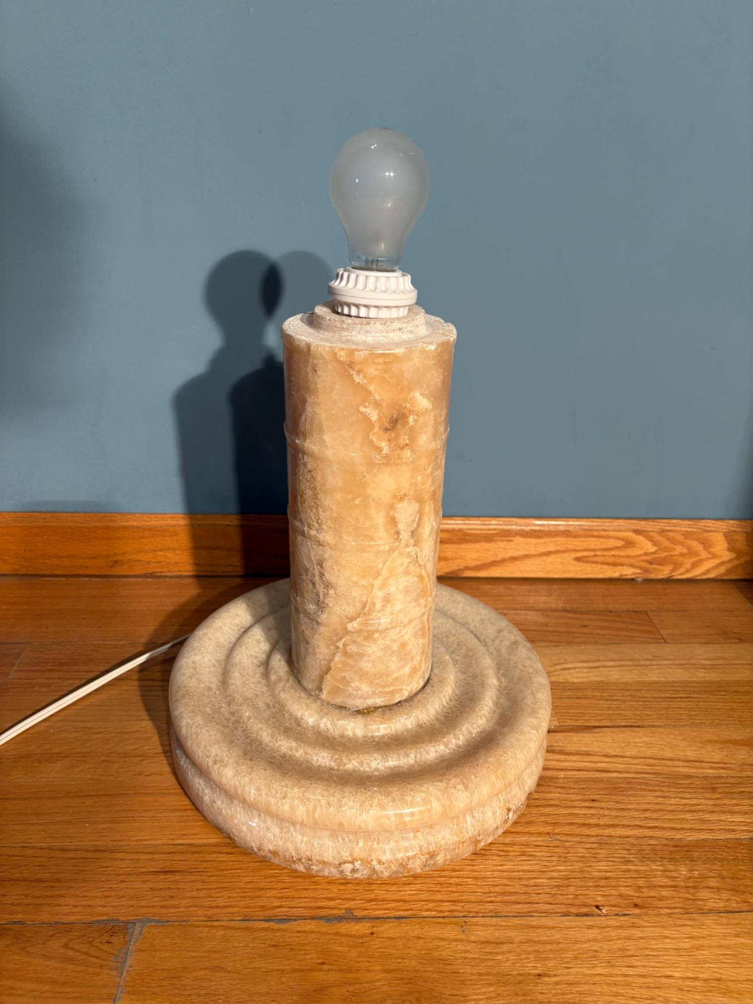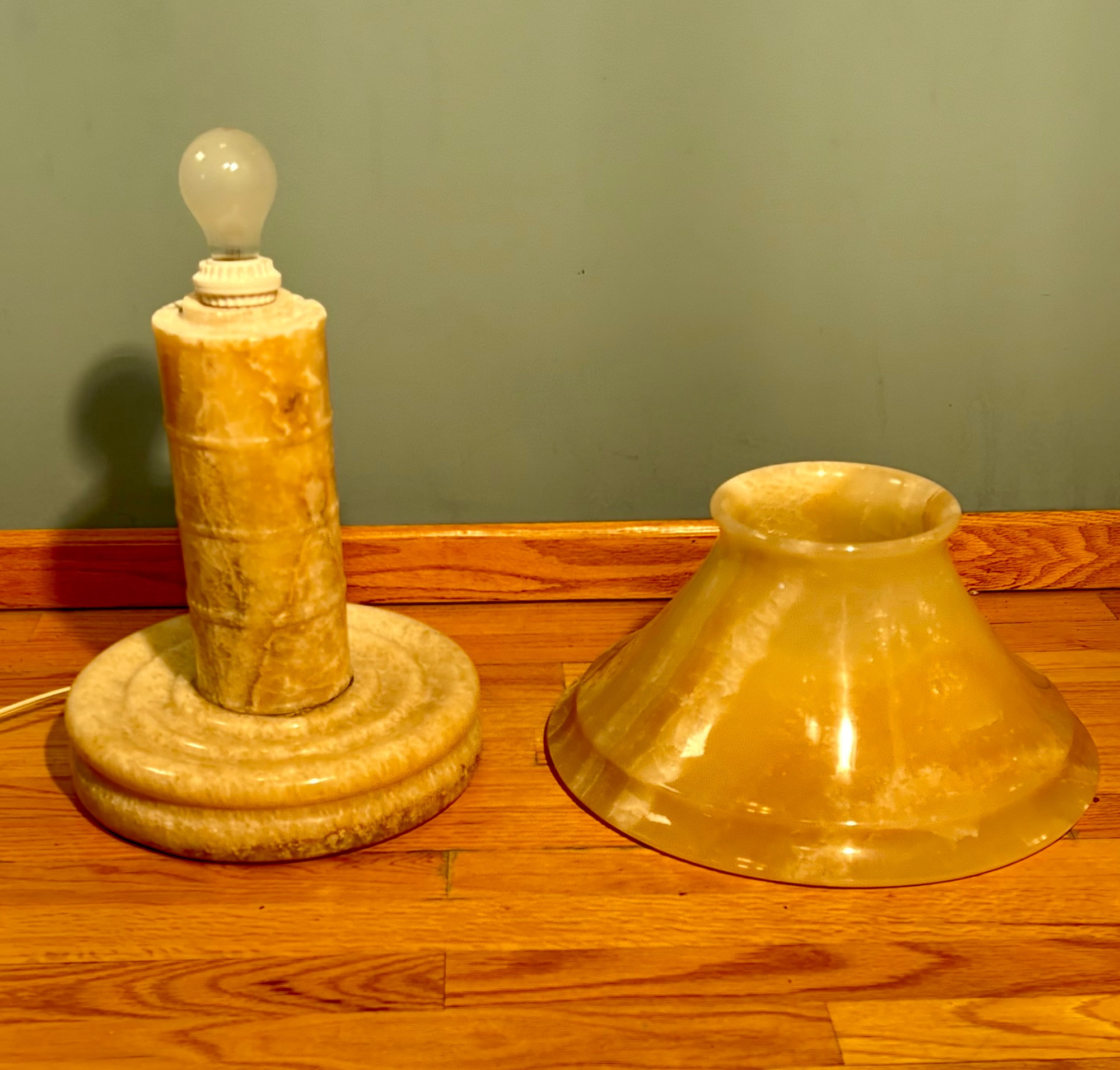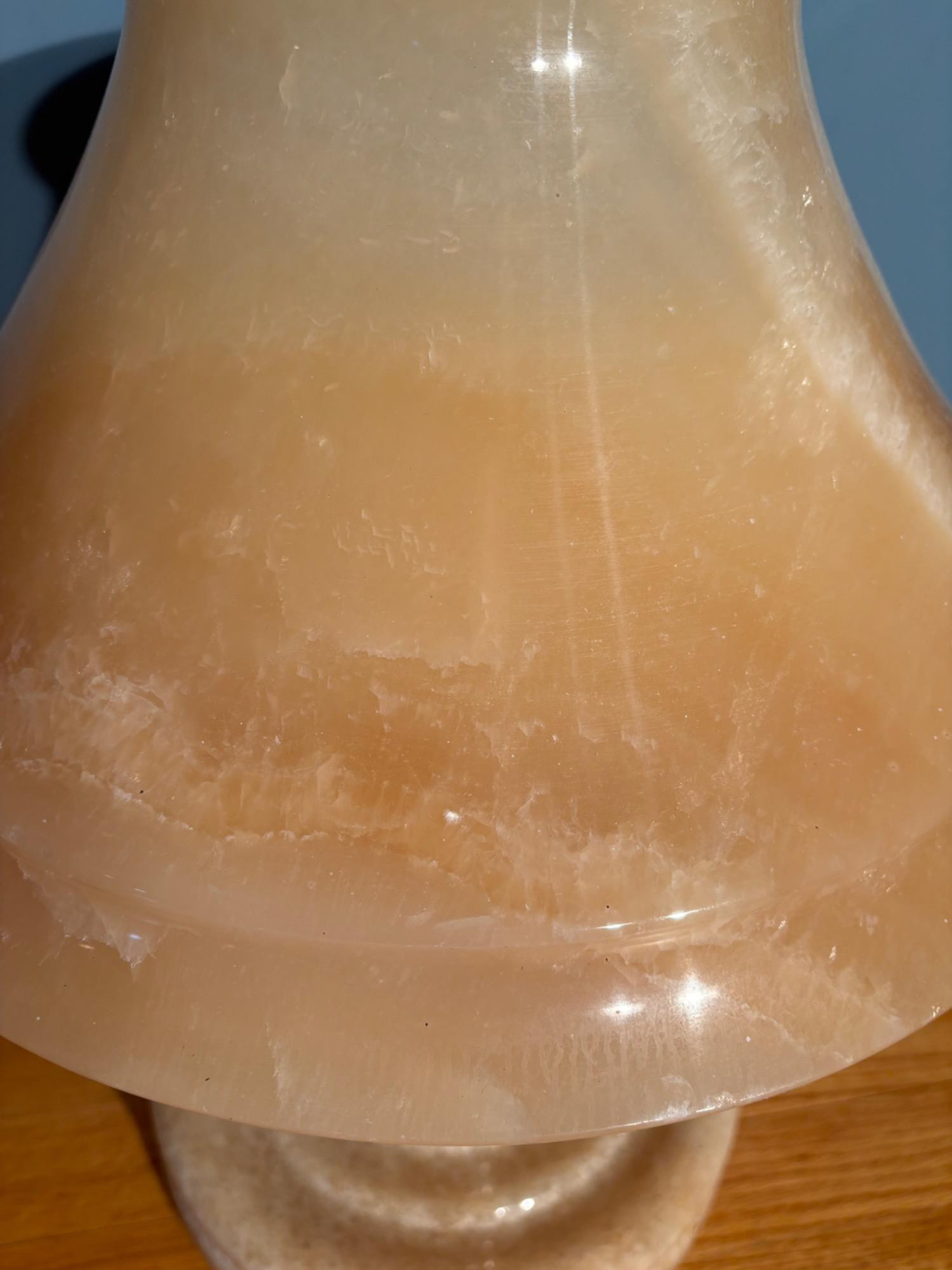 It's a good thing this marble lamp comes apart in 2 pieces or the average person could never lift it up! It is incredibly heavy and thus, extremely stable at the bedside. Beautiful soft glow through the rock with light going up to create a soft mood. Base & shaft measure approx. 15" H. Shade measures just over 15" at its widest by 8" H, so total height is approx. 23". 12' white cord with on/off switch & double-prong plug. Note - Matching lamp in Lot #120.