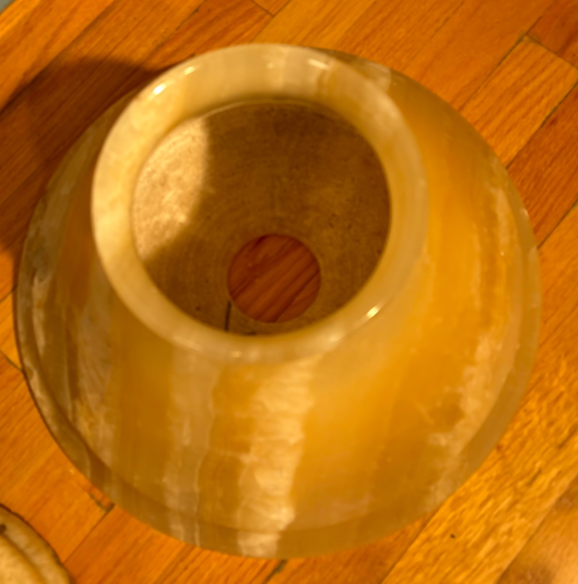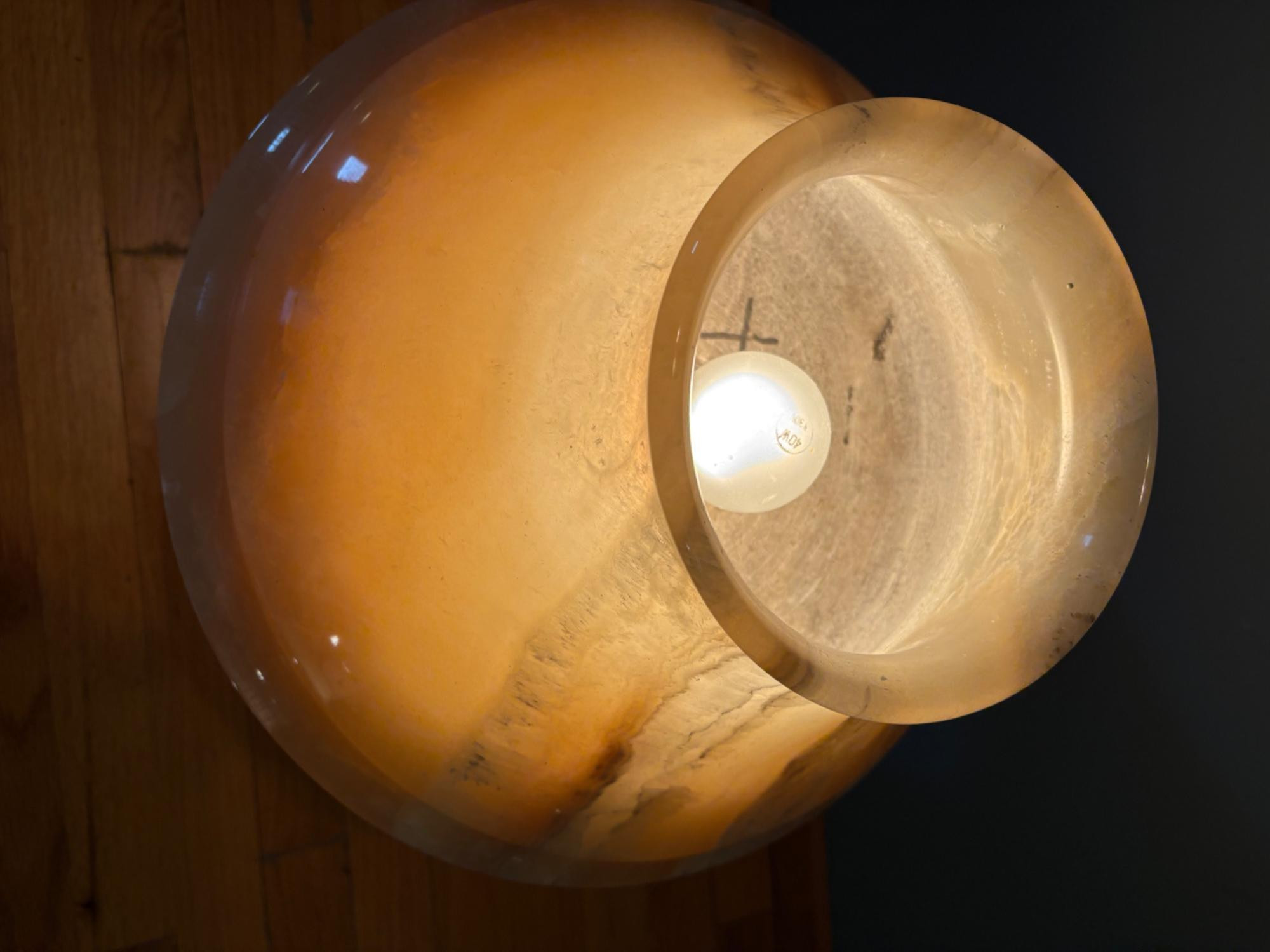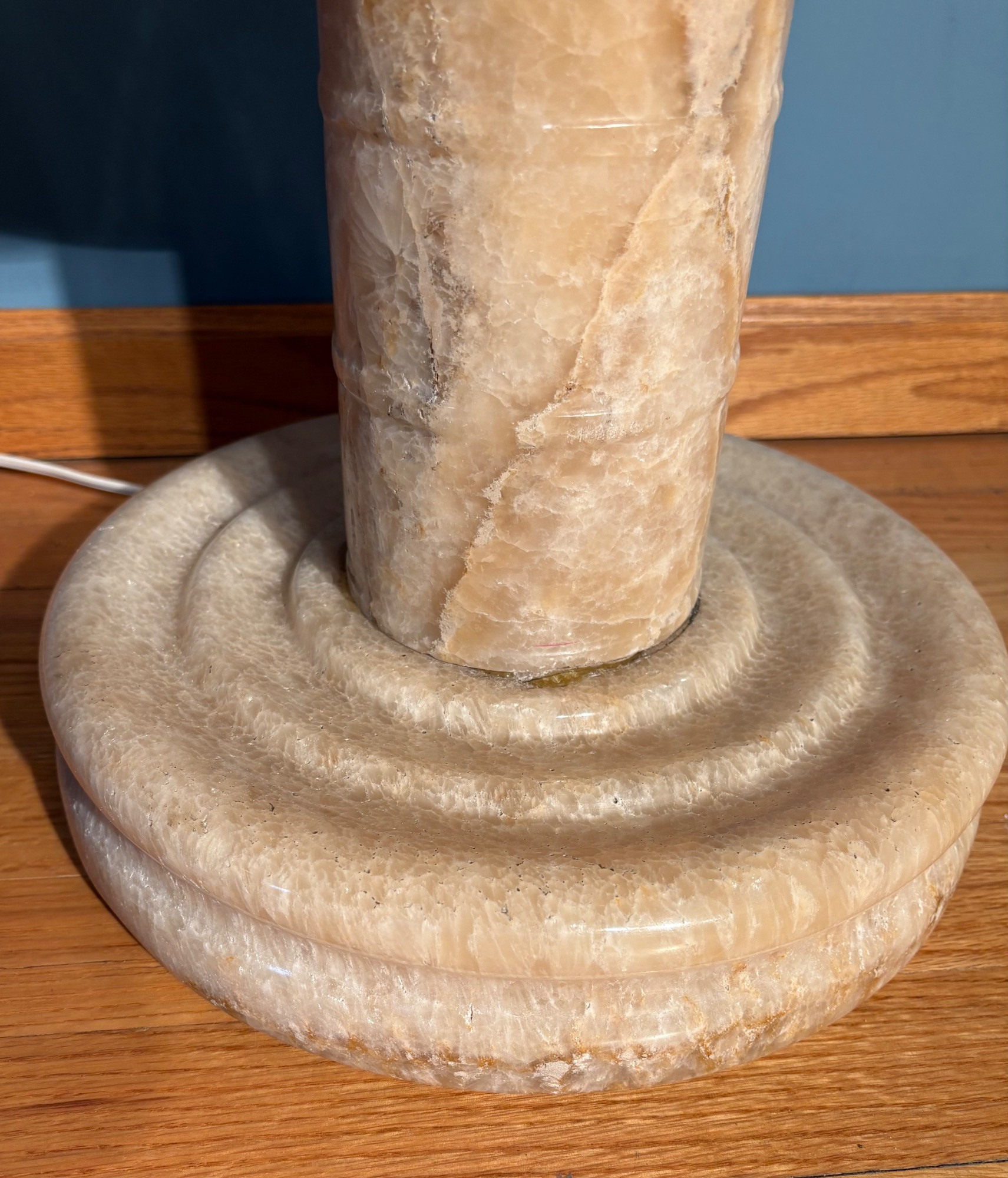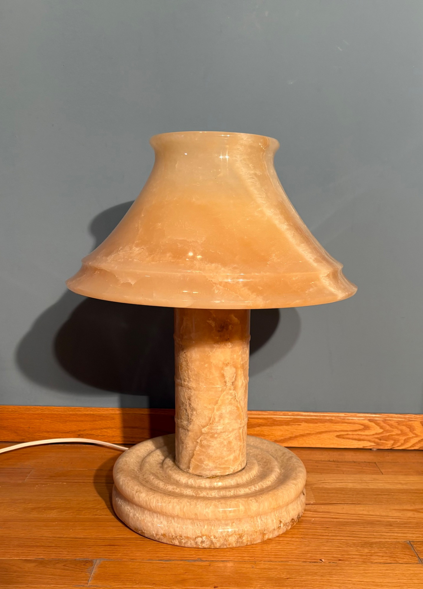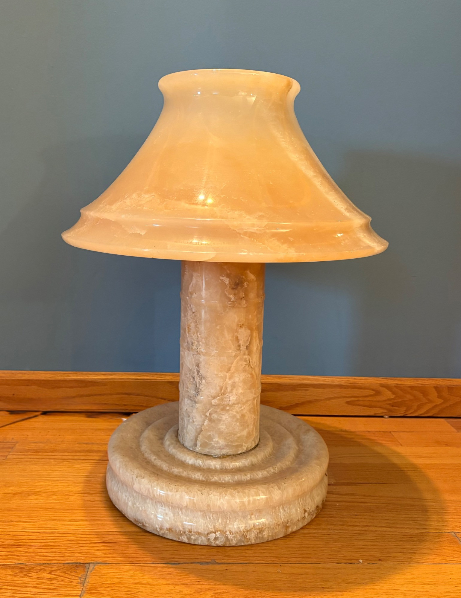 It's a good thing this marble lamp comes apart in 2 pieces or the average person could never lift it up! It is incredibly heavy and thus, extremely stable at the bedside. Beautiful soft glow through the rock with light going up to create a soft mood. Base & shaft measure approx. 15" H. Shade measures just over 15" at its widest by 8" H, so total height is approx. 23". 12' white cord with on/off switch & double-prong plug. Note - Matching lamp in Lot #120.