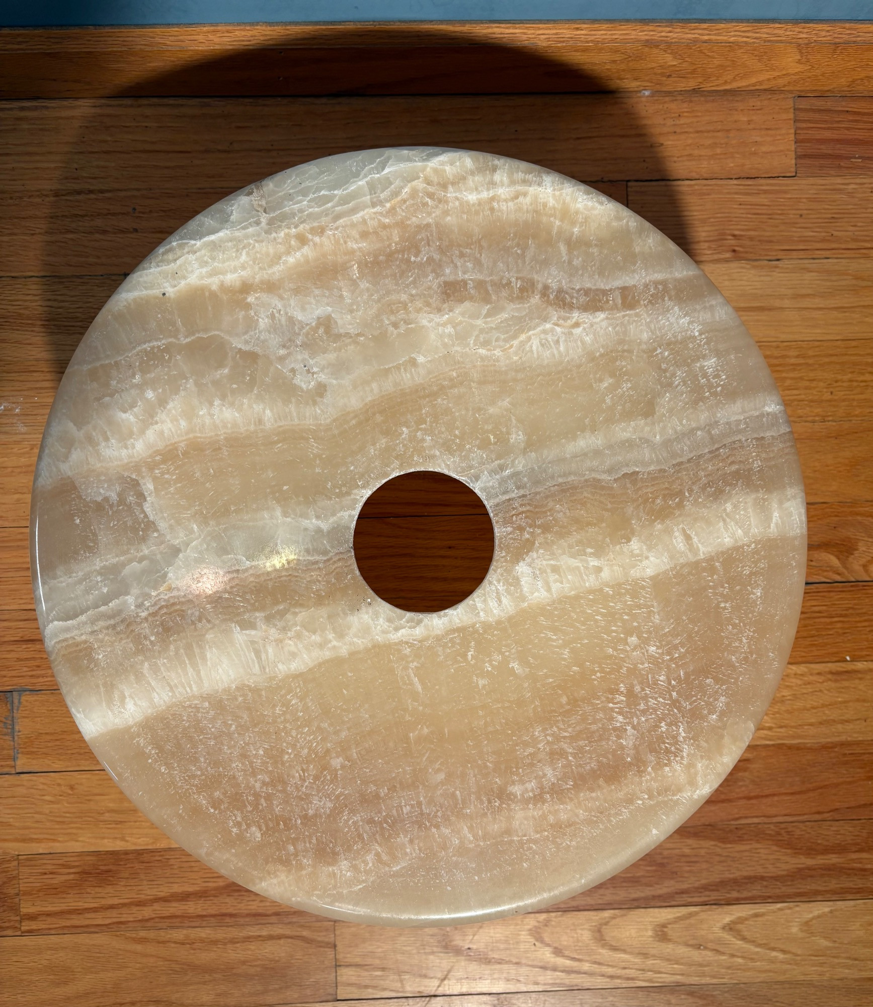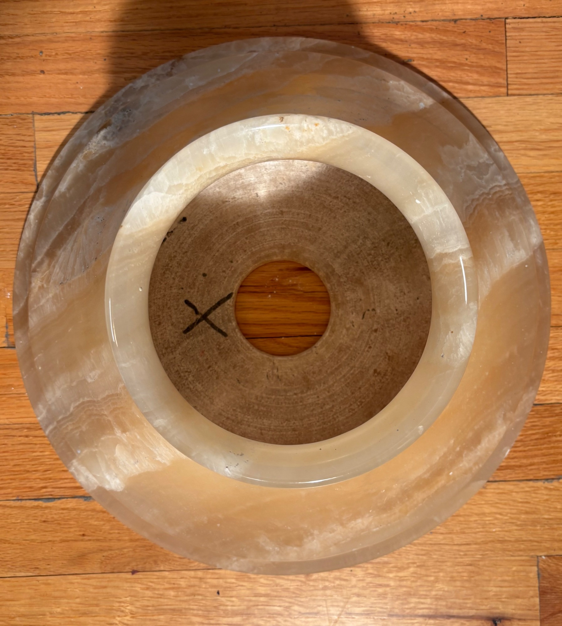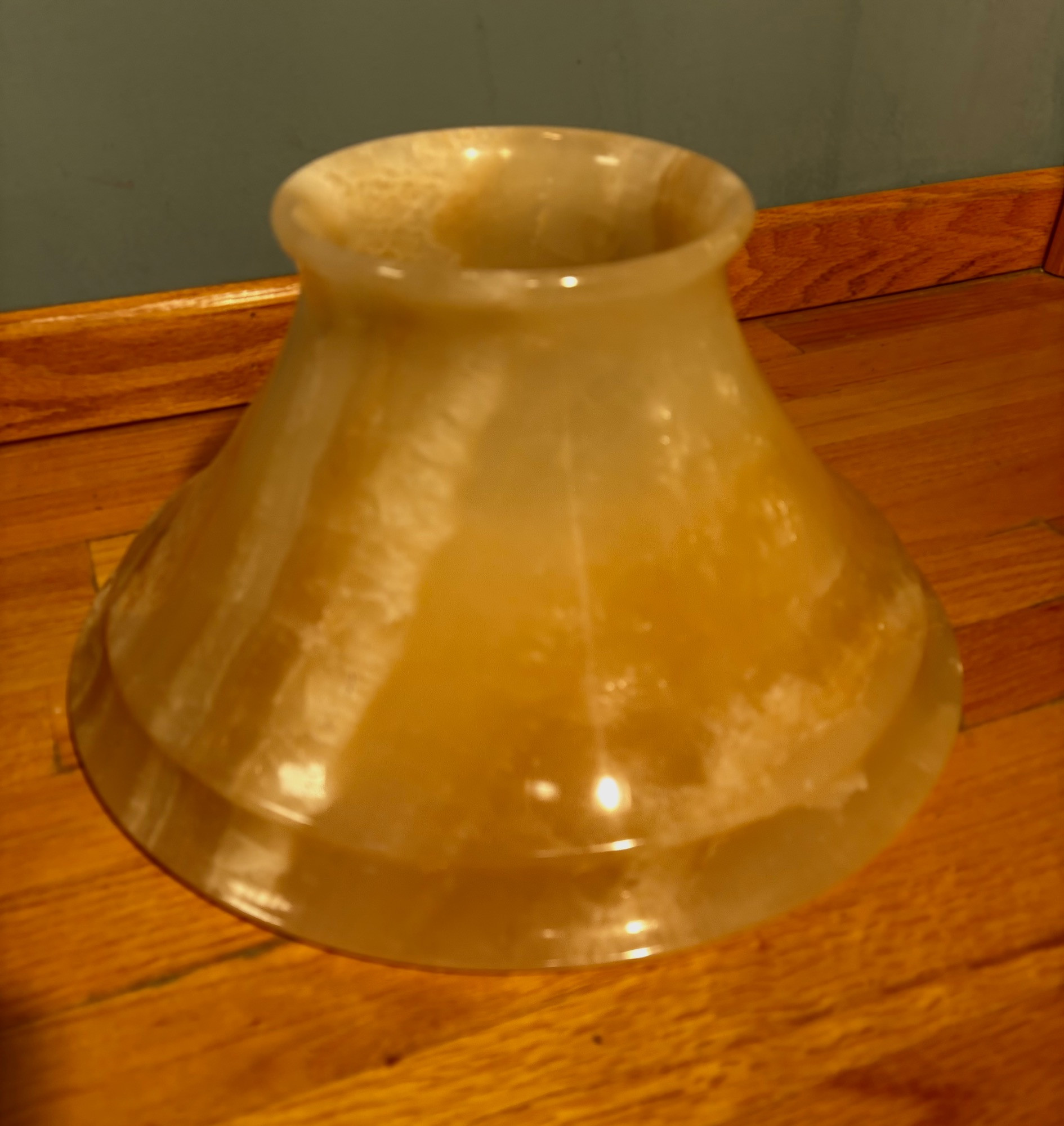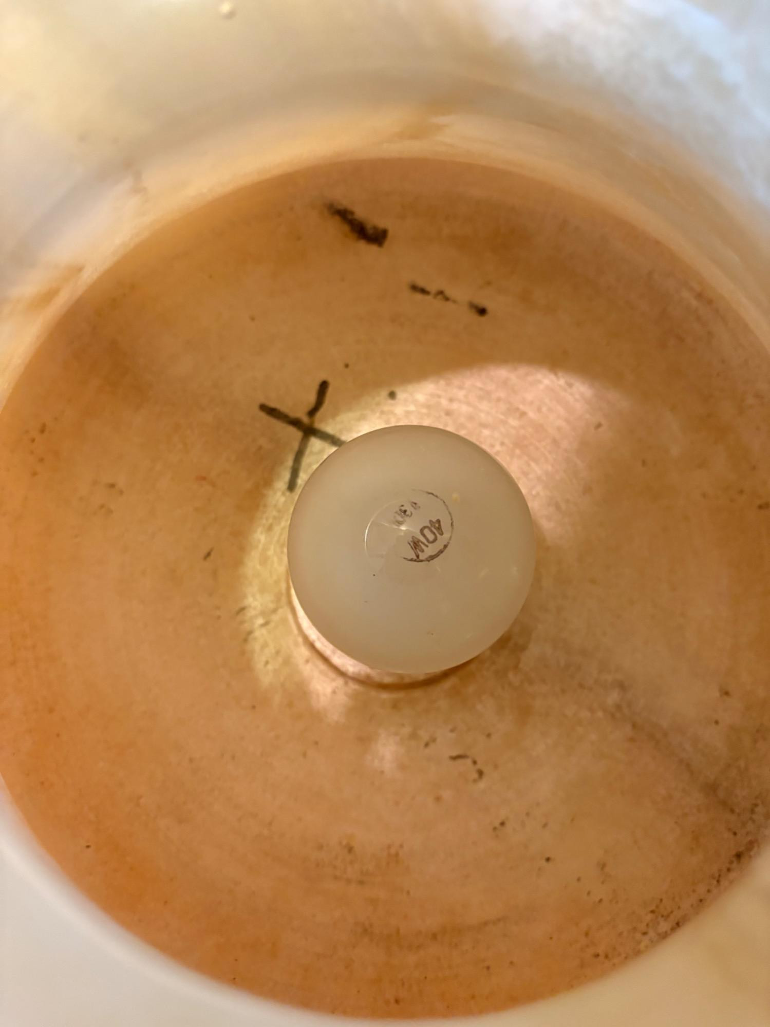 It's a good thing this marble lamp comes apart in 2 pieces or the average person could never lift it up! It is incredibly heavy and thus, extremely stable at the bedside. Beautiful soft glow through the rock with light going up to create a soft mood. Base & shaft measure approx. 15" H. Shade measures just over 15" at its widest by 8" H, so total height is approx. 23". 12' white cord with on/off switch & double-prong plug. Note - Matching lamp in Lot #120.