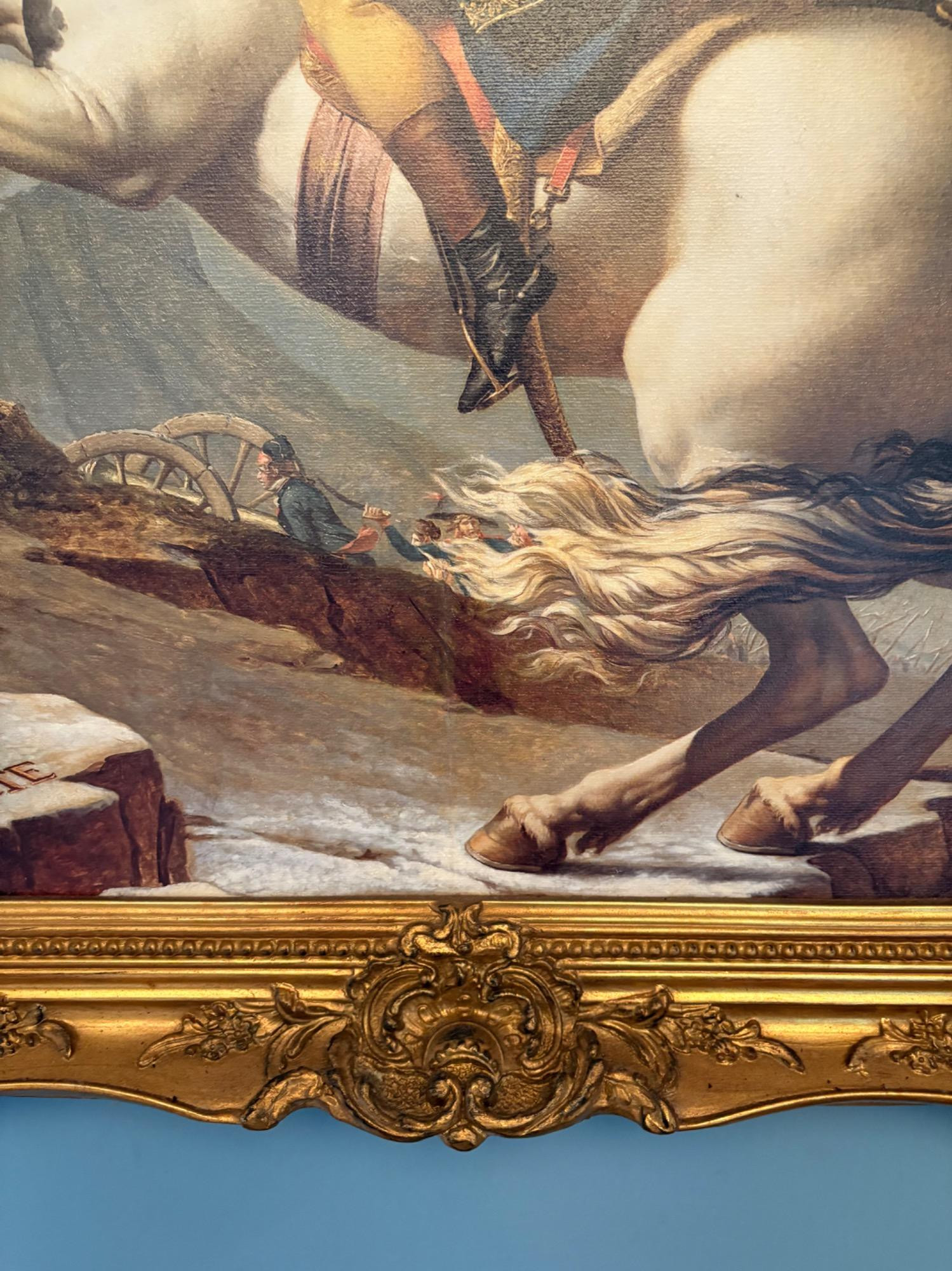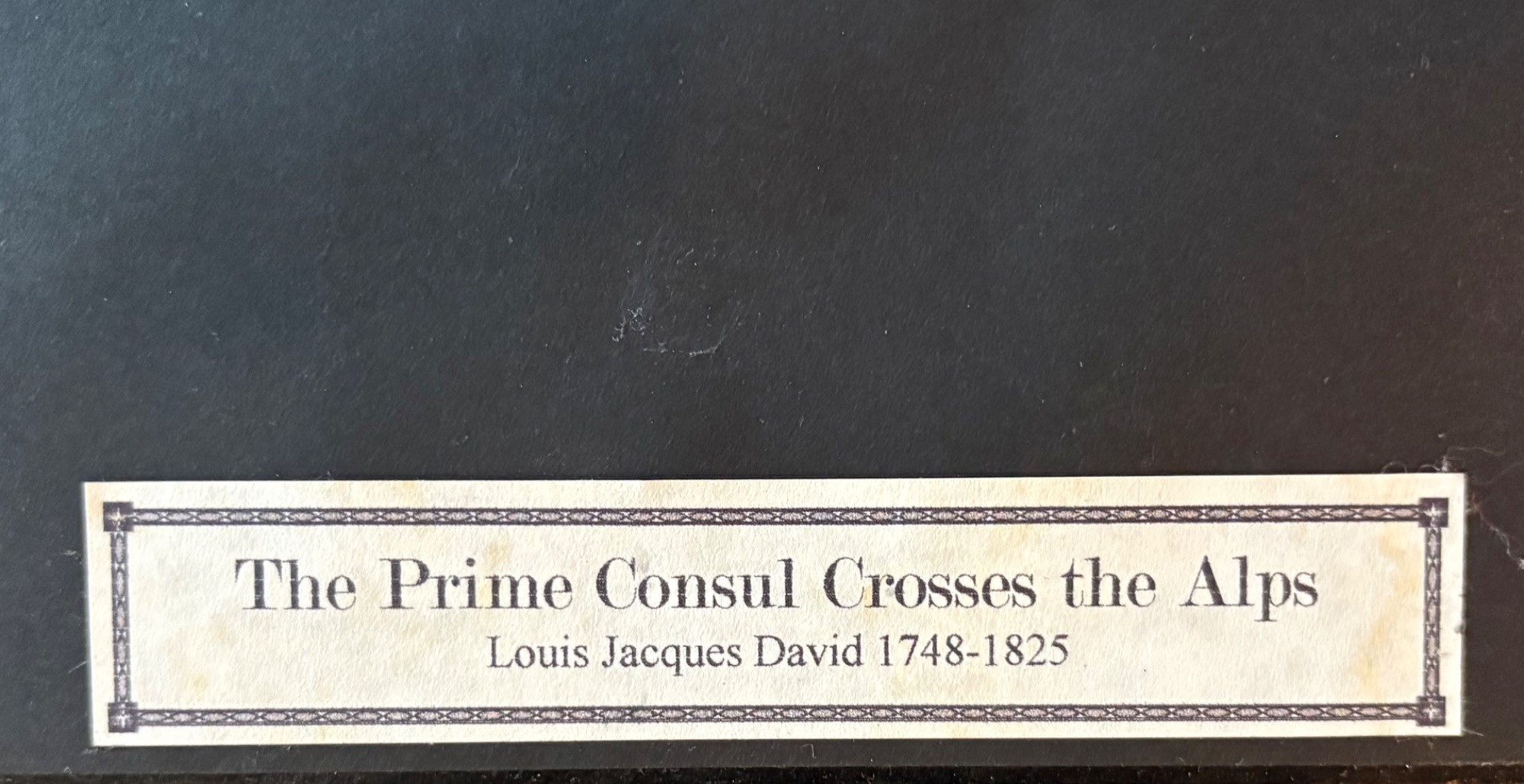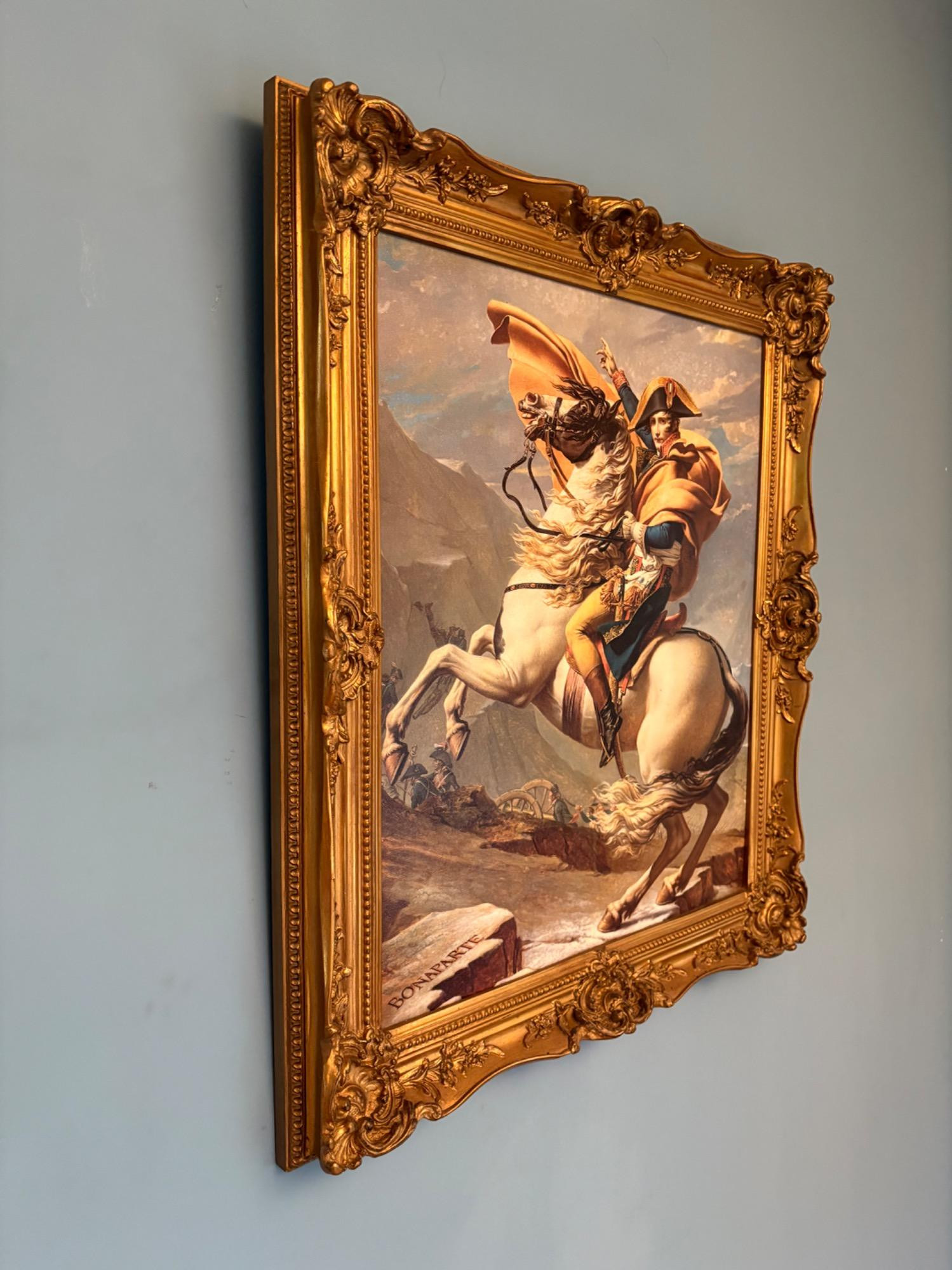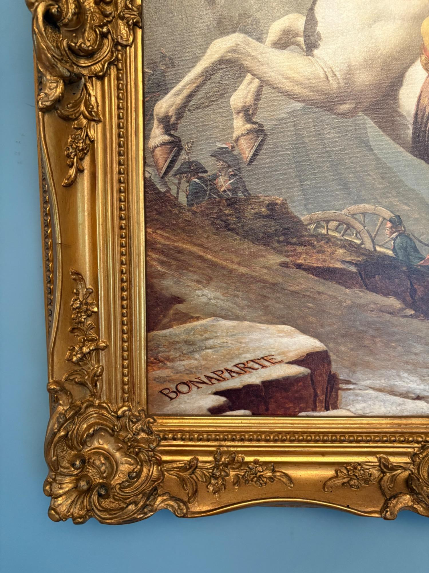 "Napoleon Crossing the Alps" or "Bonaparte Crossing the Alps" by French artist Jacques-Louis David (1748-1825). Reproduction painting on canvas of one of David's most iconic images - in ornate carved wood frame. larger work at about 3' high x 2' wide framed. From Around the Corner Fine Art of Virginia known for producing high quality reproductions & frames in the 1980s & 1990s (Sadly, they appear to have closed shop in the early 2000s). We found a catalogue offering many of the exact works our client owned that roughly aligns with our client's purchase dates (pre-internet when everything was phone ordered or mail ordered). For those curious about the original price range/production of the paintings, see catalogue info in photos below after the listing photos.