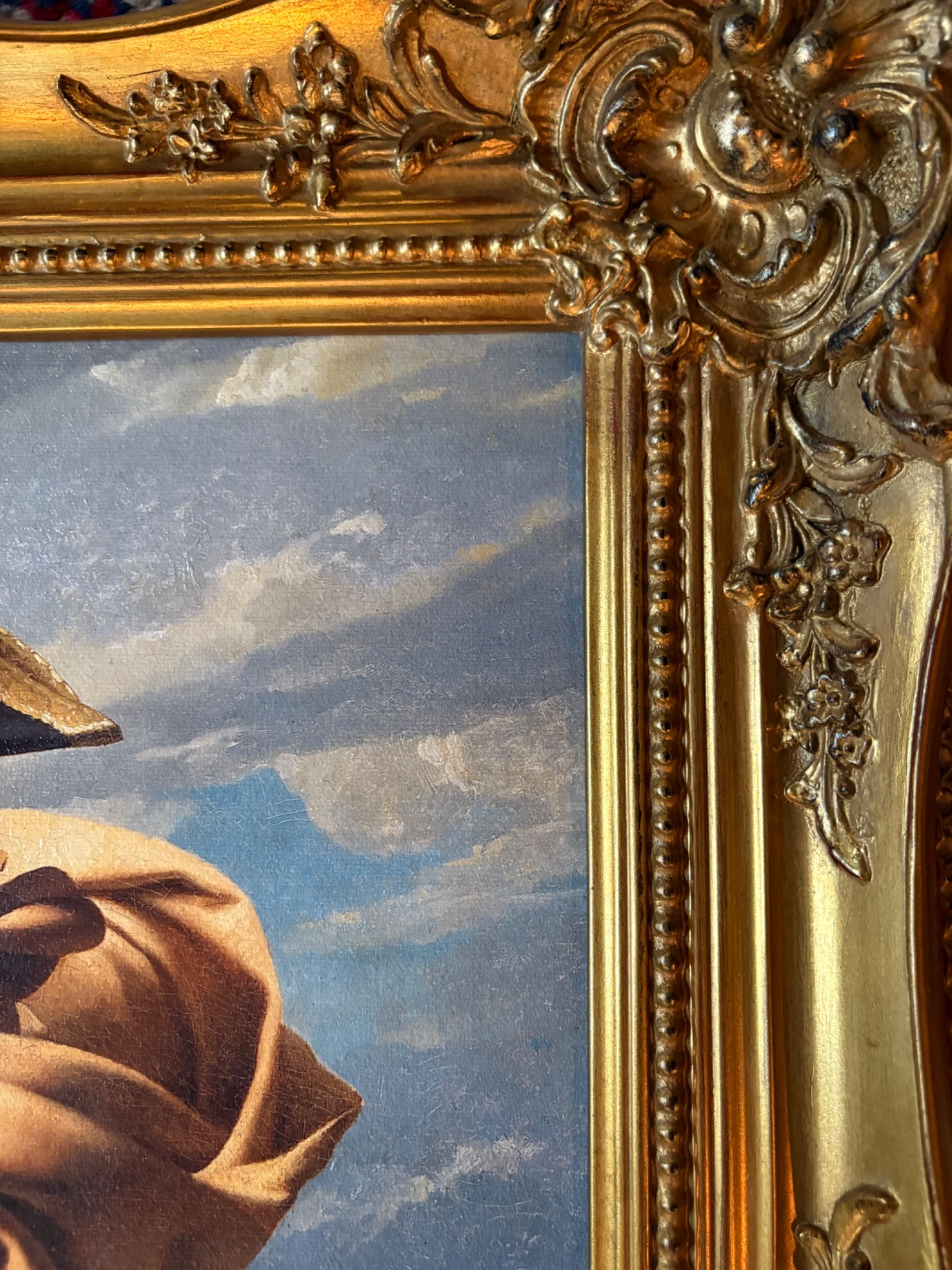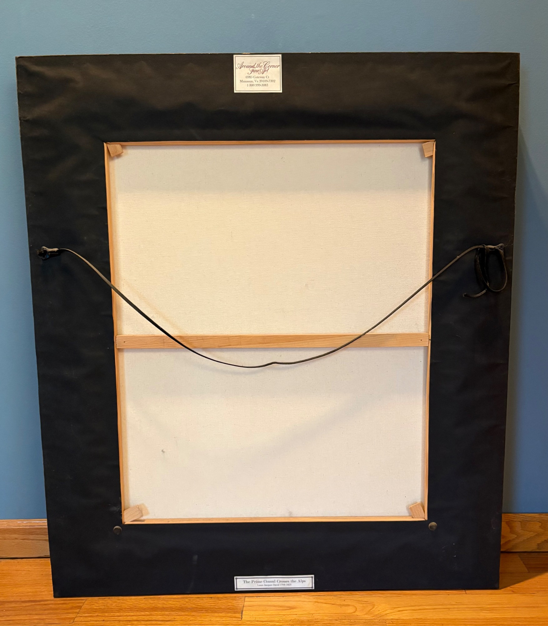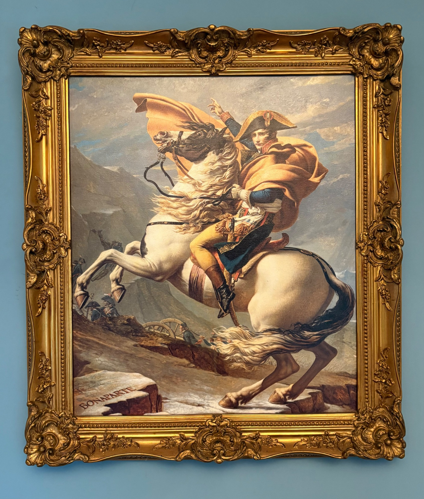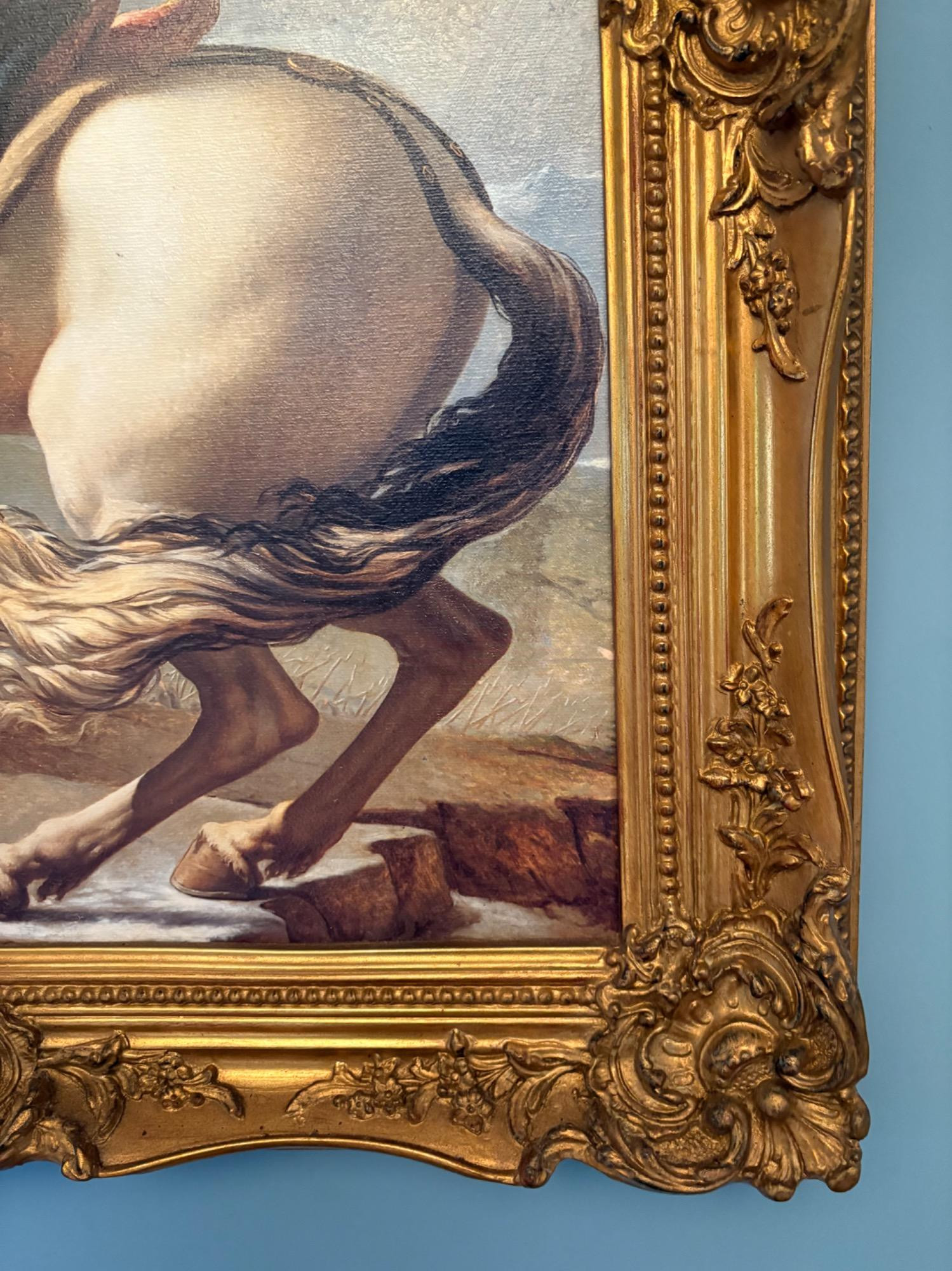 "Napoleon Crossing the Alps" or "Bonaparte Crossing the Alps" by French artist Jacques-Louis David (1748-1825). Reproduction painting on canvas of one of David's most iconic images - in ornate carved wood frame. larger work at about 3' high x 2' wide framed. From Around the Corner Fine Art of Virginia known for producing high quality reproductions & frames in the 1980s & 1990s (Sadly, they appear to have closed shop in the early 2000s). We found a catalogue offering many of the exact works our client owned that roughly aligns with our client's purchase dates (pre-internet when everything was phone ordered or mail ordered). For those curious about the original price range/production of the paintings, see catalogue info in photos below after the listing photos.