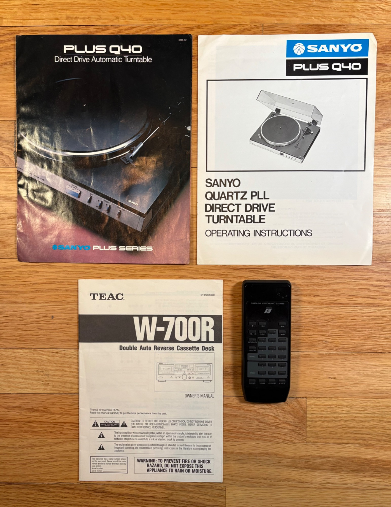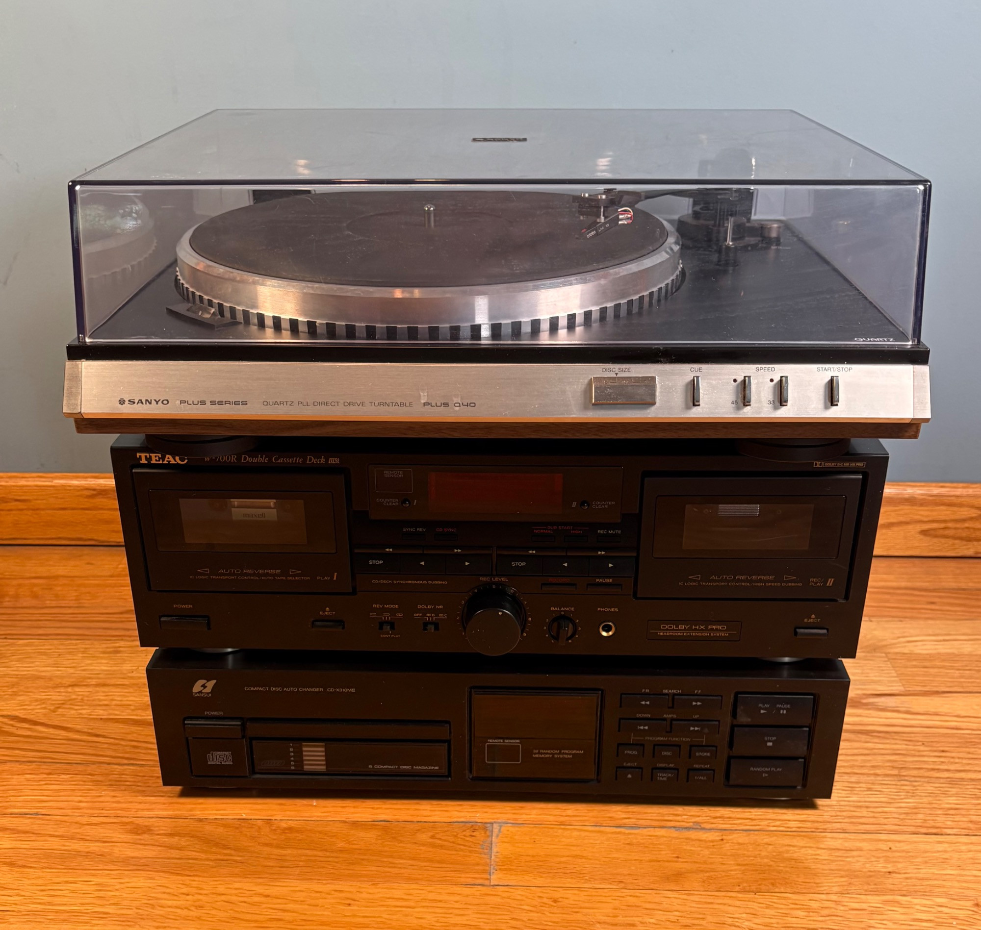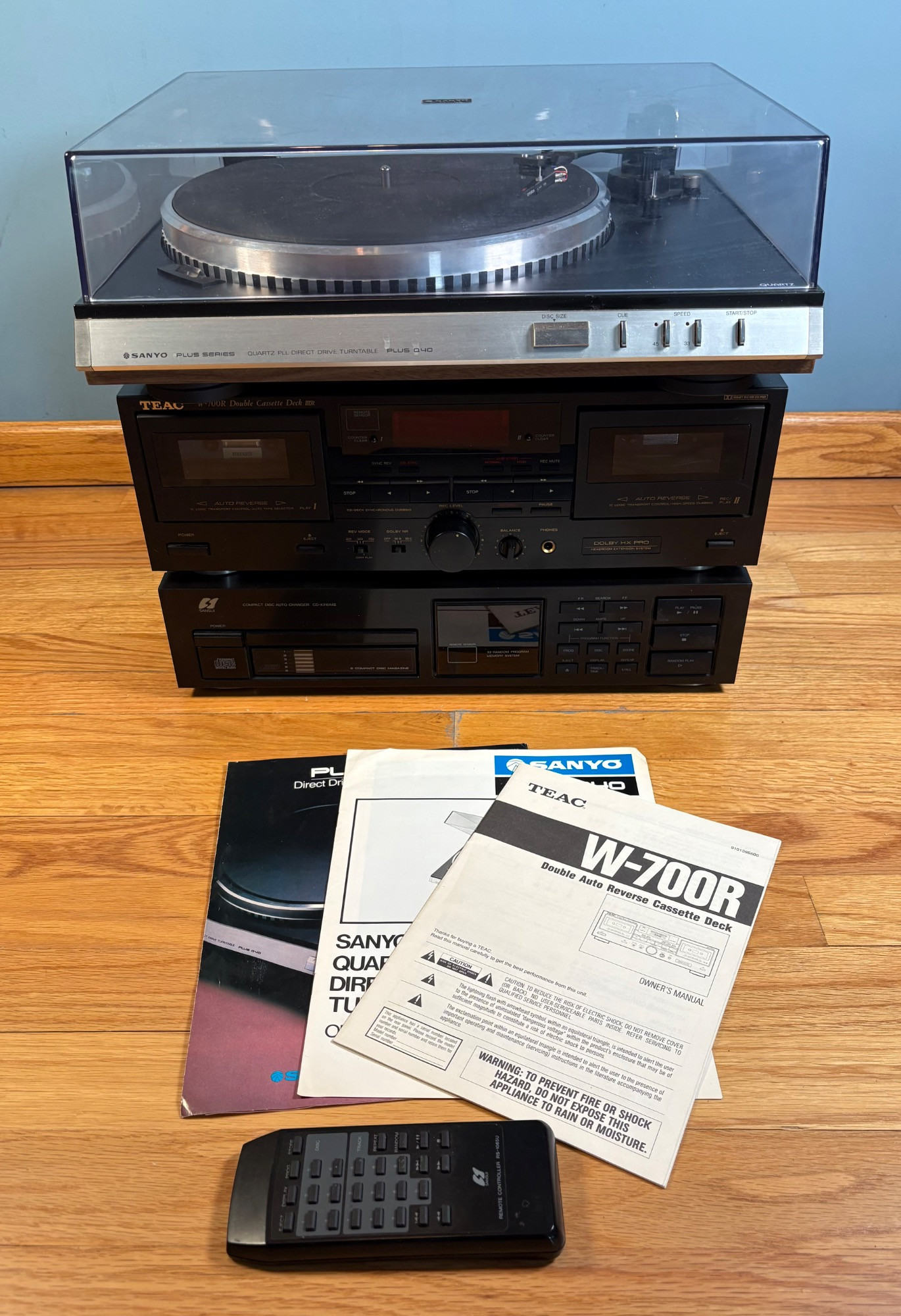 Sanyo Plus Series Quartz PL Direct Drive Turntable Plus Q40. Powers on. TEAC W-700R Double Cassette Deck Dolby XH Pro Headroom Extension System. Powers on. Sansui CD-X310MIII 6 Compact Disc Magazine CD Player. Powers on.