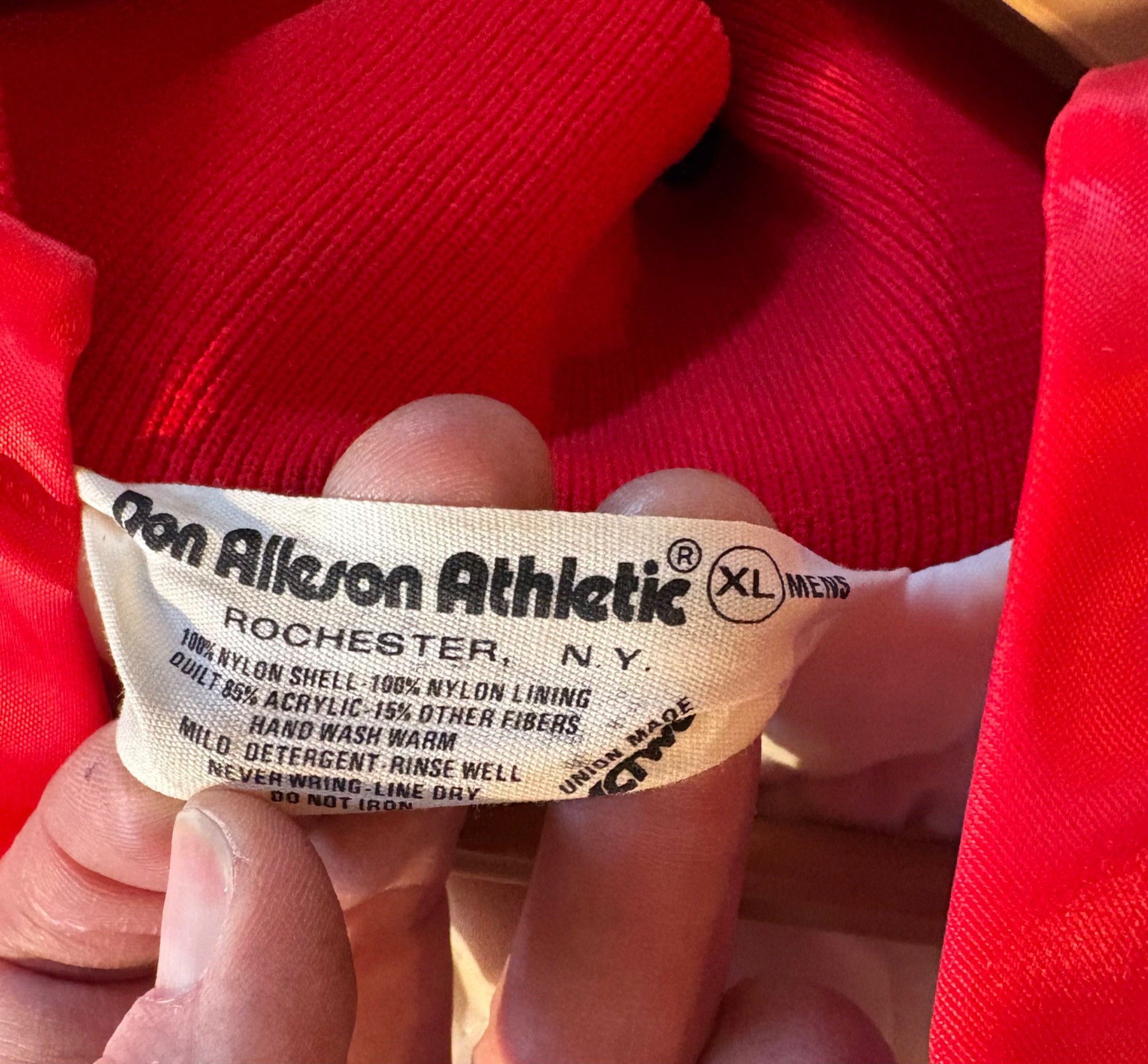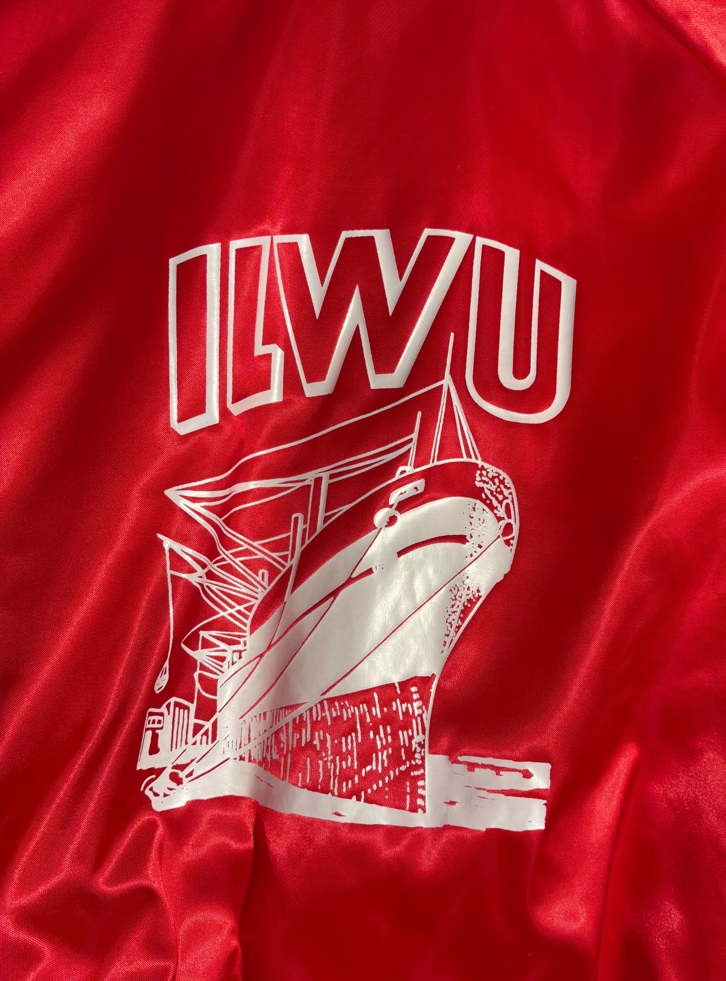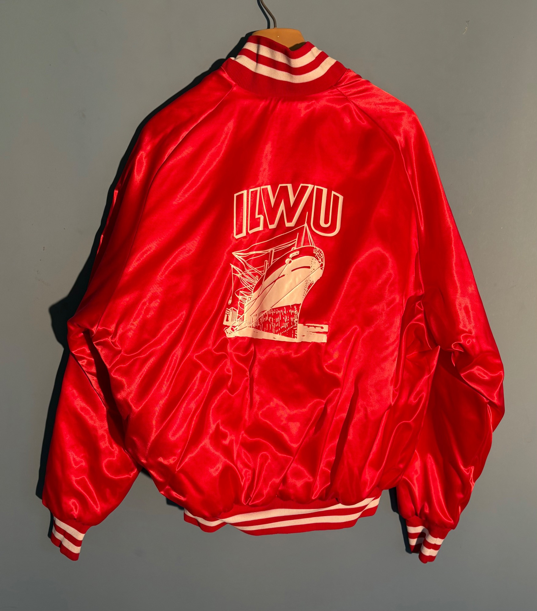 Lovely retro satin baseball jacket in brilliant red. Appears never to have been worn! Striped red and white elasticated collar, cuffs, and waistband. Snap front closure. From Dan Allison Athletics of Rochester, New York. Has "GYURI" embroidered in white script on the front and the longshoreman‘s union (ILWU) with a ship on the back. This jacket is very good quality with a quilted white lining and in a hard-to-find size: XL - it measures 25" pit to pit. Bonus: Seattle longshoreman’s strike placard in yellow used during a labor dispute. Measures 24" H x 18" W. Also included are 4 ILWU buttons.