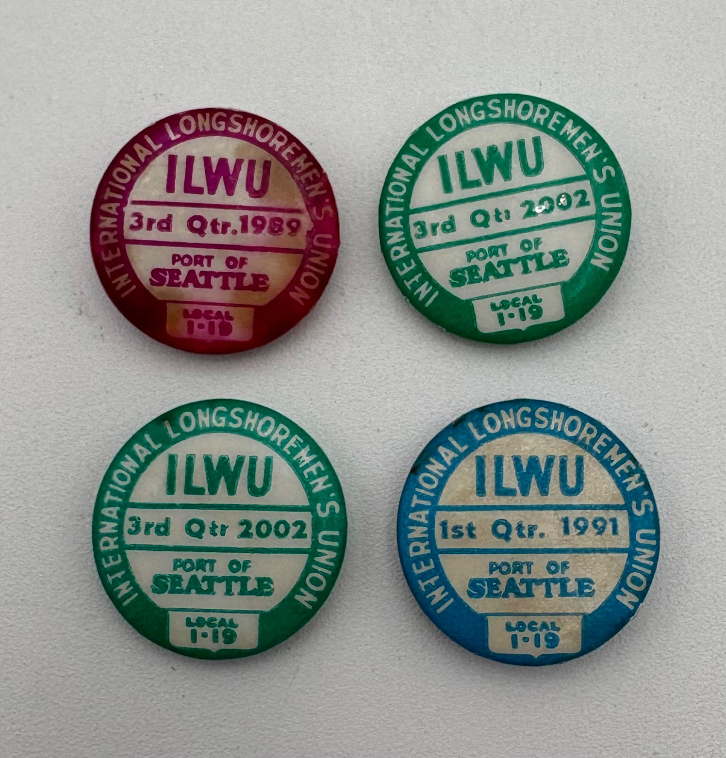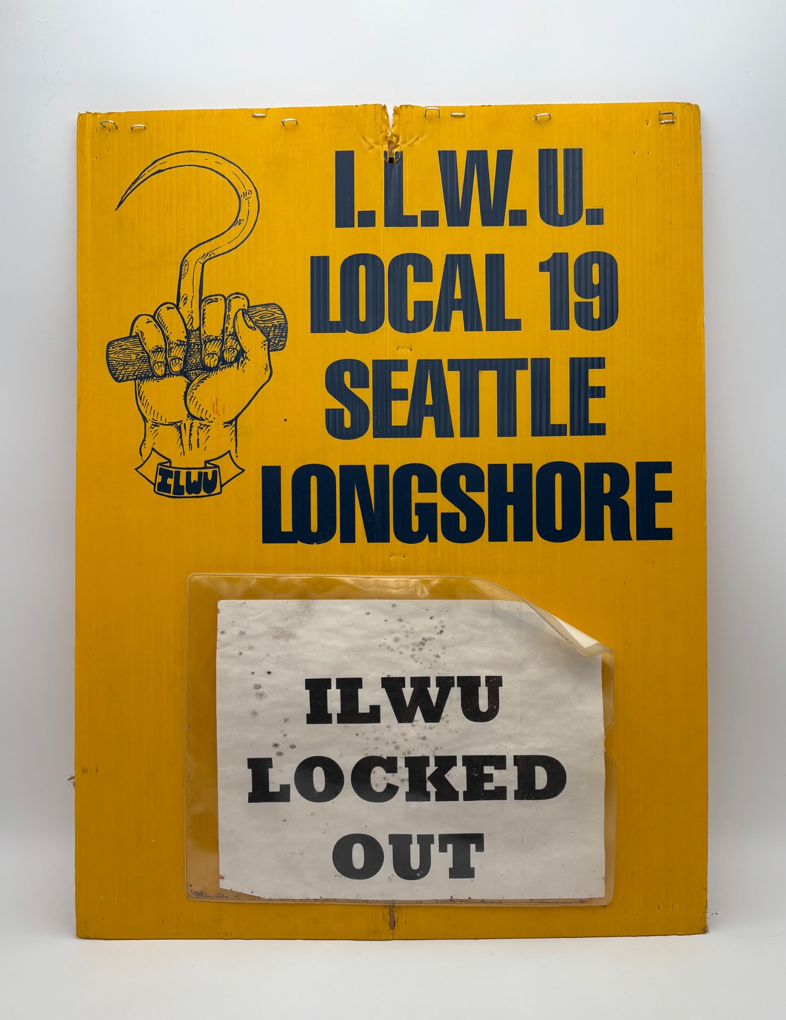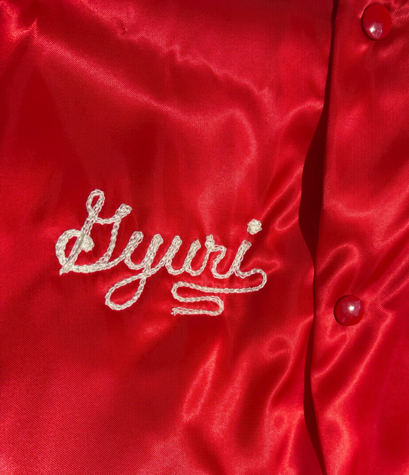 Lovely retro satin baseball jacket in brilliant red. Appears never to have been worn! Striped red and white elasticated collar, cuffs, and waistband. Snap front closure. From Dan Allison Athletics of Rochester, New York. Has "GYURI" embroidered in white script on the front and the longshoreman‘s union (ILWU) with a ship on the back. This jacket is very good quality with a quilted white lining and in a hard-to-find size: XL - it measures 25" pit to pit. Bonus: Seattle longshoreman’s strike placard in yellow used during a labor dispute. Measures 24" H x 18" W. Also included are 4 ILWU buttons.