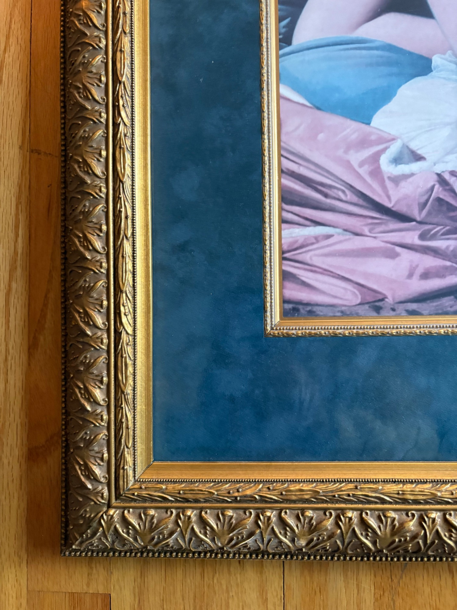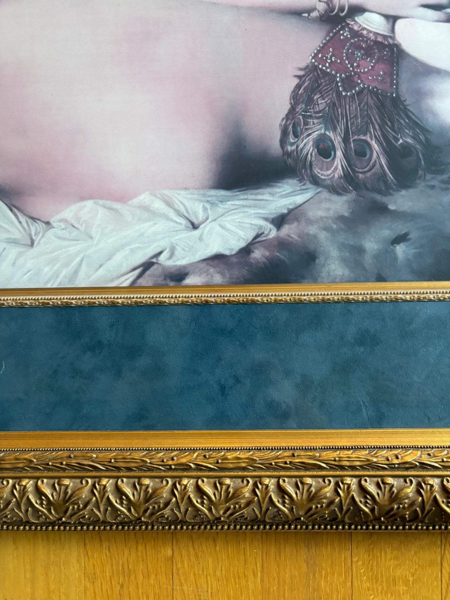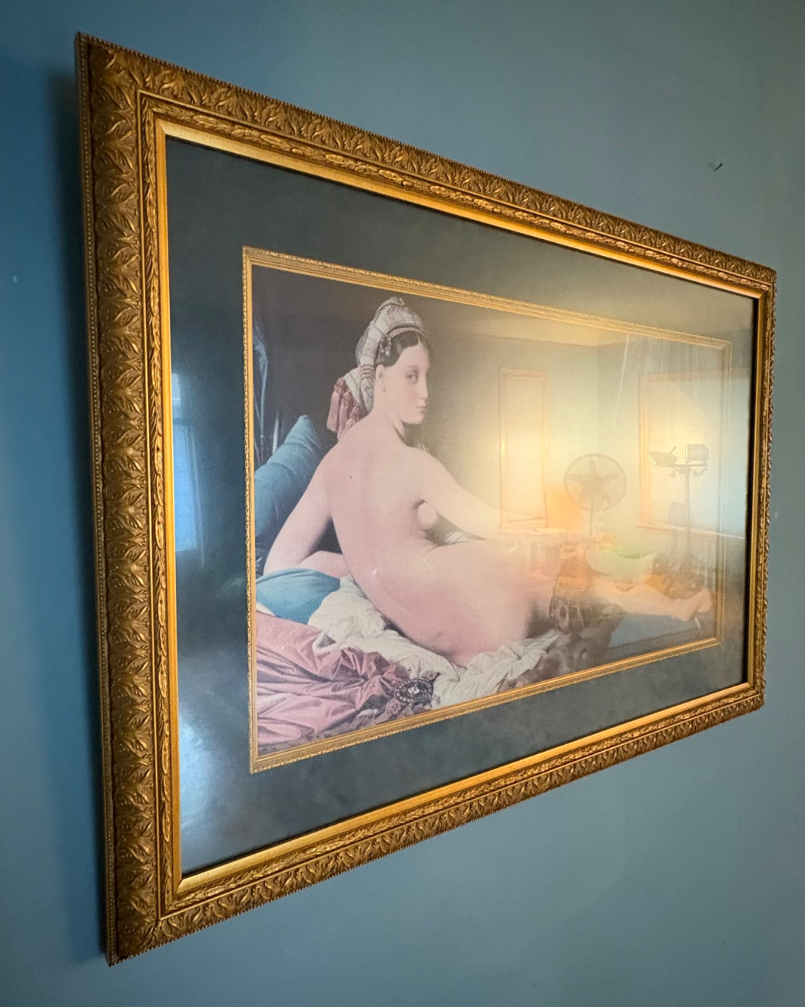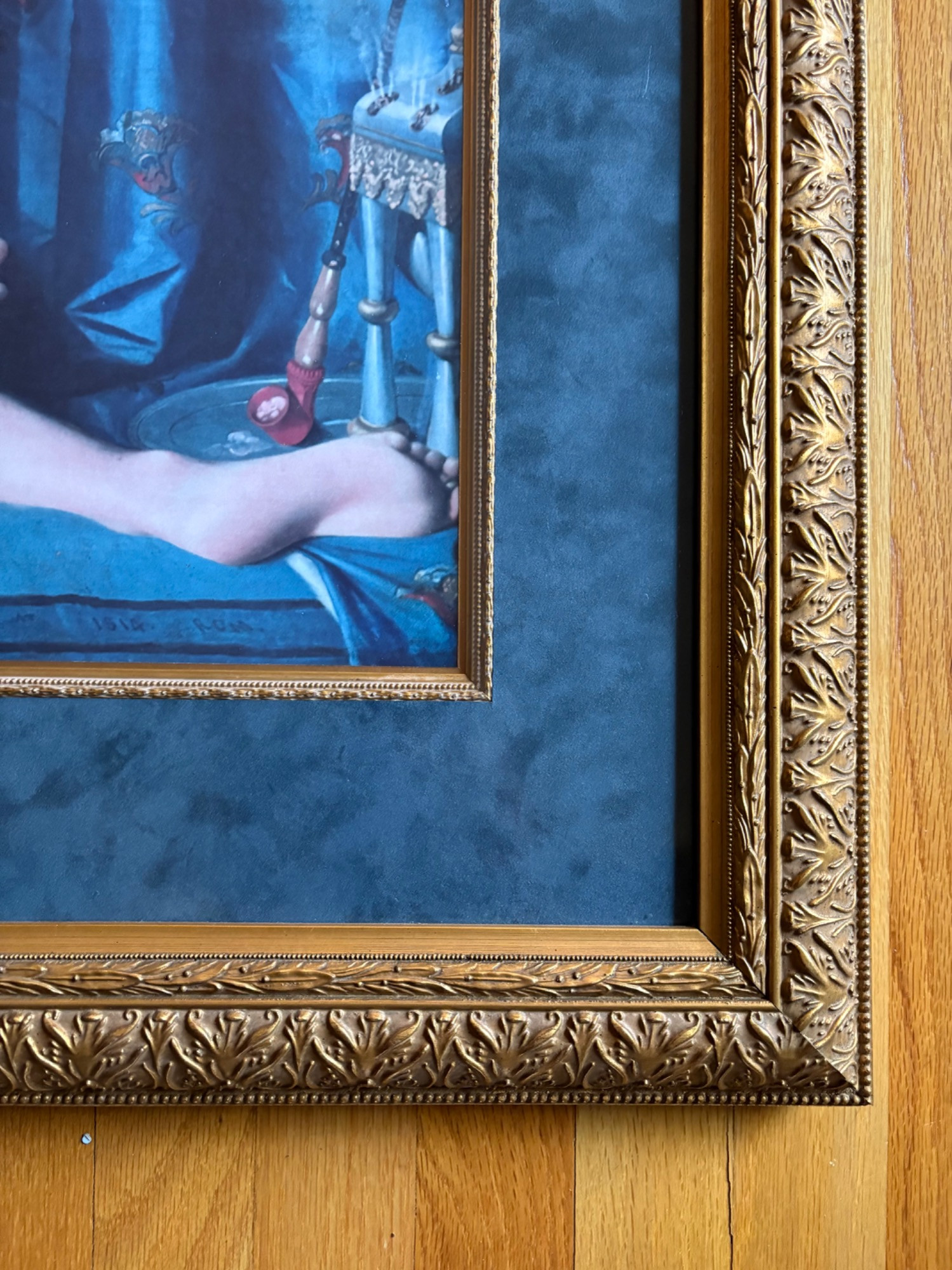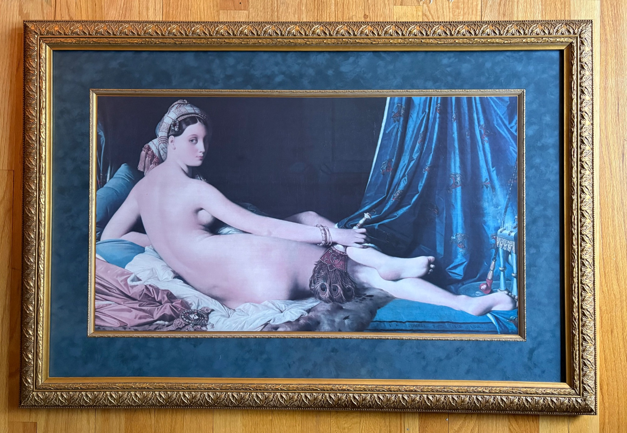 "Le Grande Odalisque" by Jean Auguste Dominique Ingres (1780 - 1867) This large reproduction print of the original painting is framed in gold. Larger size piece at about 2.5' high x just under 4' wide framed. We are usure of the origin of this print - given the image/frame, we think it might have been from Around the Corner Art but are not certain. Can be shipped FedEx.