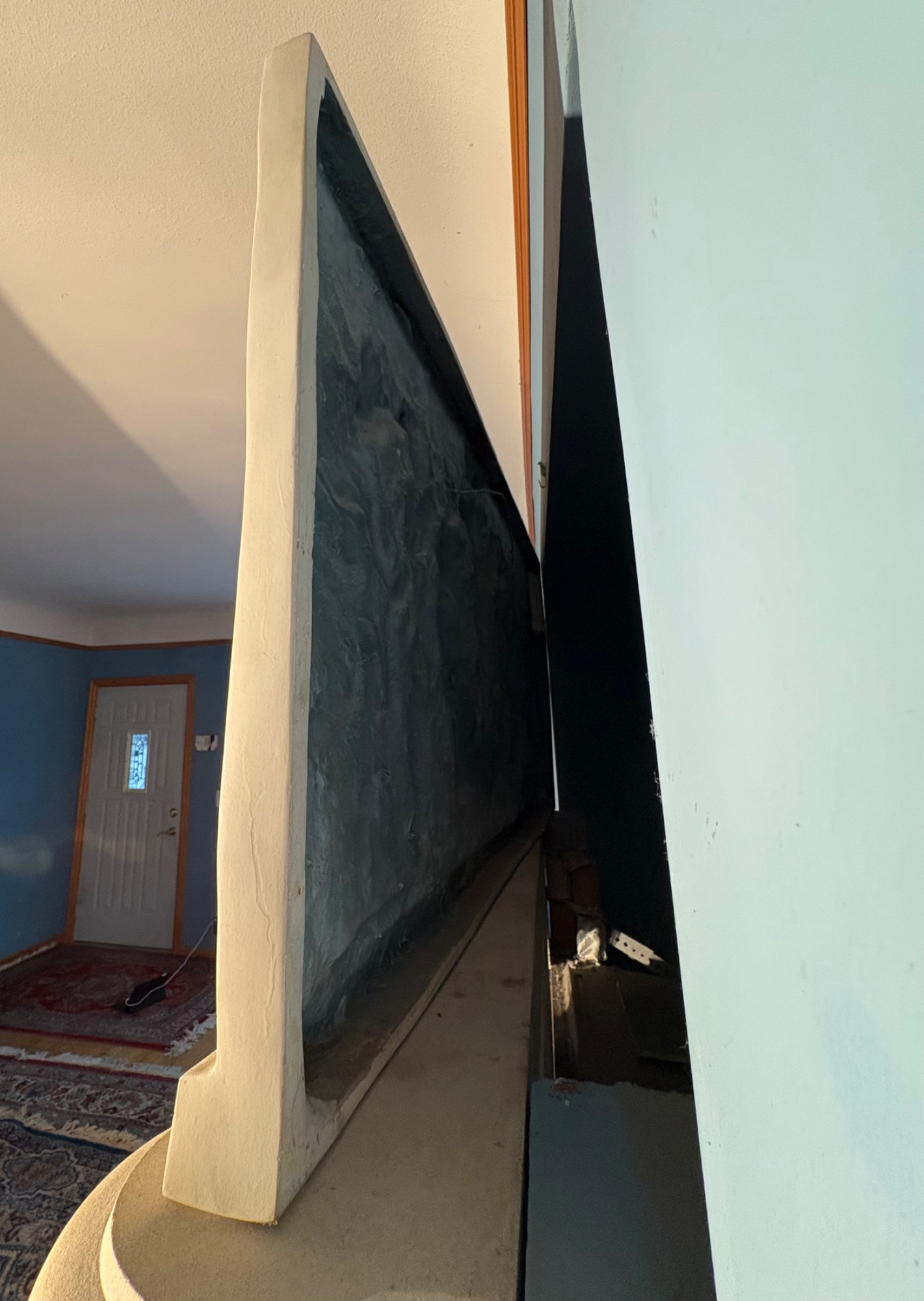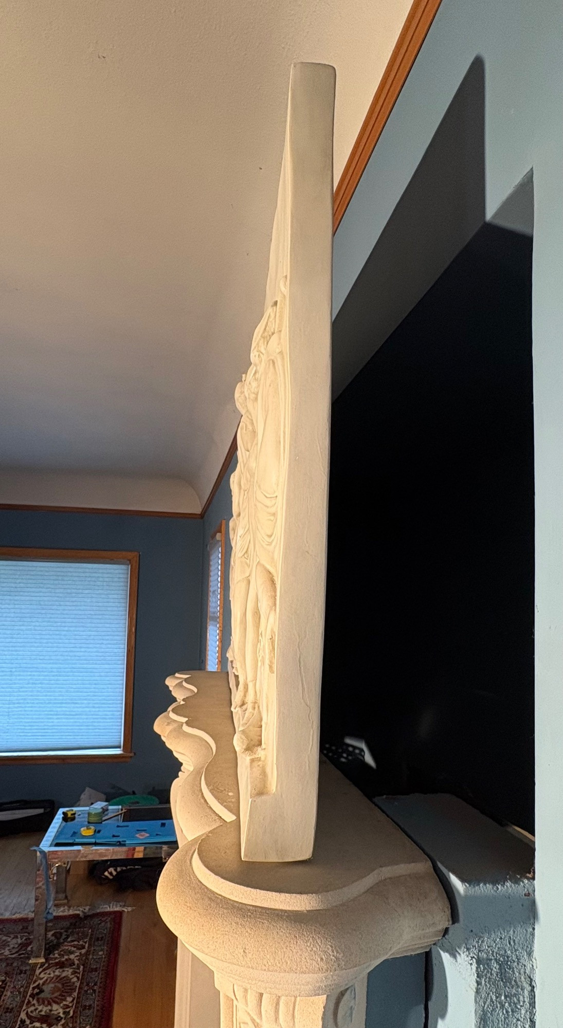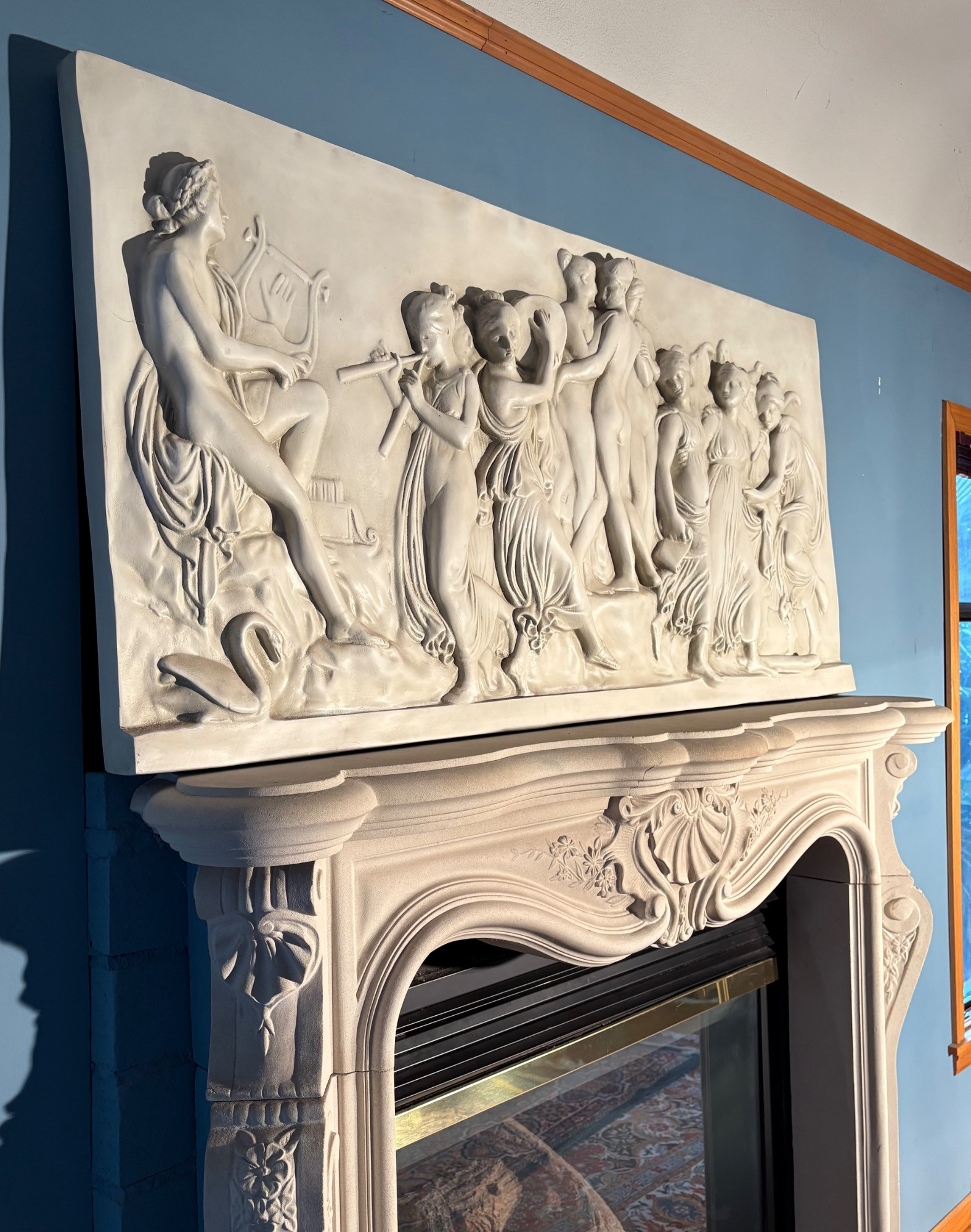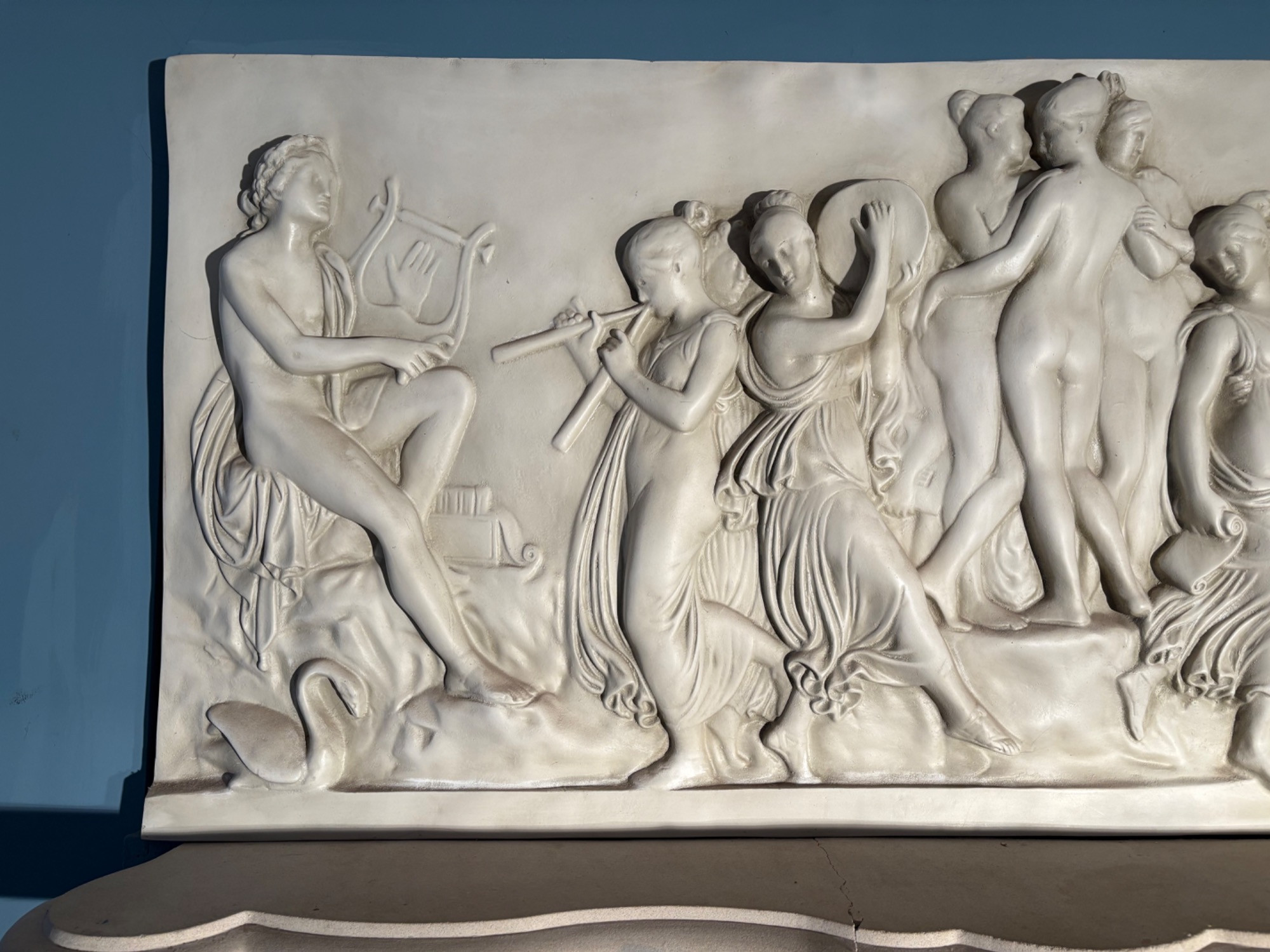 Large mantle wall relief in neo-classical style. Gives the illusion of carved marble, but it is actually lightweight cast plastic. Measures approx. 28" H x 61.5" W x 2.5" D. There are a few small scuffs here and there, but generally in very good condition – just in dire need of a good scrub to look really nice again.