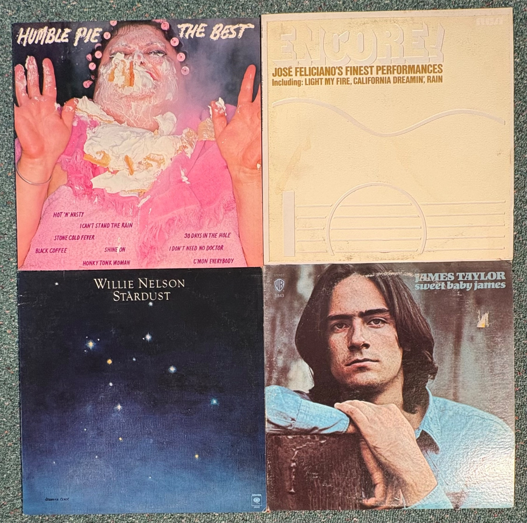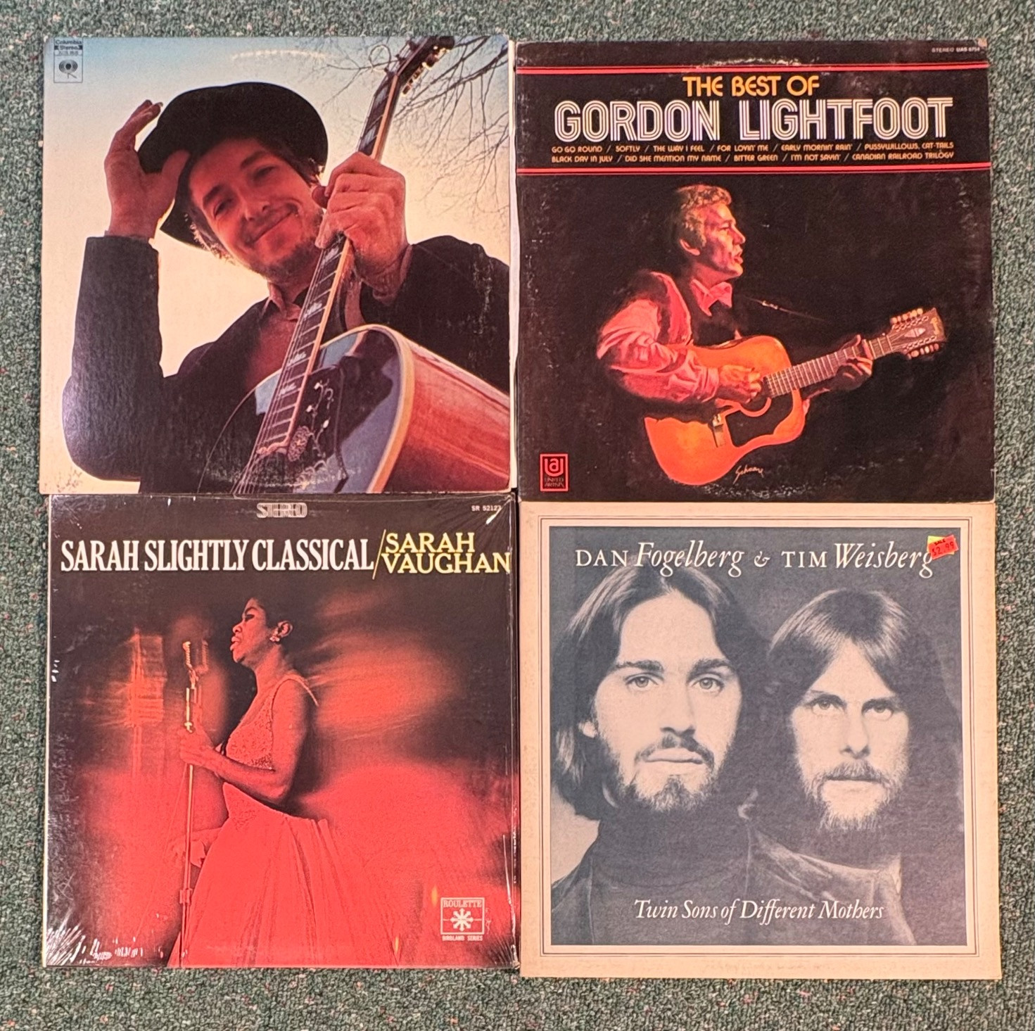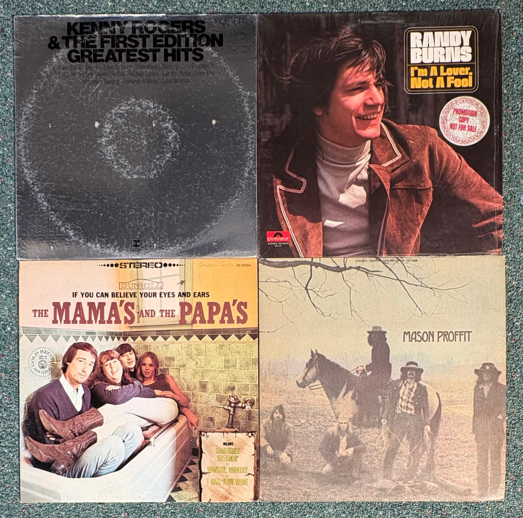 16 vintage vinyl LPs! Our client had eclectic taste and loved his albums - thus, most of these have been lovingly played over the years. We checked to make sure the correct album was in the correct cover and did a cursory glance for any egregious scratches. Some covers reflect heavy use and are worn/split in places/have names written on them. However, the majority are in good used shape. Artists/Bands in this lot include: Bob Dylan (2 albums) Sarah Vaughan Dan Fogelberg & Tim Weisberg Gordon Lightfoot Humble Pie Willie Nelson Jose Feliciano James Taylor Loggins & Messina Kenny Loggins Mark-Almond Kenny Rogers The Mamas & The Papas Mason Proffit Randy Burns Note: Loggins & Messina and one Dylan album missing inner sleeves