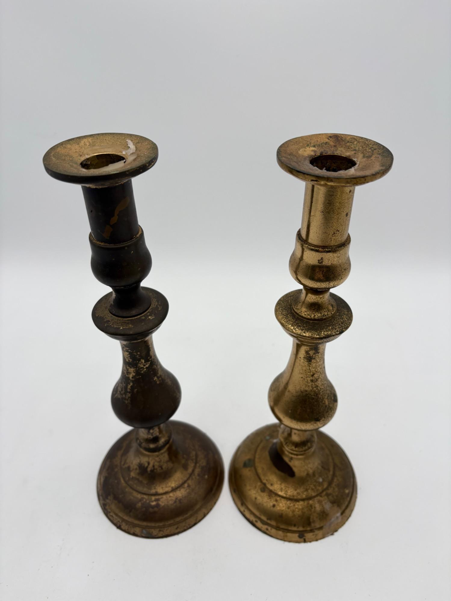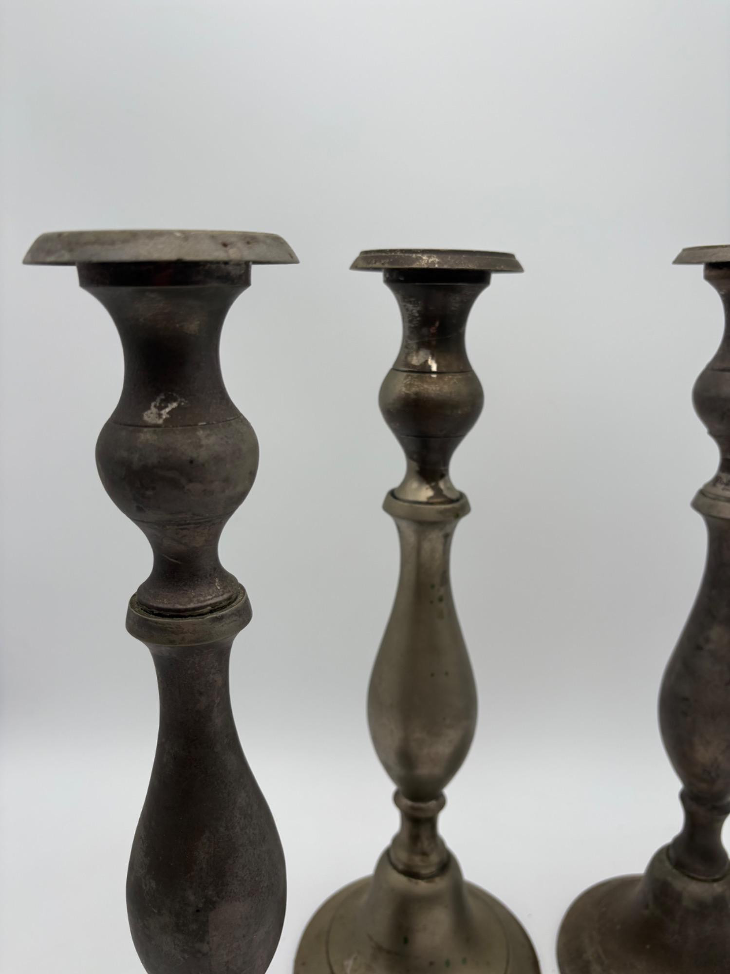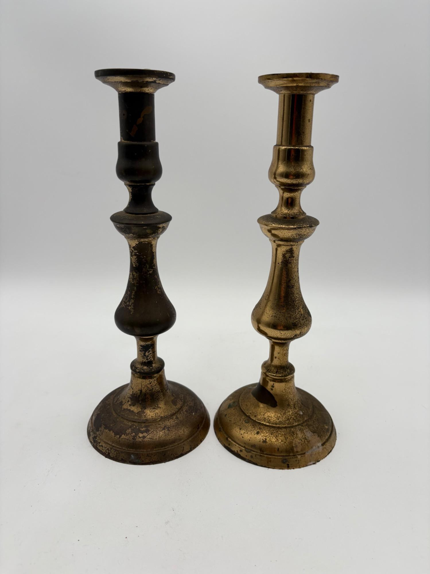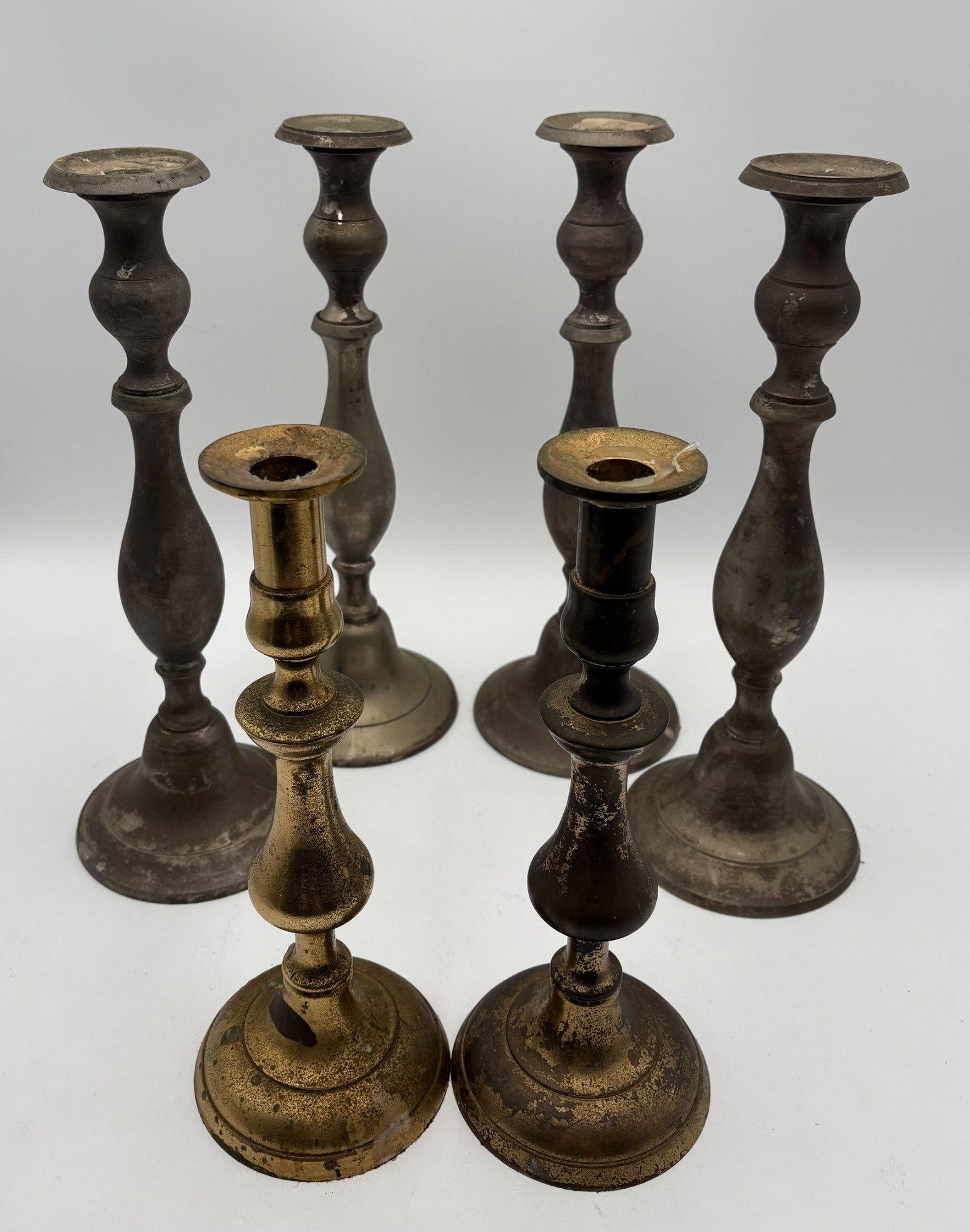 2 sets of vintage candlestick holders in metal. Taller set of 4 appears to be pewter, but we are unsure. They measure 14" H x 5" W at the base. Shorter set of 2 appears to be brass, but is heavily tarnished. They measure 11.5" H x 4.25" at the base. All could use some cleaning & TLC. See photos for maker/source.
