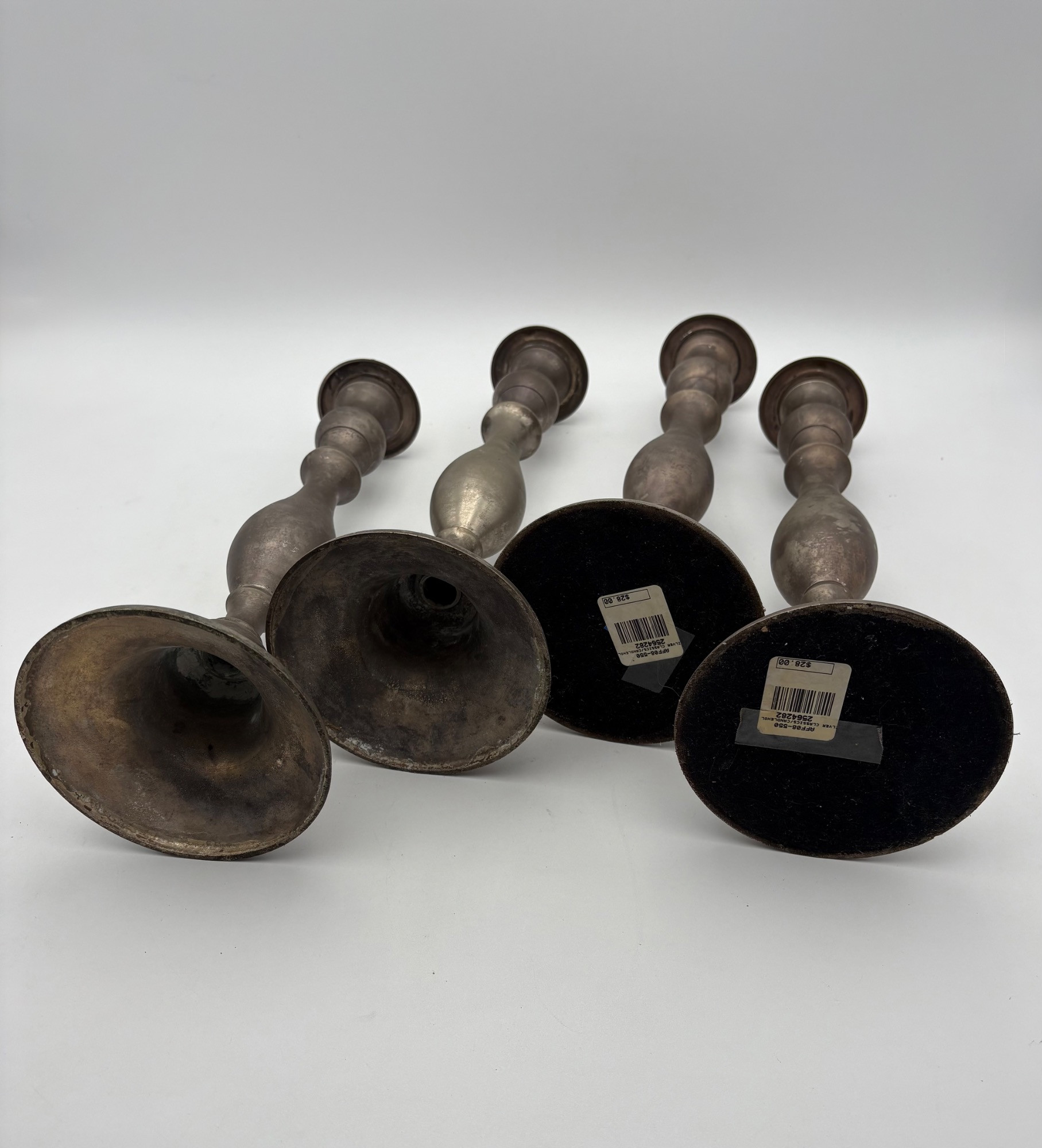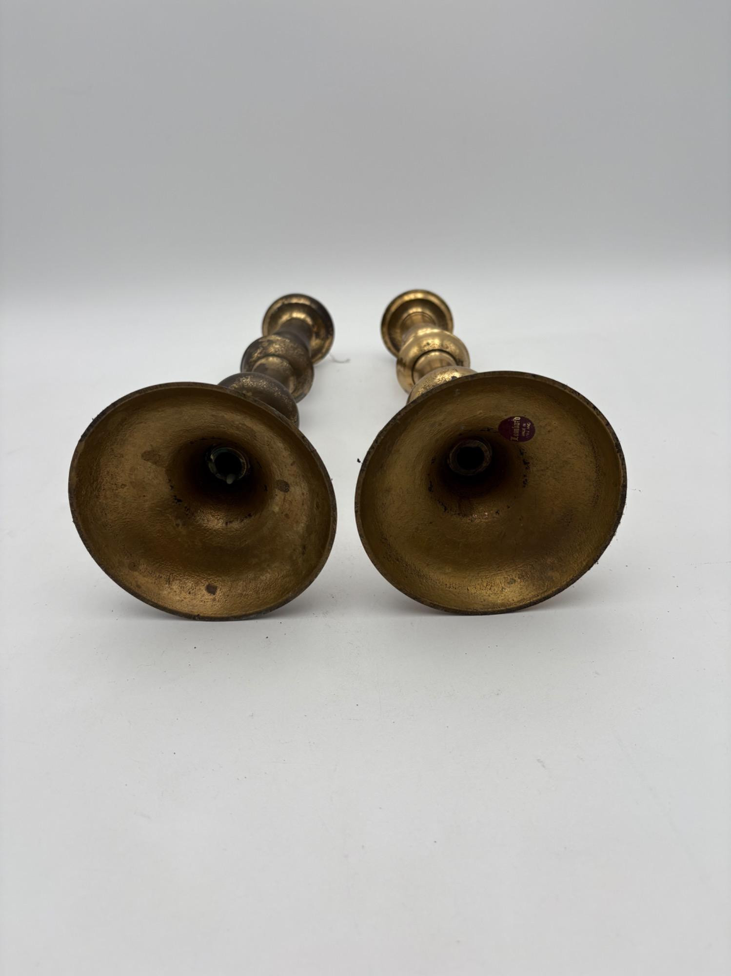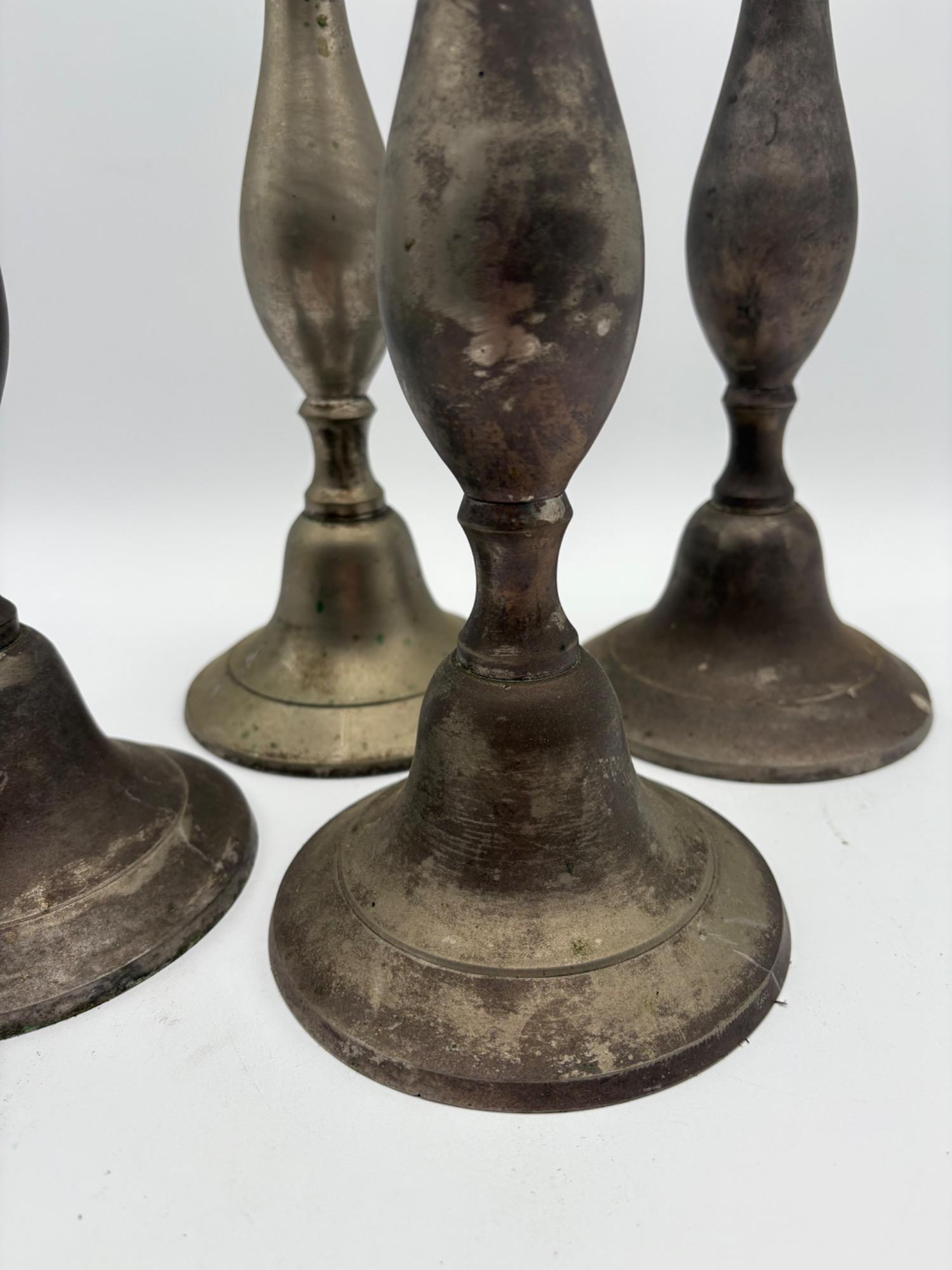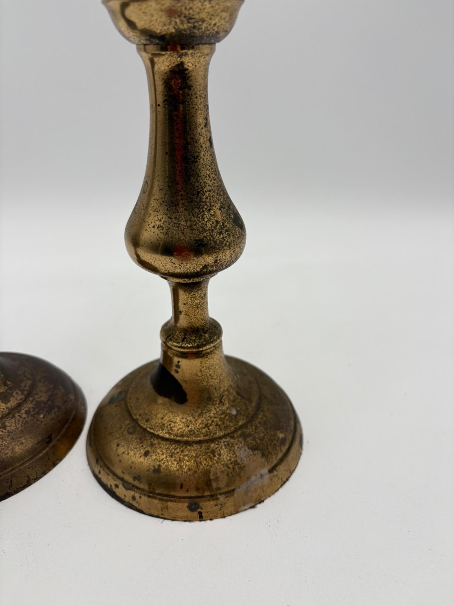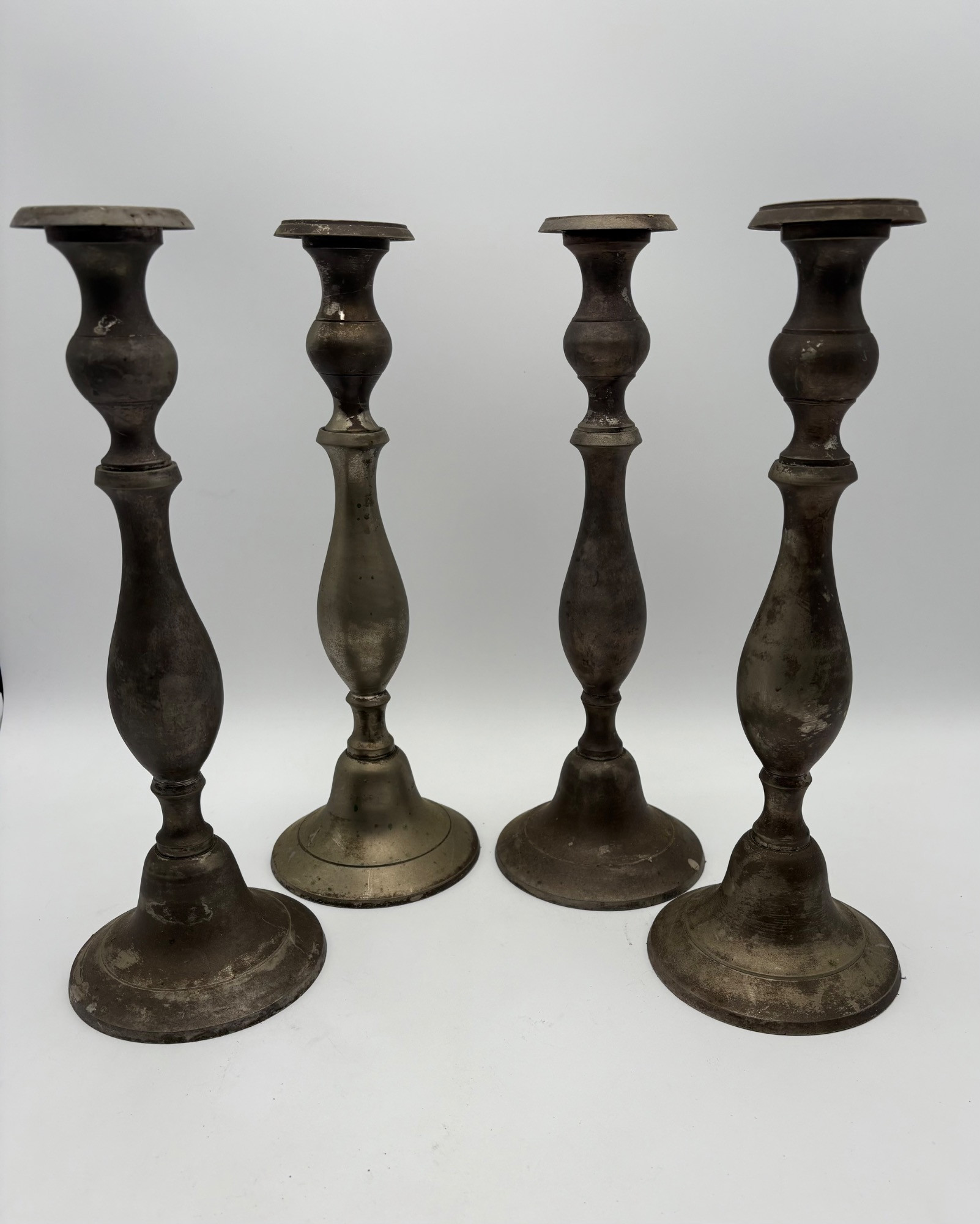 2 sets of vintage candlestick holders in metal. Taller set of 4 appears to be pewter, but we are unsure. They measure 14" H x 5" W at the base. Shorter set of 2 appears to be brass, but is heavily tarnished. They measure 11.5" H x 4.25" at the base. All could use some cleaning & TLC. See photos for maker/source.