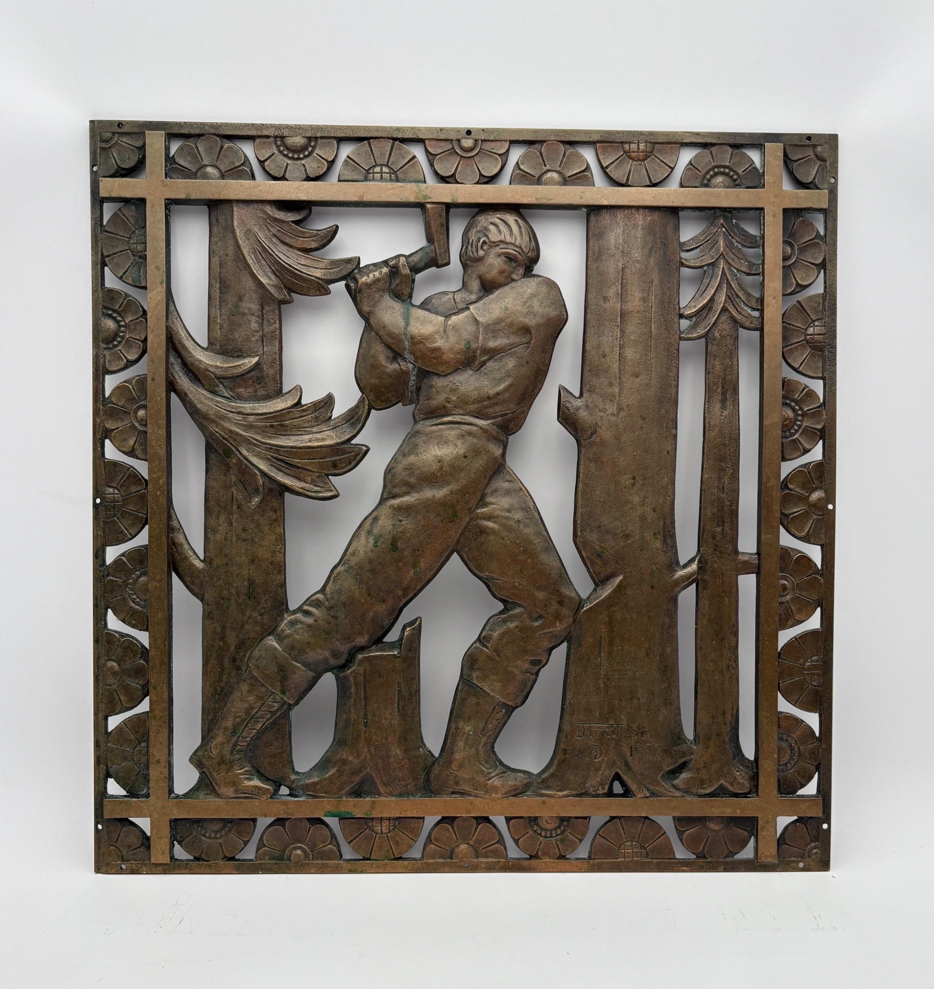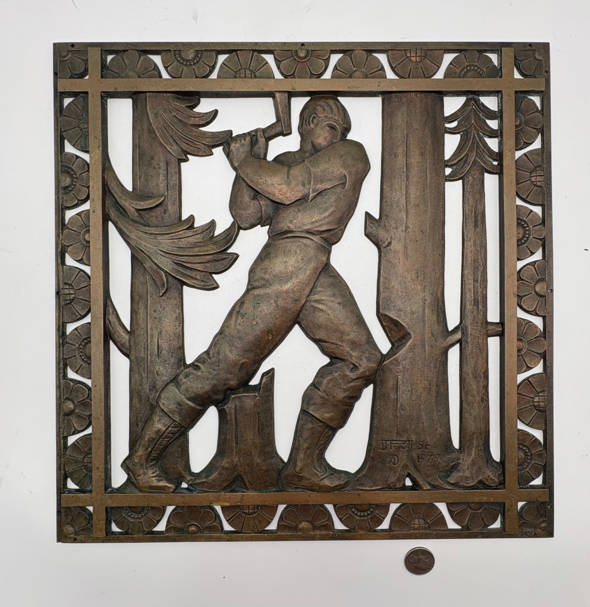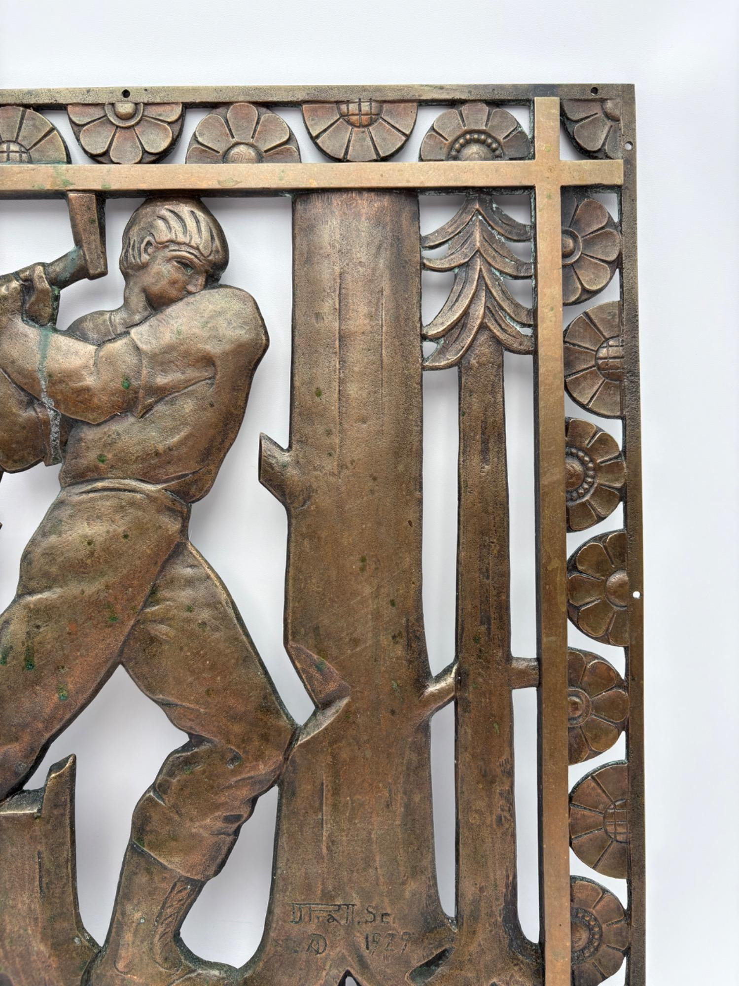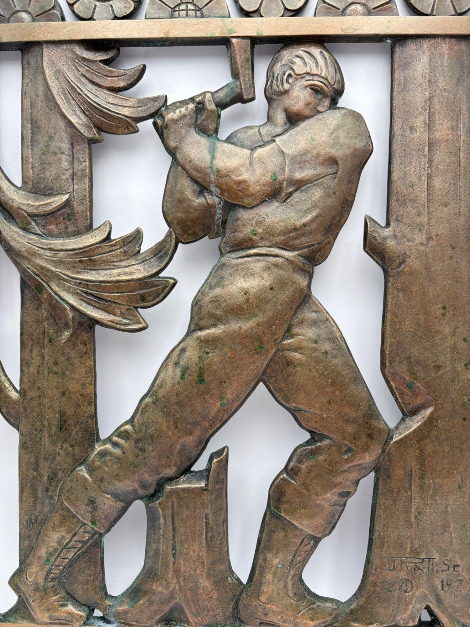 Beautiful antique metal (bronze?) low relief sculptural plaque of a lumberjack swinging his ax at a tree with floral border. Etched signature “D. Pratt 1929”. Slight green residue on metal (we think it's candle wax) that is easily removed. Really nice period craftsmanship.