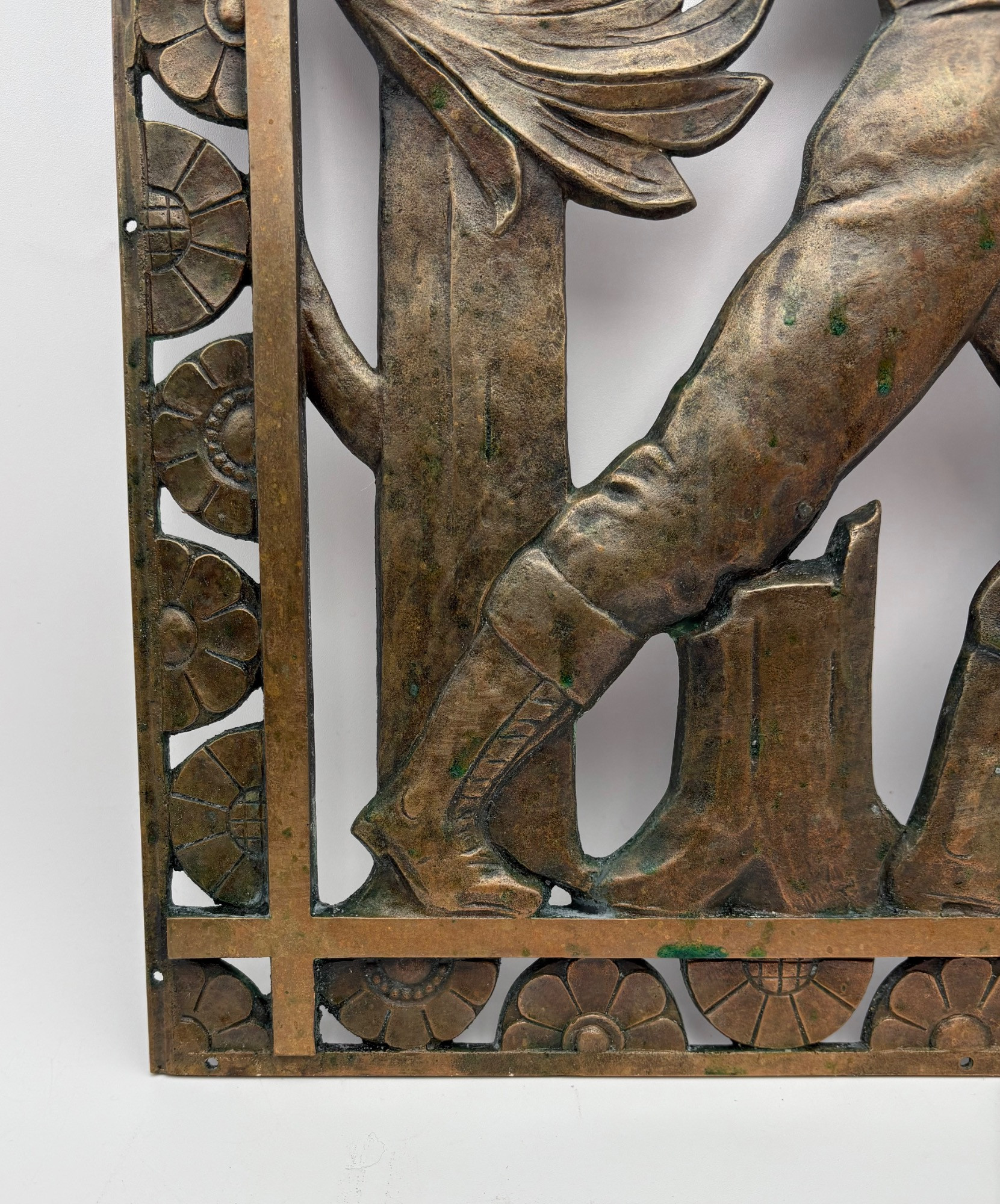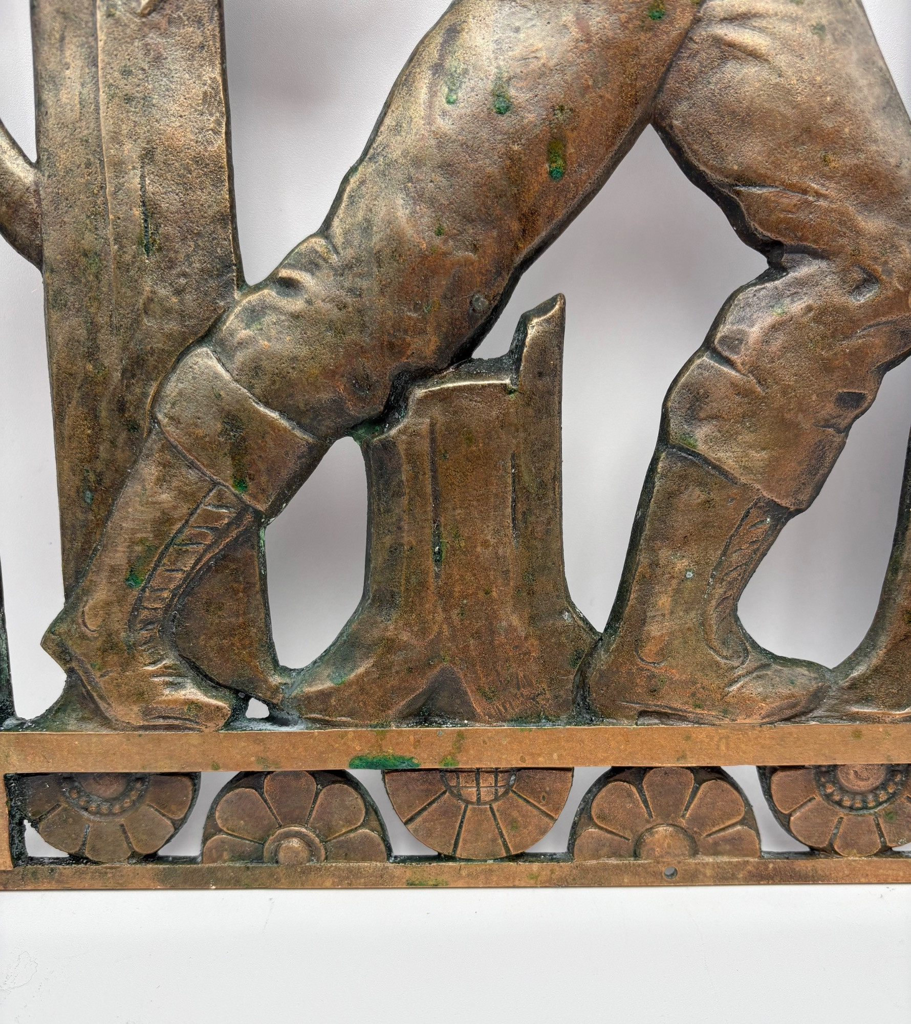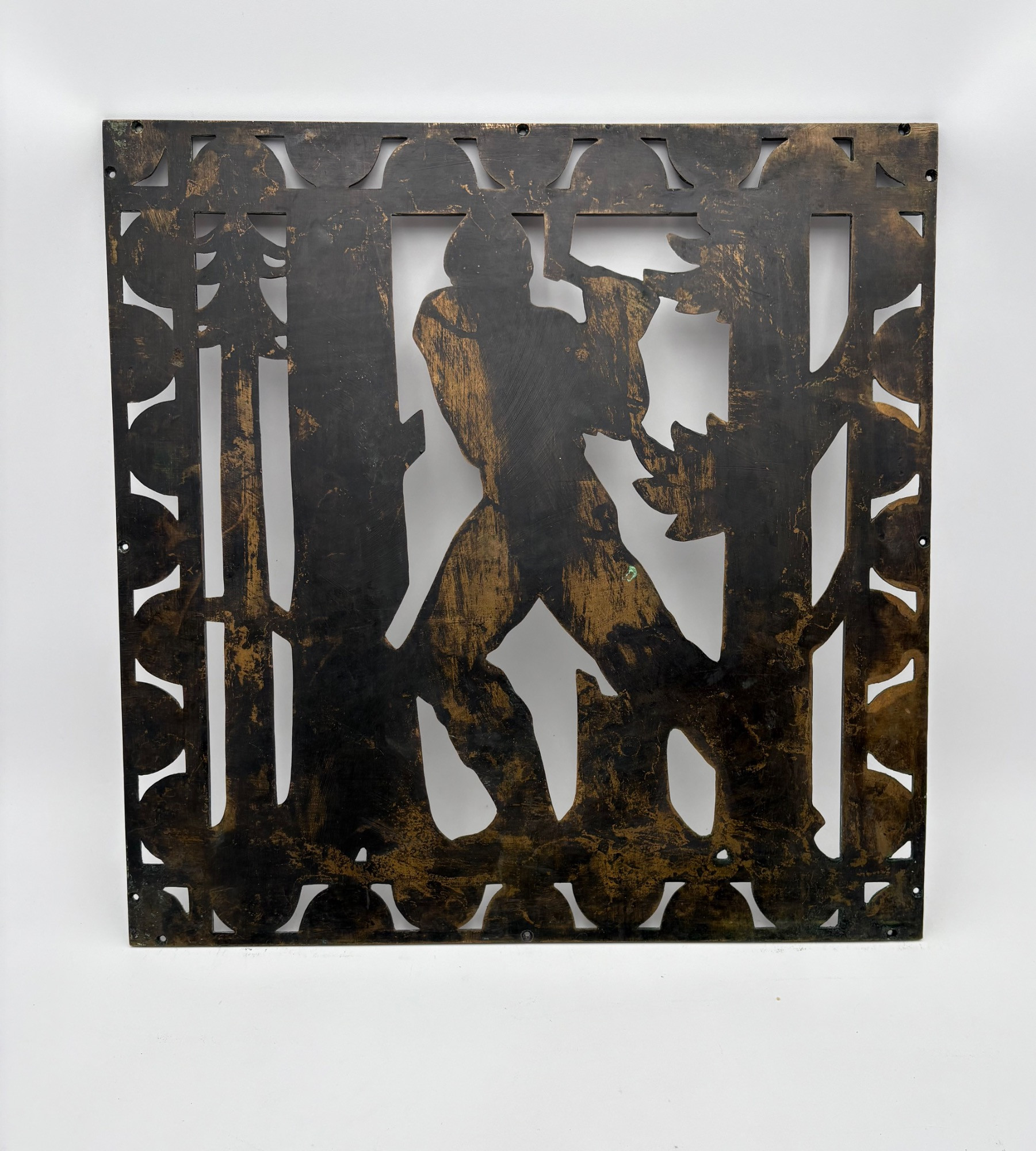 Beautiful antique metal (bronze?) low relief sculptural plaque of a lumberjack swinging his ax at a tree with floral border. Etched signature “D. Pratt 1929”. Slight green residue on metal (we think it's candle wax) that is easily removed. Really nice period craftsmanship.
