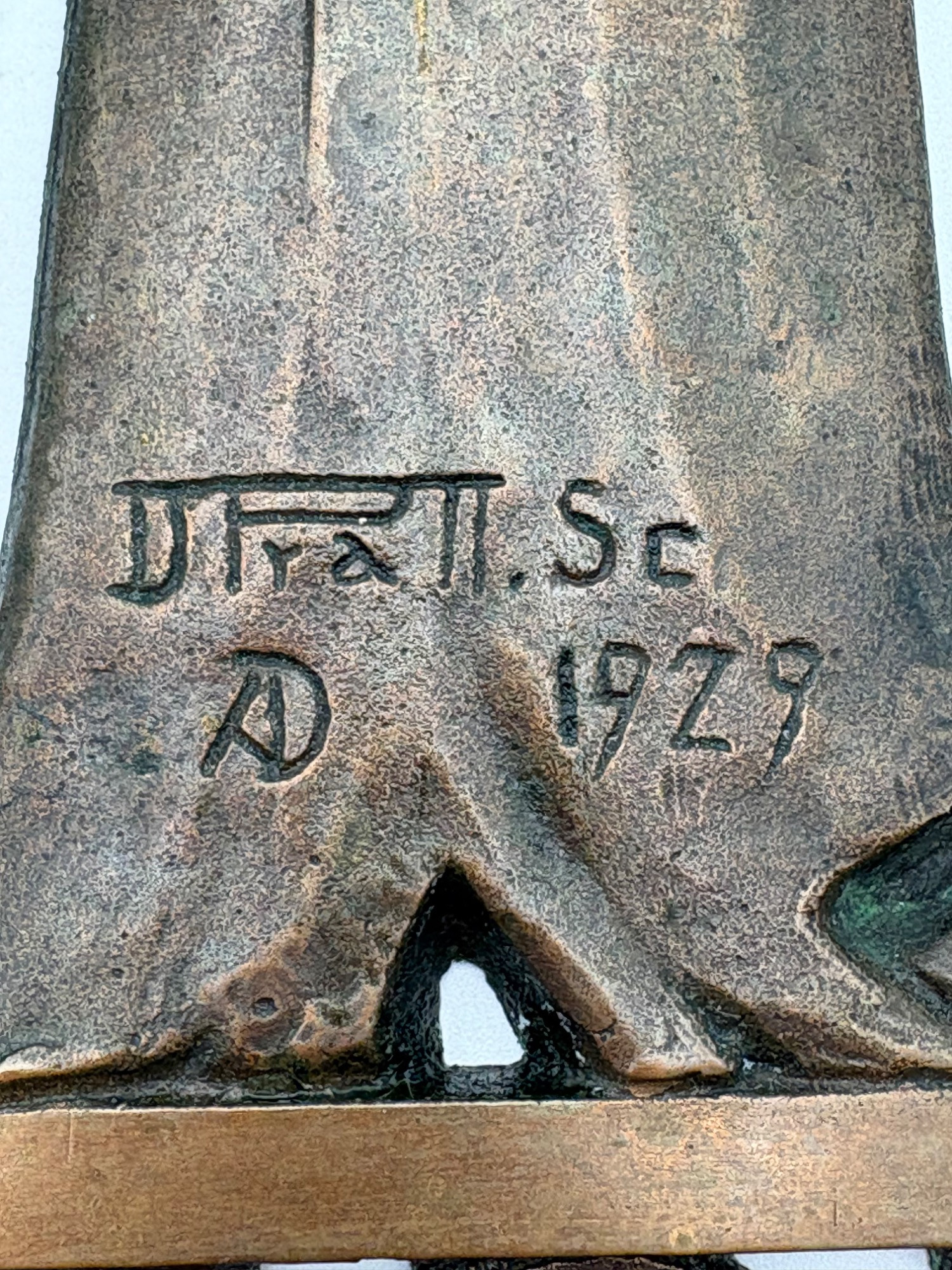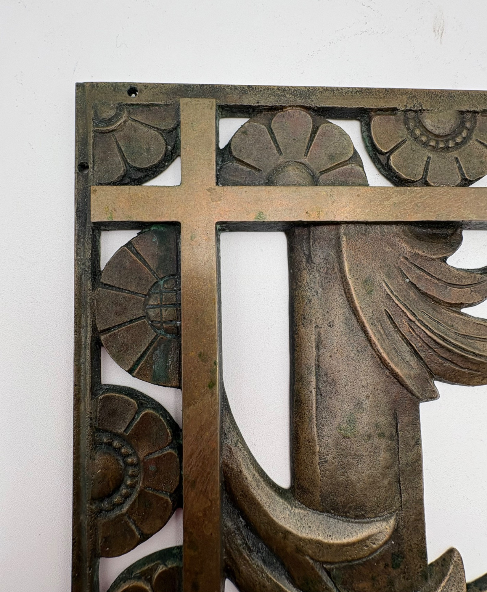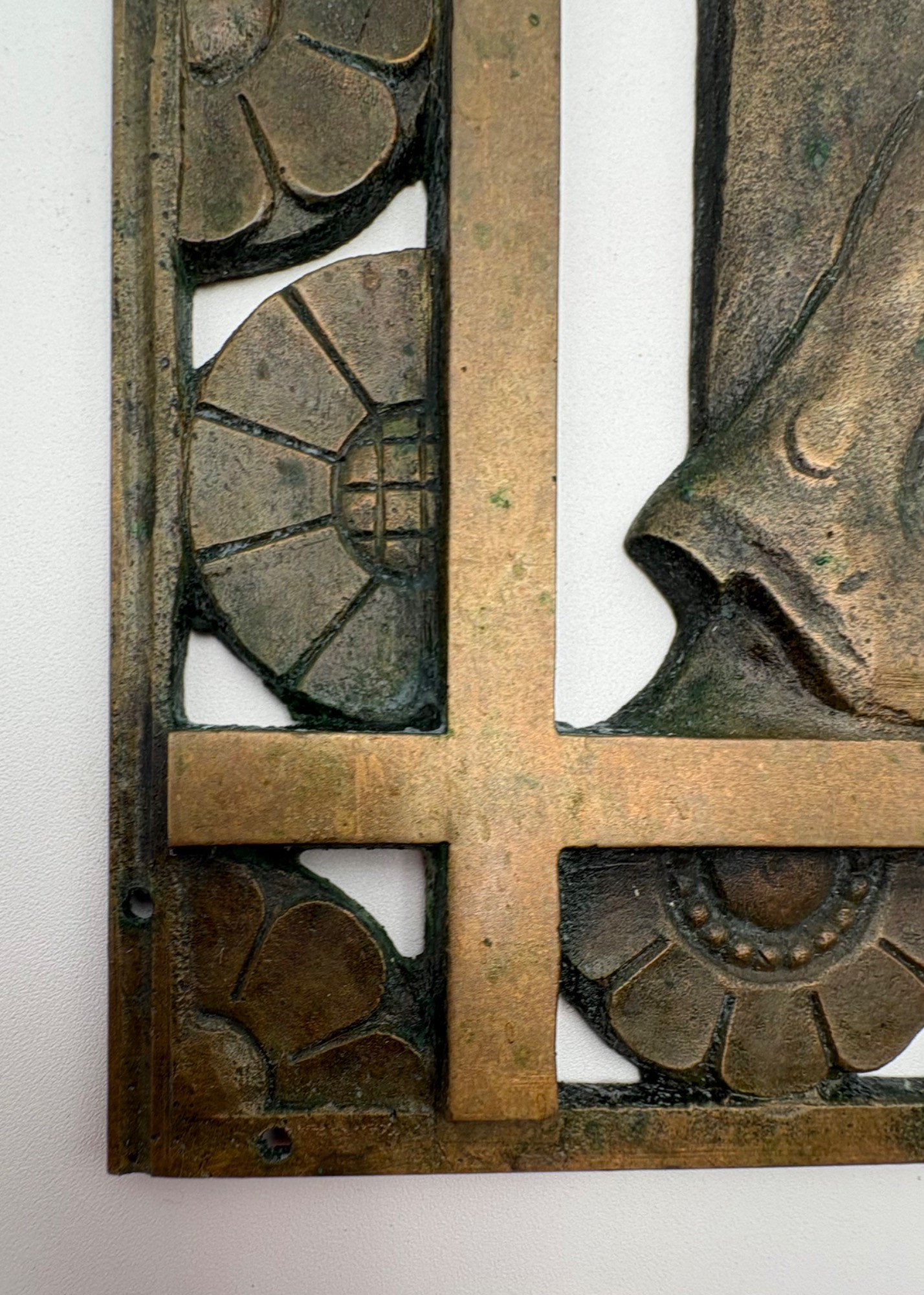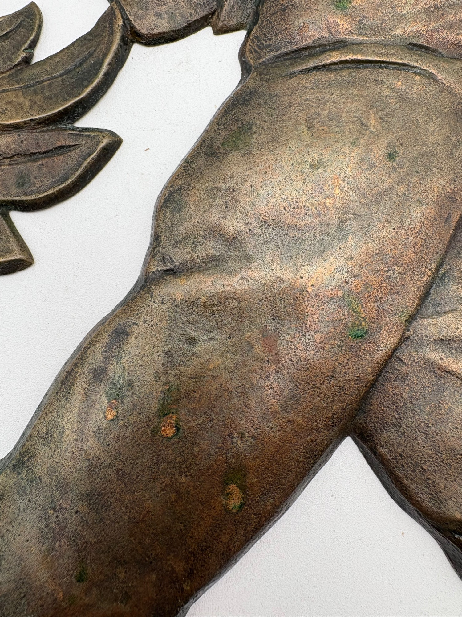 Beautiful antique metal (bronze?) low relief sculptural plaque of a lumberjack swinging his ax at a tree with floral border. Etched signature “D. Pratt 1929”. Slight green residue on metal (we think it's candle wax) that is easily removed. Really nice period craftsmanship.