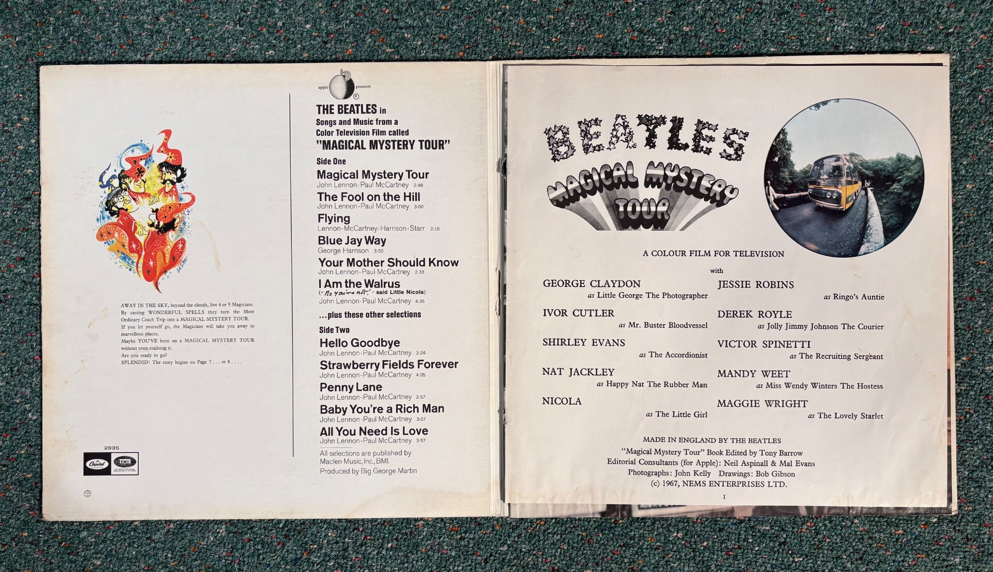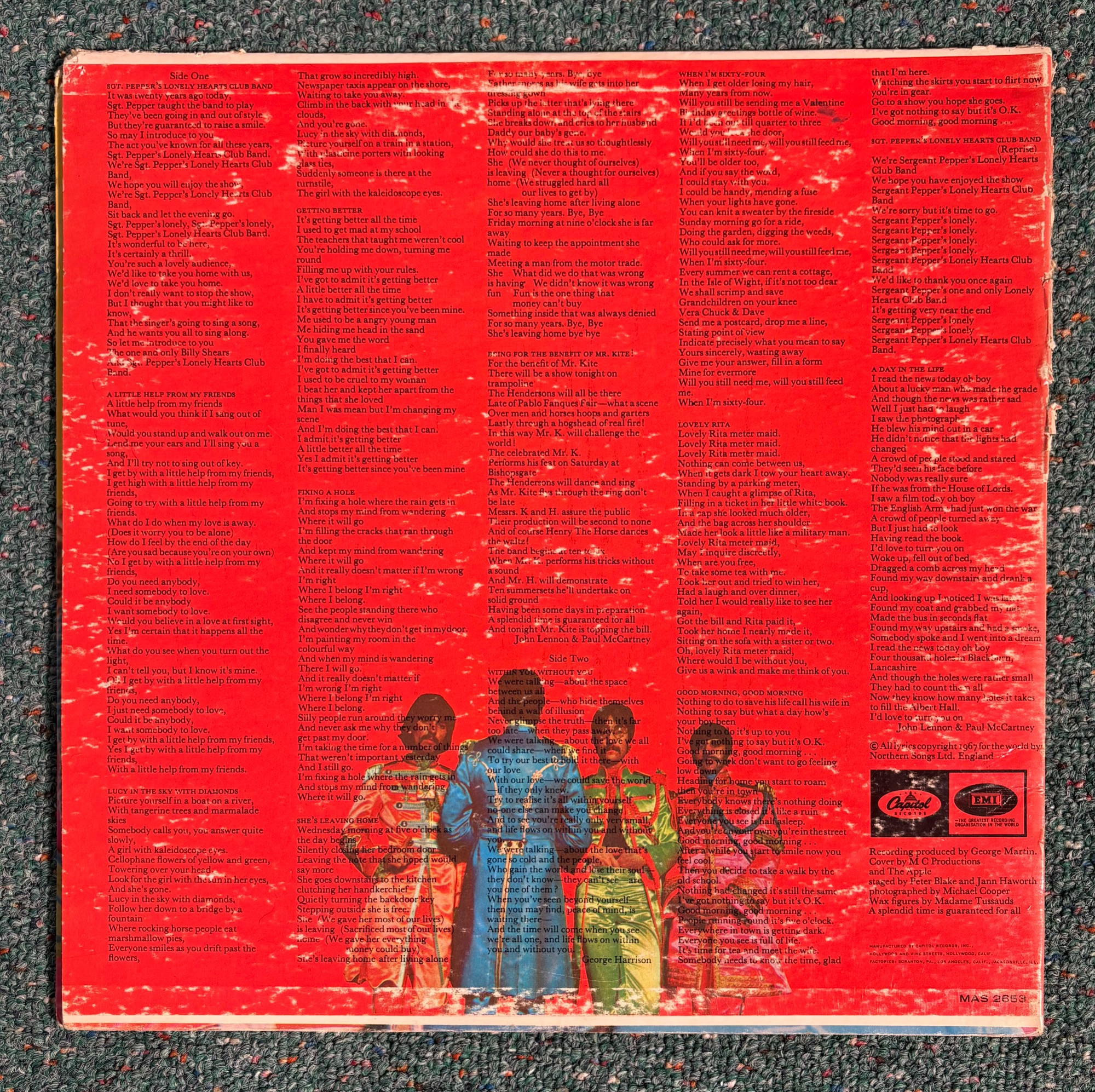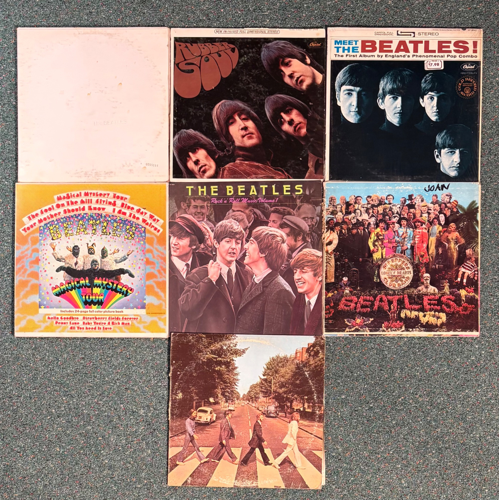 7 Beatles albums from various years. Our client had eclectic taste and loved his albums - thus, most of these have been lovingly played over the years. We checked to make sure the correct album was in the correct cover and did a cursory glance for any egregious scratches. Some covers reflect heavy use and are worn/split in places/have names written on them. However, the majority are in good used shape. Titles include: Abbey Road Sergeant Pepper’s Lonely Hearts Club Band The Beatles - Rock ‘n’ Roll Music Volume One Magical Mystery Tour (booklet inside is detached from the cover - see photo) Meet The Beatles Rubber Soul The White Album