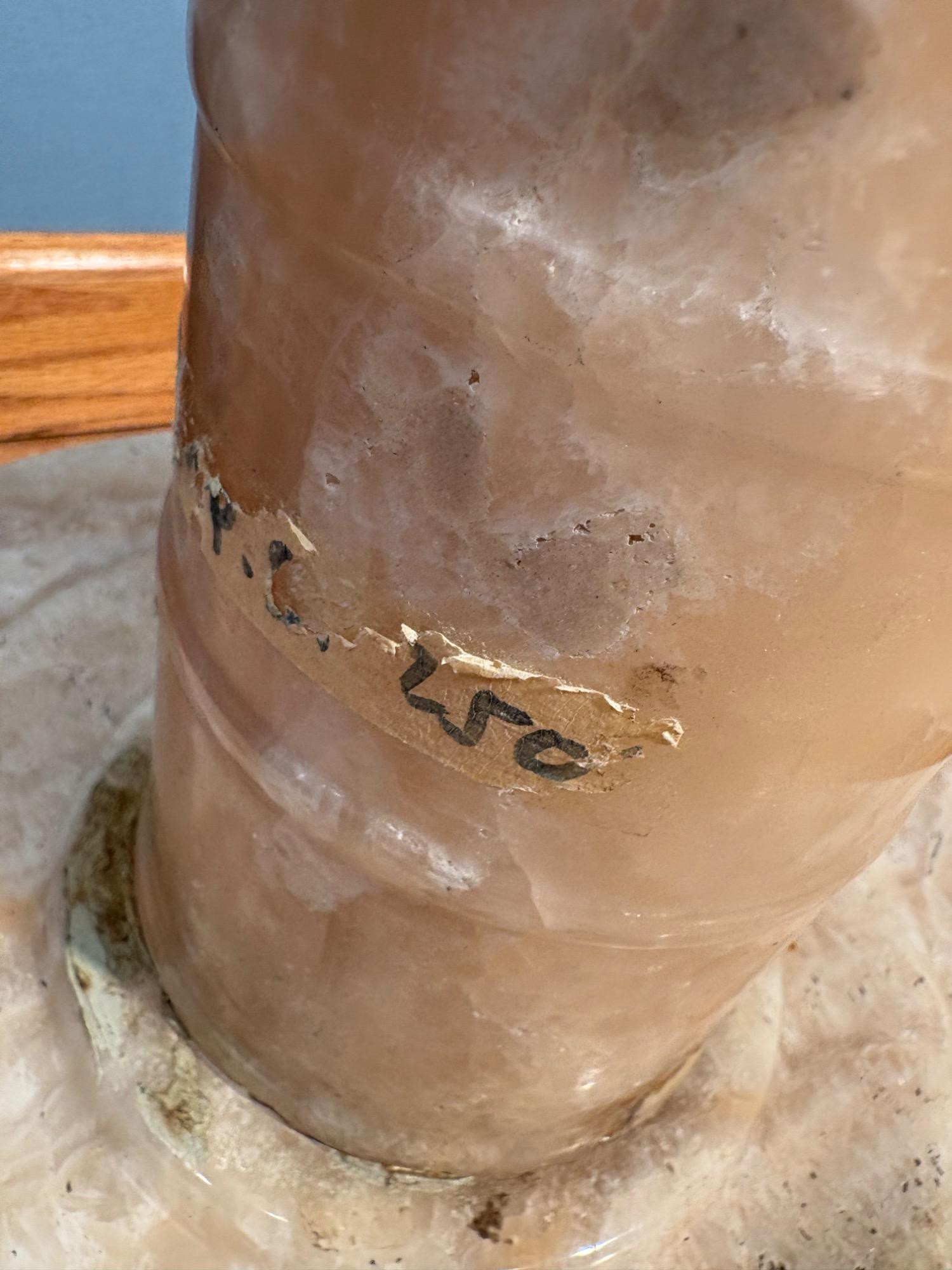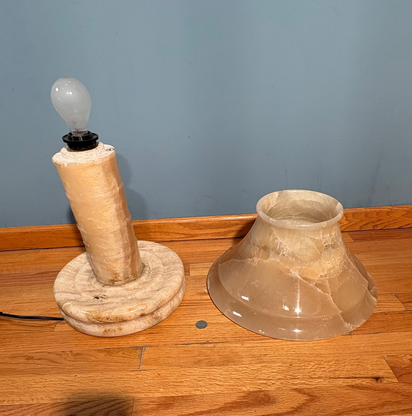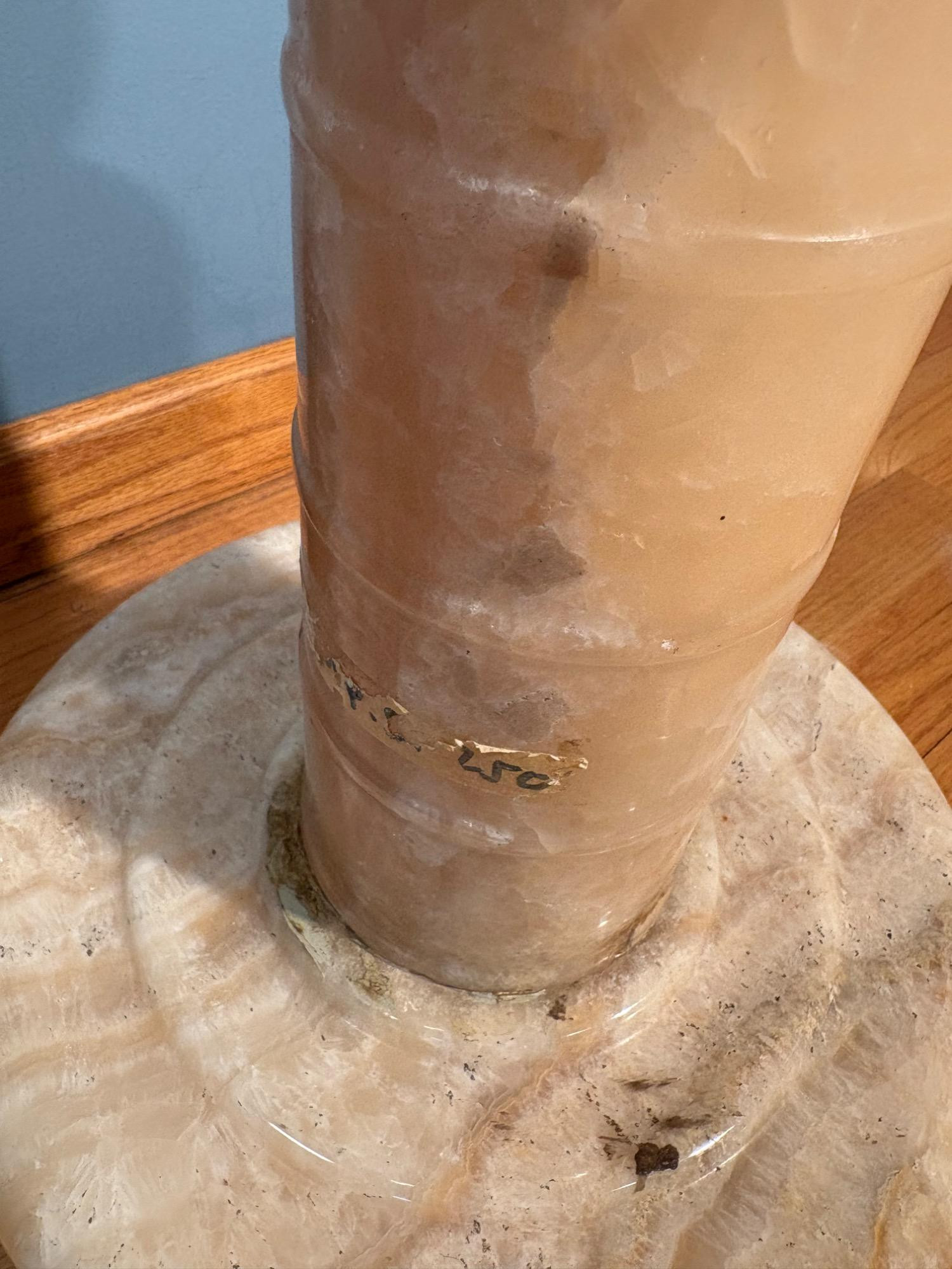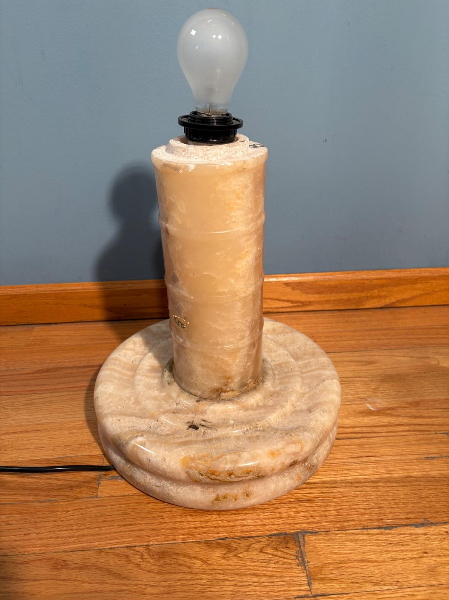 It's a good thing this marble lamp comes apart in 2 pieces or the average person could never lift it up! It is incredibly heavy and thus, extremely stable at the bedside. Beautiful soft glow through the rock with light going up to create a soft mood. Base & shaft measure approx. 15" H. Shade measures just over 15" at its widest by 8" H, so total height is approx. 23". 9' black cord with on/off a switch & double-prong plug. Note: this lamp appears to have been repaired at one time - there is some glue residue where the shaft meets the base and a masking tape label that needs to be removed. The cord is also wrapped with electrical tape in one section. See last 3 photos for details. Note - Matching lamp in Lot #99.