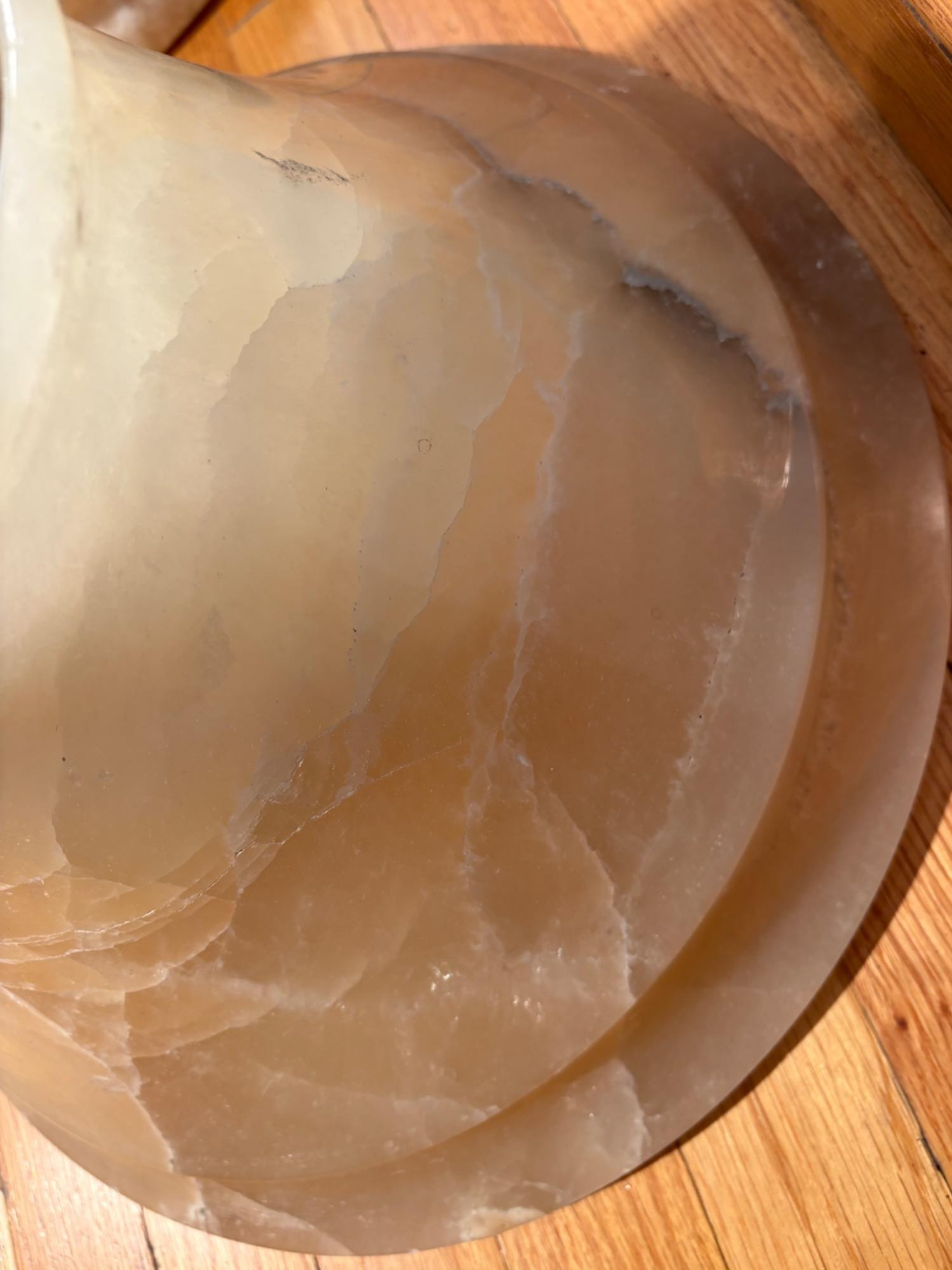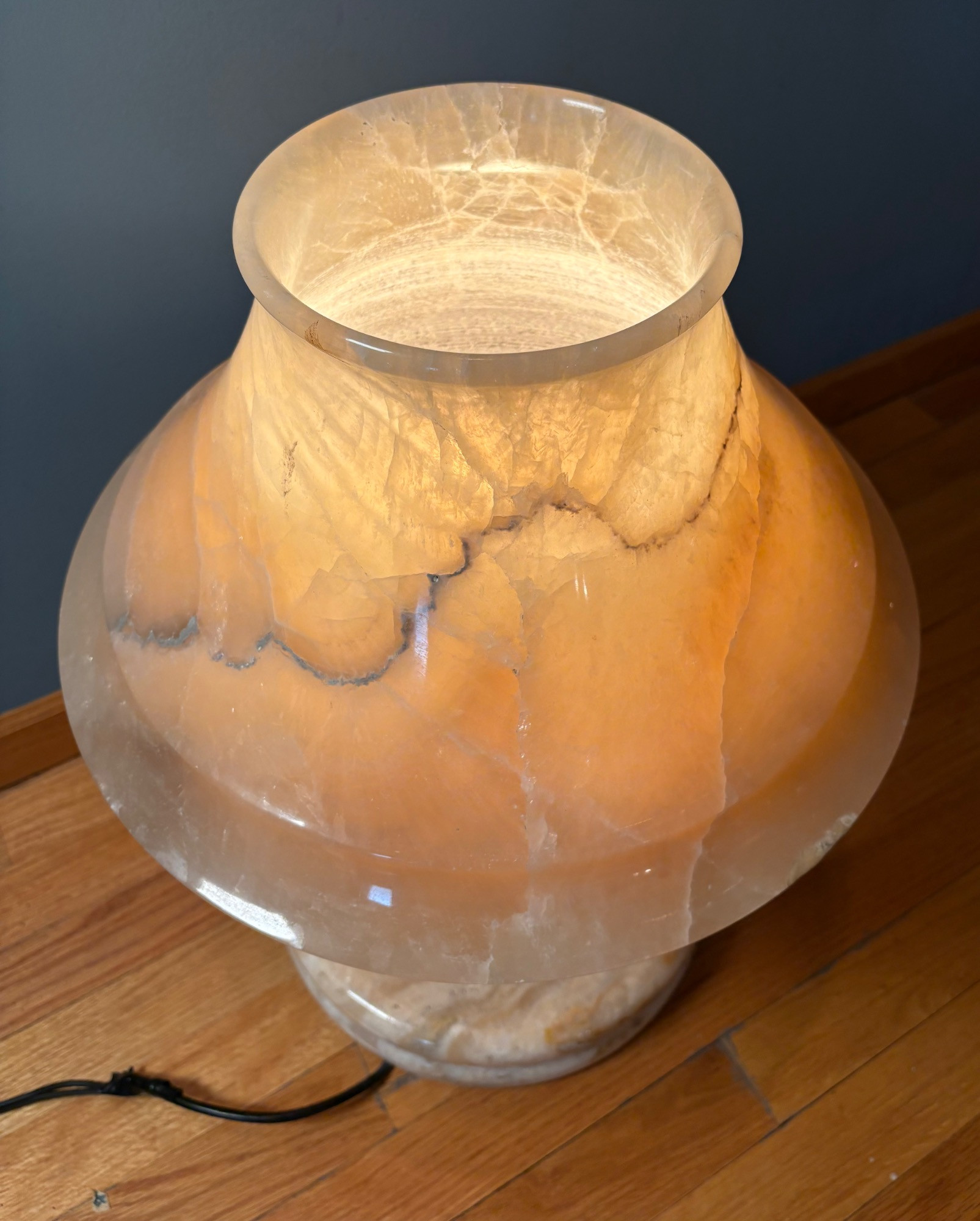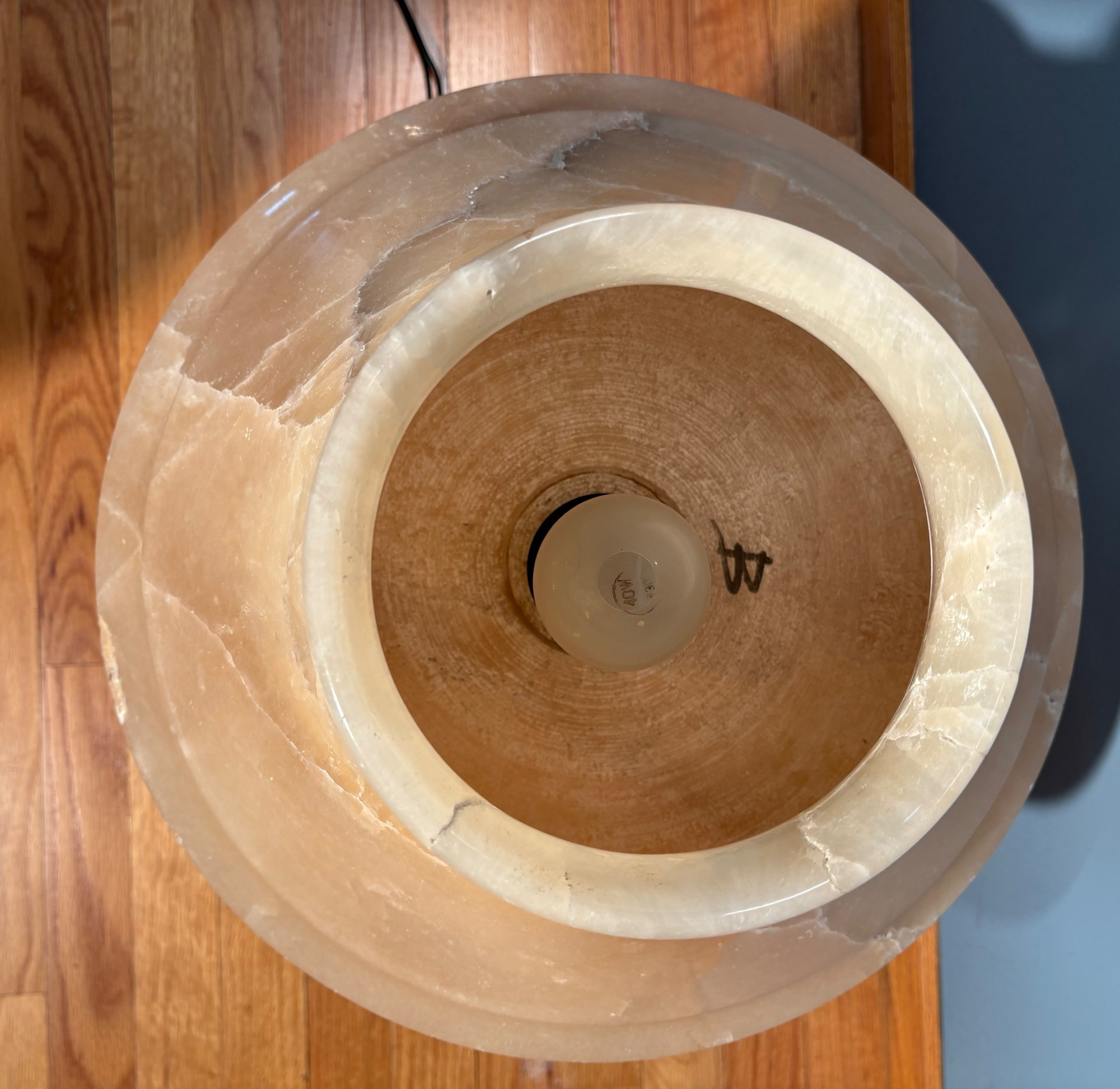 It's a good thing this marble lamp comes apart in 2 pieces or the average person could never lift it up! It is incredibly heavy and thus, extremely stable at the bedside. Beautiful soft glow through the rock with light going up to create a soft mood. Base & shaft measure approx. 15" H. Shade measures just over 15" at its widest by 8" H, so total height is approx. 23". 9' black cord with on/off a switch & double-prong plug. Note: this lamp appears to have been repaired at one time - there is some glue residue where the shaft meets the base and a masking tape label that needs to be removed. The cord is also wrapped with electrical tape in one section. See last 3 photos for details. Note - Matching lamp in Lot #99.