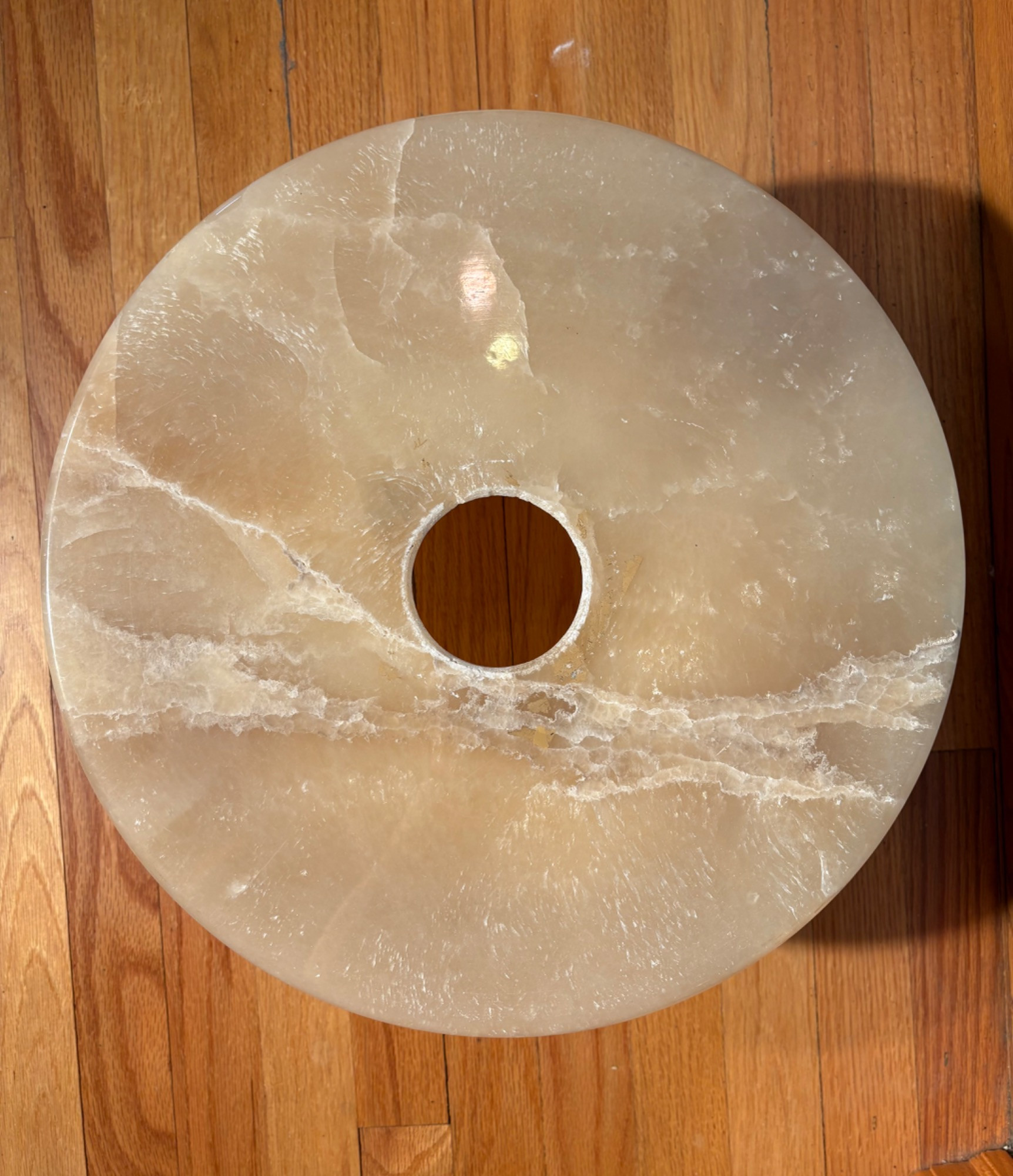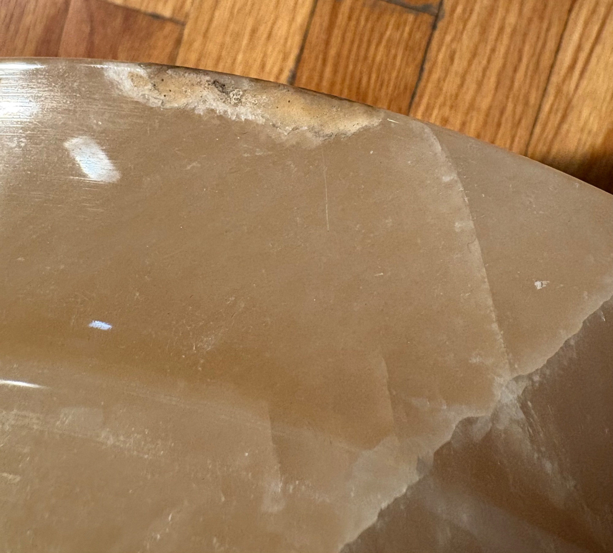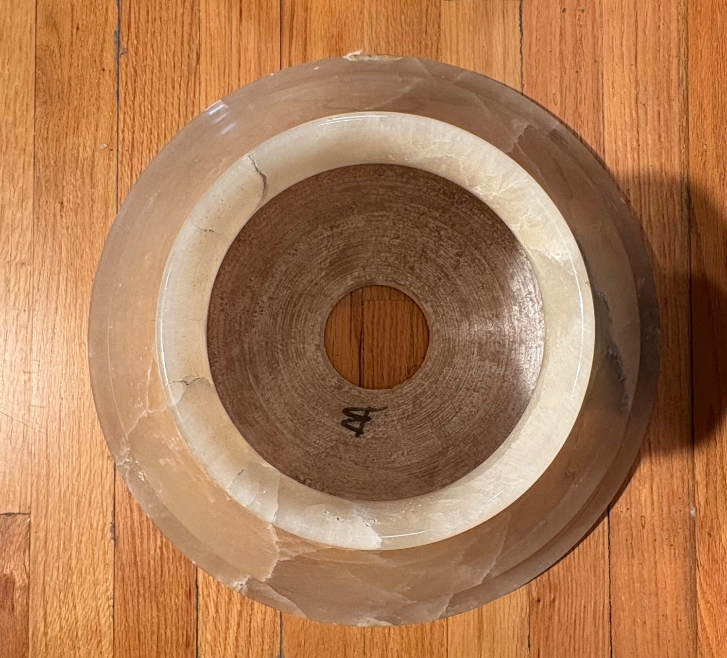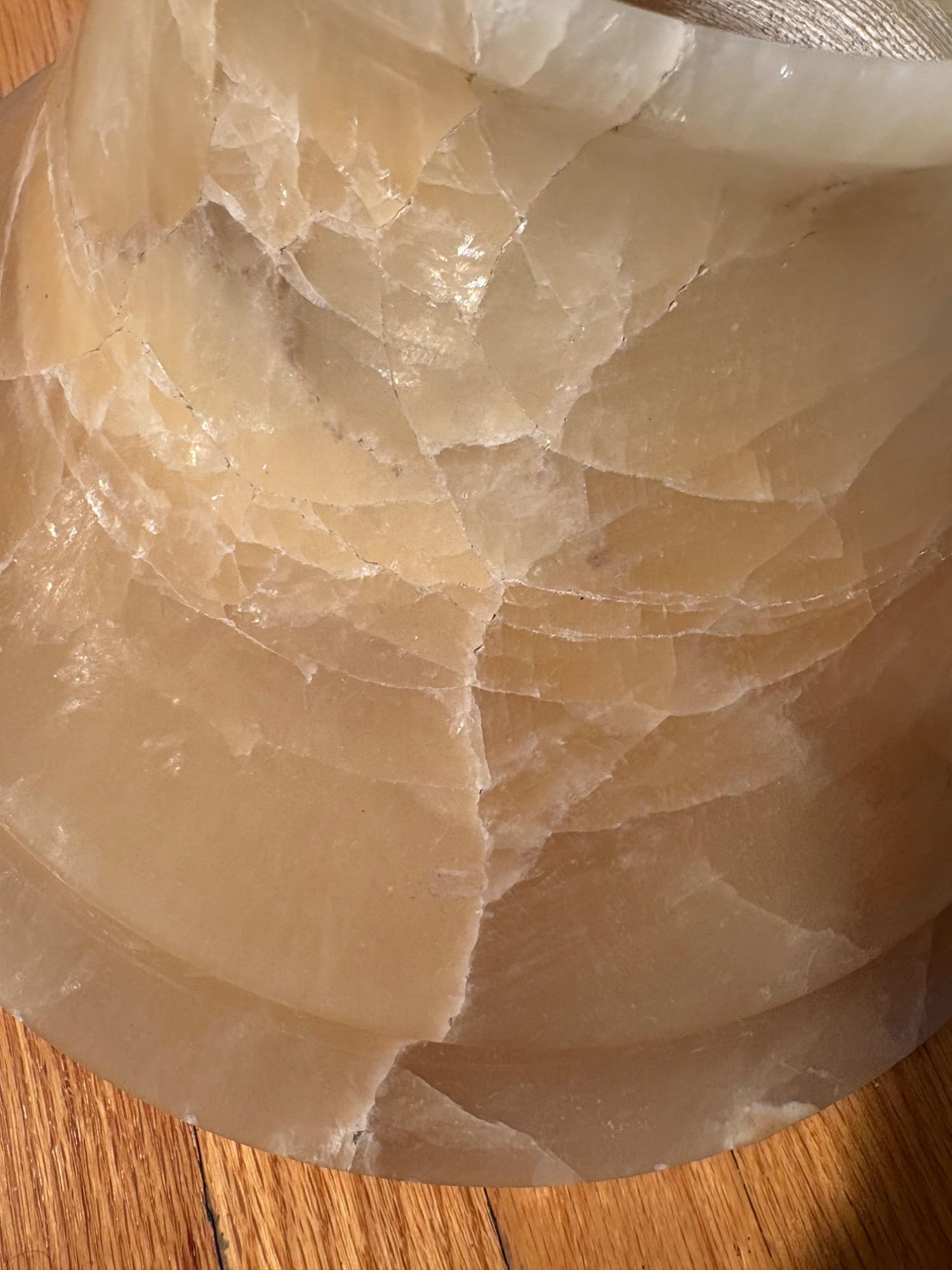 It's a good thing this marble lamp comes apart in 2 pieces or the average person could never lift it up! It is incredibly heavy and thus, extremely stable at the bedside. Beautiful soft glow through the rock with light going up to create a soft mood. Base & shaft measure approx. 15" H. Shade measures just over 15" at its widest by 8" H, so total height is approx. 23". 9' black cord with on/off a switch & double-prong plug. Note: this lamp appears to have been repaired at one time - there is some glue residue where the shaft meets the base and a masking tape label that needs to be removed. The cord is also wrapped with electrical tape in one section. See last 3 photos for details. Note - Matching lamp in Lot #99.
