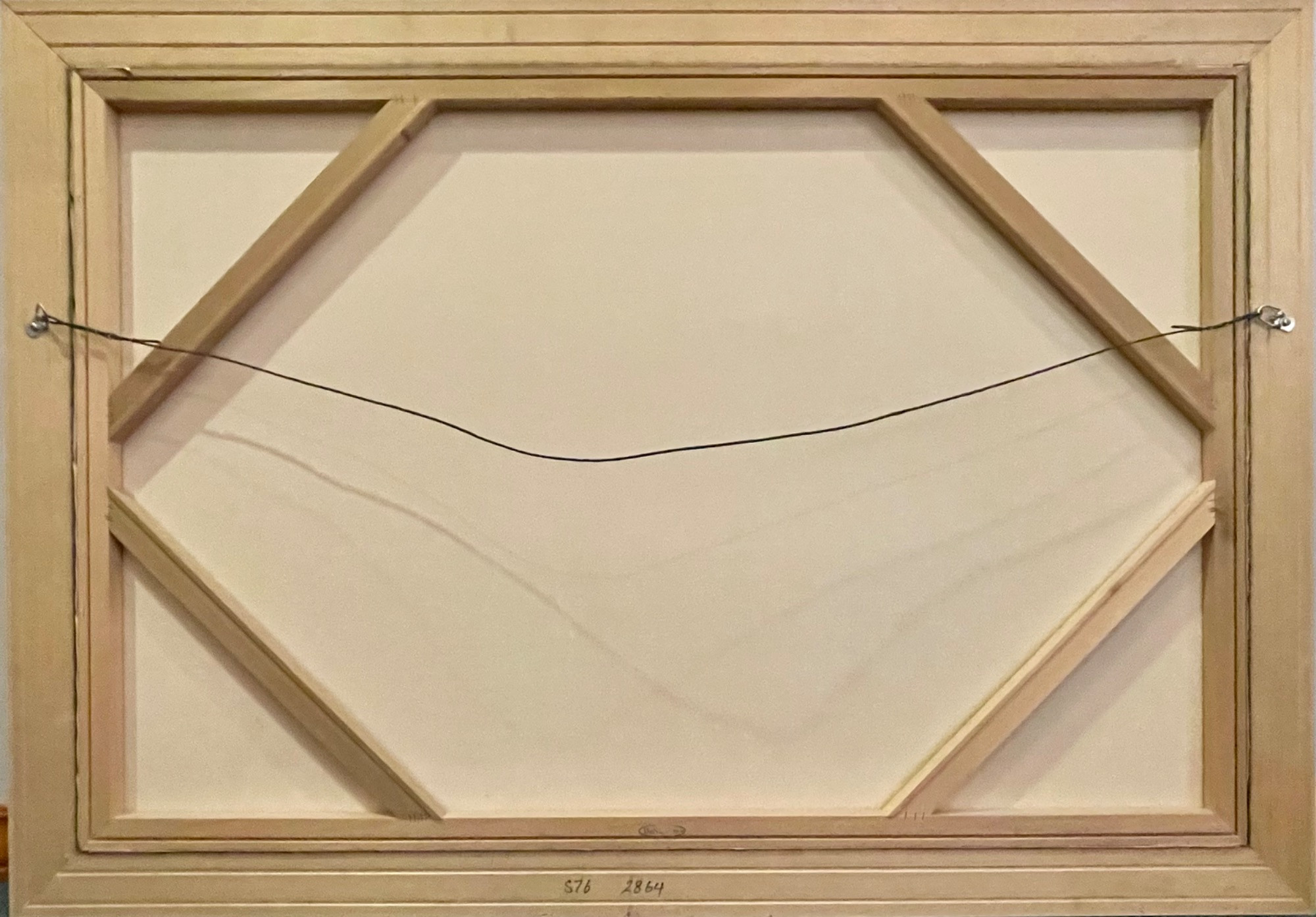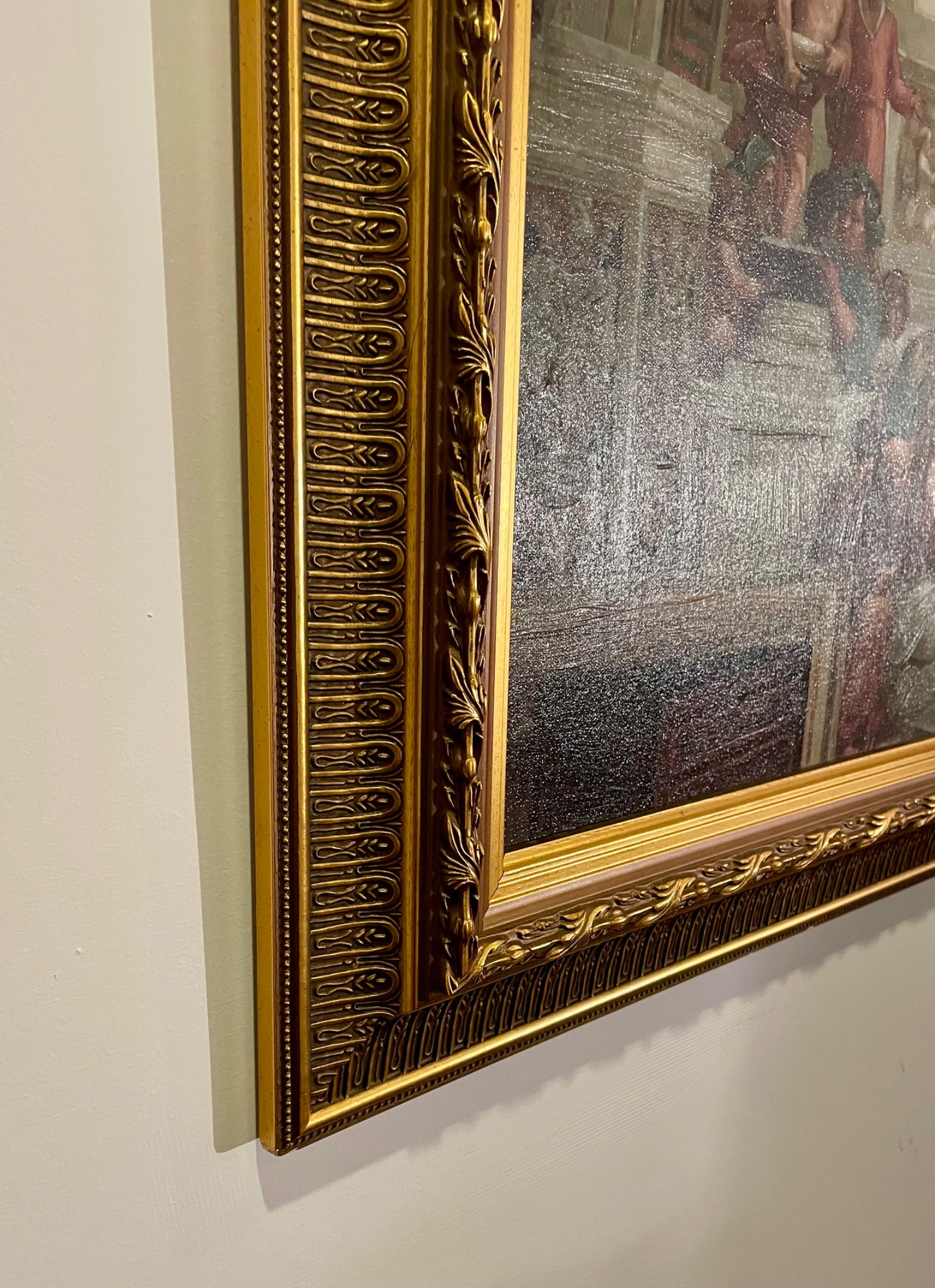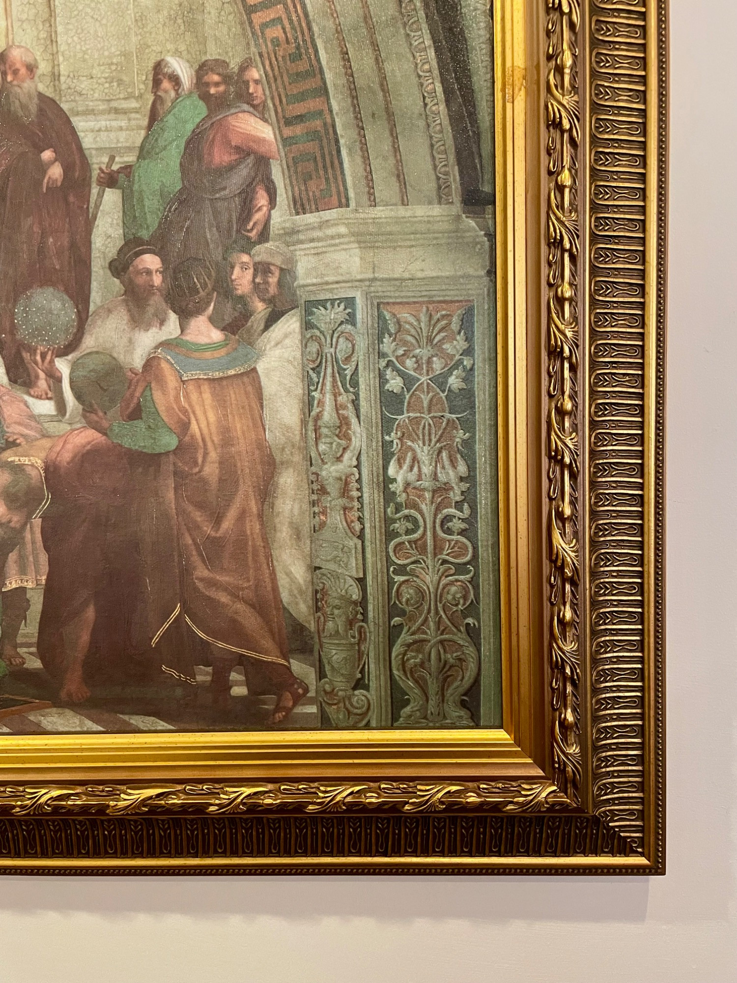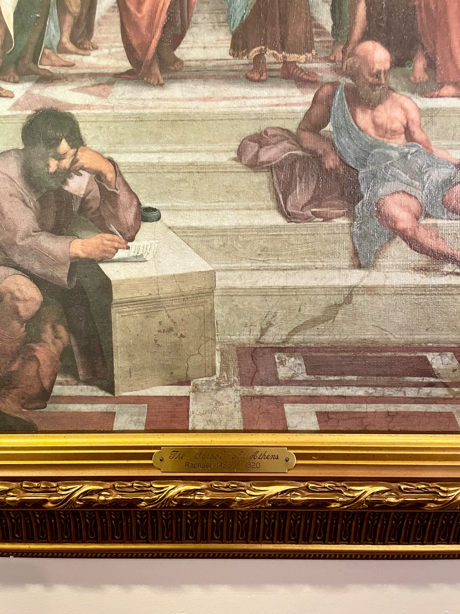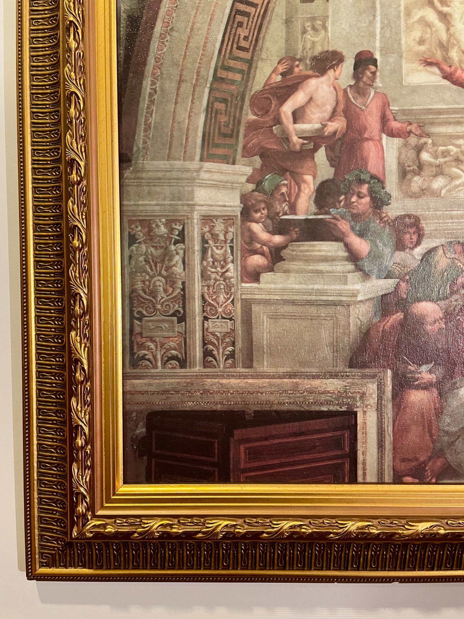 “The School of Athens” by Raphael Sanzio da Urbino, aka Raphael (1483 - 1520). Reproduction painting on canvas. Note: the original this piece reproduces was a fresco, thus the lighter more pale paint hues typical of the medium. Surrounded in a gold wood frame. This is quite a large piece at about 3' high x 4' wide framed. We are usure of the origin of this reproduction - given the image/frame, we think it might have been from Around the Corner Art but are not certain.