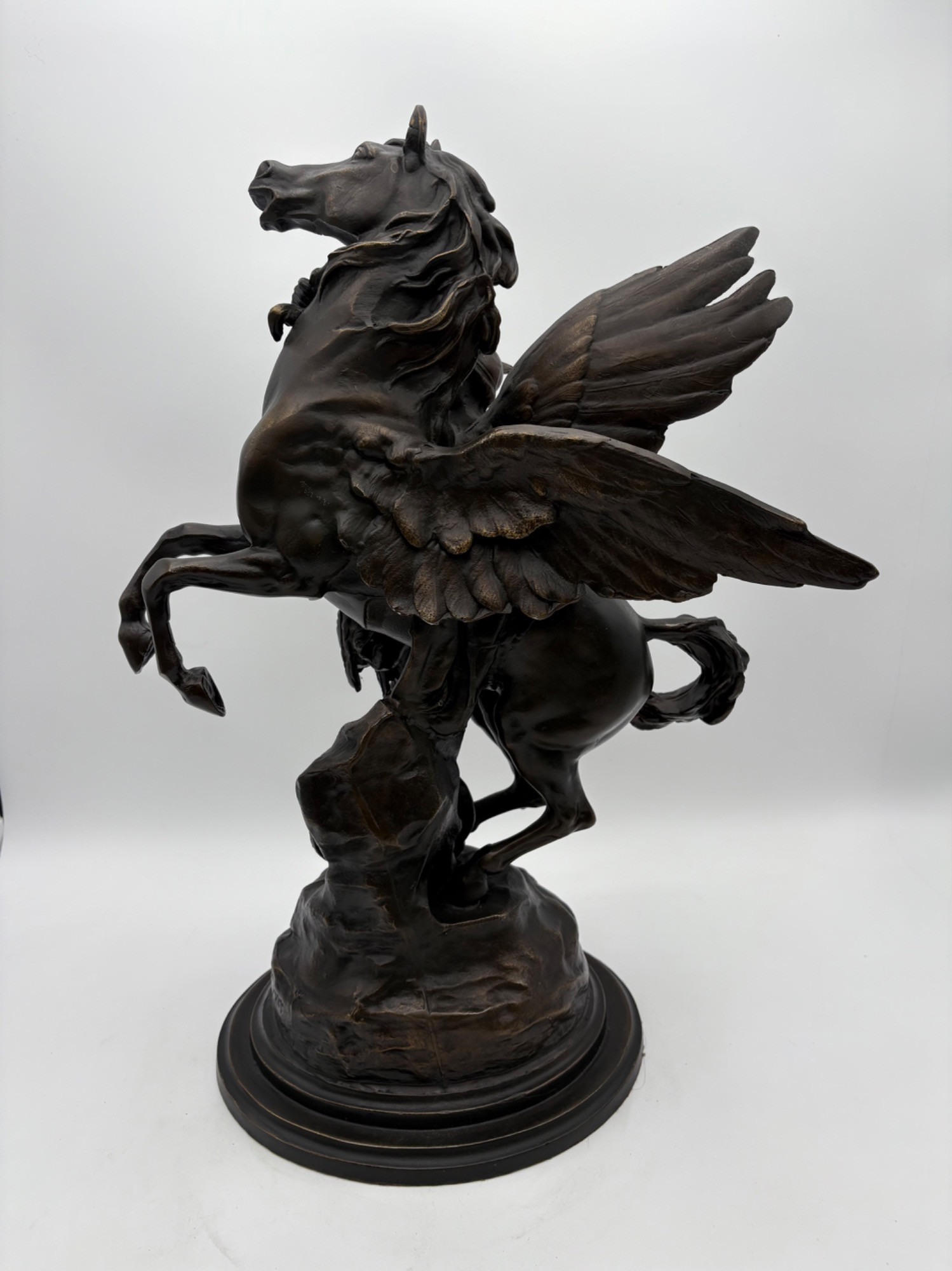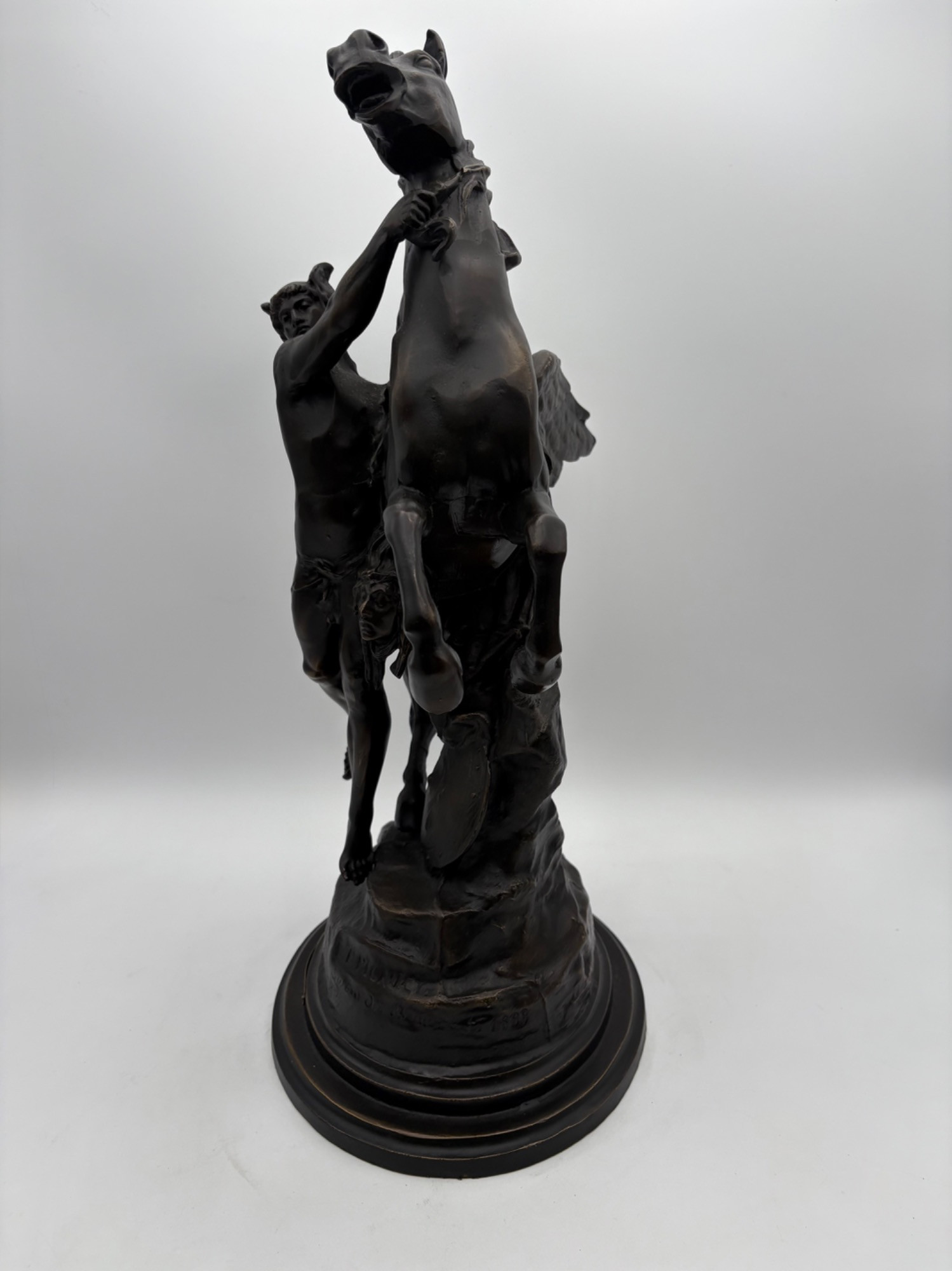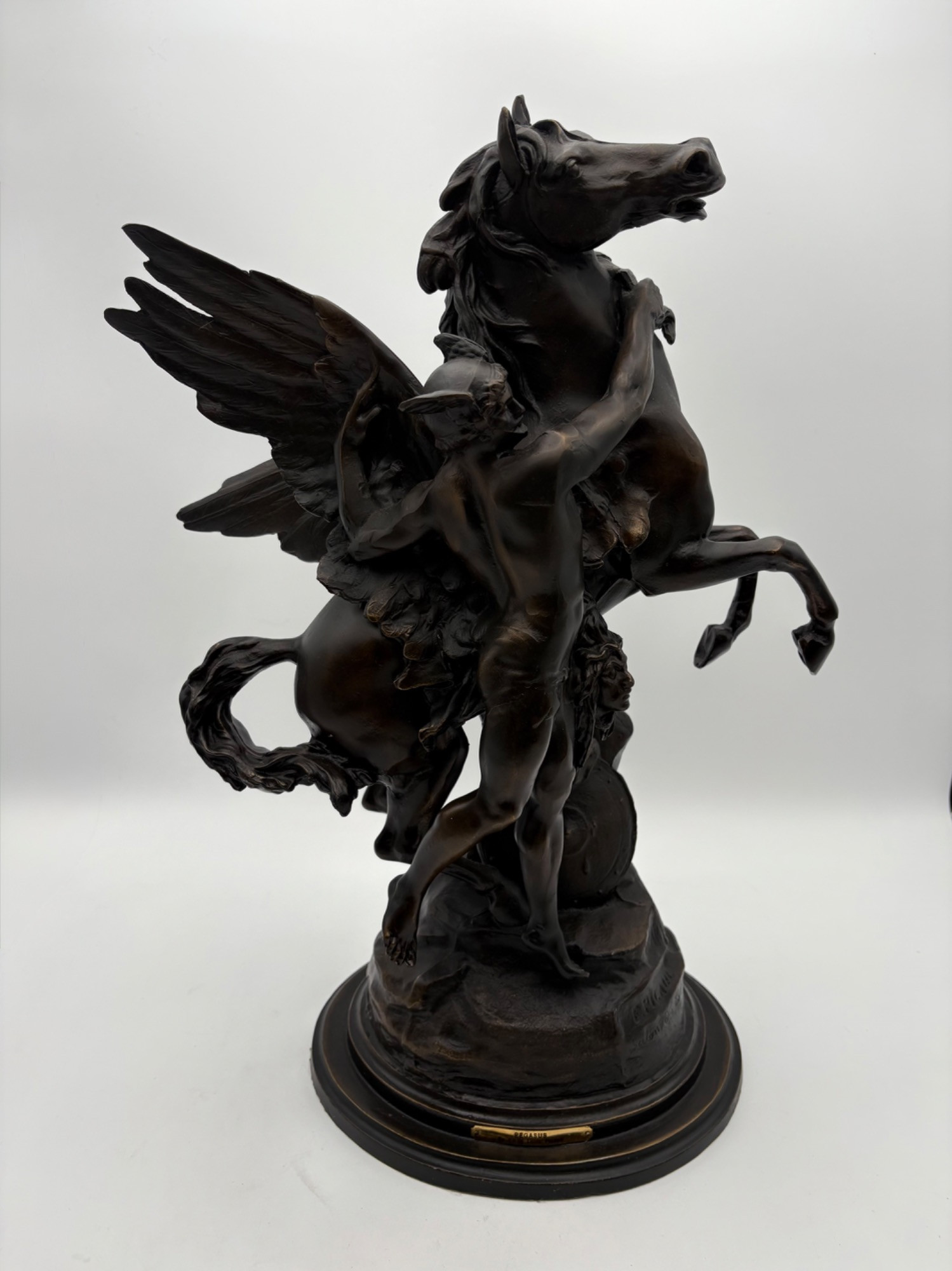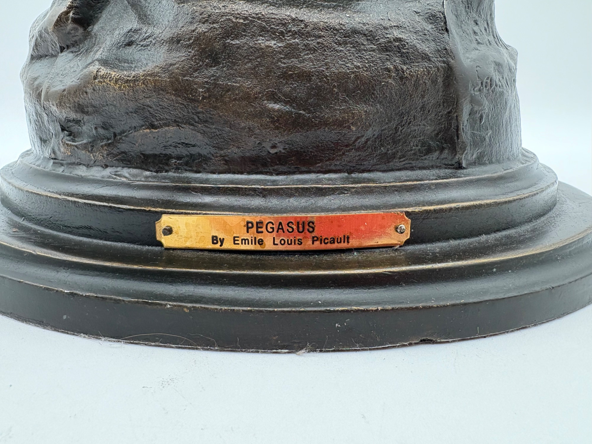 Metal reproduction of Emile Louis Picault's "Pegasus". Heavy cast metal with a dark brown finish. Note that the finish has worn in a couple of places - please see photos for details. Almost 2' high.