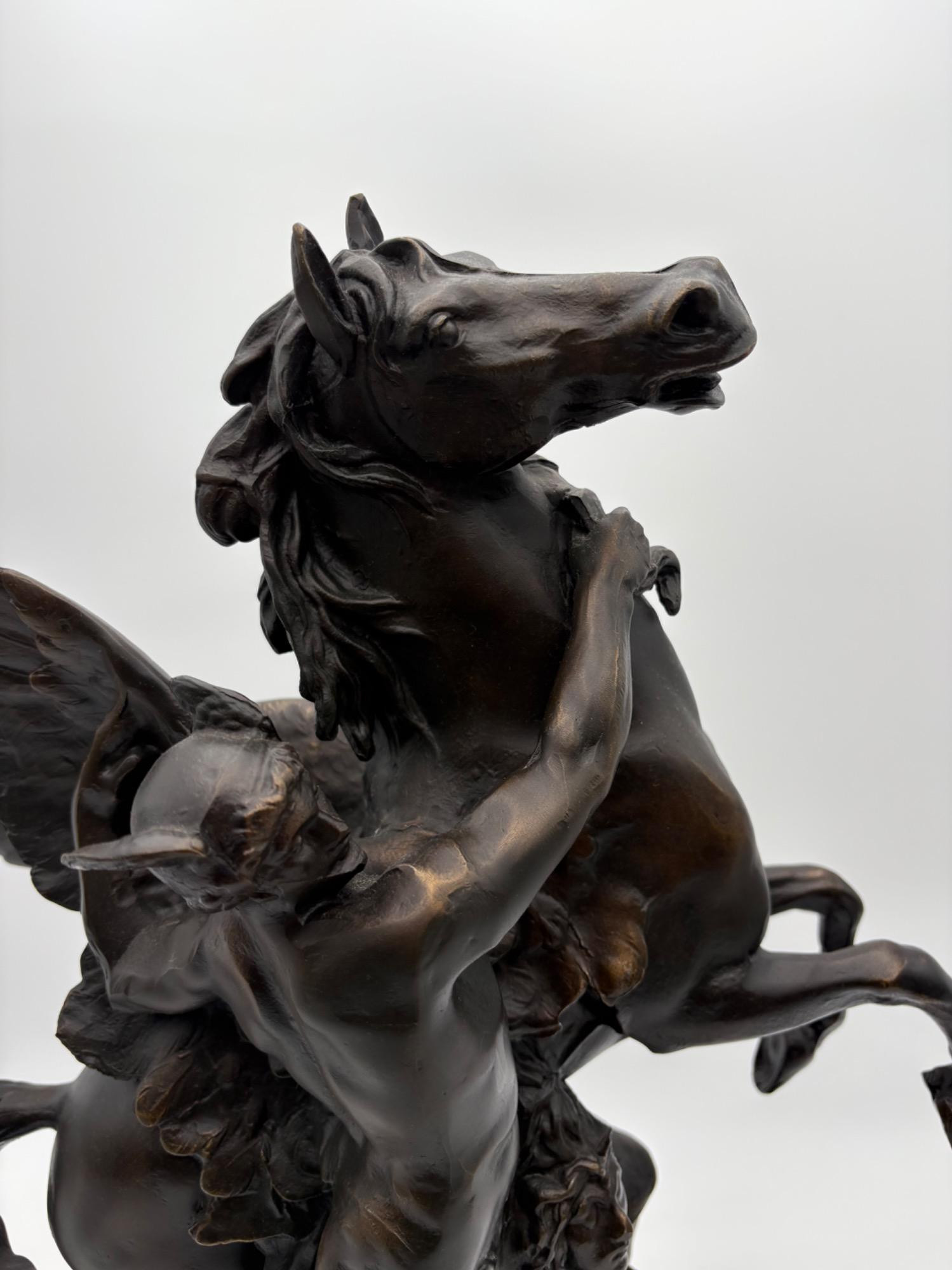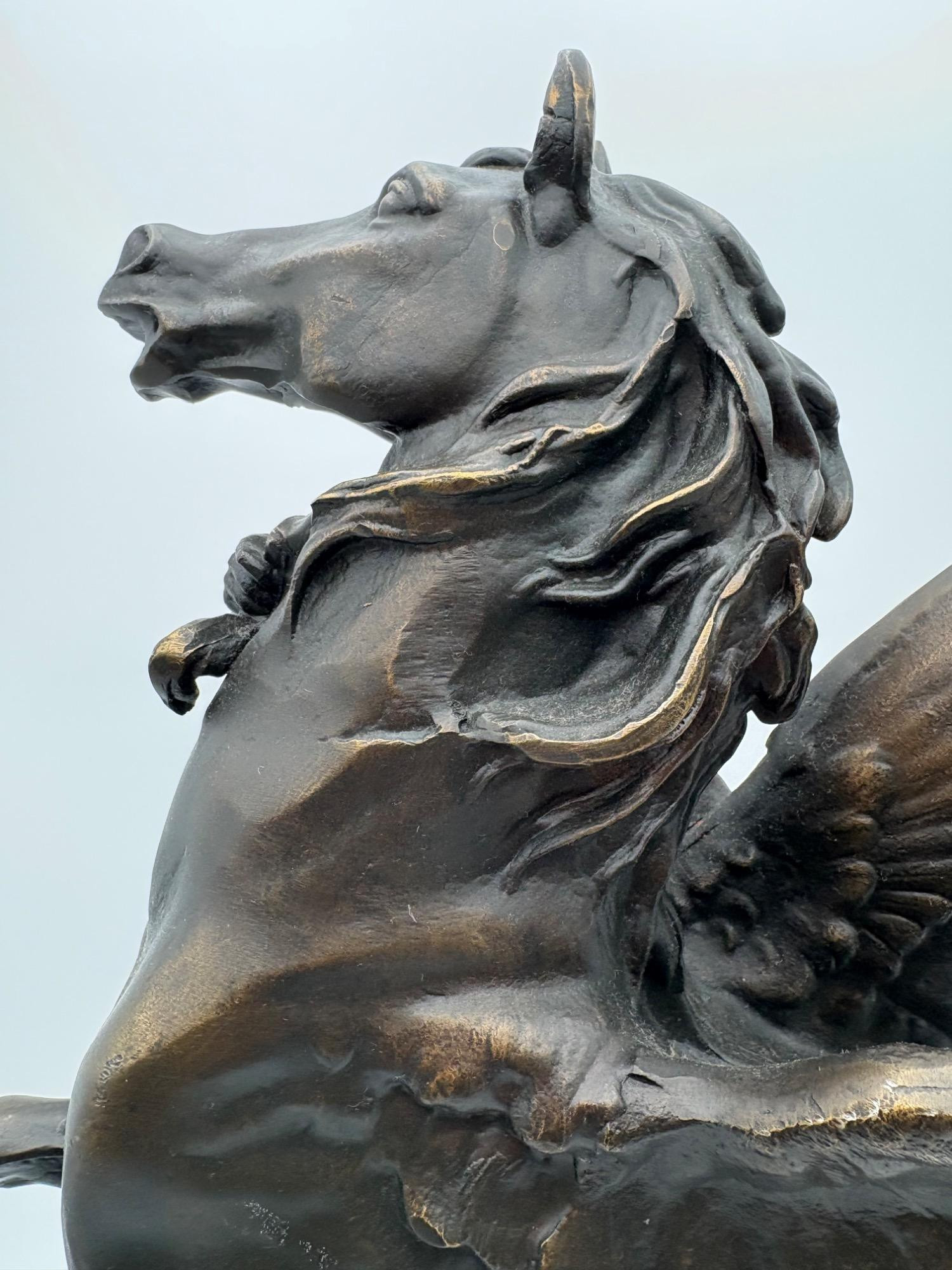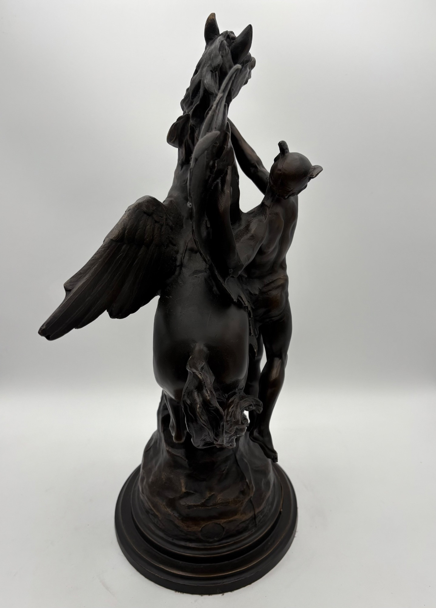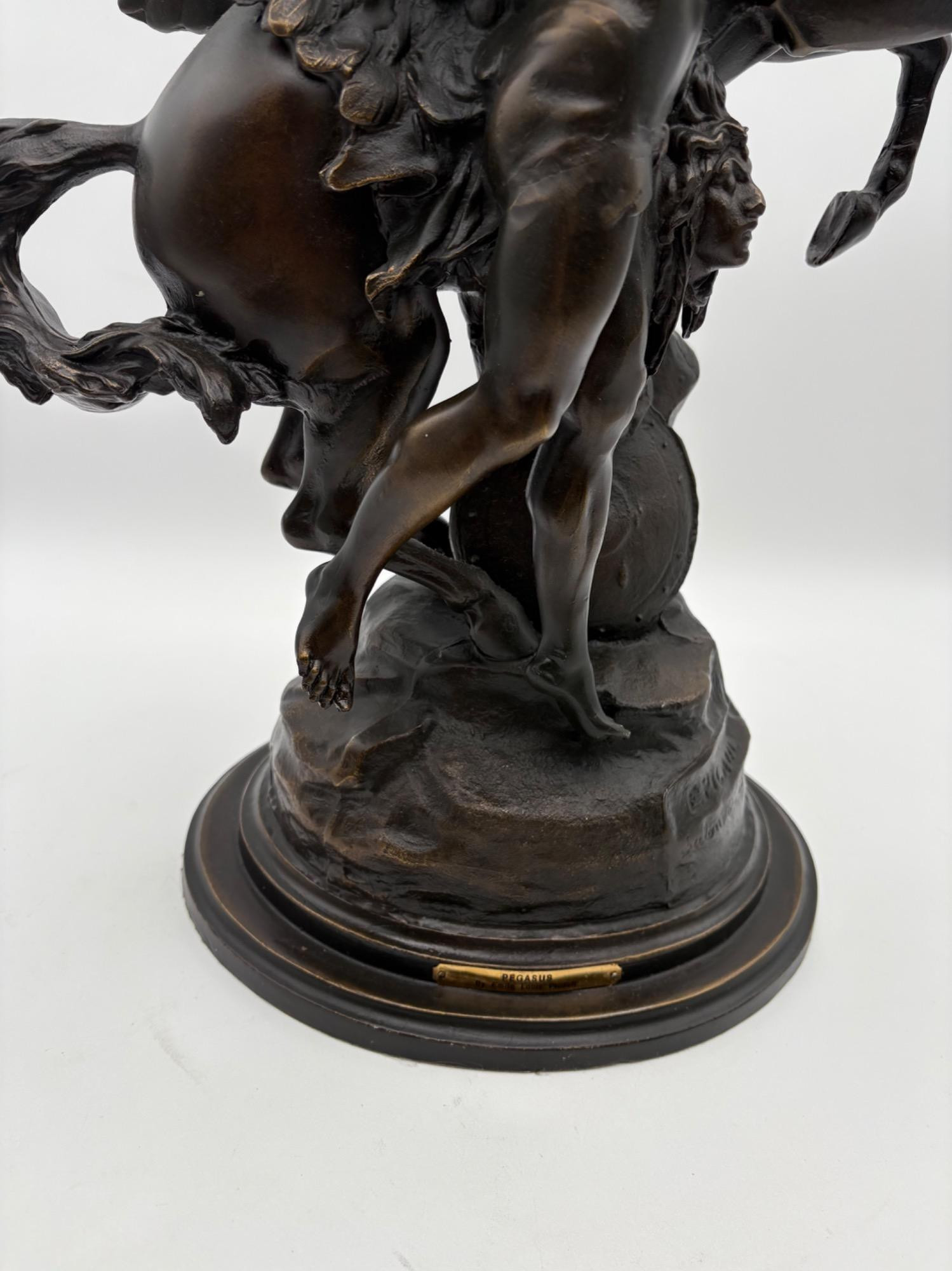 Metal reproduction of Emile Louis Picault's "Pegasus". Heavy cast metal with a dark brown finish. Note that the finish has worn in a couple of places - please see photos for details. Almost 2' high.